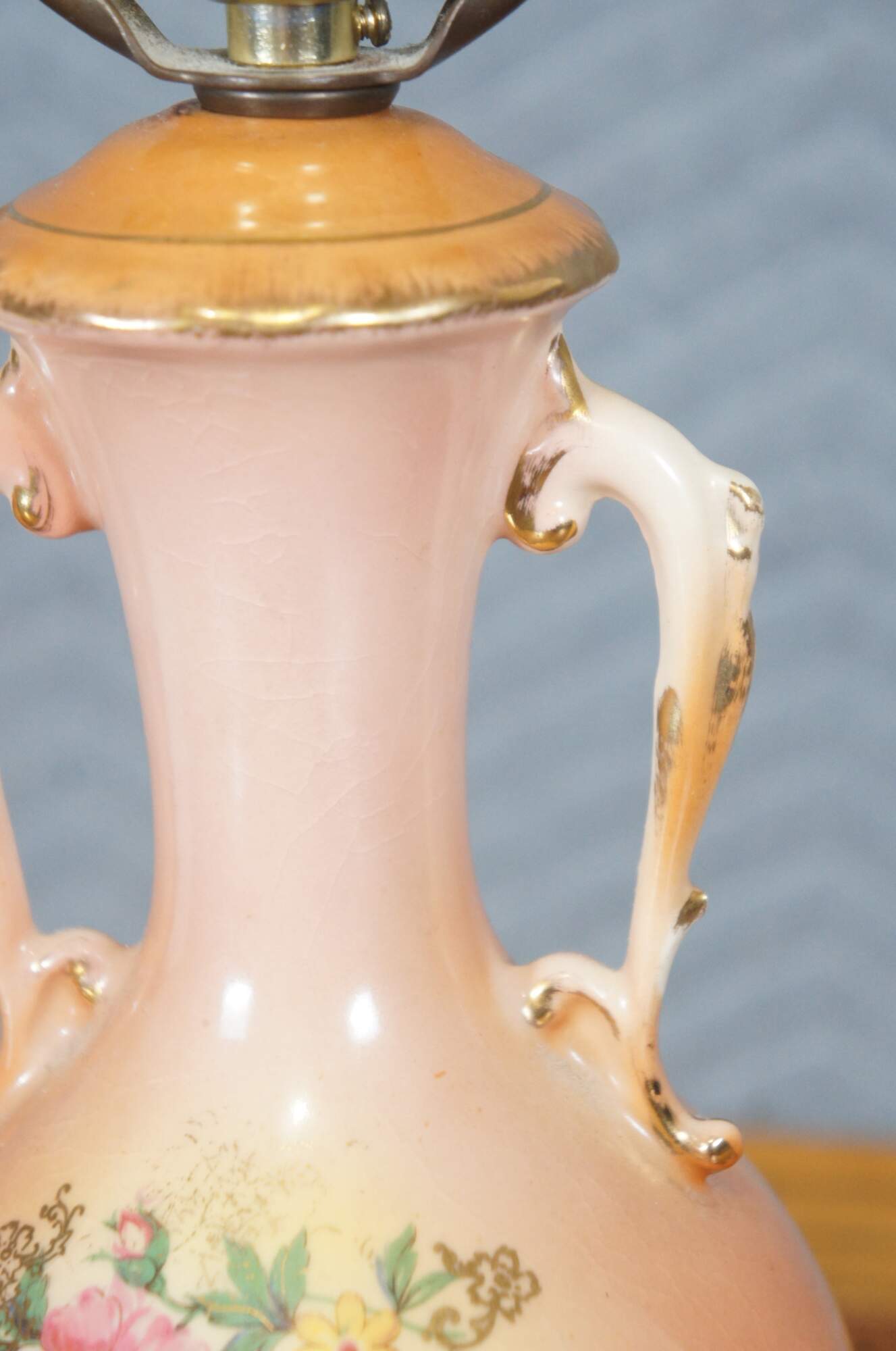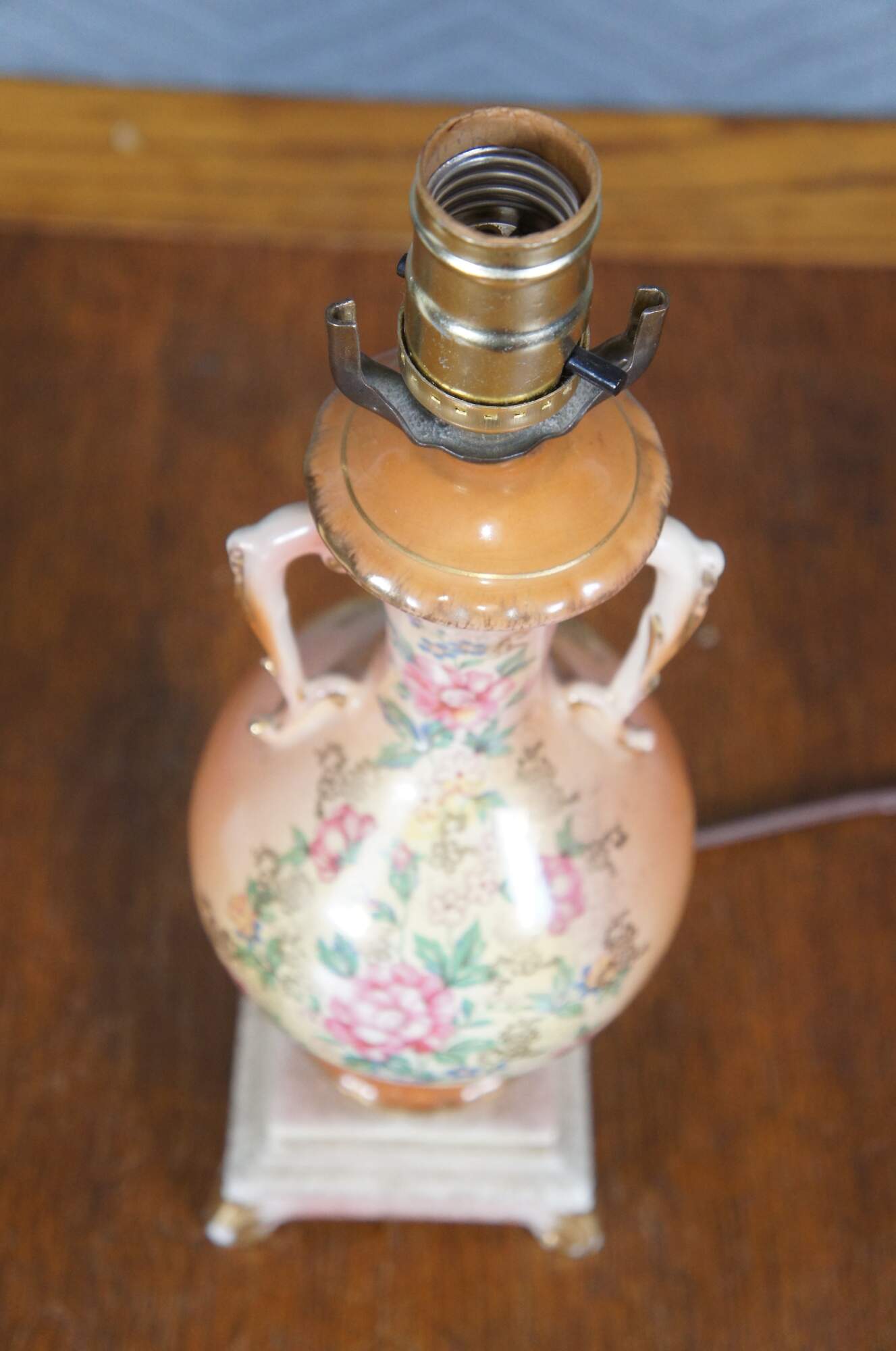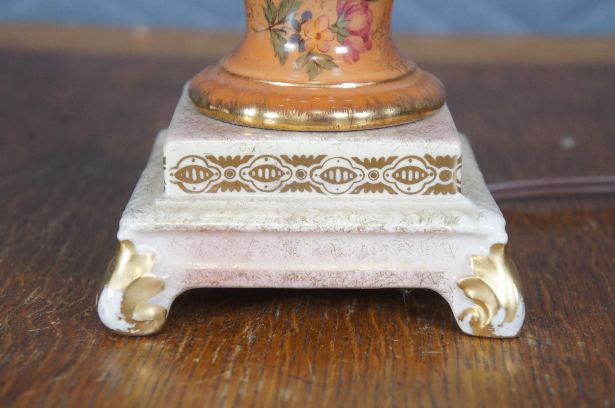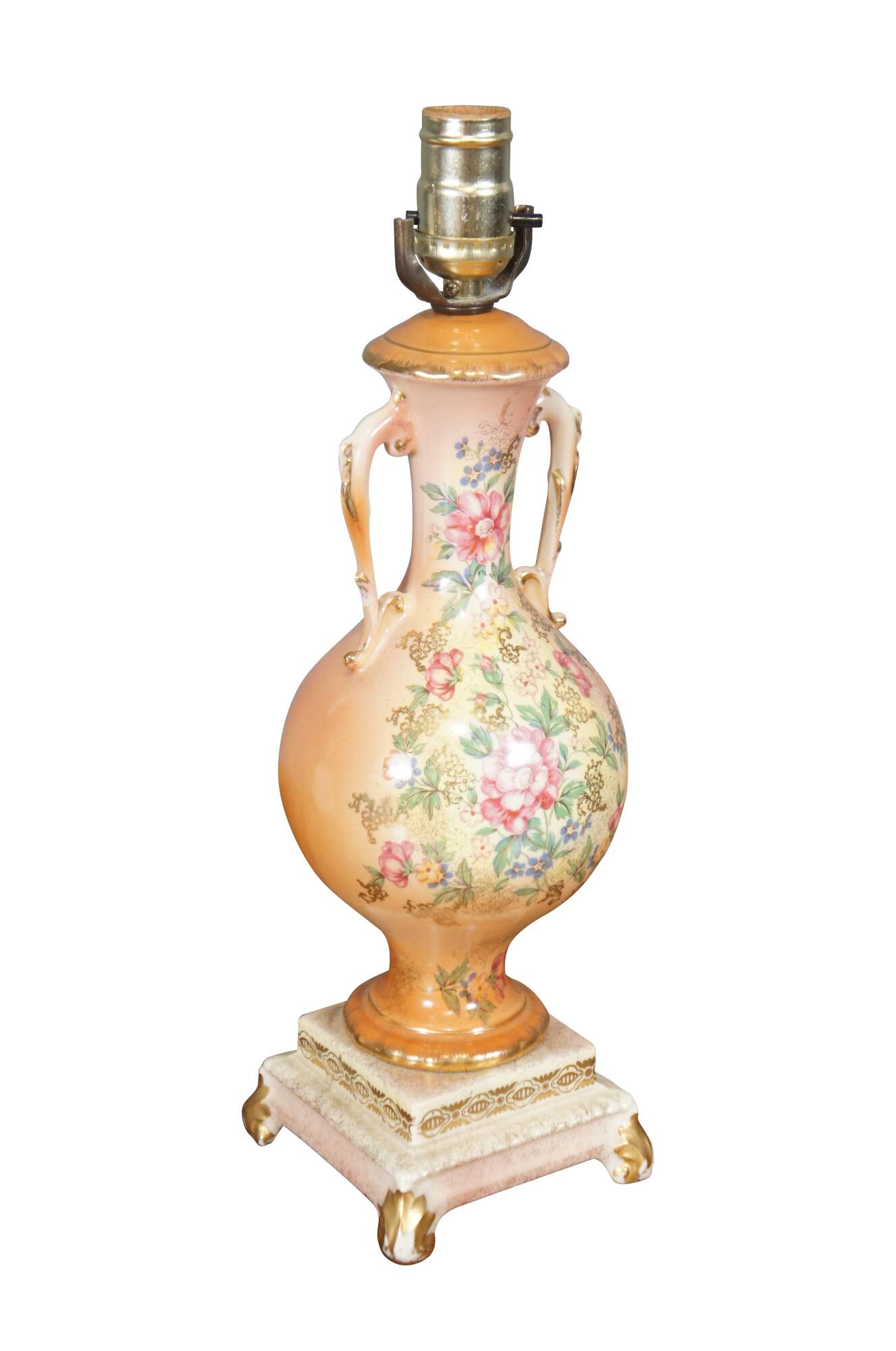 Circa mid 20th century Beckwith China porcelain table lamp. Shaped like a neoclassical mantel urn with handles on a square footed plinth, this lamp features a soft peach ombre glaze and a gilt and multicolored floral design.