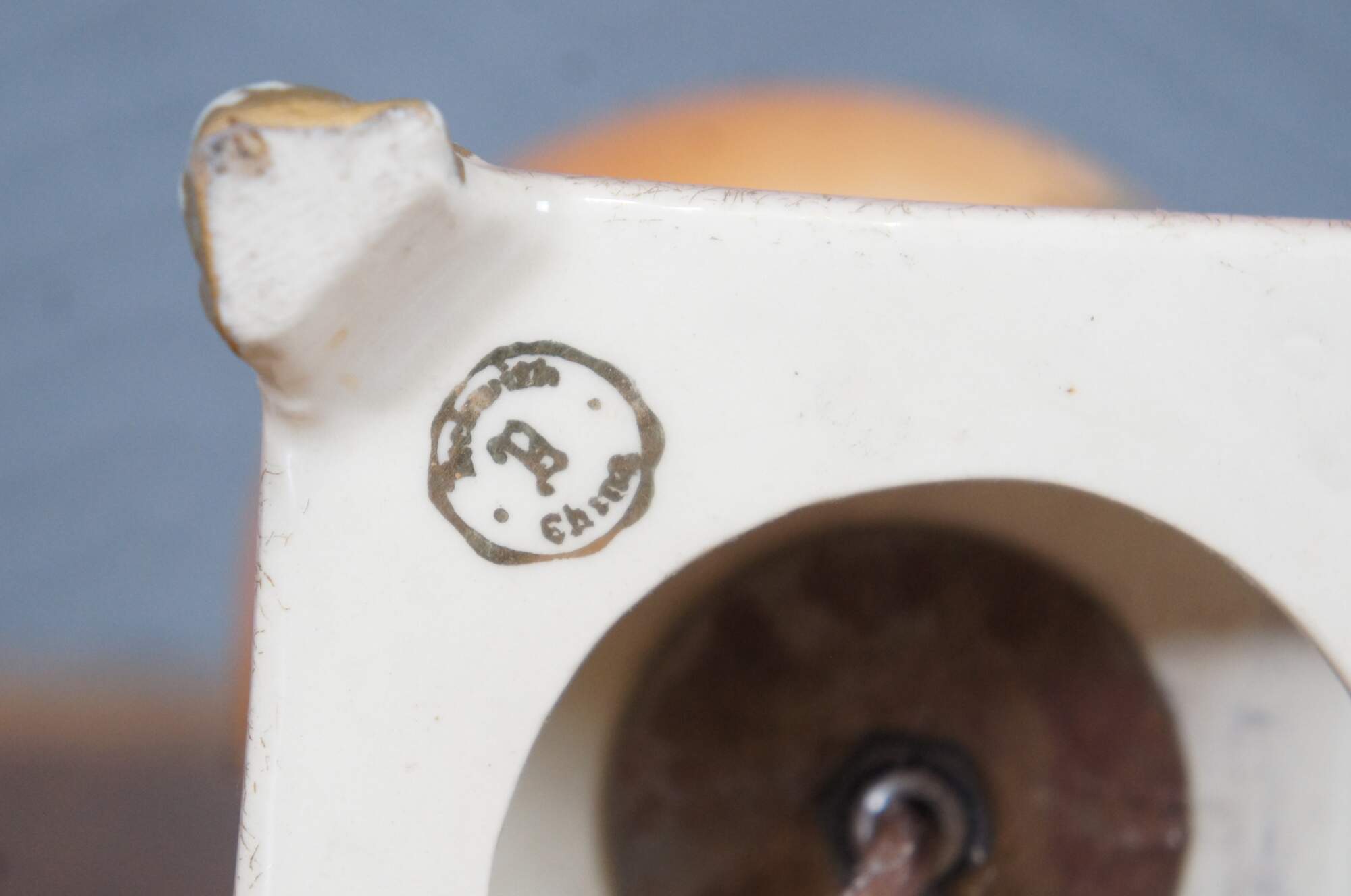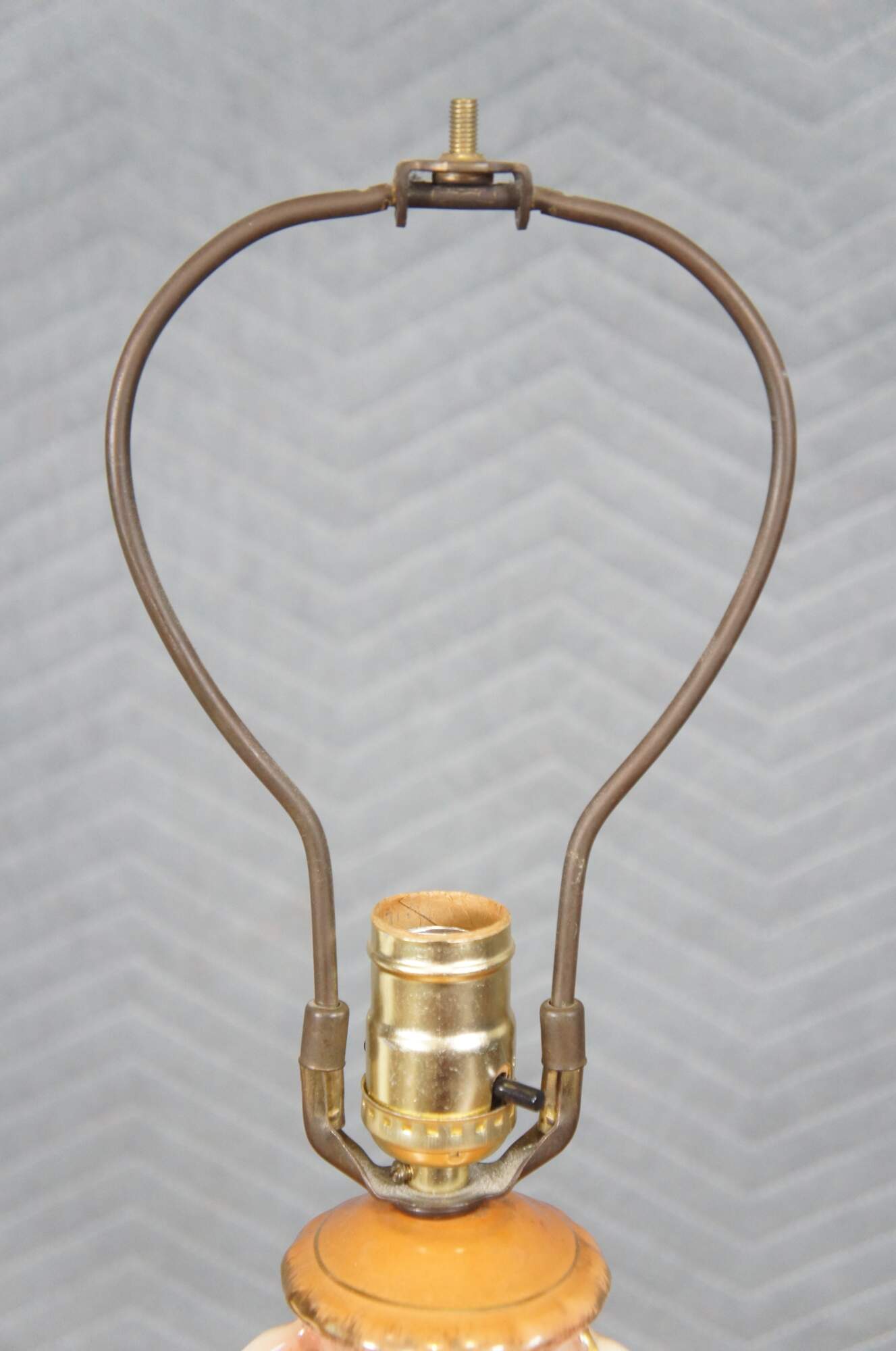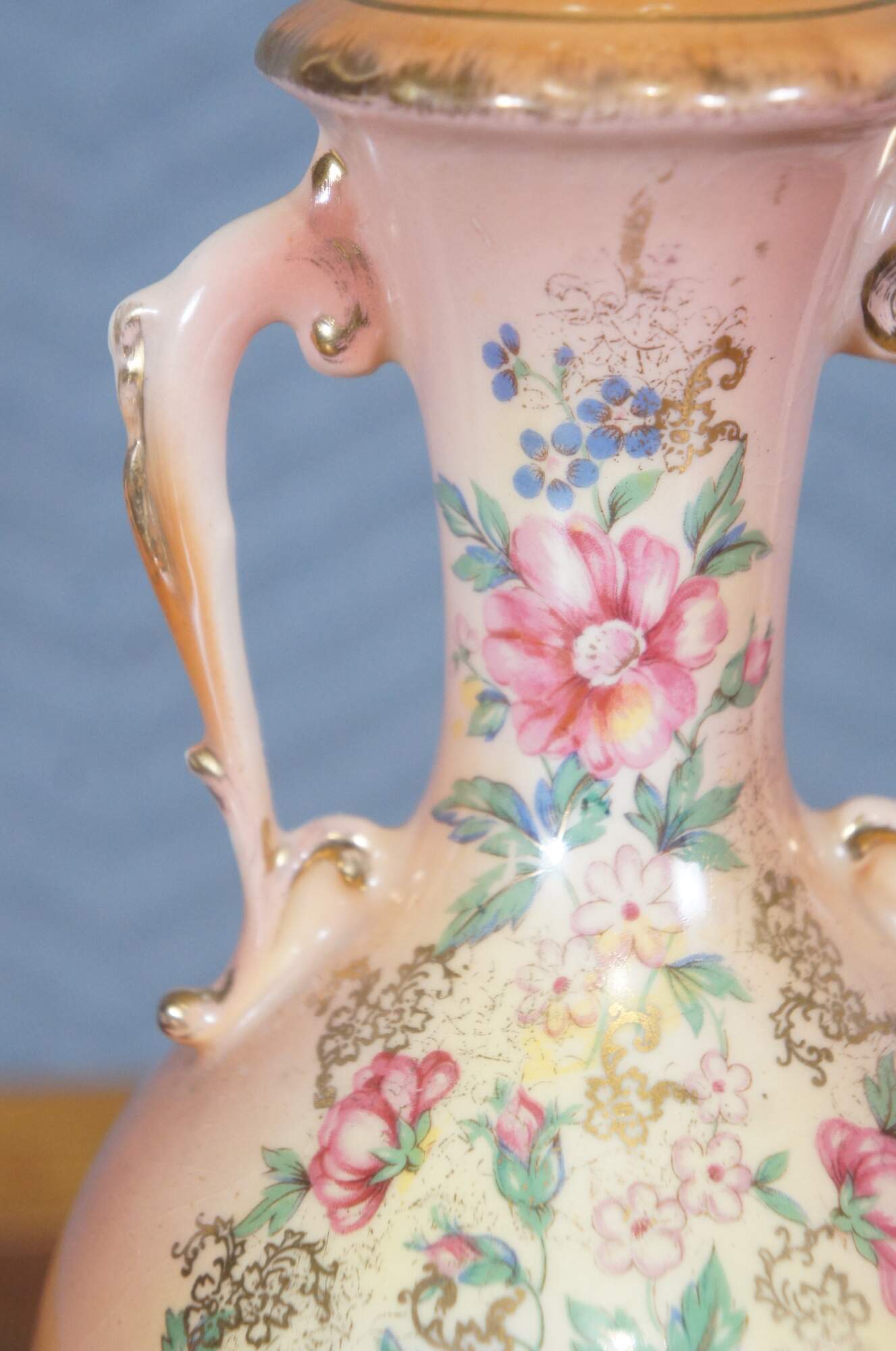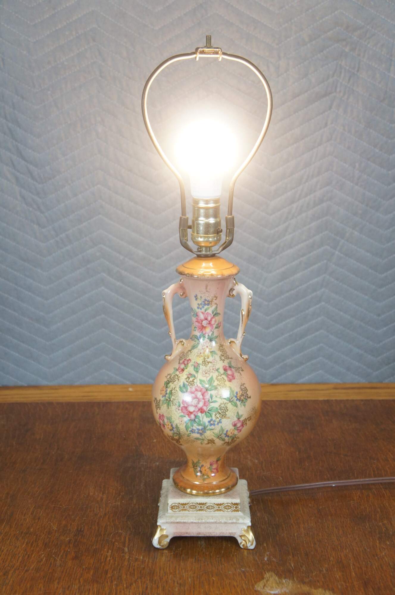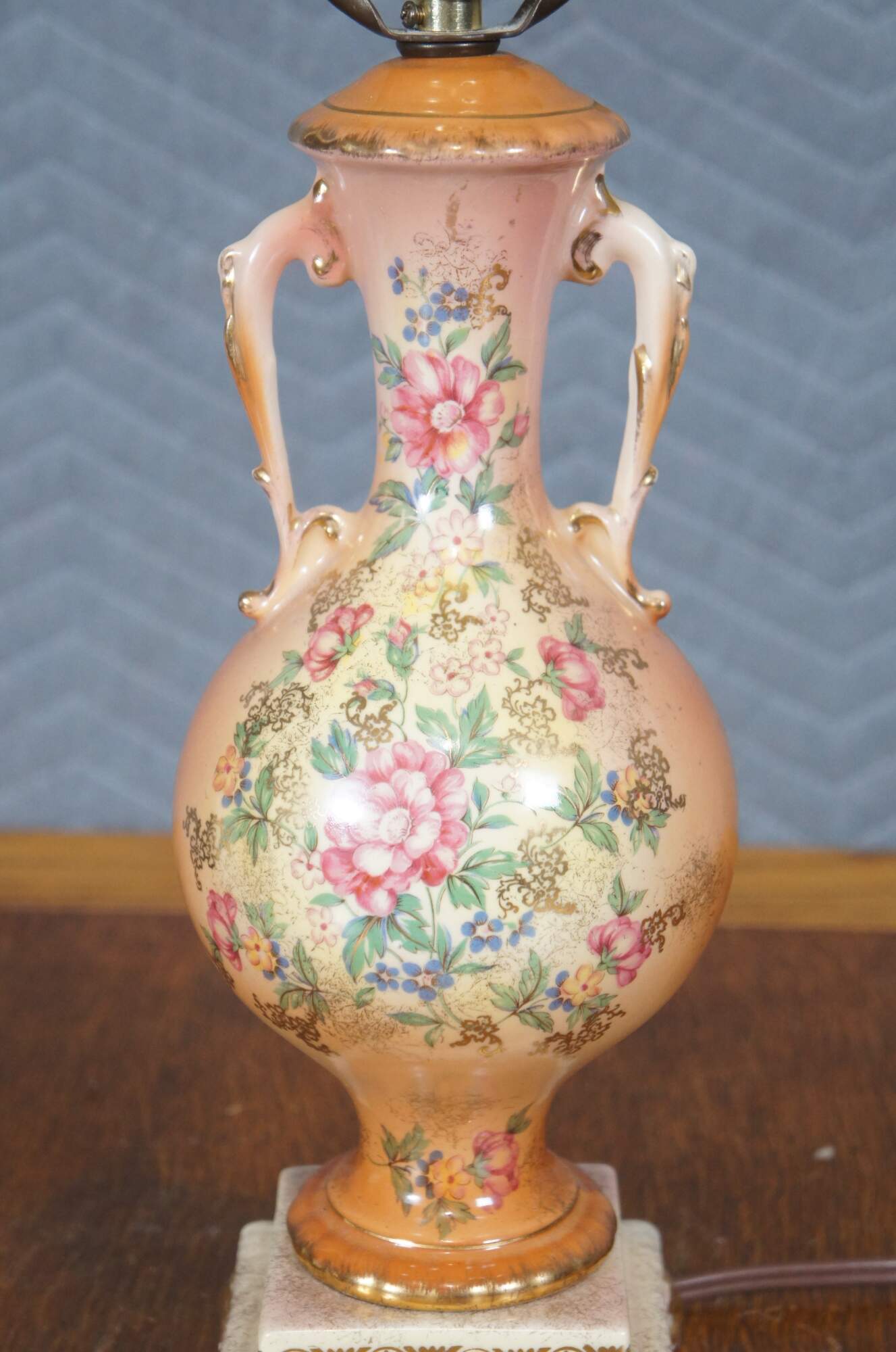 Circa mid 20th century Beckwith China porcelain table lamp. Shaped like a neoclassical mantel urn with handles on a square footed plinth, this lamp features a soft peach ombre glaze and a gilt and multicolored floral design.