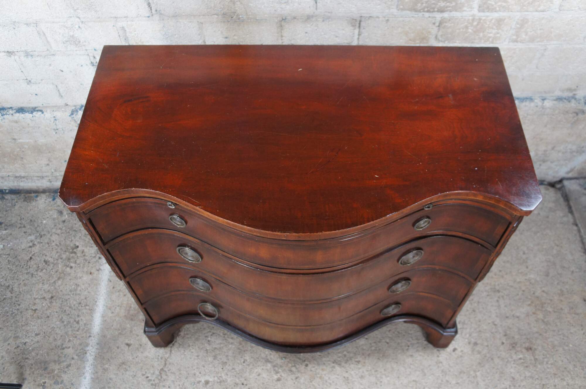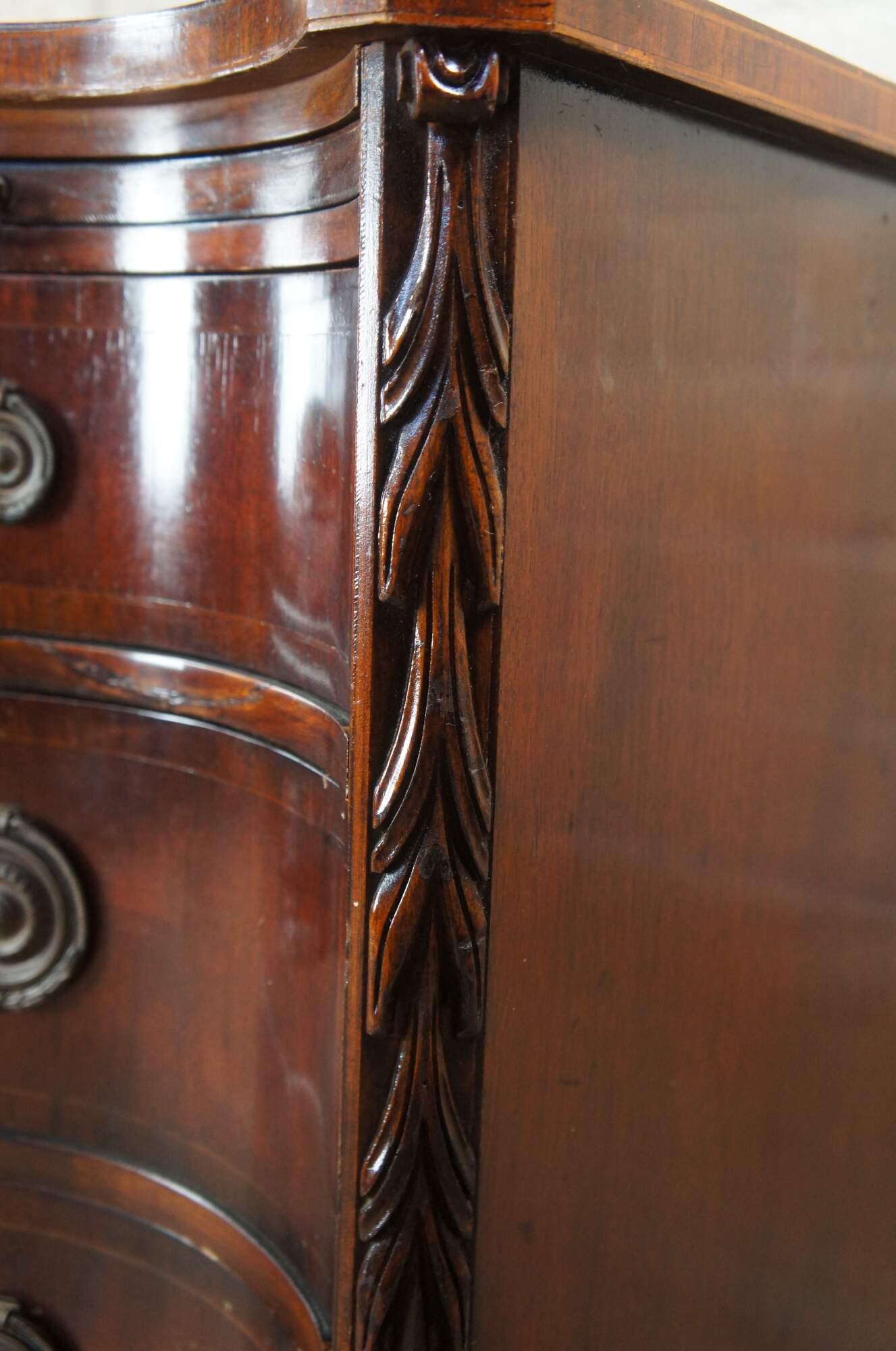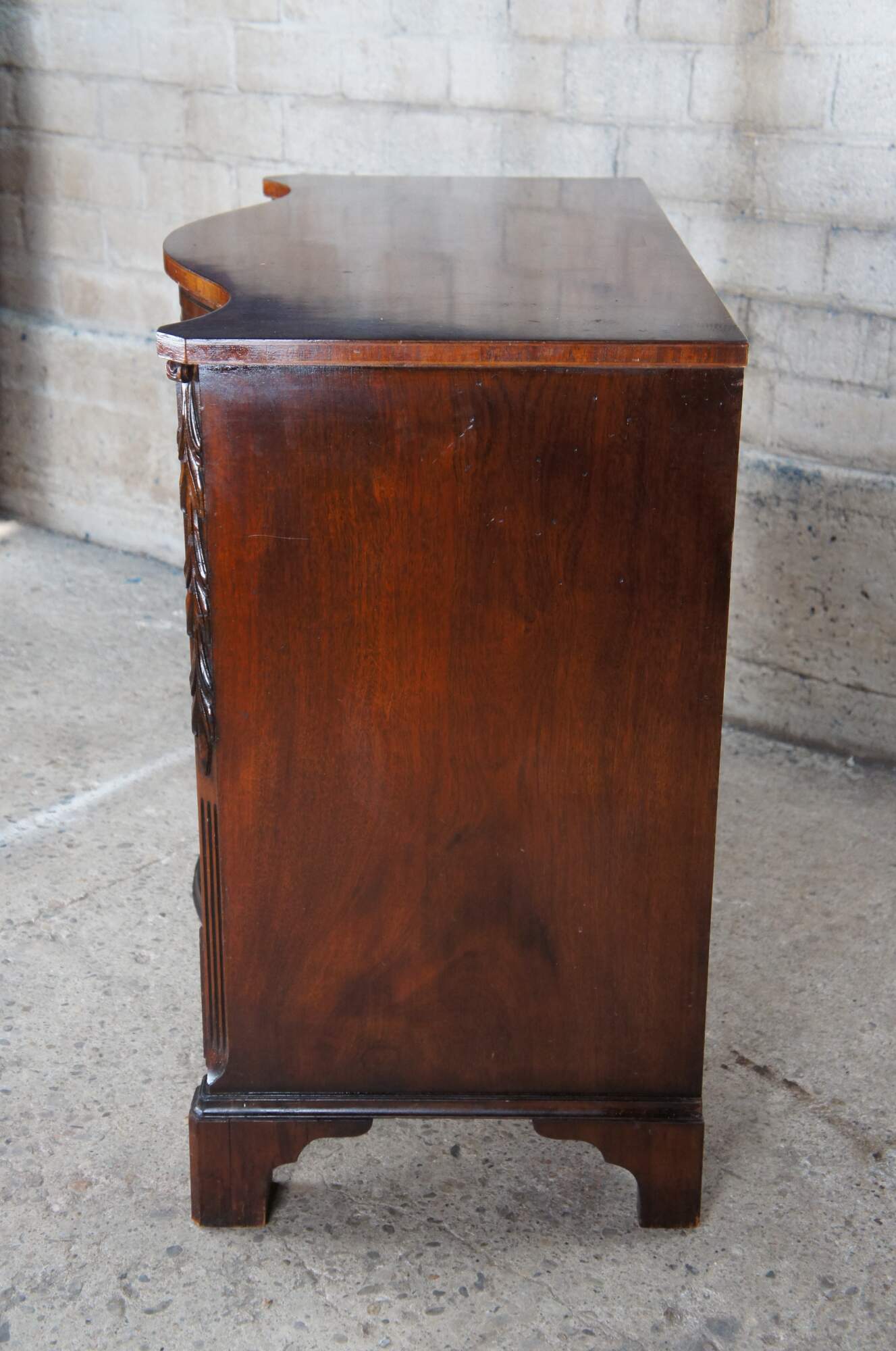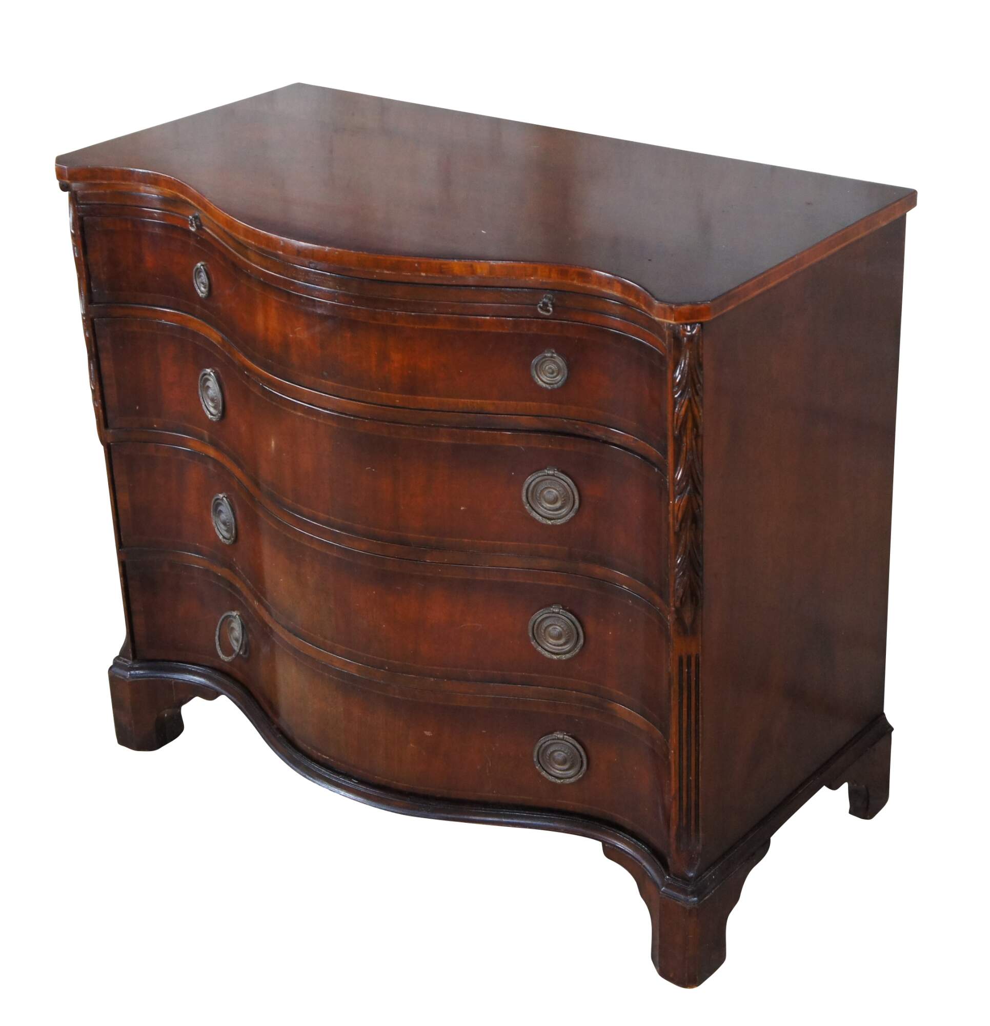 An exceptional Bachelors Chest, Buffet, or Dresser by Union National, circa 1940s. Designed in George III styling with a dramatic serpentine mahogany case featuring four sliding dovetailed drawers and a pull-out tray for service. The chamfered stiles of the chest showcase foliate carving along the top and fluting towards the base. Drawers are accented by cross banding and inlay. Drawer pulls are made from brass with an ornate central pineapple plate and neoclassical ribboned knocker. The dresser is supported by bracket feet. Maker’s mark along the inside of the top drawer.