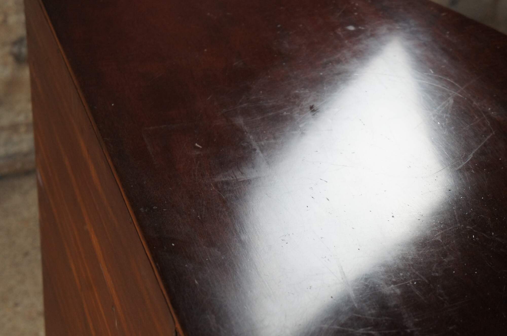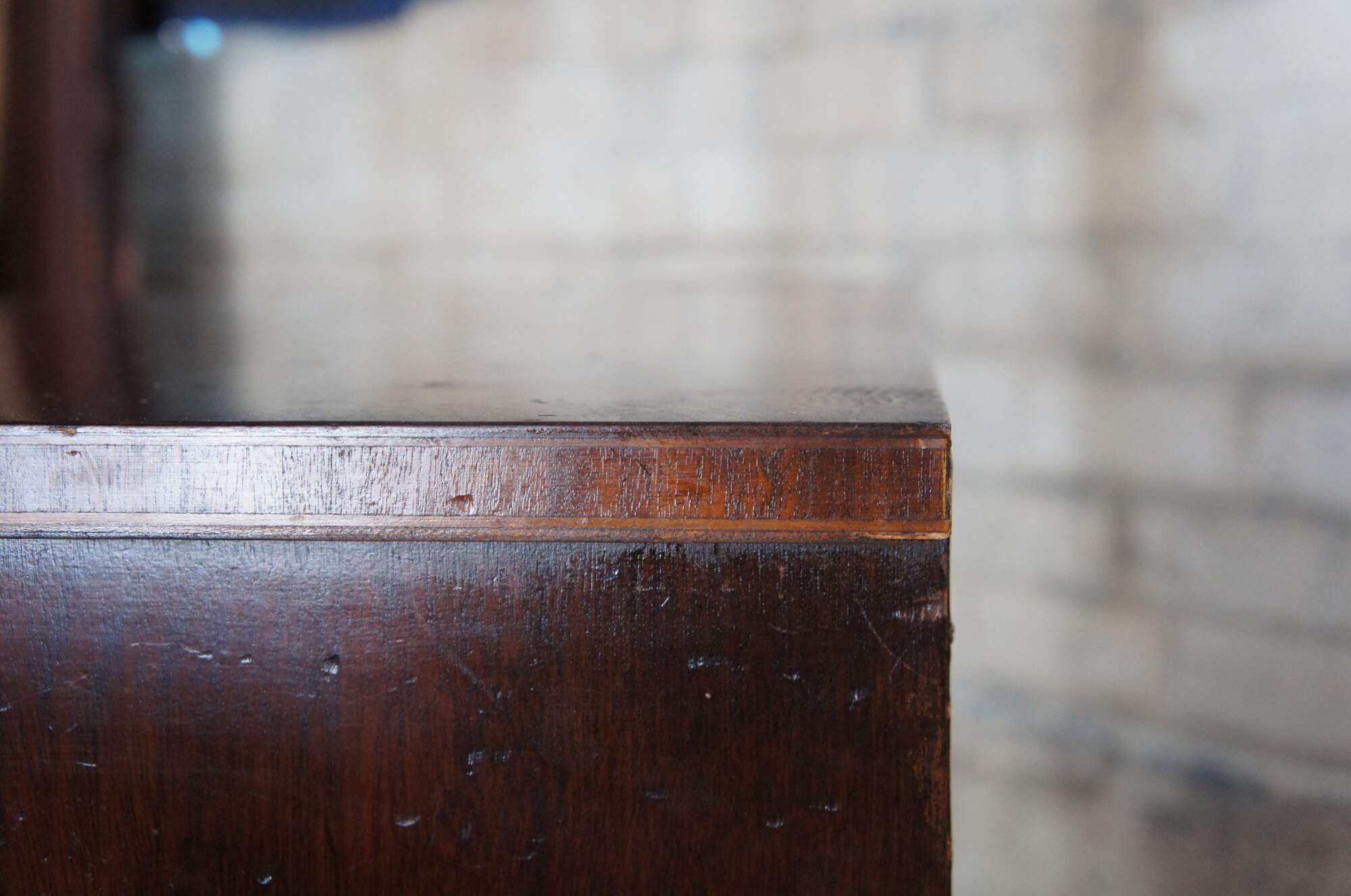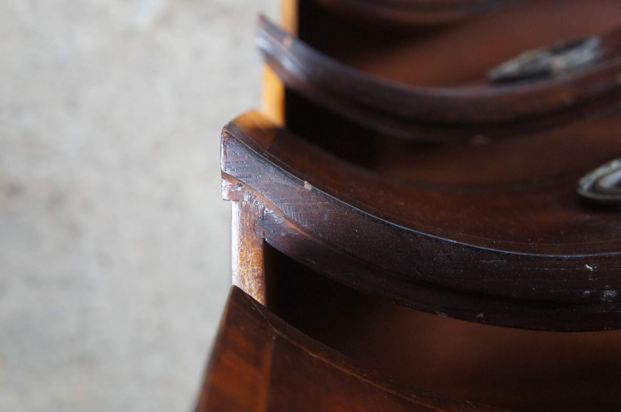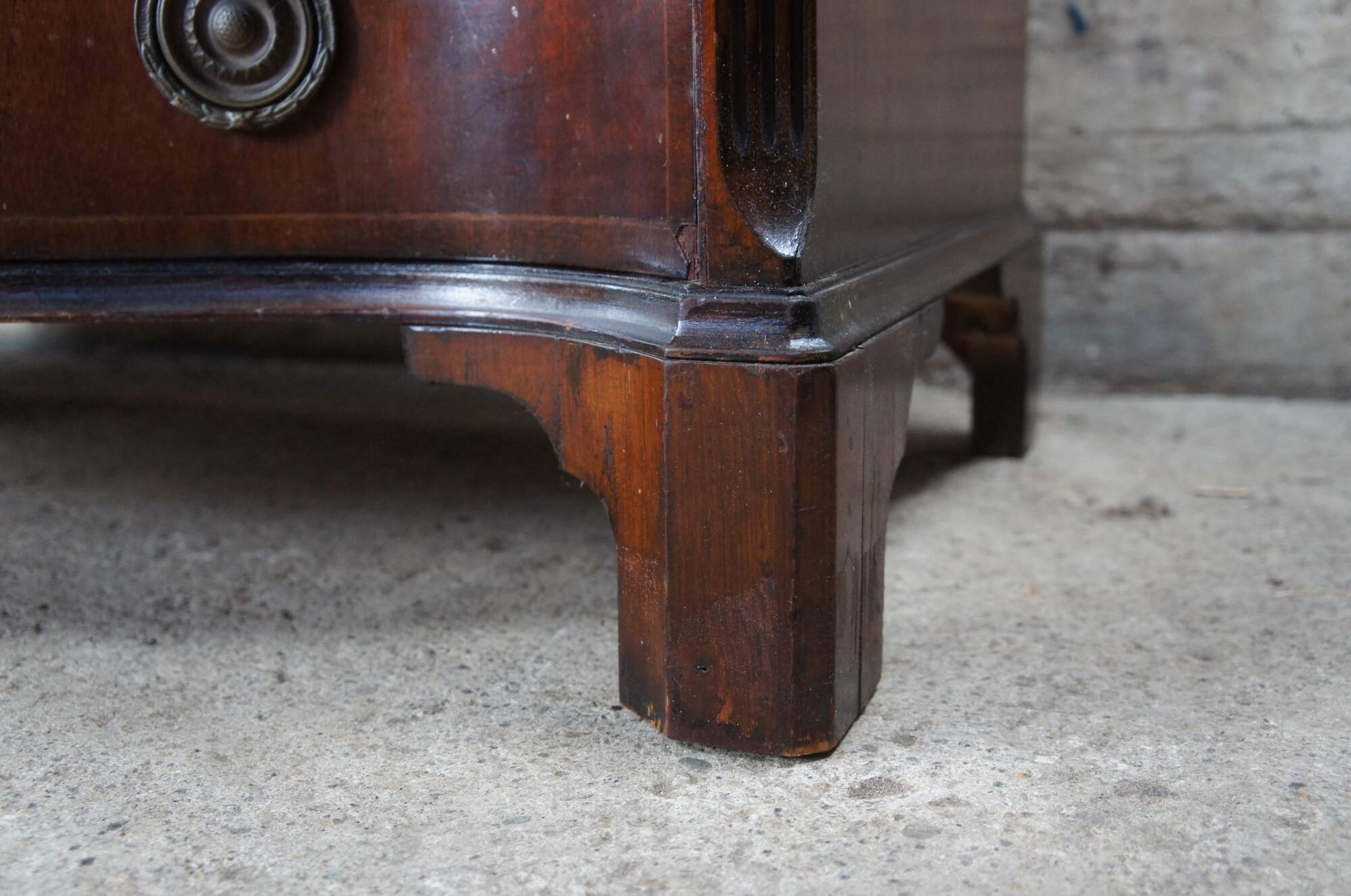 An exceptional Bachelors Chest, Buffet, or Dresser by Union National, circa 1940s. Designed in George III styling with a dramatic serpentine mahogany case featuring four sliding dovetailed drawers and a pull-out tray for service. The chamfered stiles of the chest showcase foliate carving along the top and fluting towards the base. Drawers are accented by cross banding and inlay. Drawer pulls are made from brass with an ornate central pineapple plate and neoclassical ribboned knocker. The dresser is supported by bracket feet. Maker’s mark along the inside of the top drawer.