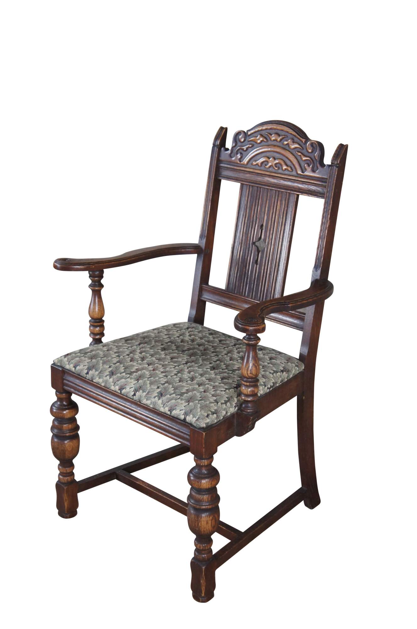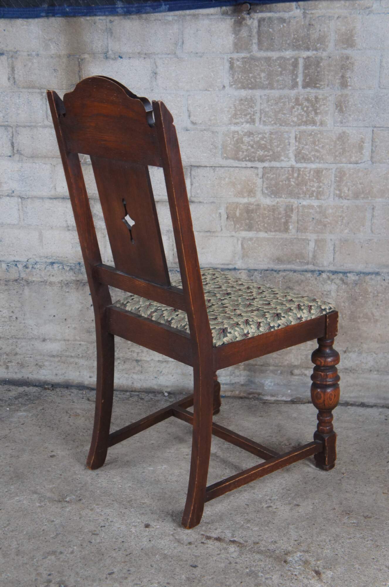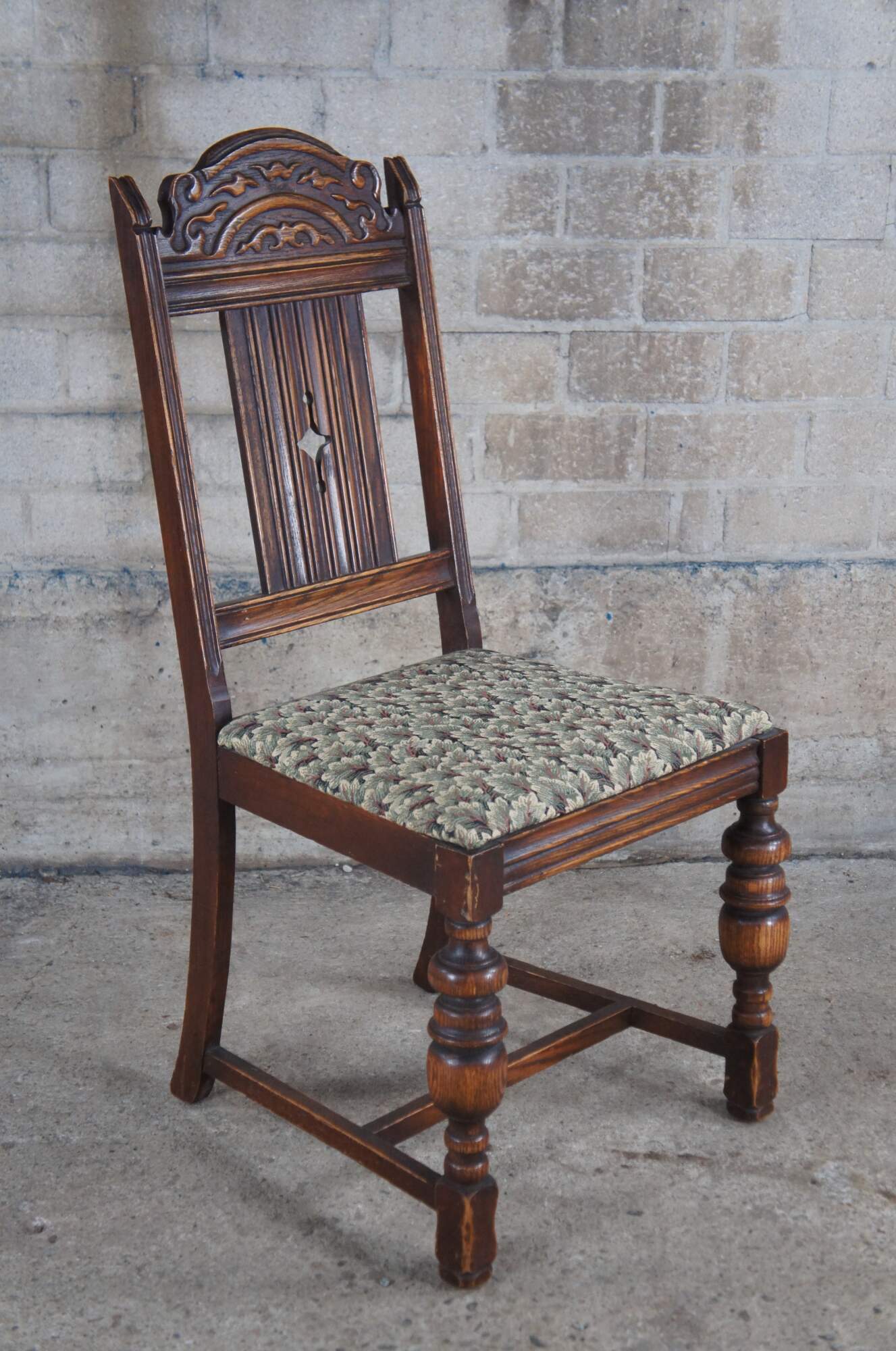 Set of 5 Vintage Jacobean style Dining Chairs by Bernhardt Furniture, circa 1930-40s. Features a carved crest rail over a pierced diamond linen fold splat. The chairs are upholstered in a floral leaf / tree pattern and supported by baluster turned legs connected by an H stretcher. Bernhardt Furniture Company operated out of Lenoir, North Carolina.