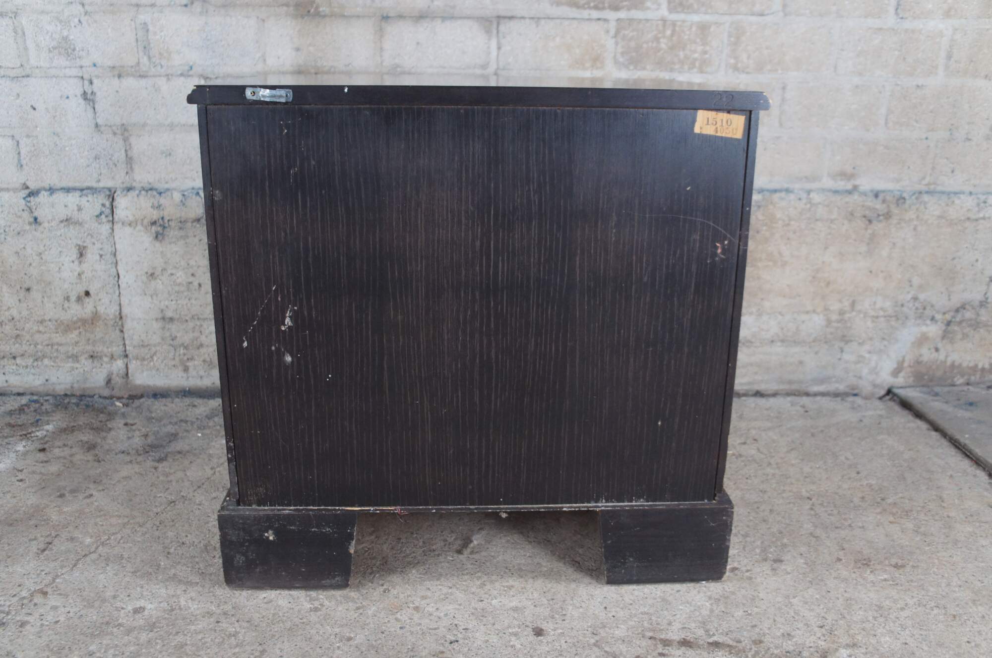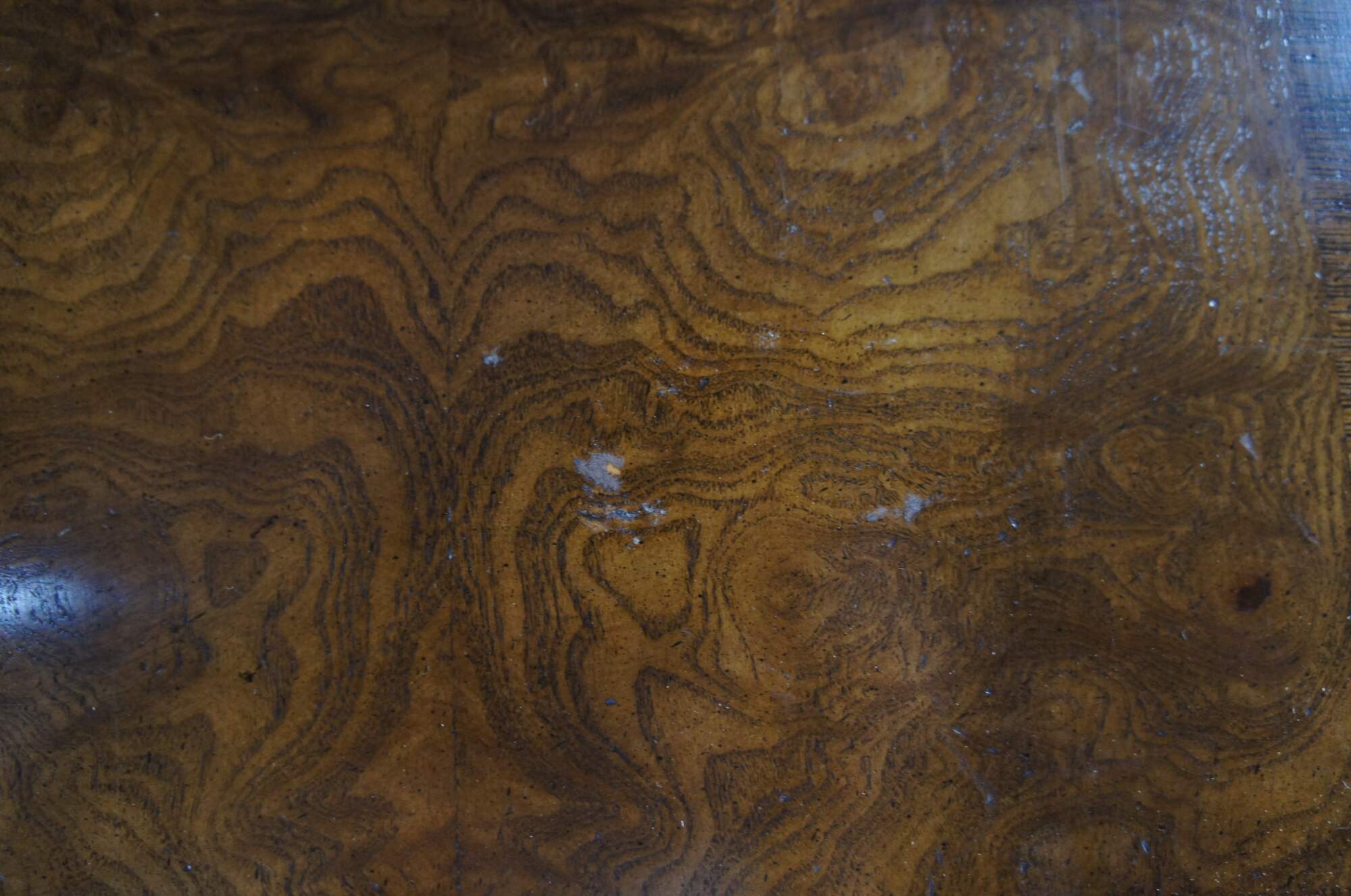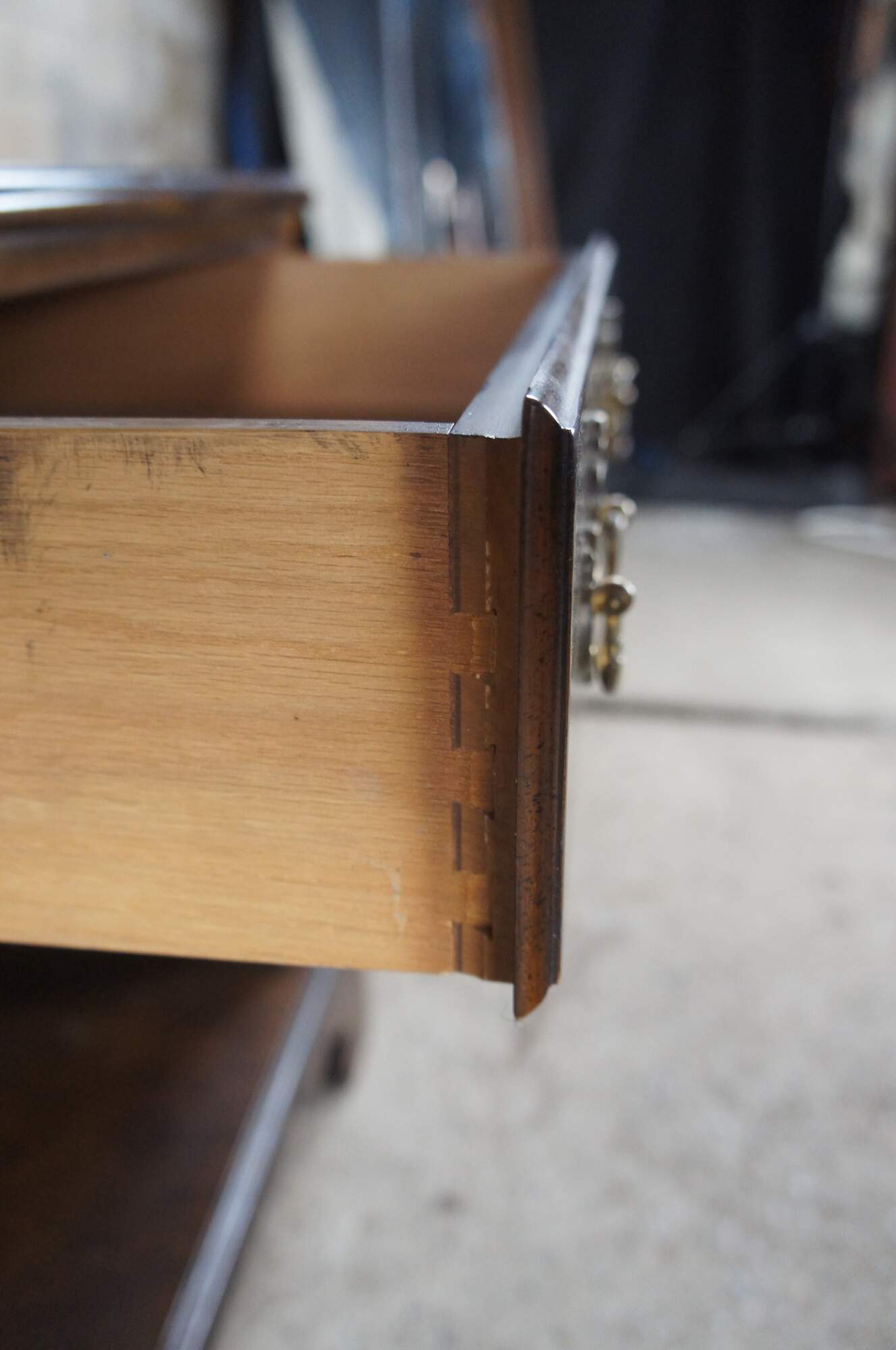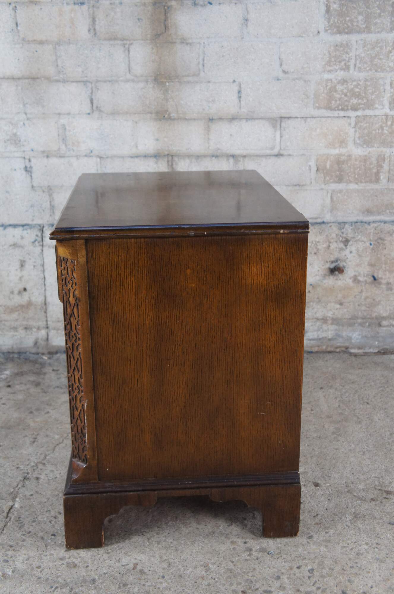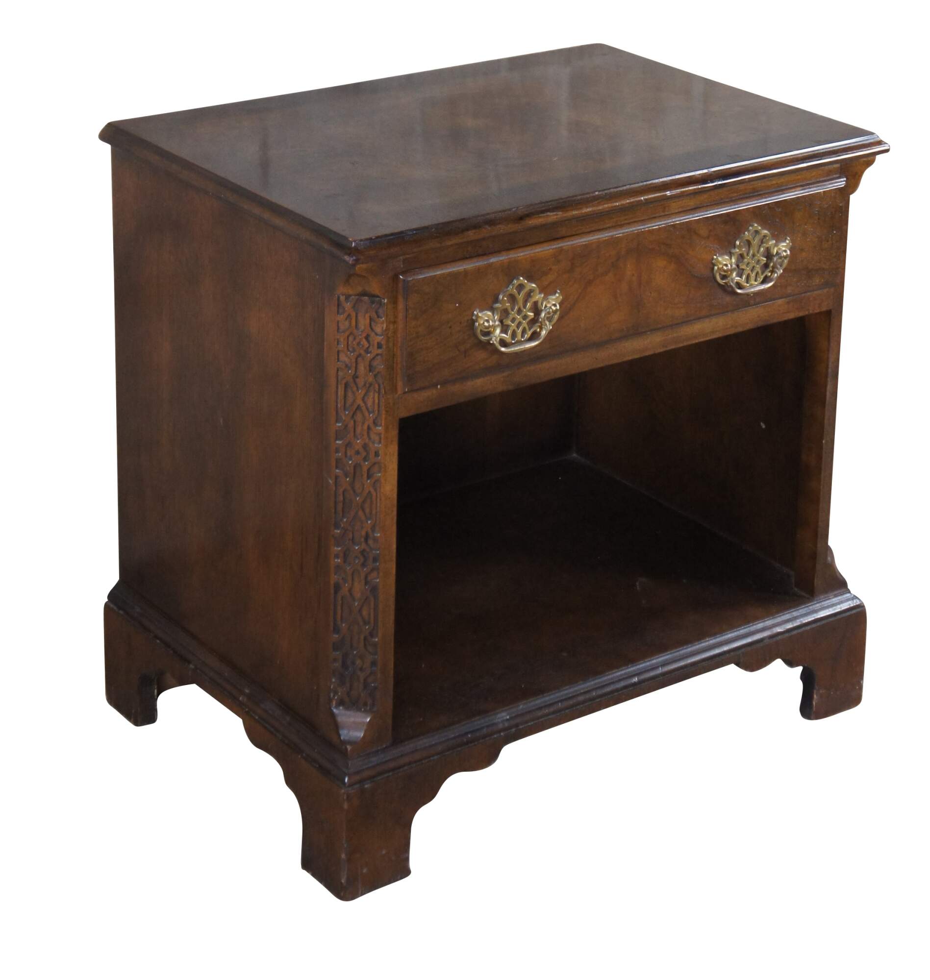 1980s Baker Furniture Chippendale nightstand or side table. Features a rectangular form made from walnut with a crossbanded and burled top. There is one dovetailed drawer with interlaced brass bale hardware over a lower cubby for storage. The chest showcases chamfered stiles with beautiful fretwork terminating along the top and bottom into rams’ tongues. The chest is supported by bracket feet. Marked Baker along the inside of the drawer. 1510 | 4050