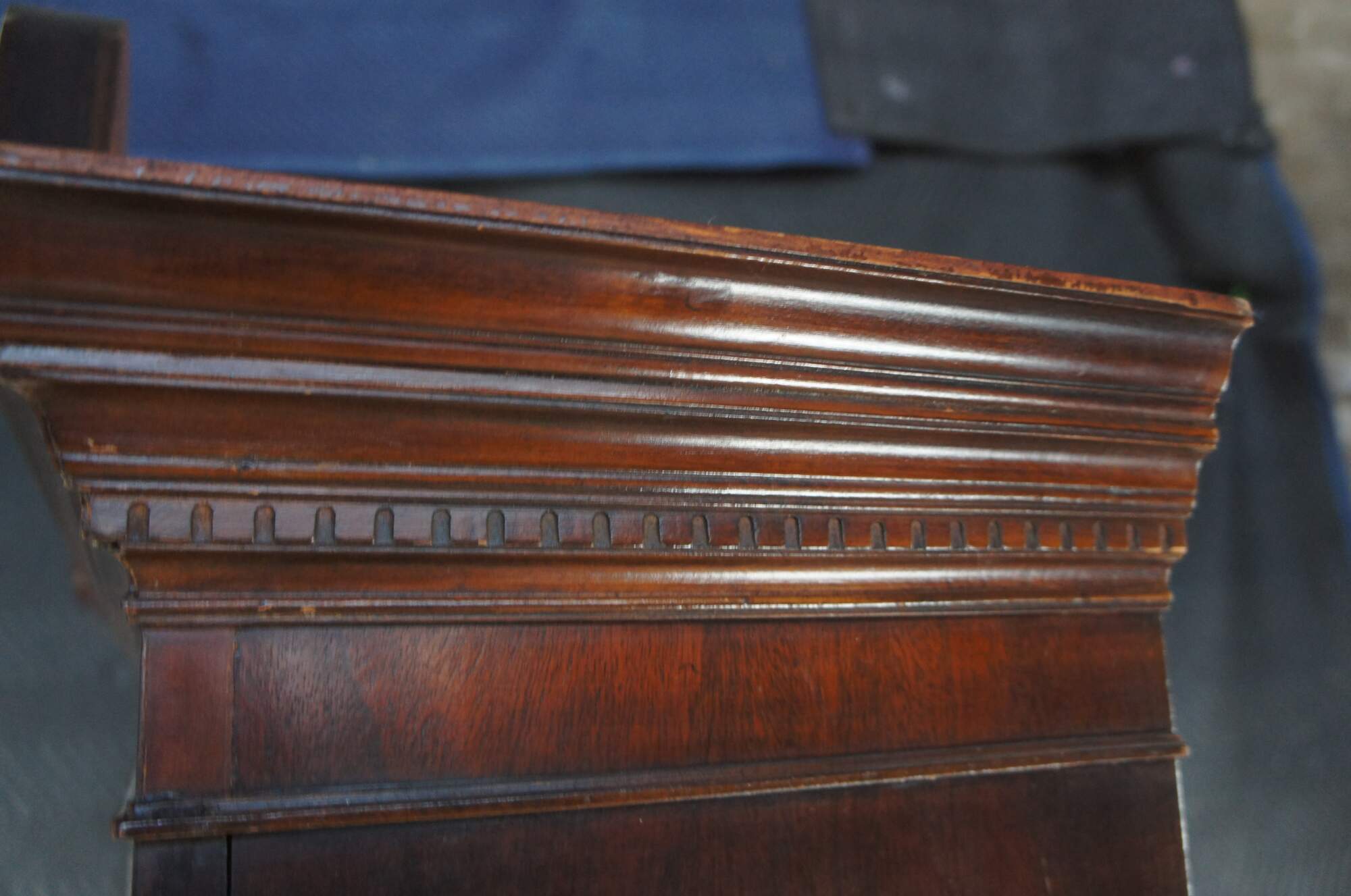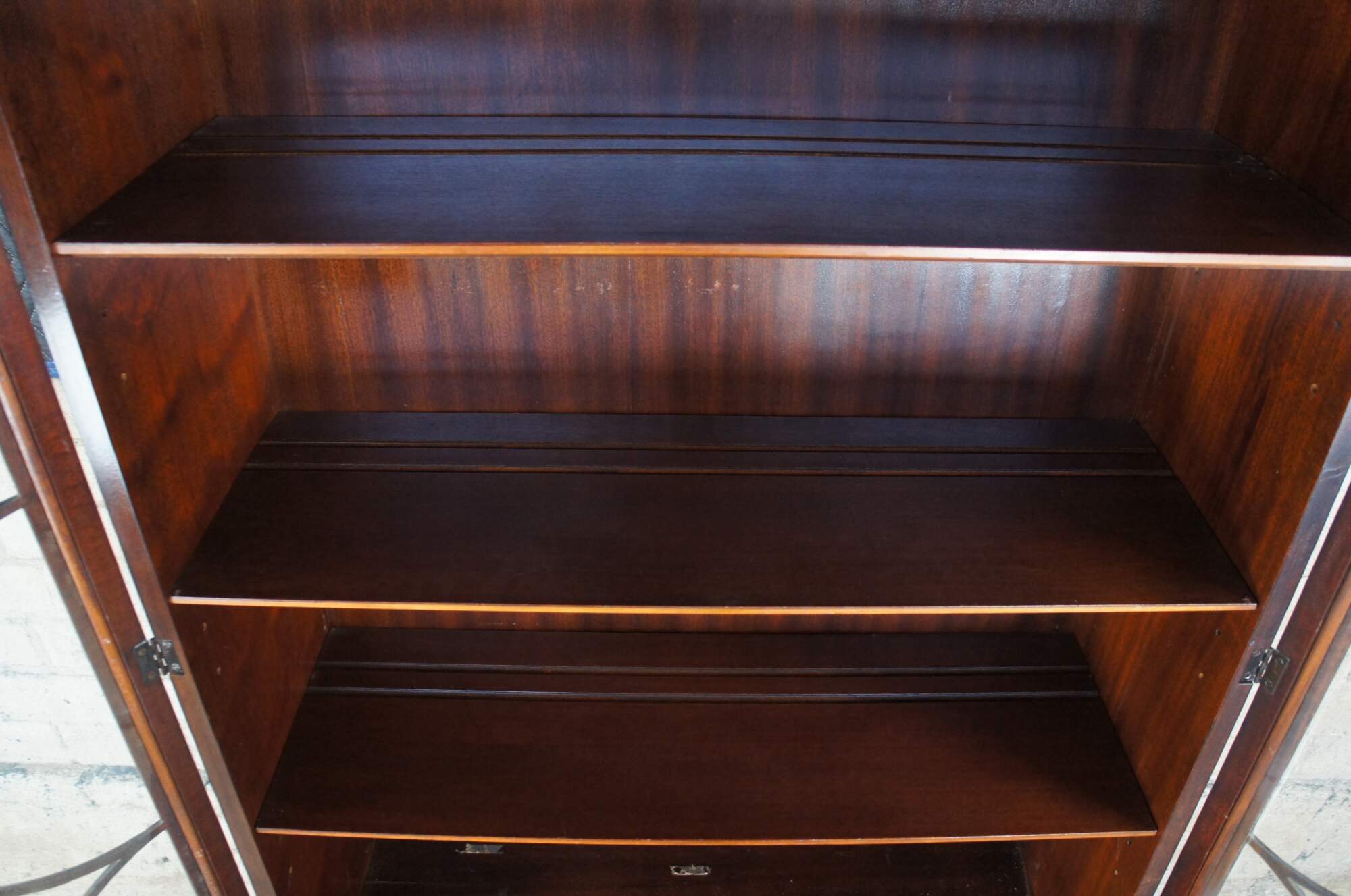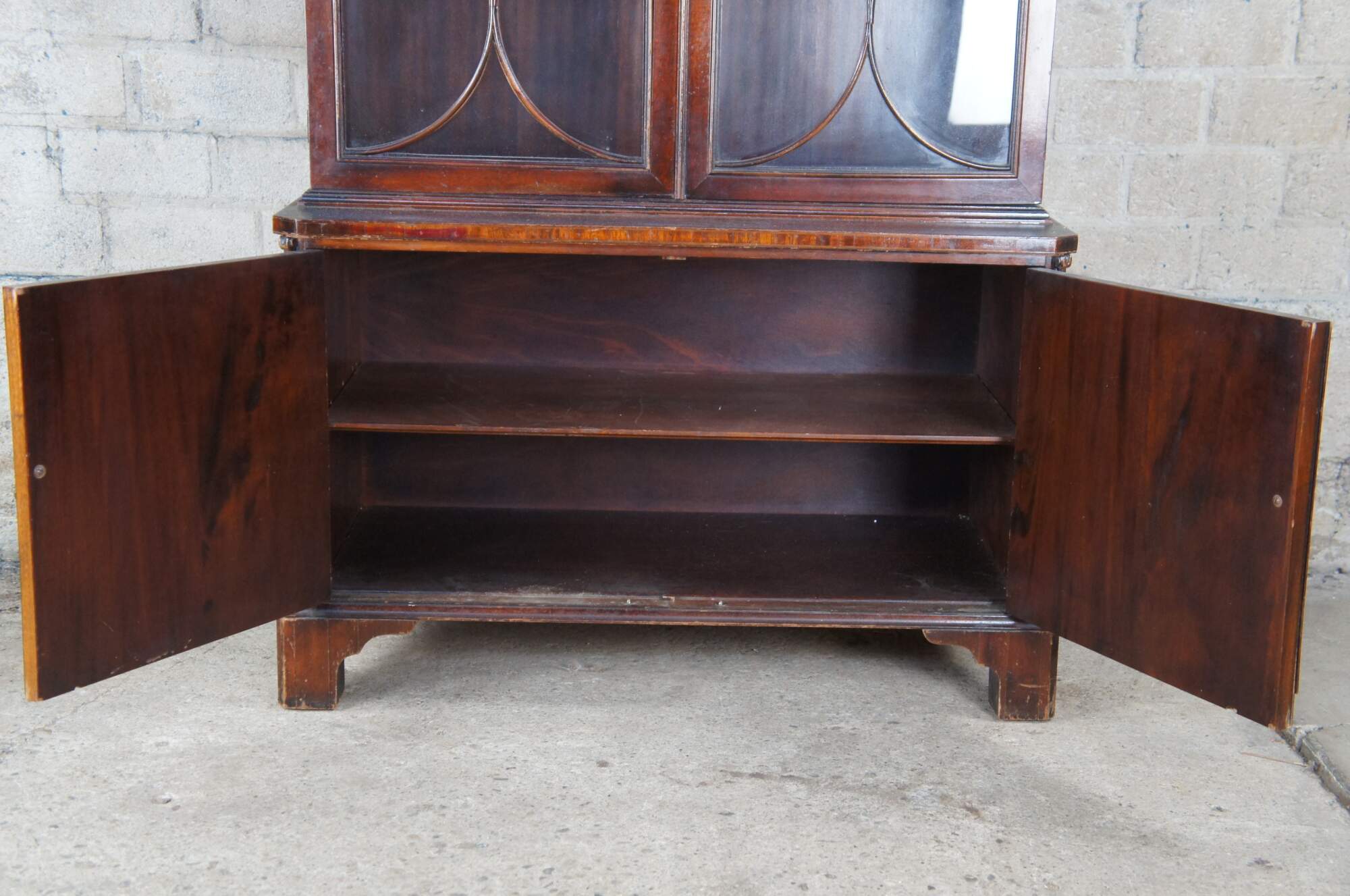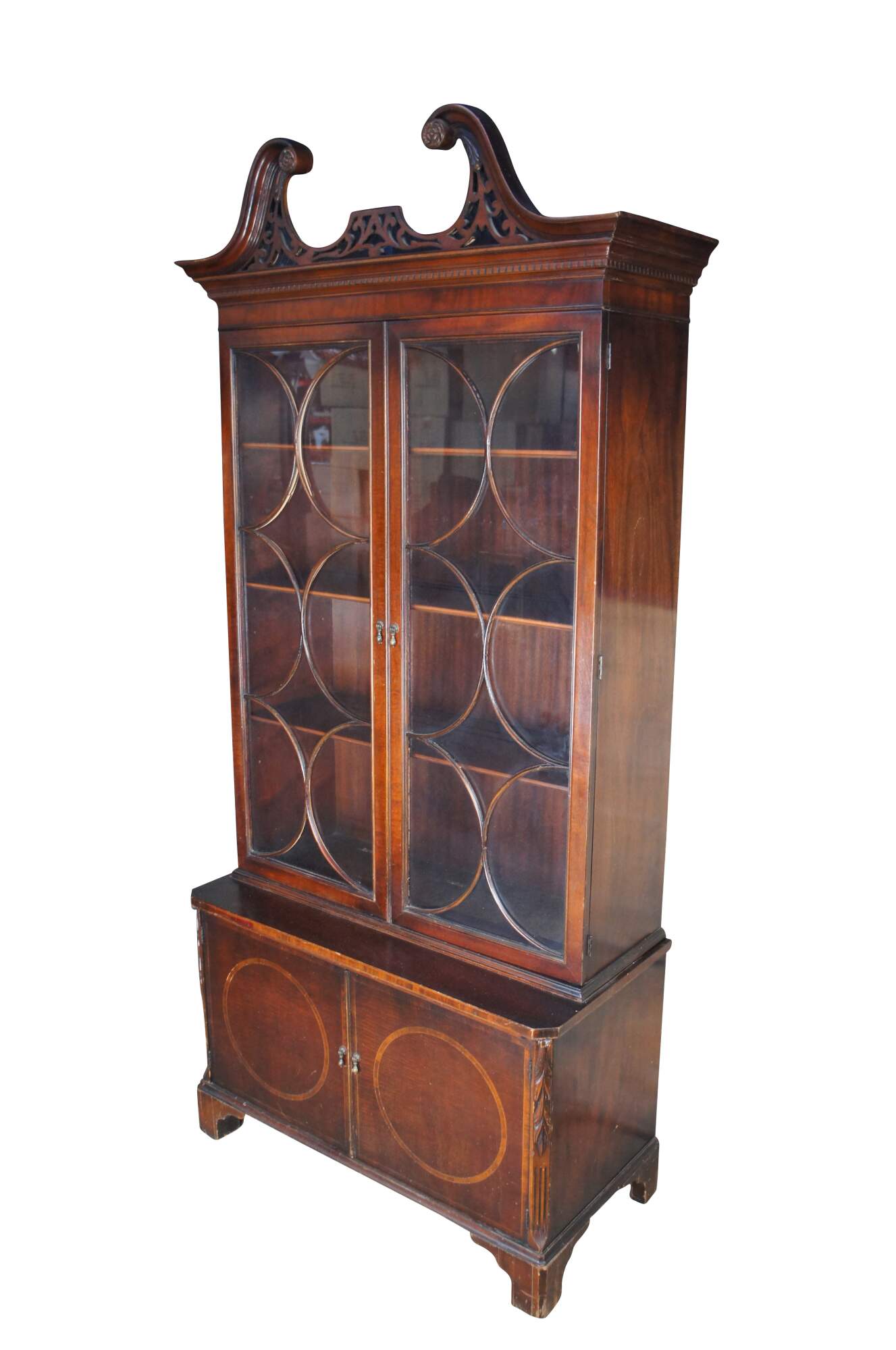 An exceptional banded mahogany China Display Cabinet or Bookcase by Union National, circa 1940s. Designed in George III styling with a beautiful interlaced open pediment crown with dentil molding over a stepback display portion showcasing diamond pattern fretwork. The interior has three shelves with plate grooves.