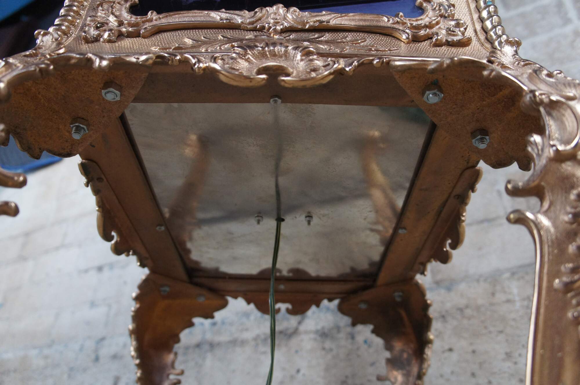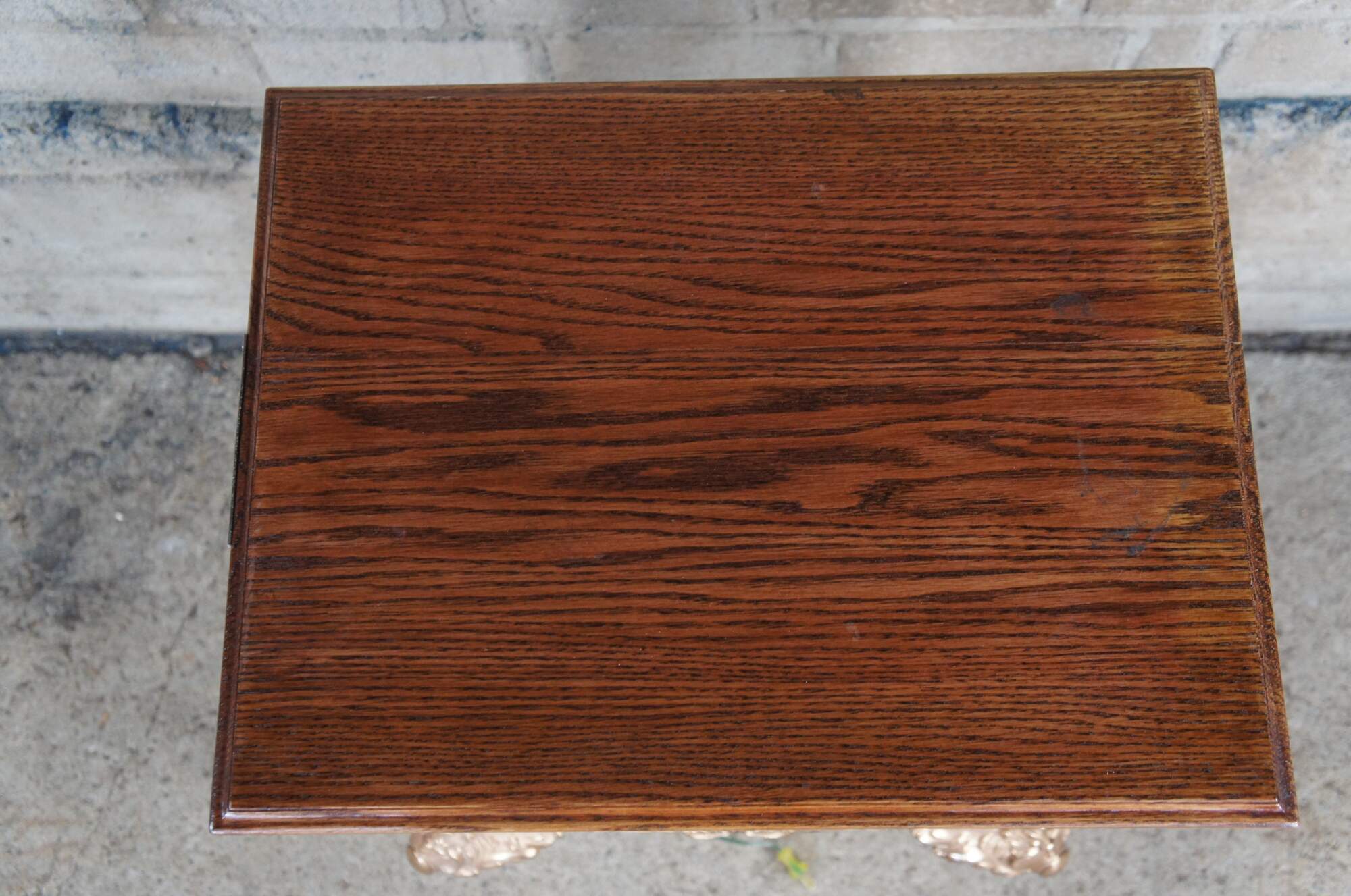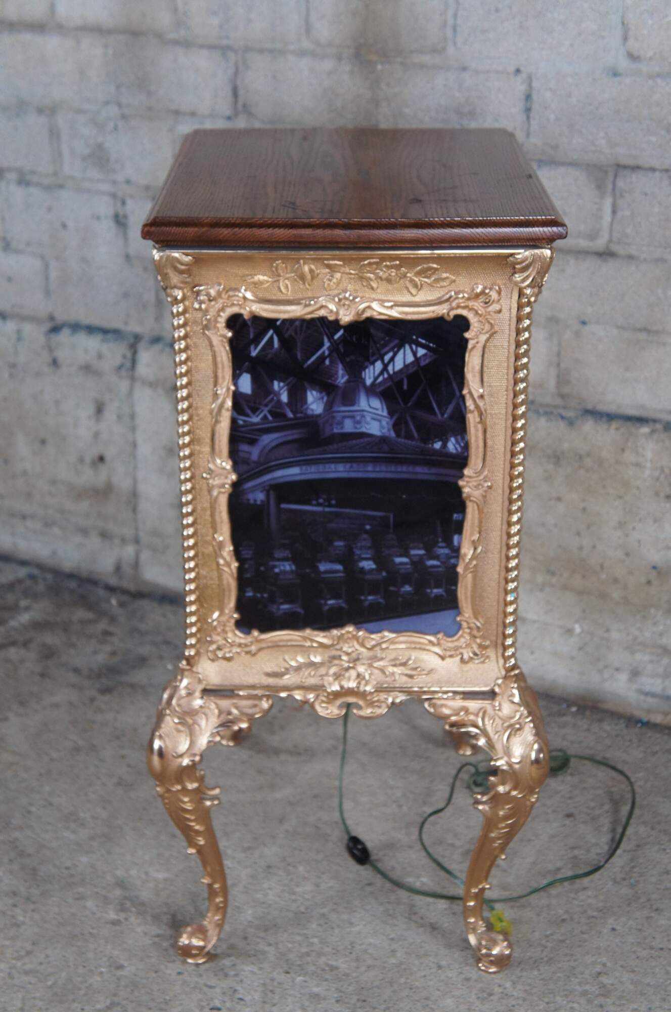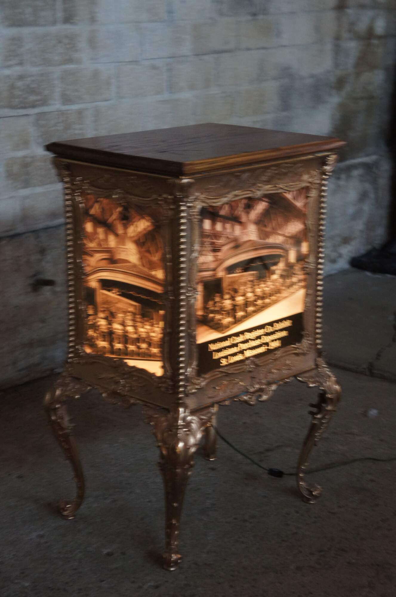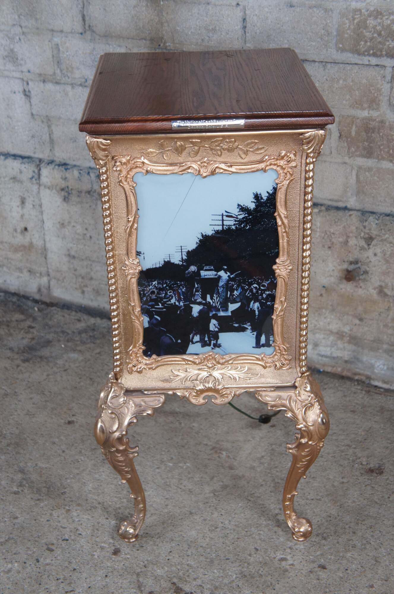 One of a kind Illuminated display table made for The National Cash Register in Dayton, Ohio. The table is designed in French Baroque styling with an oak top over an ornate brass frame centered around four back-lit commemorative scenes. The table was displayed in NCR headquarters with a 313 Special Register on top.