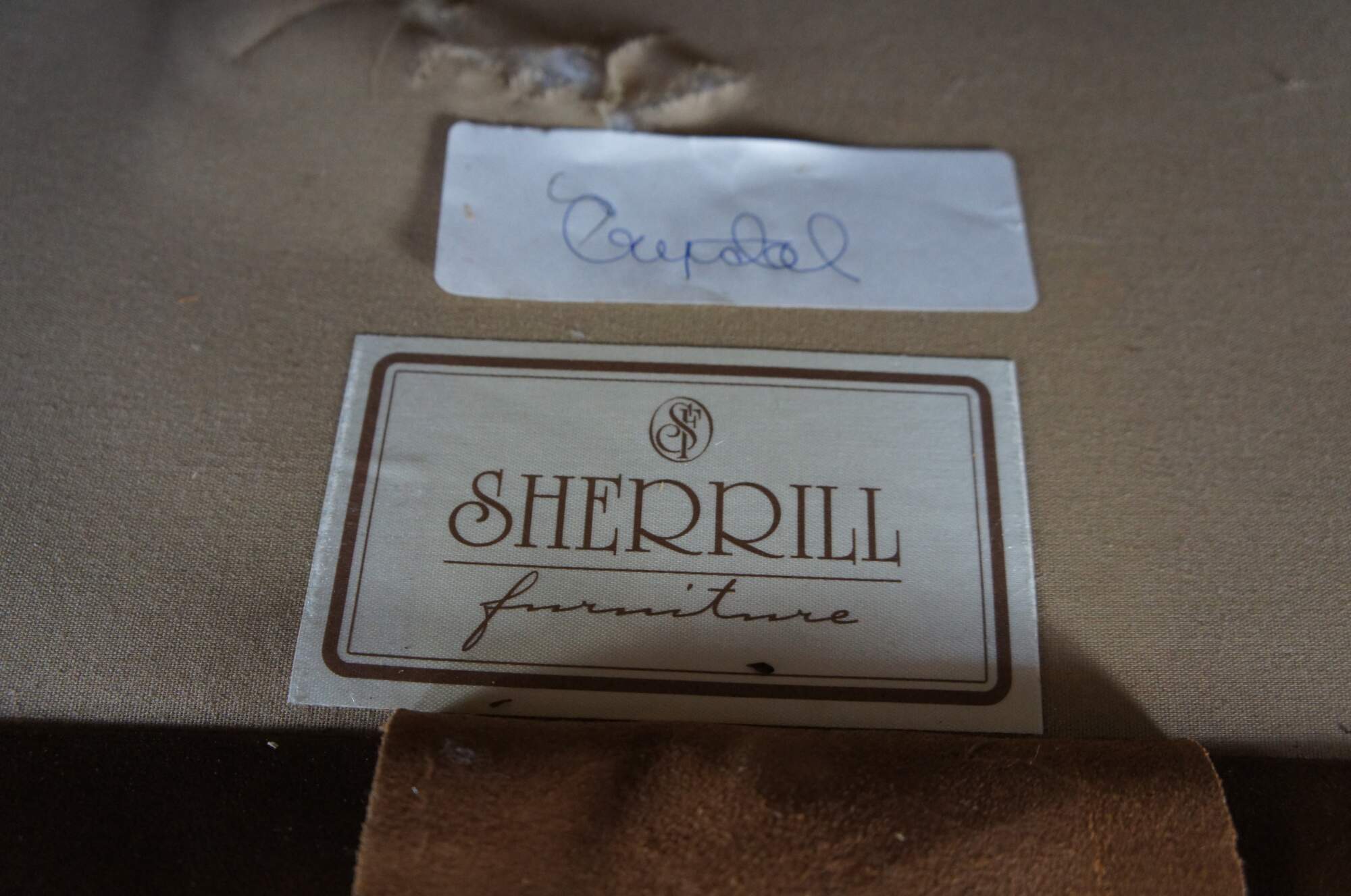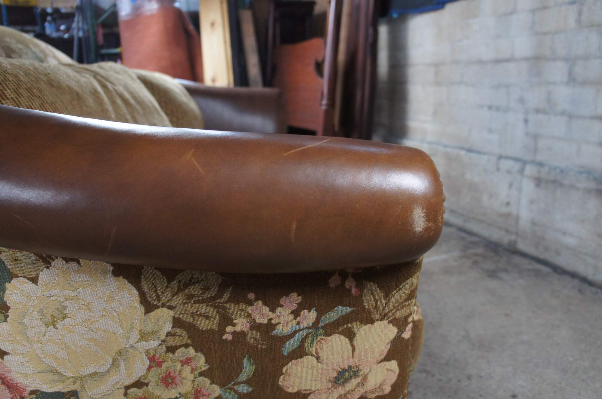 Late 20th Century Sherrill Furniture Traditional Camelback Sofa. Features a mahogany frame wrapped in brown leather and floral upholstery with brass nailhead trim. The sofa body is 80% polyester fiber batting and 20% urethan foam. Seat cushions are 60% urethane foam and 40% down blend. The sofa showcases a serpentine lower apront over turned and tapered connected by turned stretchers.