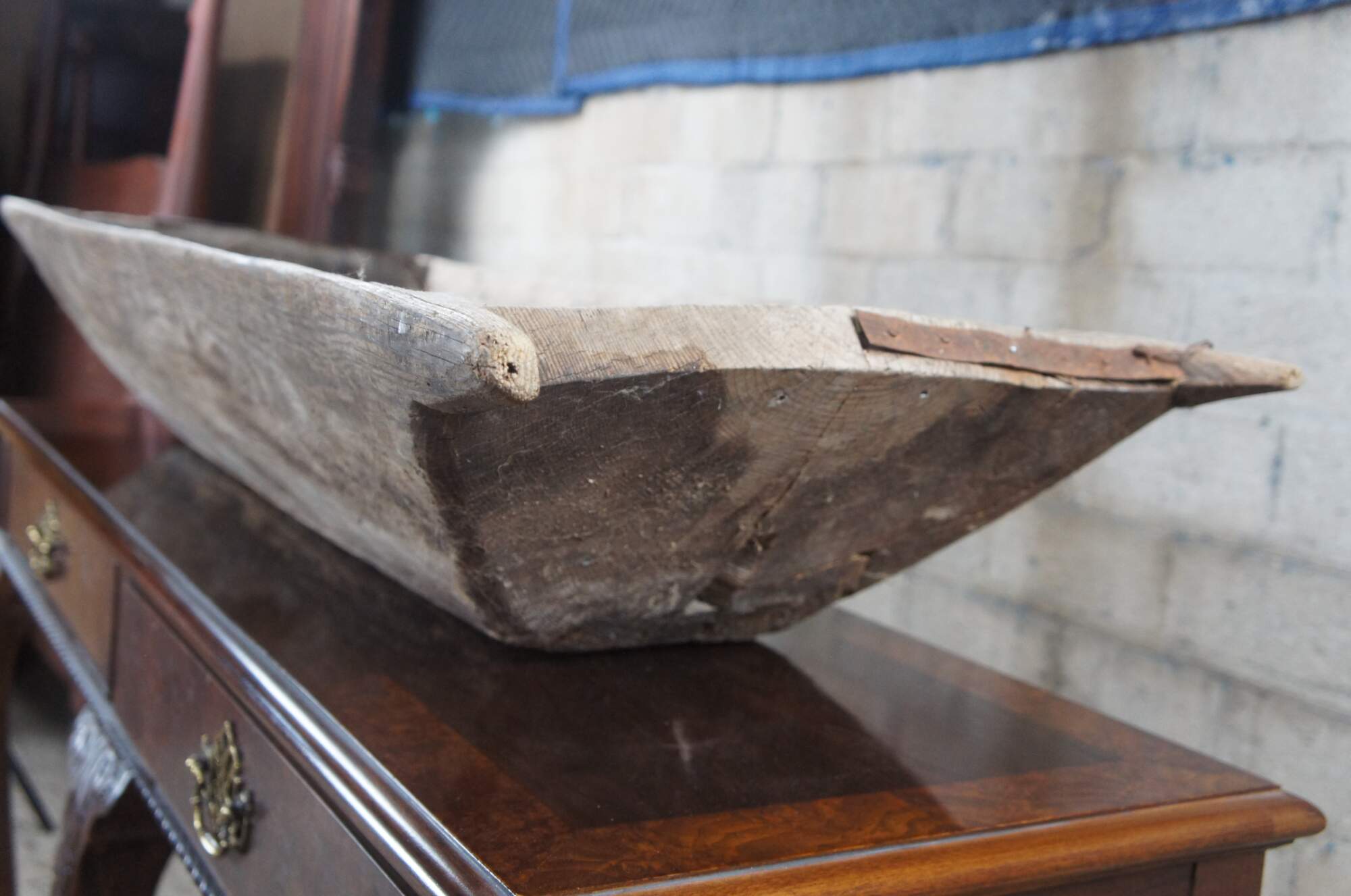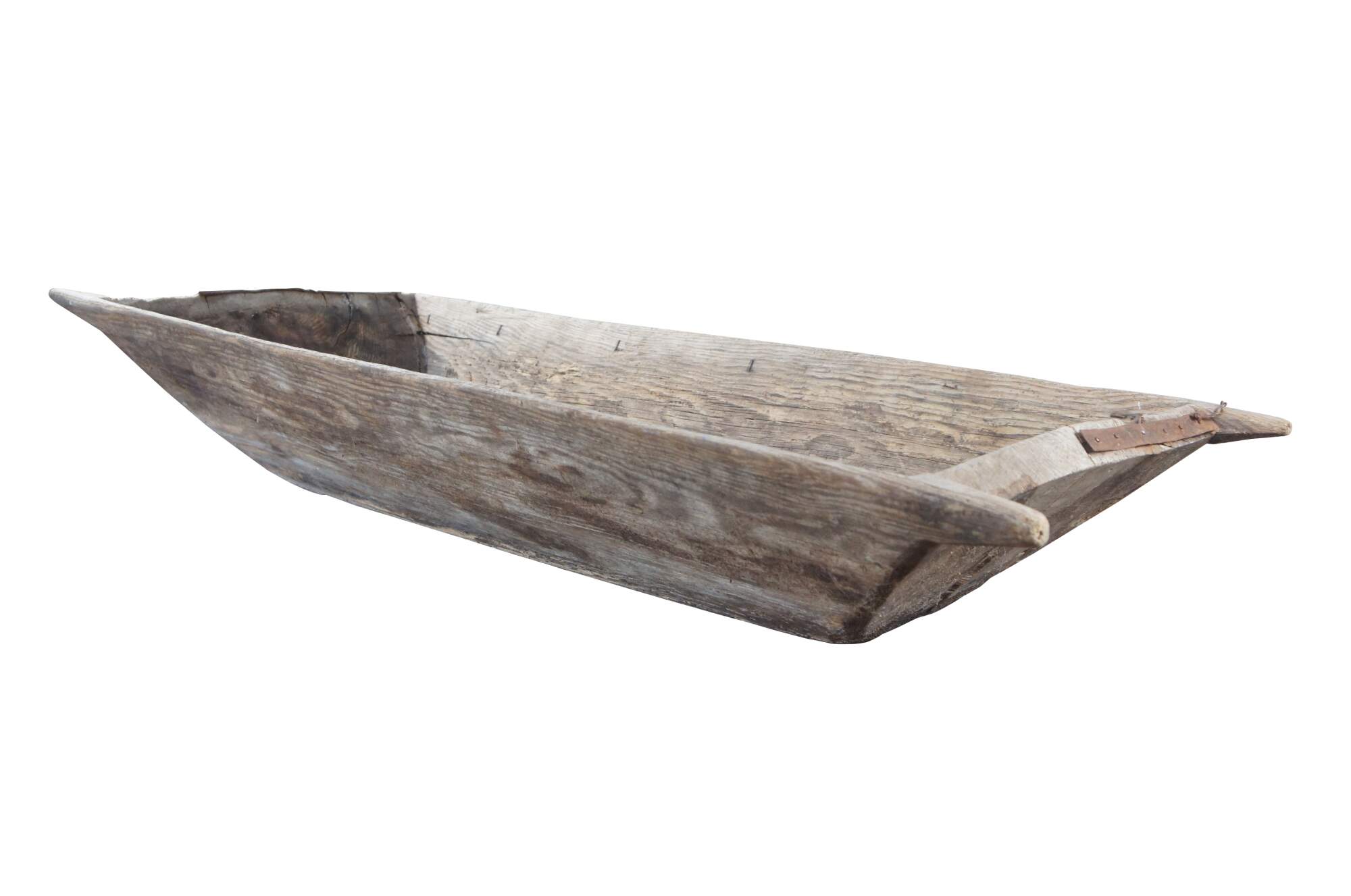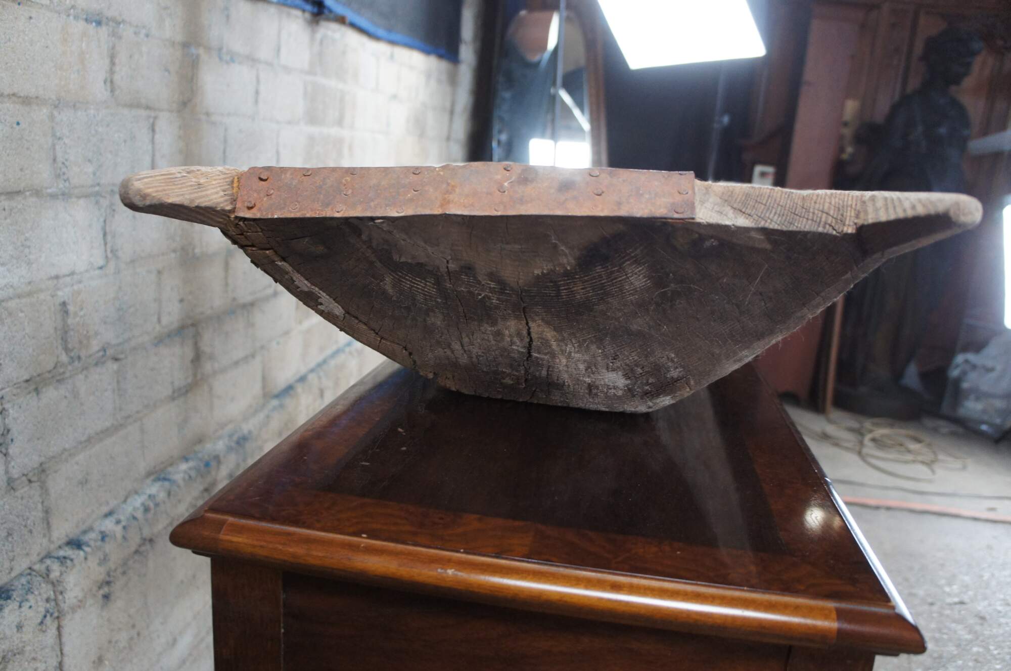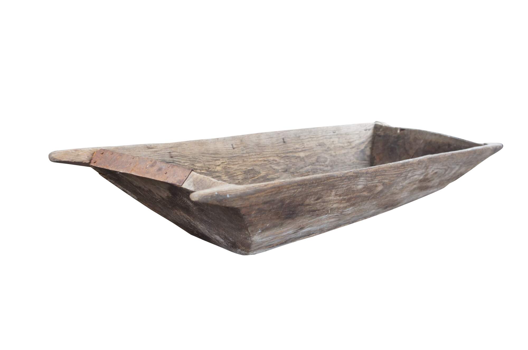 Antique oak rustic treen dough bowl/ trencher. Rectangular in form with pointed sides and a rounded bottom. Each side has some metal plates from past repairs.