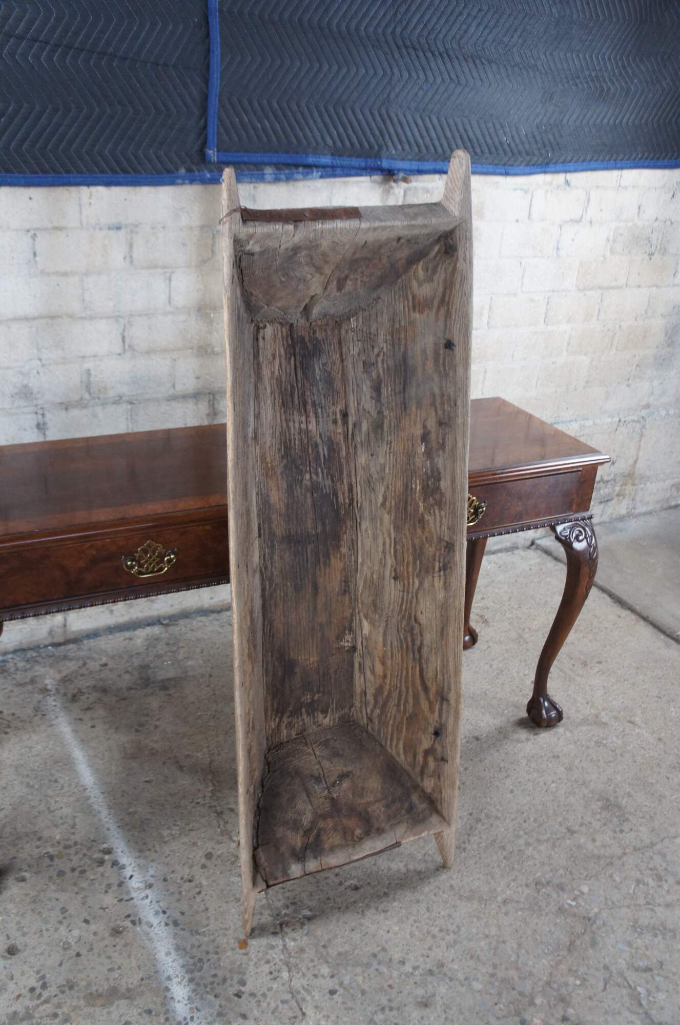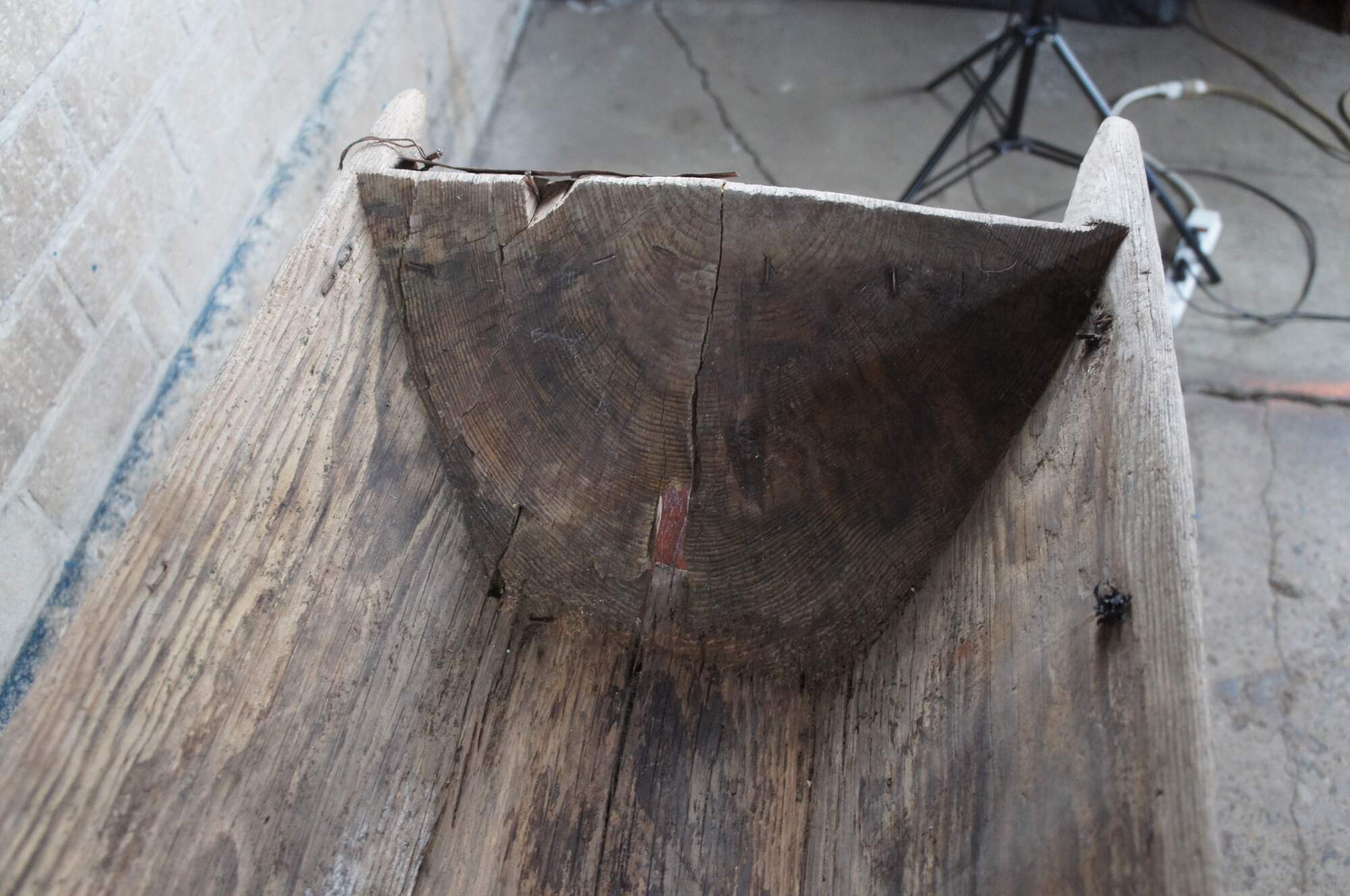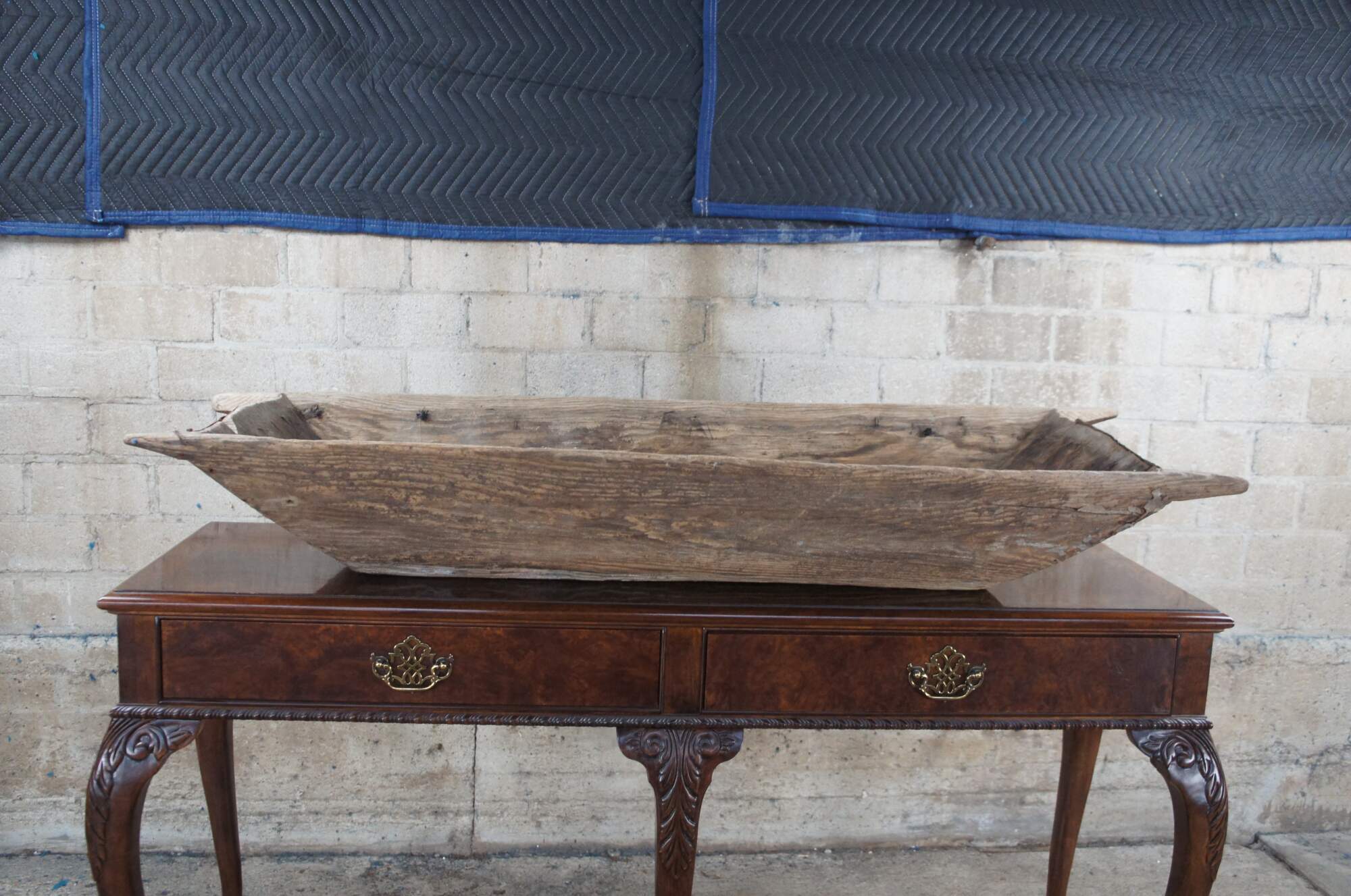 Antique oak rustic treen dough bowl/ trencher. Rectangular in form with pointed sides and a rounded bottom. Each side has some metal plates from past repairs.