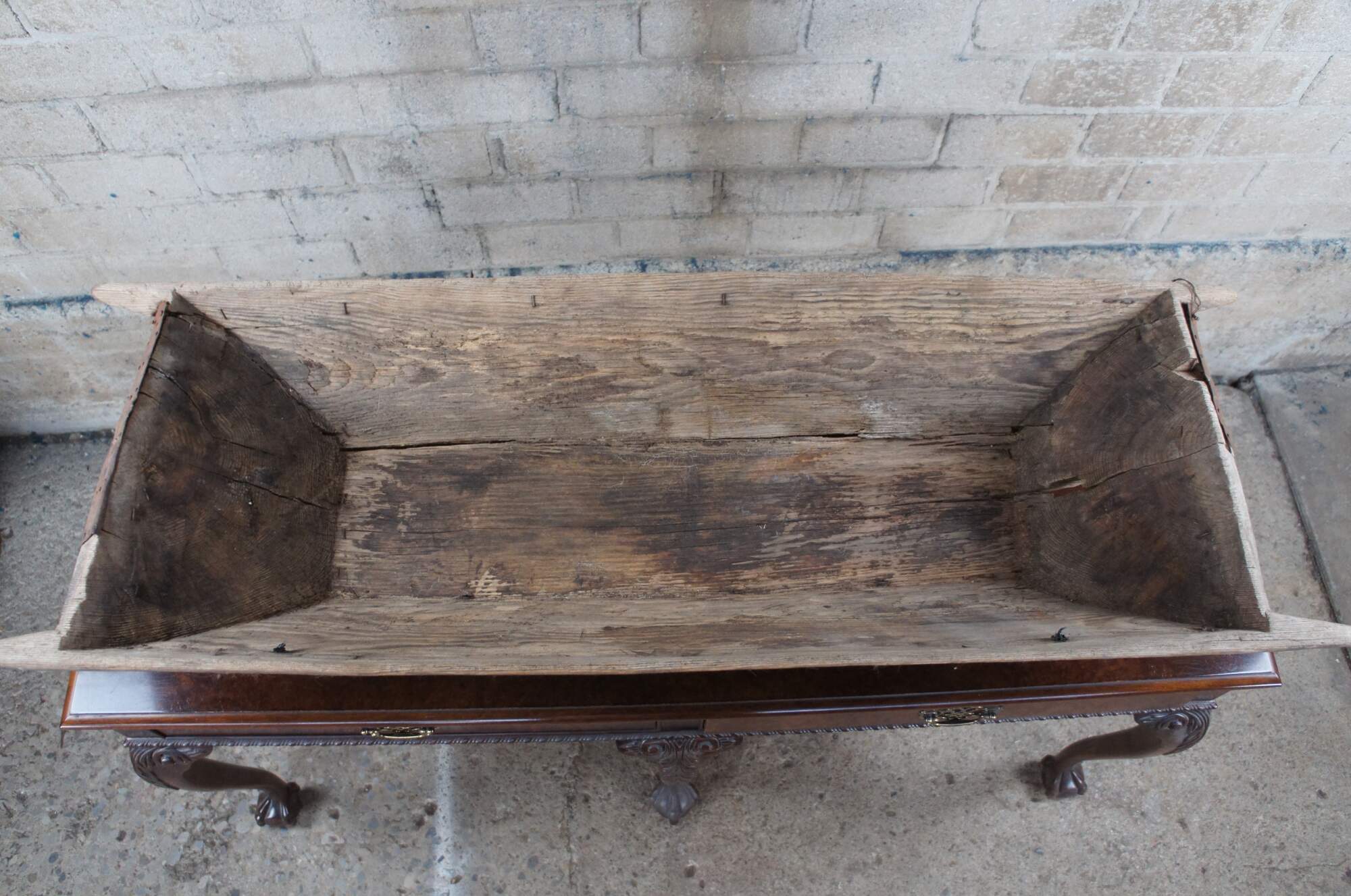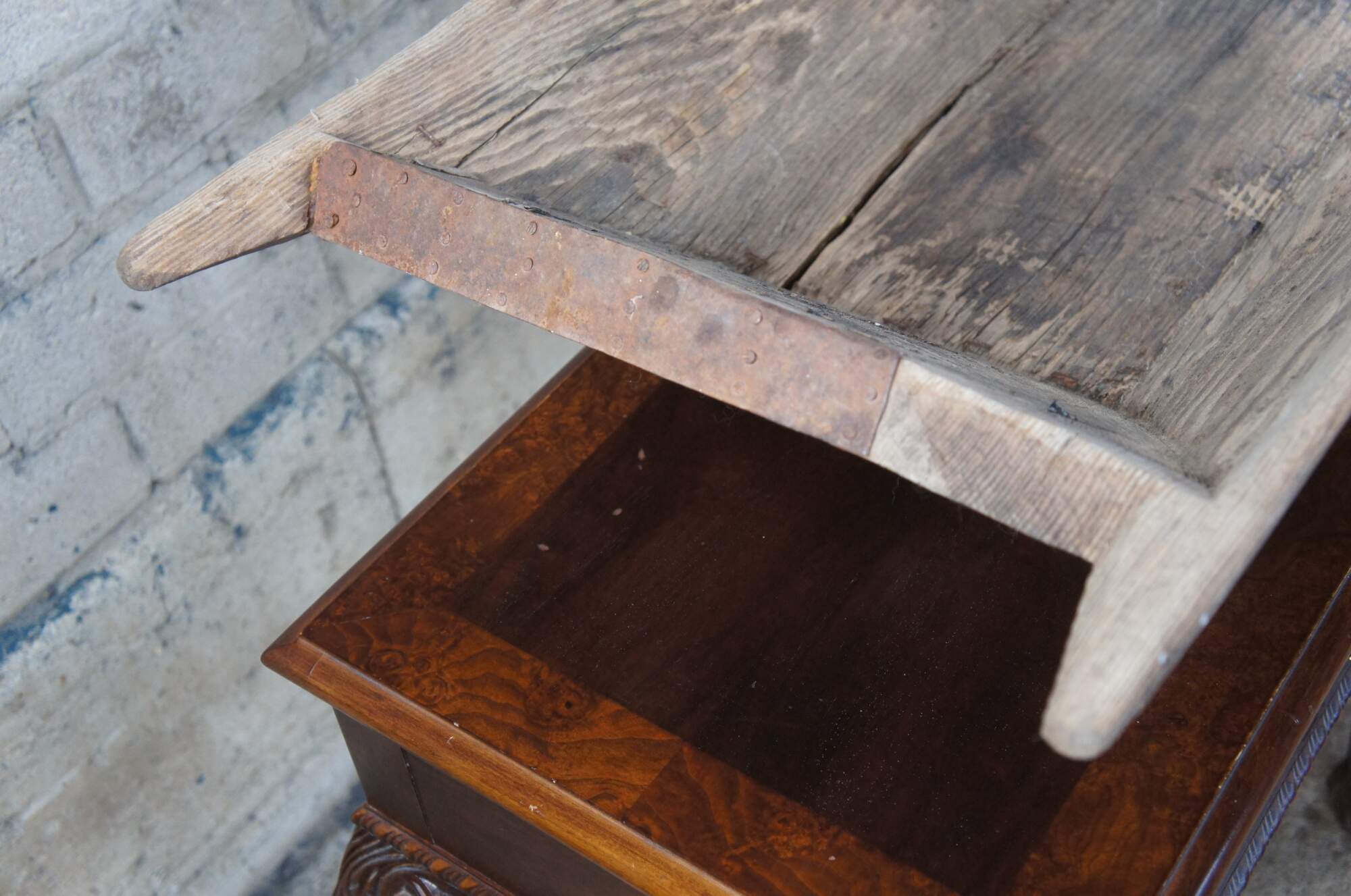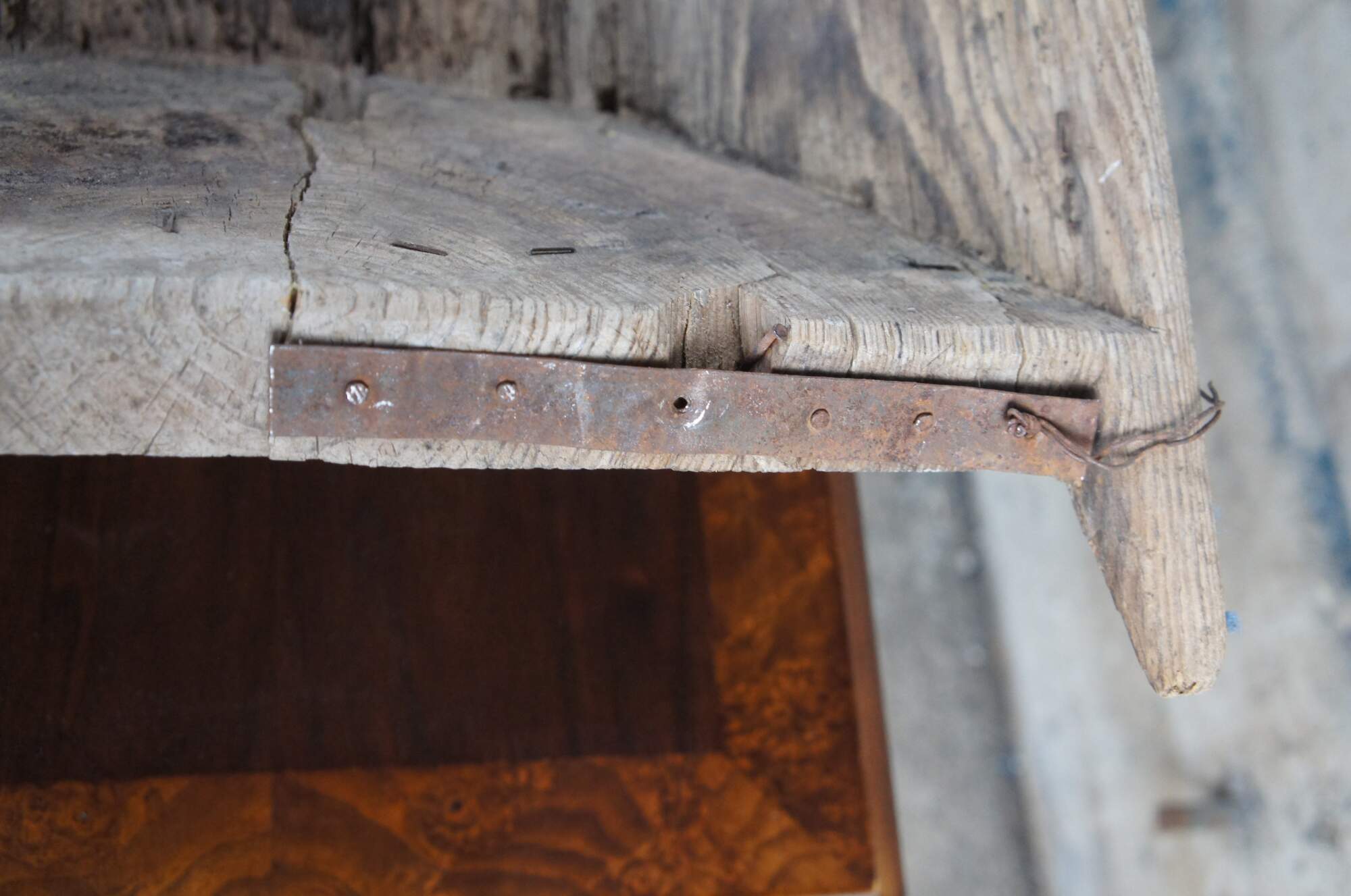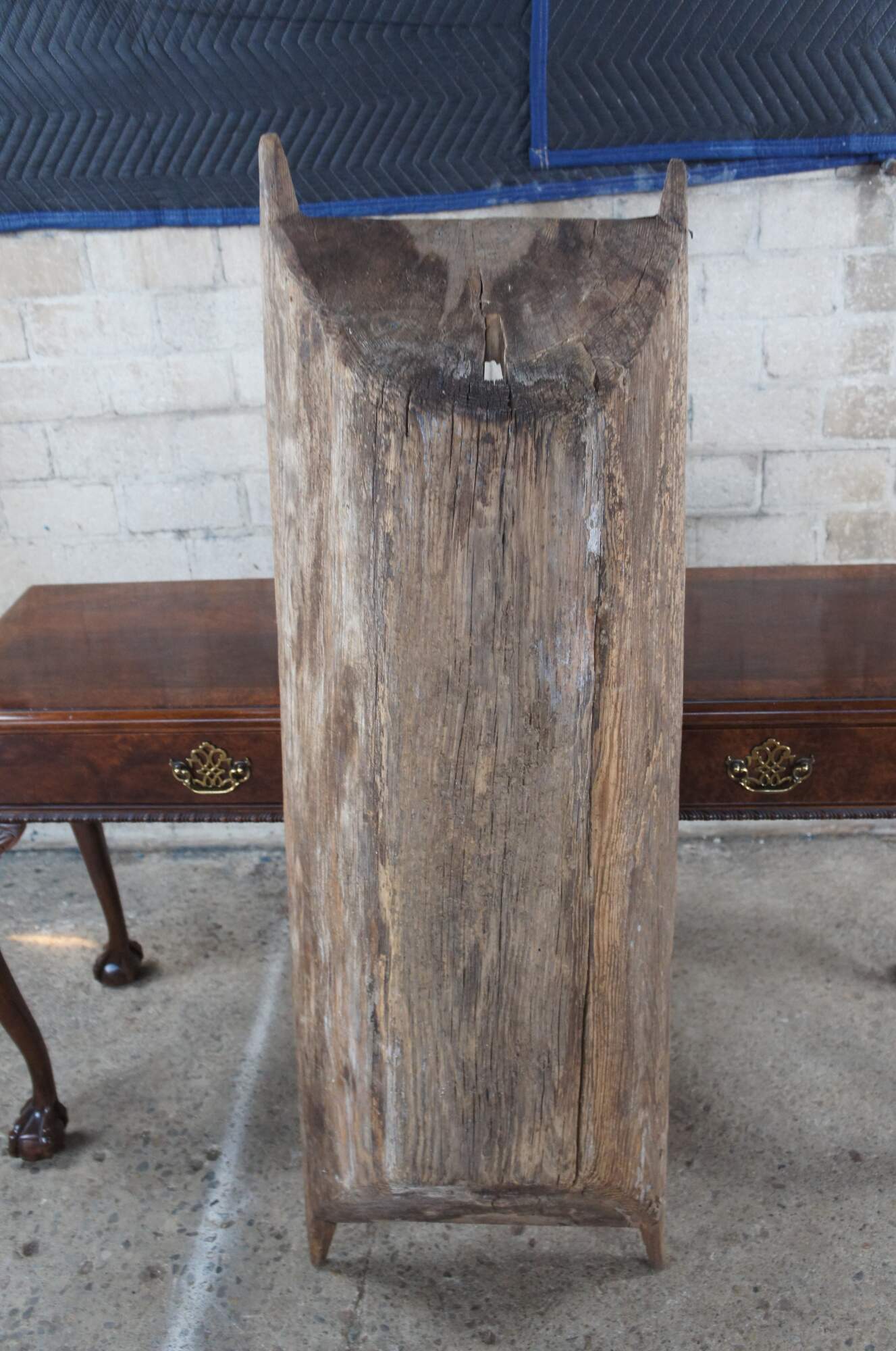 Antique oak rustic treen dough bowl/ trencher. Rectangular in form with pointed sides and a rounded bottom. Each side has some metal plates from past repairs.