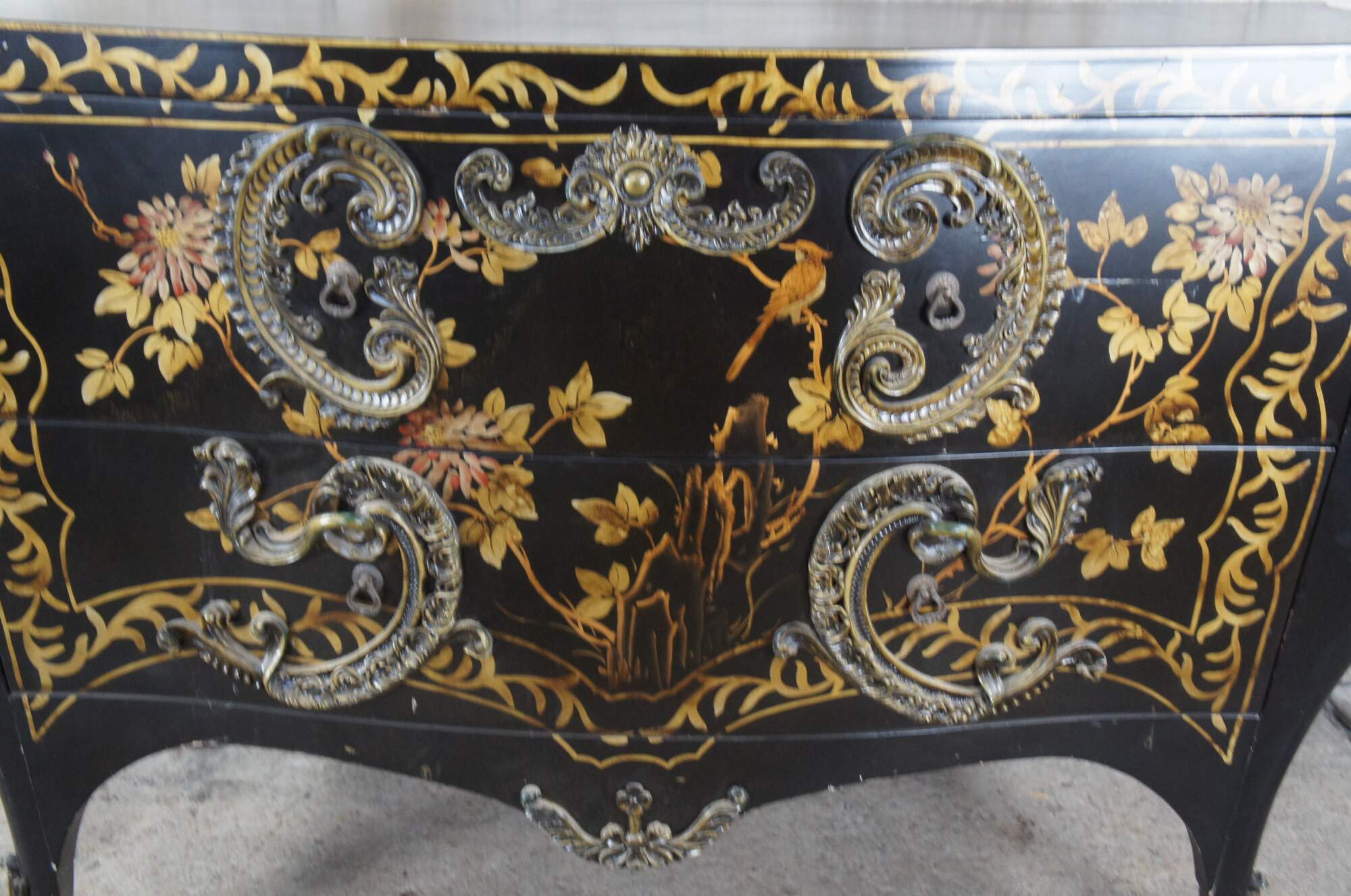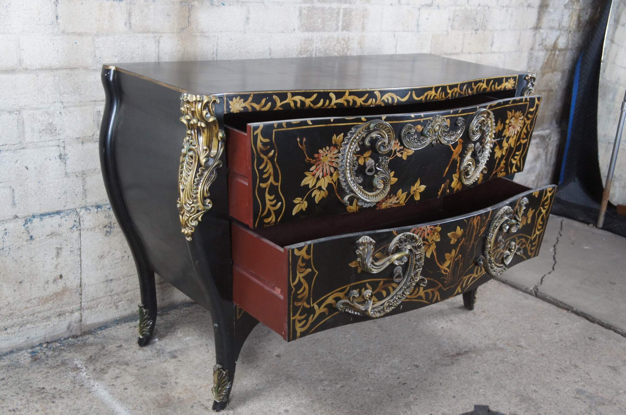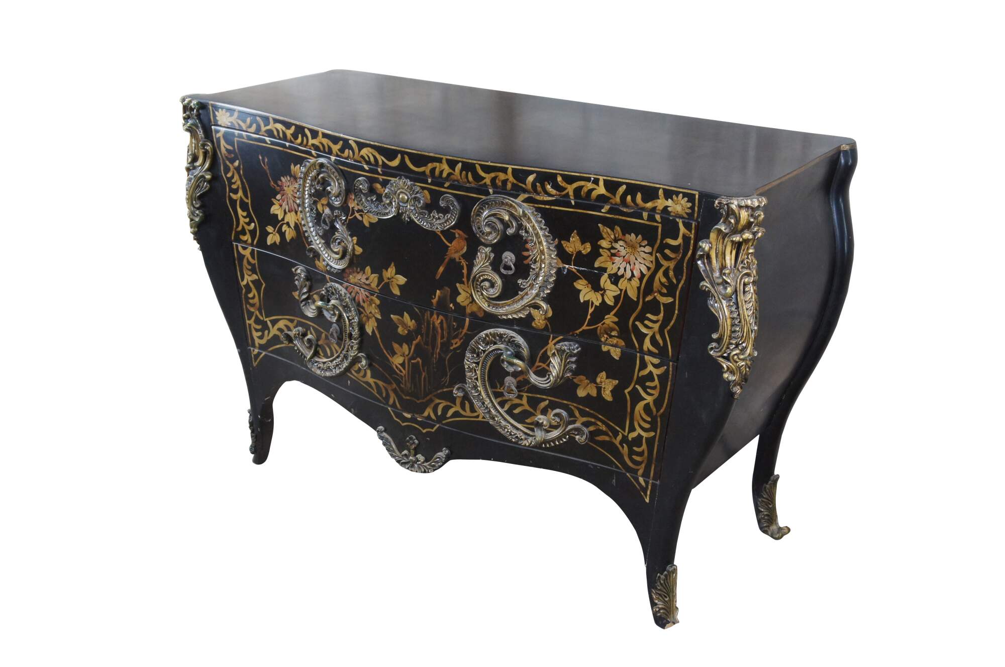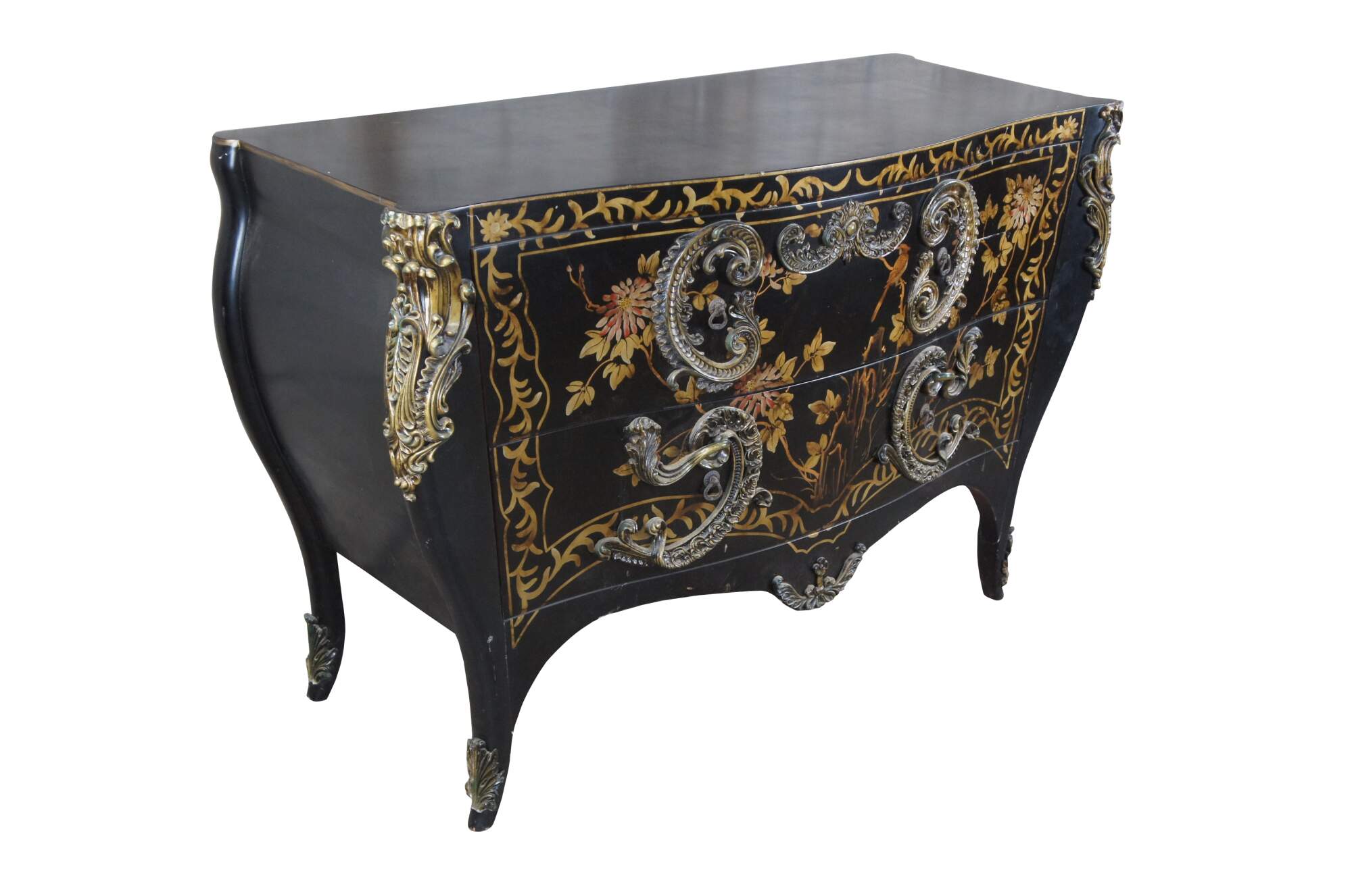 A lovely early 21st century Louis XV style Chinoiserie commode. Features a black painted finish with foliate, chrysanthemums and birds. The chest has two large drawers and showcases ormolu style accents made from composite / resin.