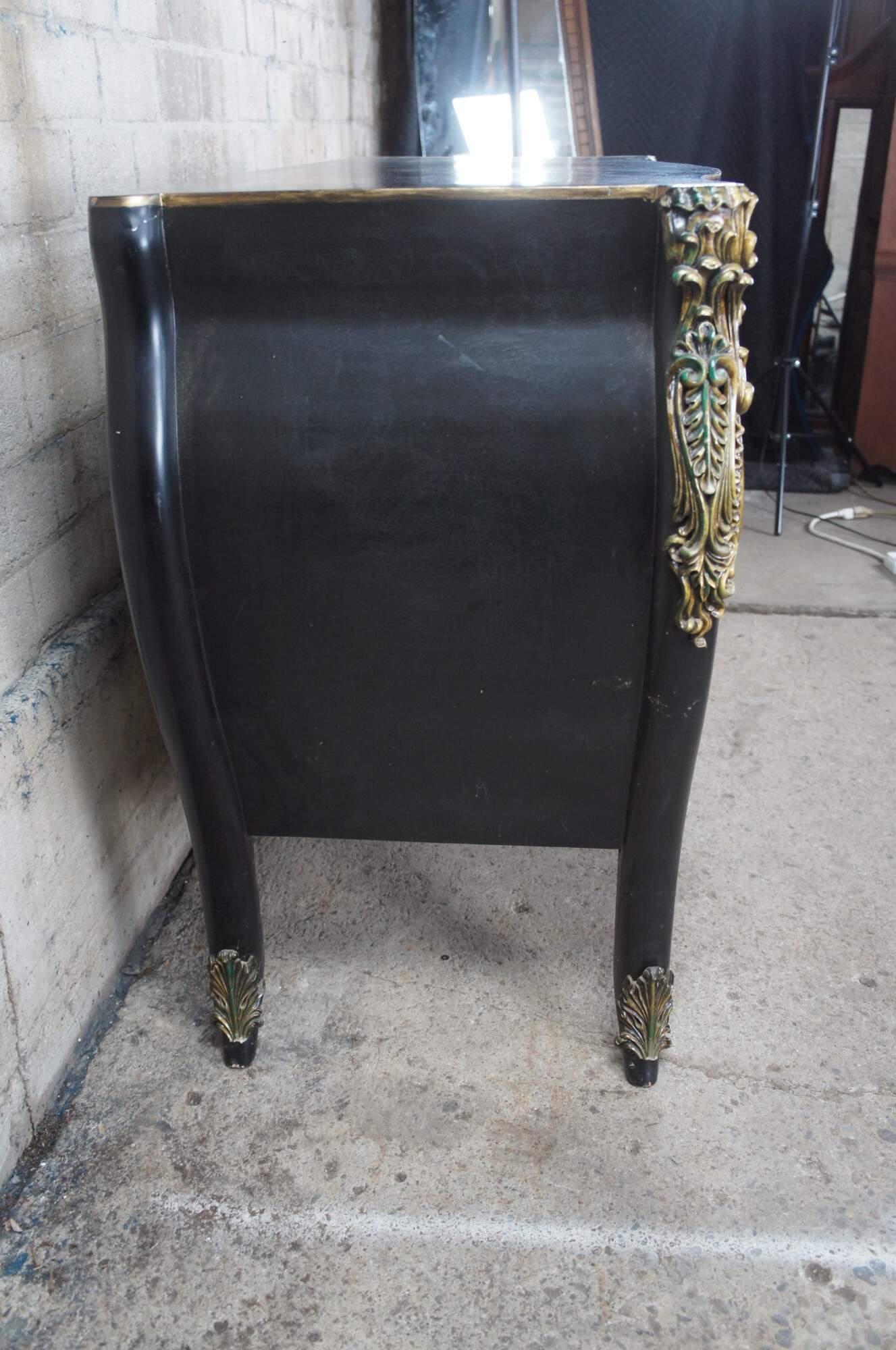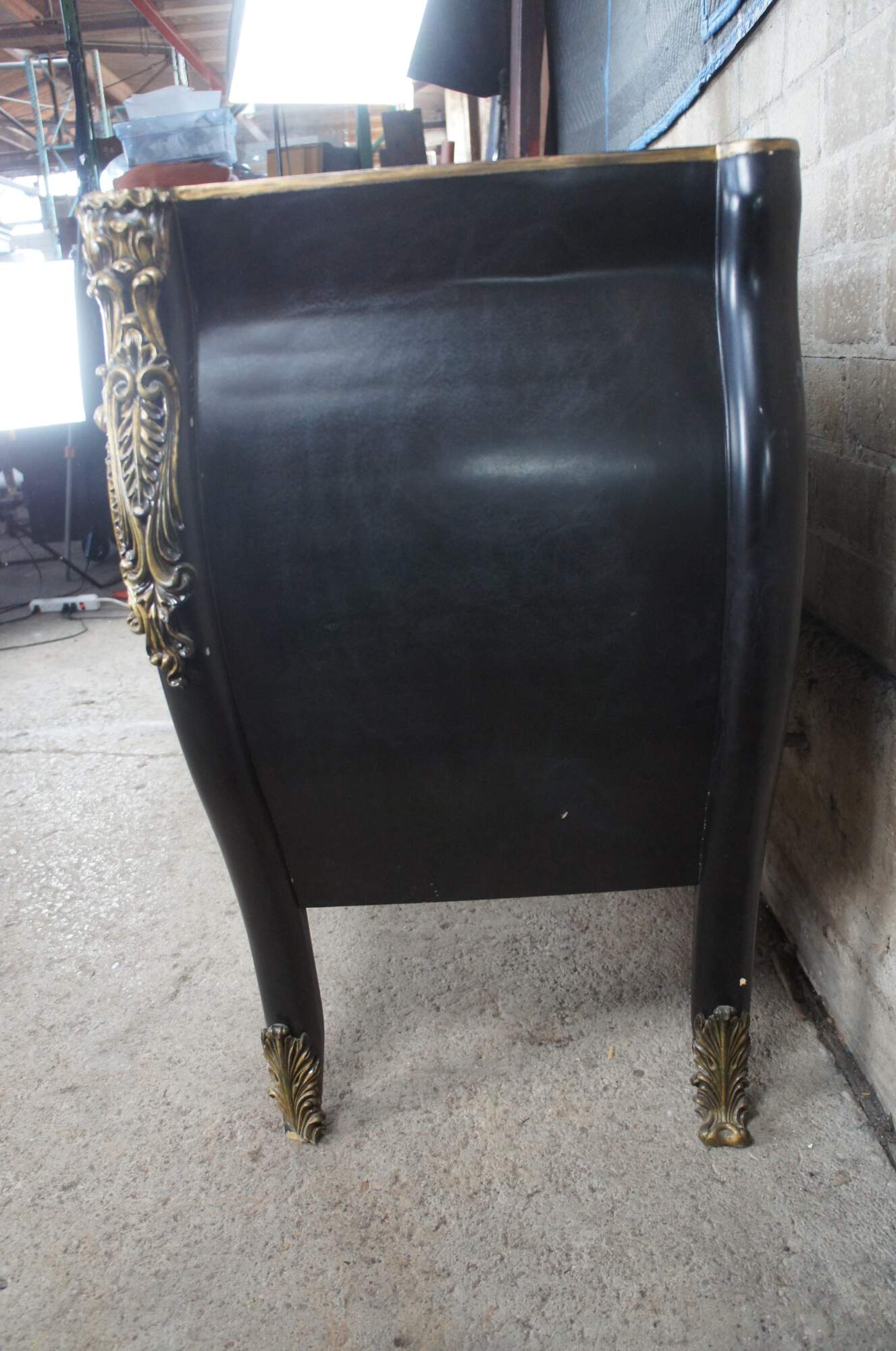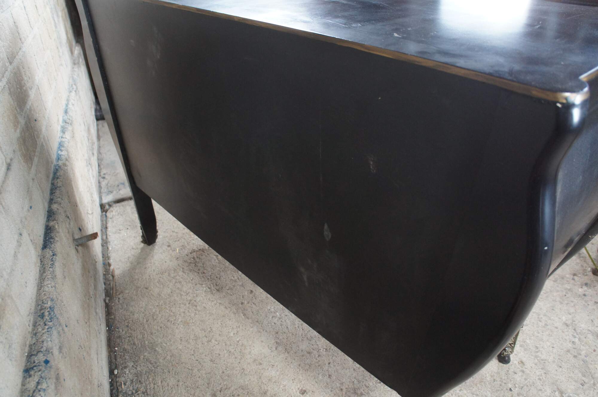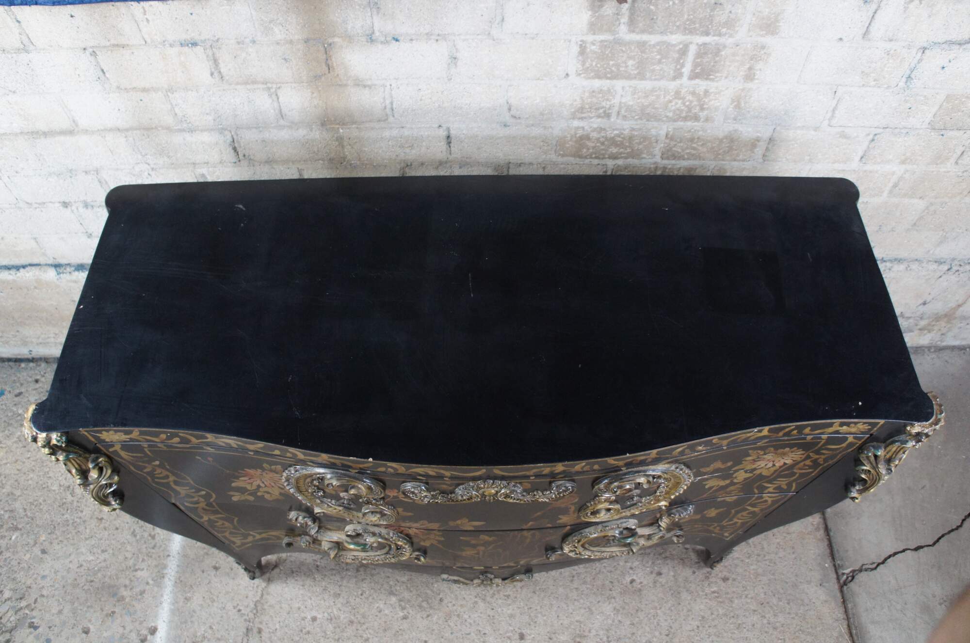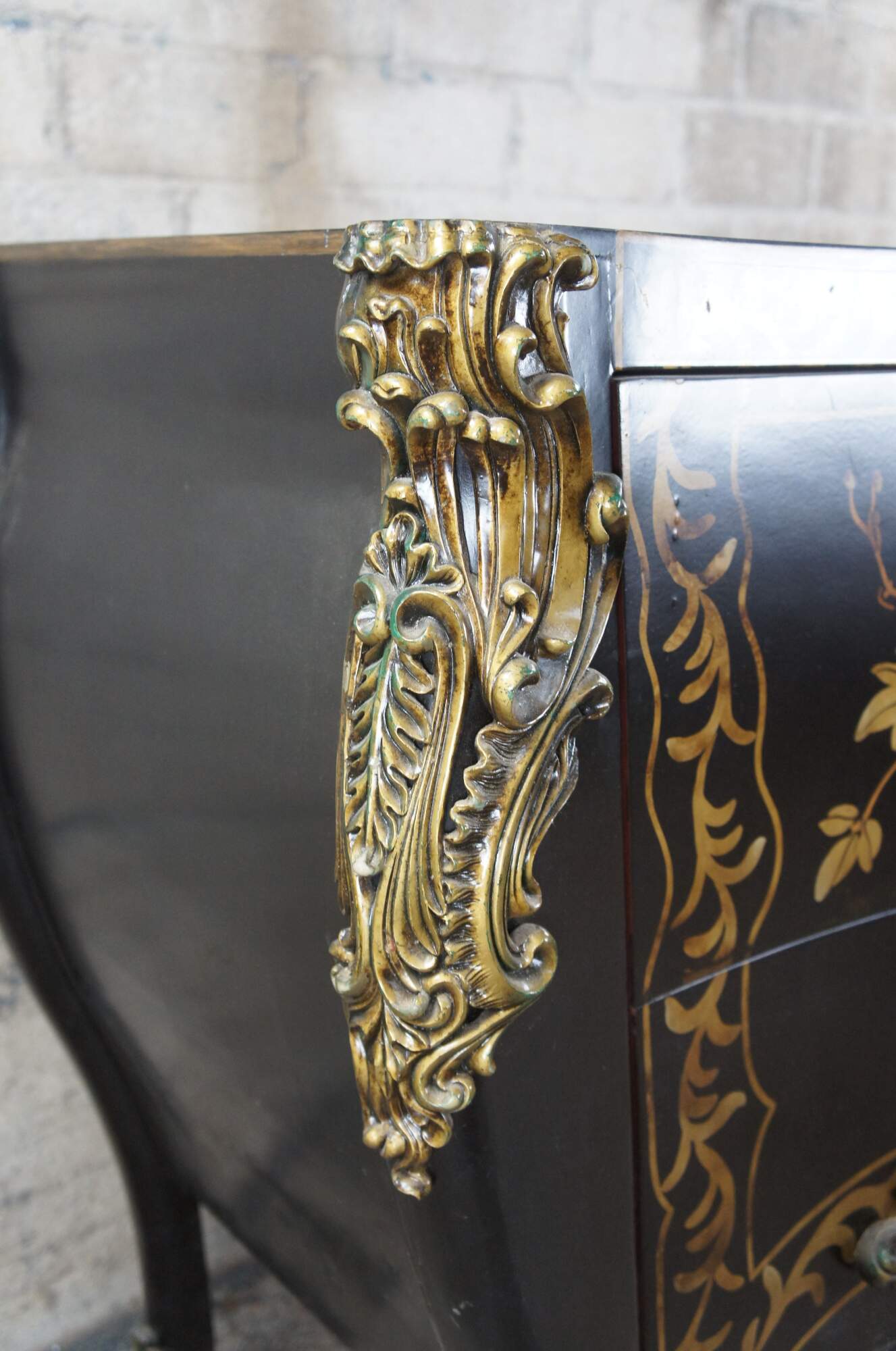 A lovely early 21st century Louis XV style Chinoiserie commode. Features a black painted finish with foliate, chrysanthemums and birds. The chest has two large drawers and showcases ormolu style accents made from composite / resin.