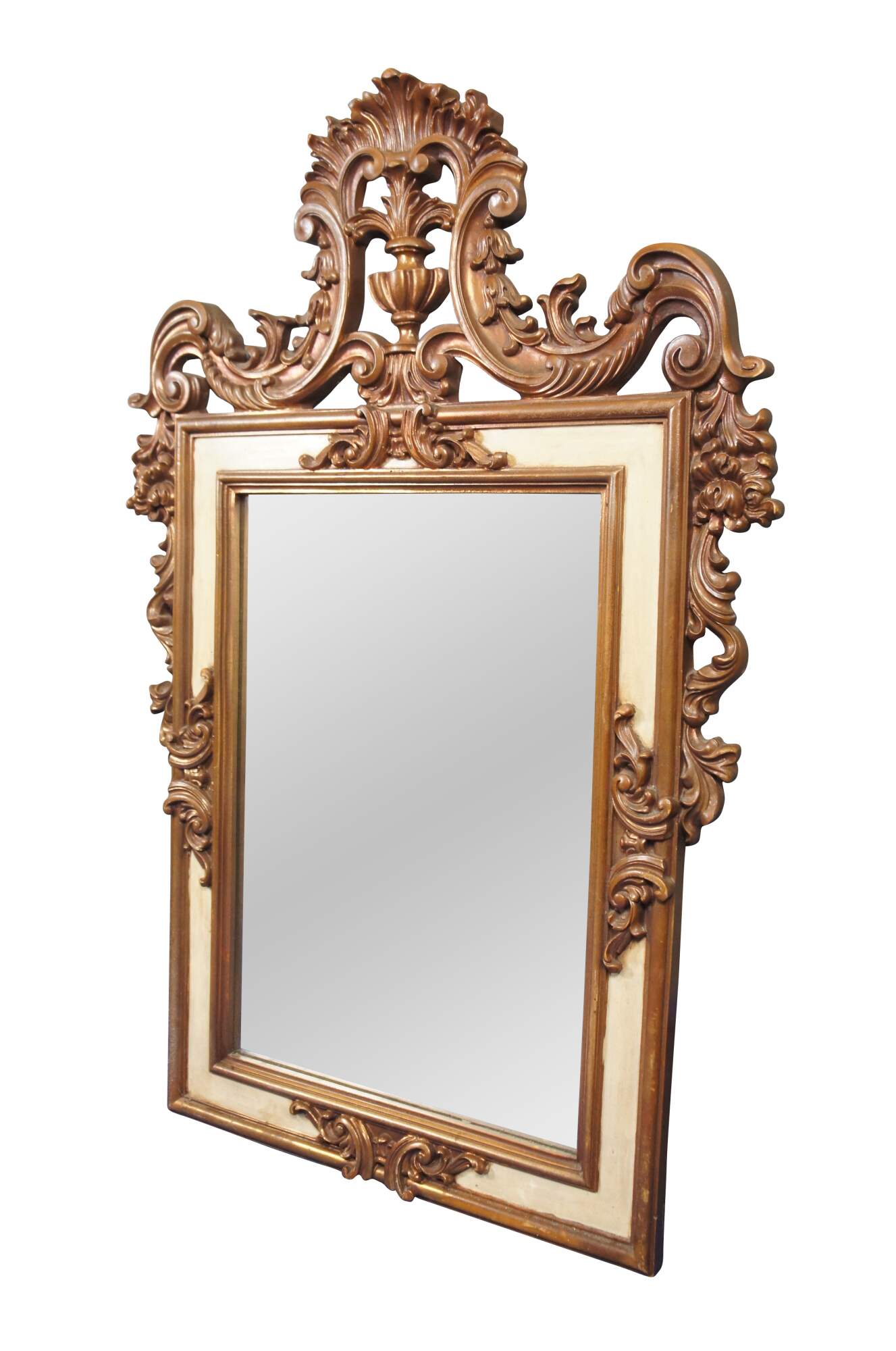 Late 20th century composite framed rectangular wall mirror featuring Baroque / French Provincial / Hollywood Regency style with a fountain urn surrounded by swirling foliates, acanthus, and white painted accent. Marked 110 on reverse.