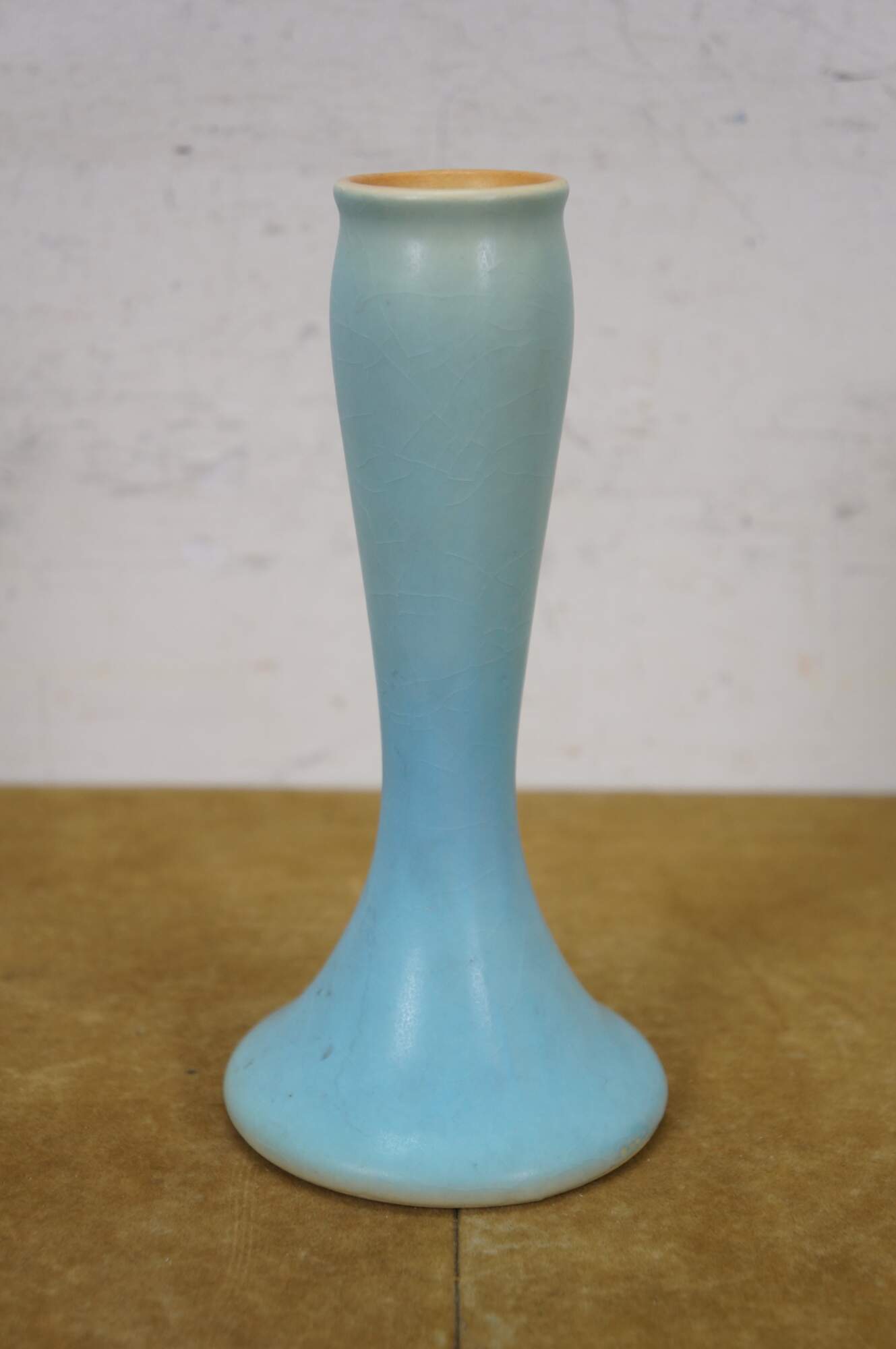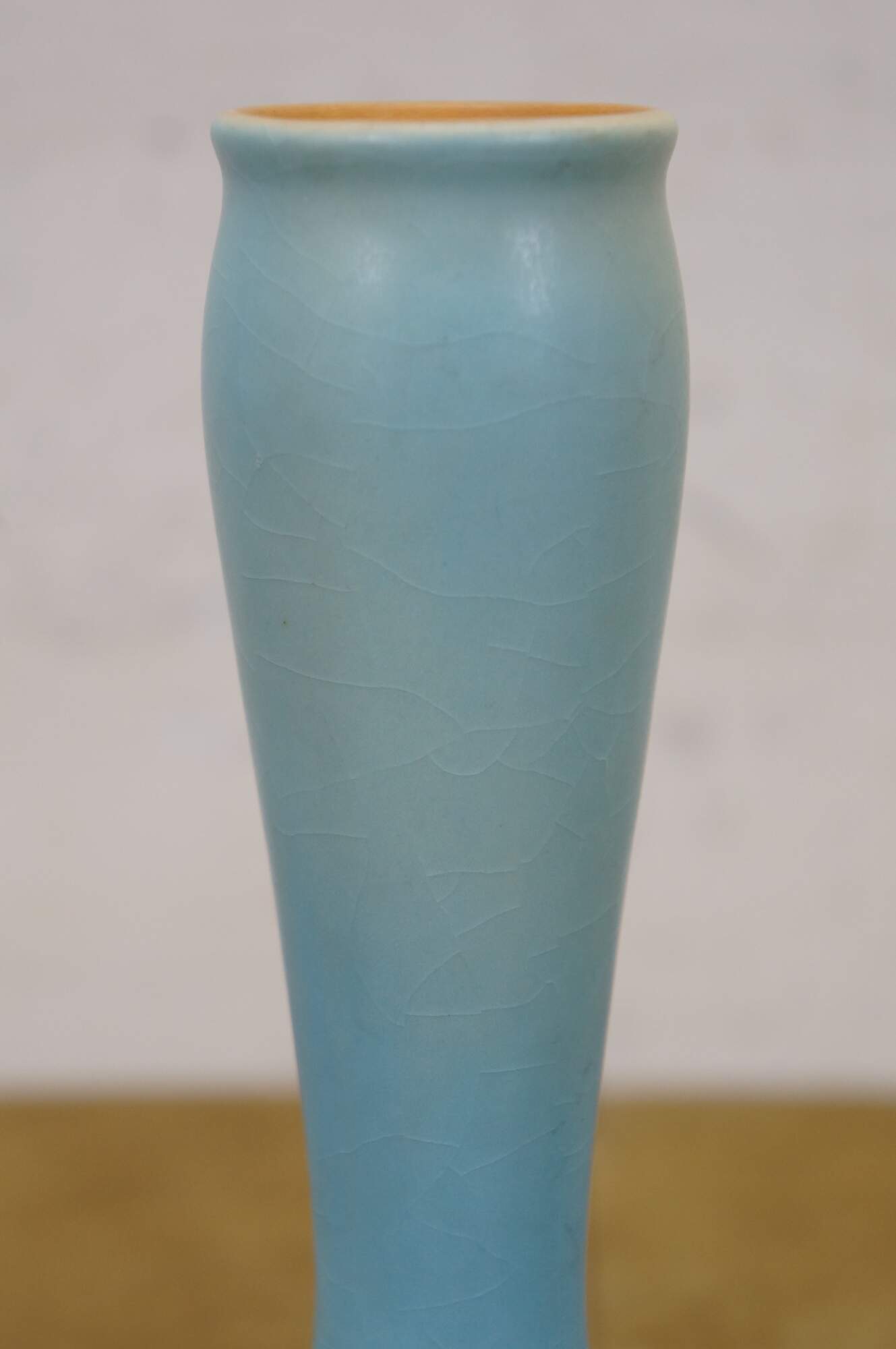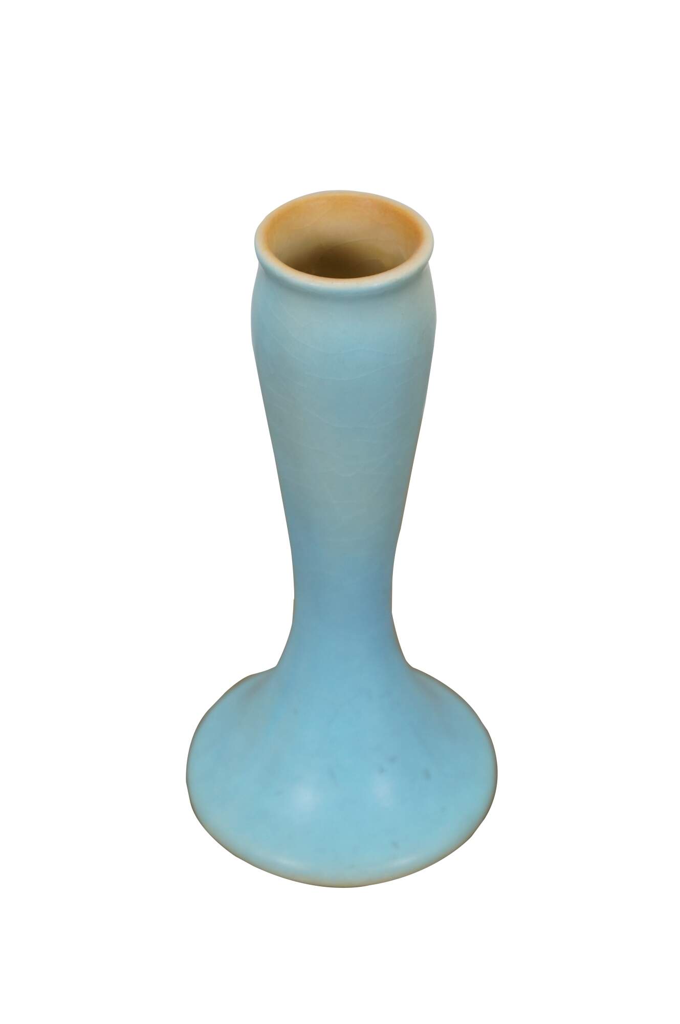 Circa 1940's Roseville art pottery Florane II 79-7 ceramic bud vase in light blue with golden brown interior.