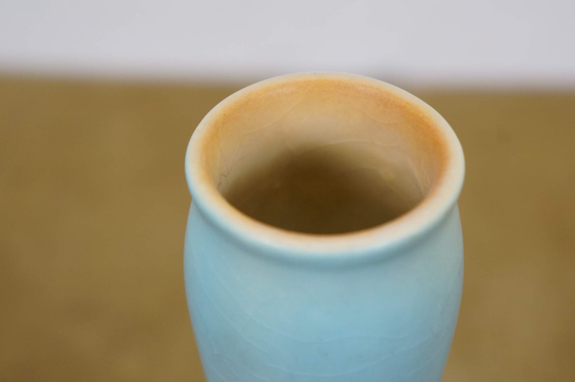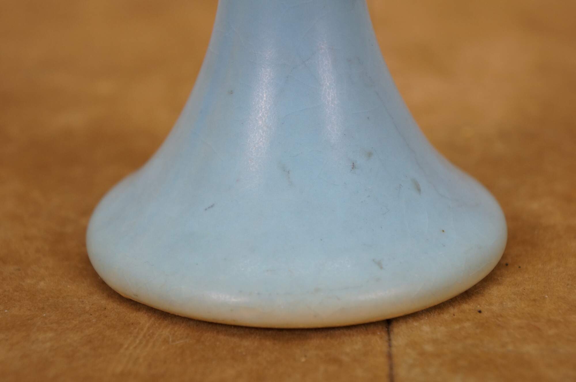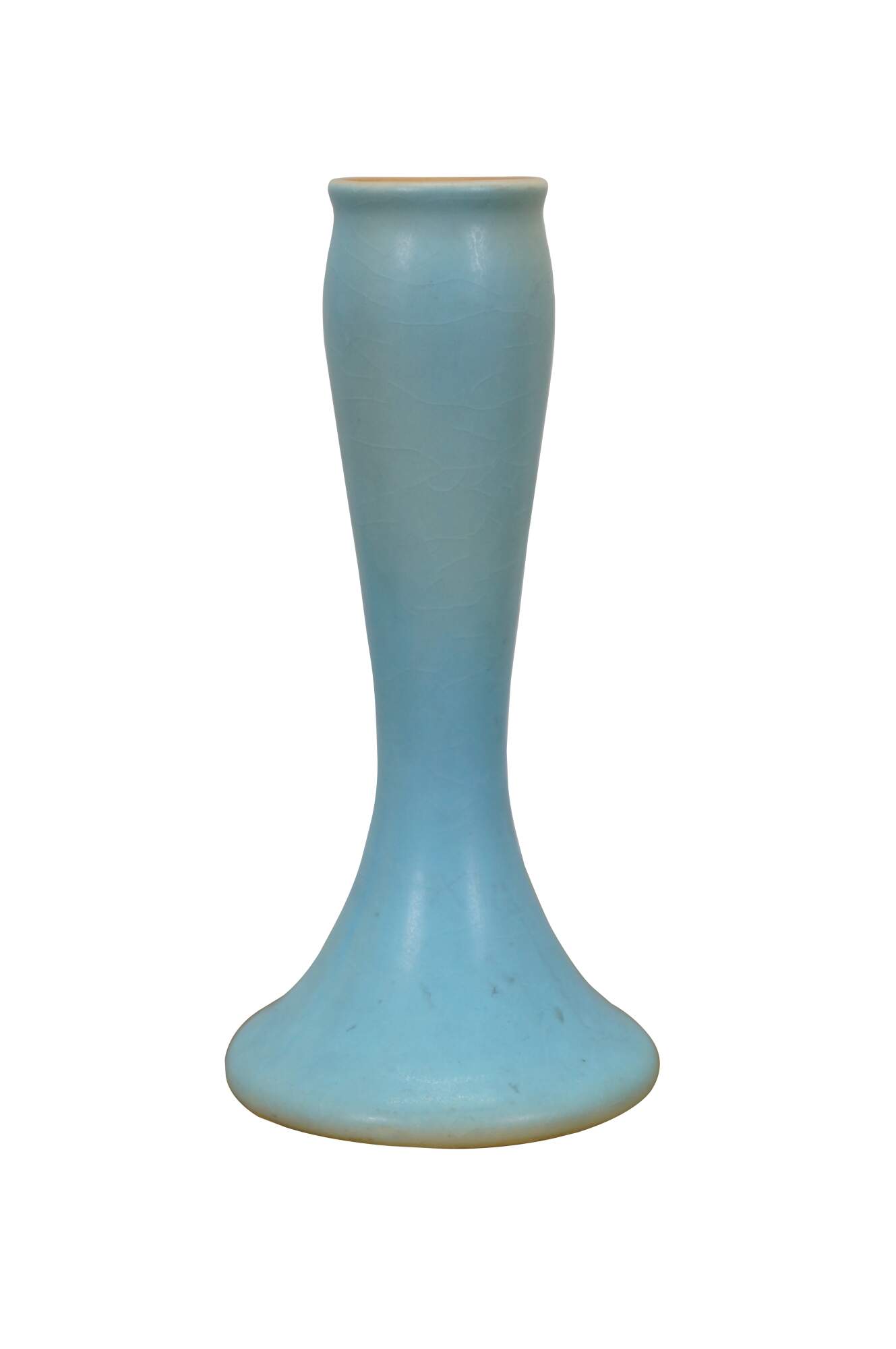 Circa 1940's Roseville art pottery Florane II 79-7 ceramic bud vase in light blue with golden brown interior.