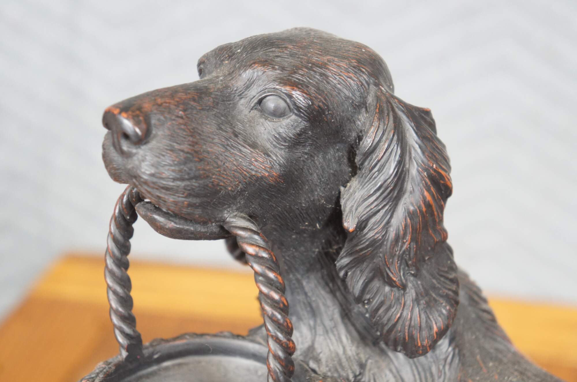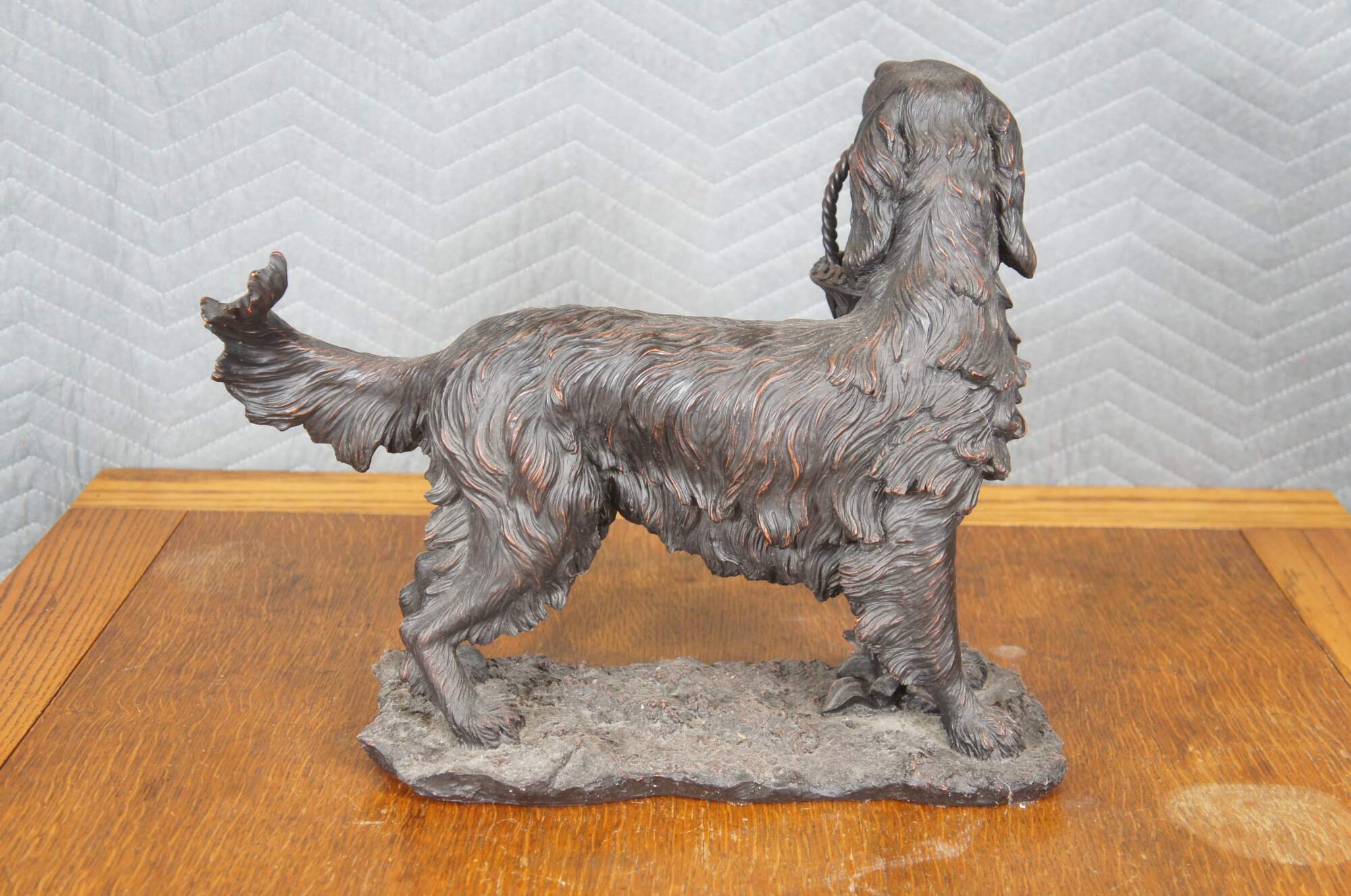 Vintage late 20th century faux bronze figurine / sculpture in the shape of an Irish / English Setter holding a decorative basket in its mouth. By Expo Inc. Composite / resin figurine with a reddish brown finish.