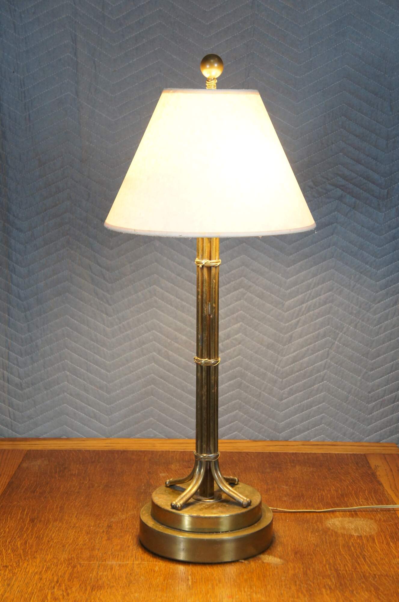 Circa mid 20th century Hart brass two light table lamp in the shape of bamboo or a bundle of rods with a splayed base, perched on around plinth. Includes paper shade and ball shaped finial.