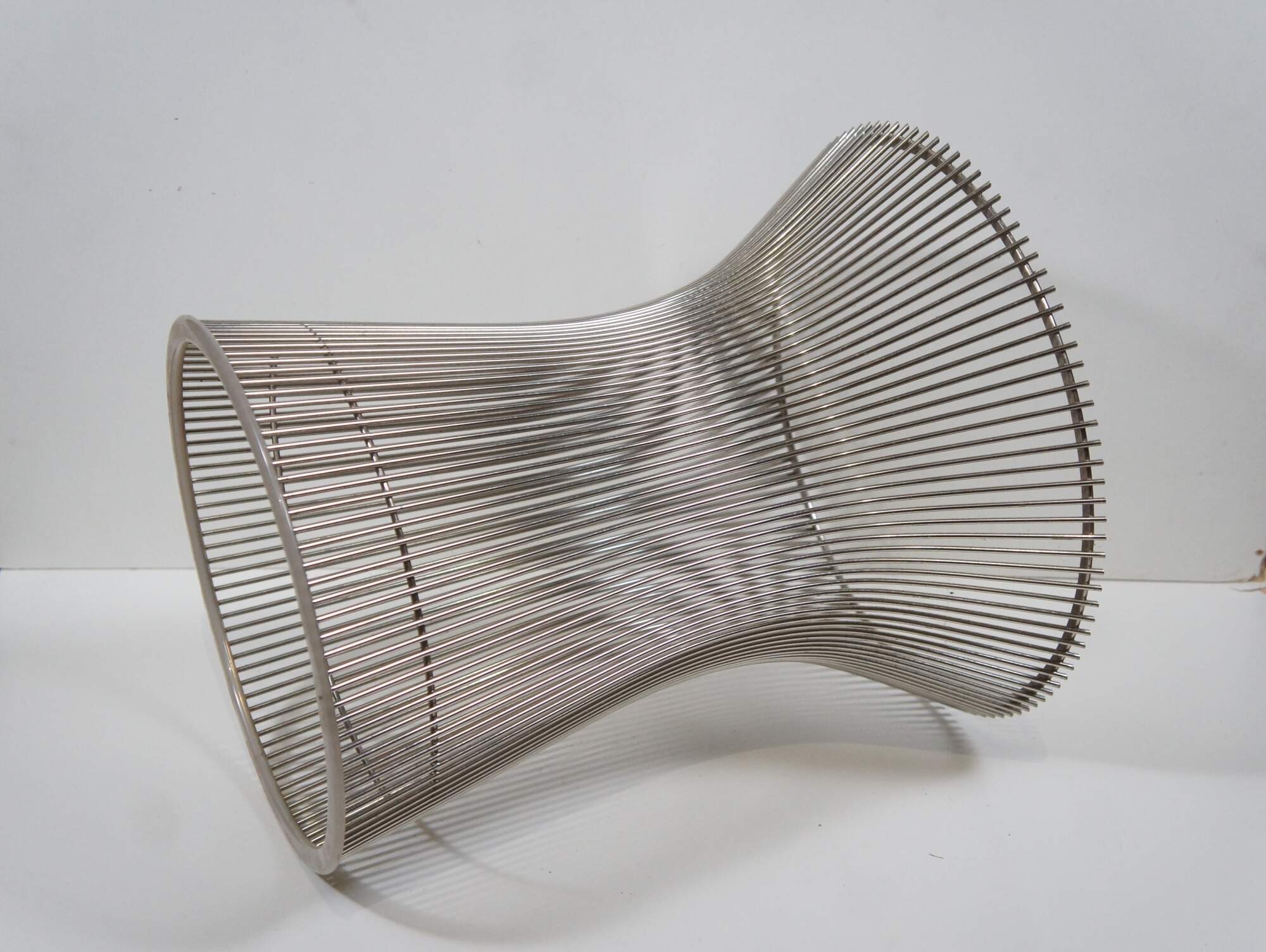 Pair of Knoll wire side / end table bases designed by Warren Platner. Airy steel wire rod construction in a drum-like shape with a plastic ring to protect floors. Mid centruy modern styling. Polished nickel finish. 3710T