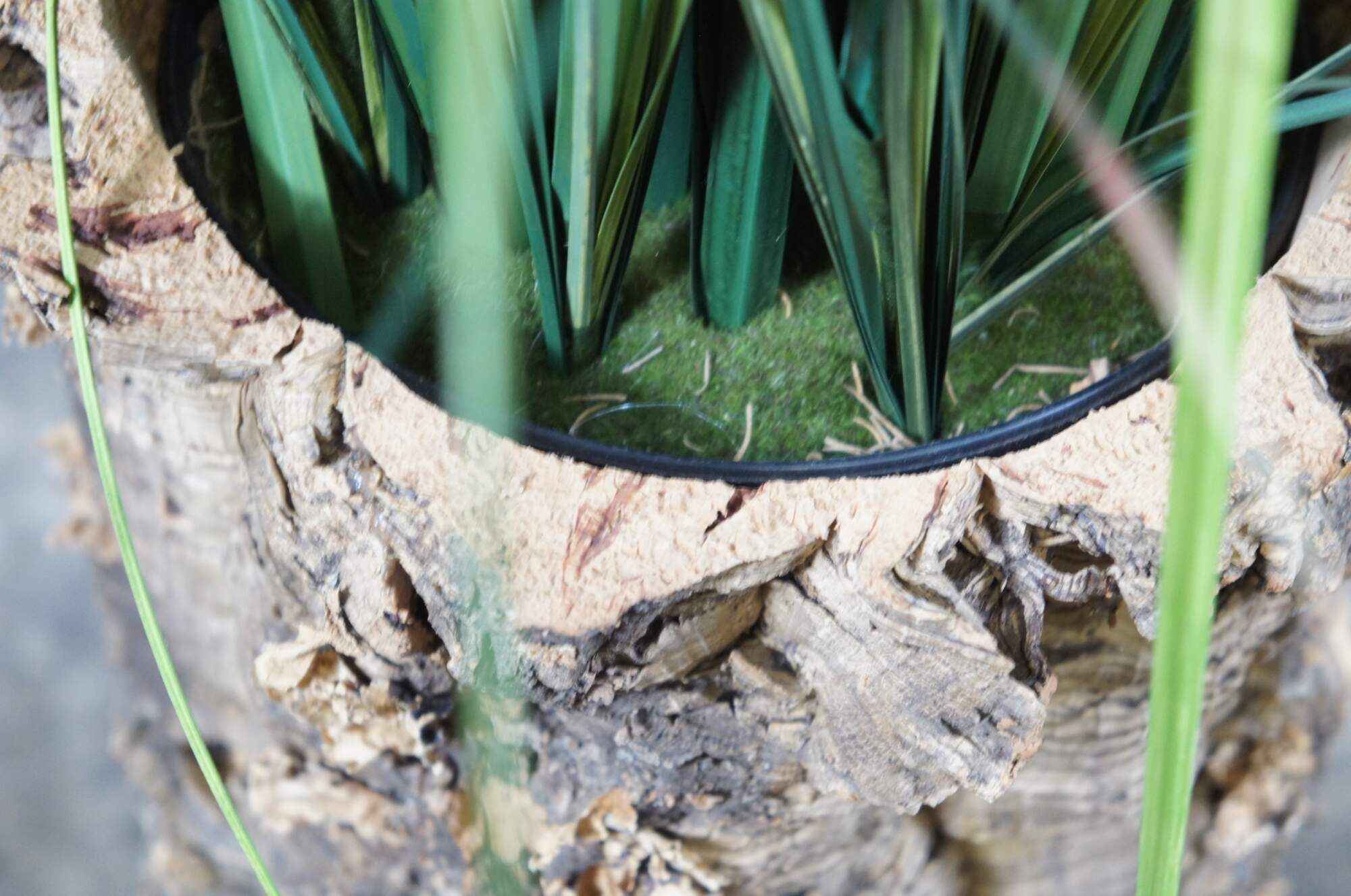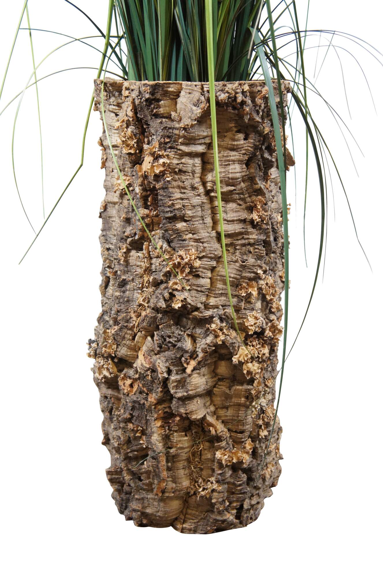 Viintage 20th century natural cork wood cylindrical floor vase / umbrella stand. Crafted from a hollowed cork oak trunk / limb with bark. Made in Portugal. Includes snugly fitted faux grass and bamboo plant.