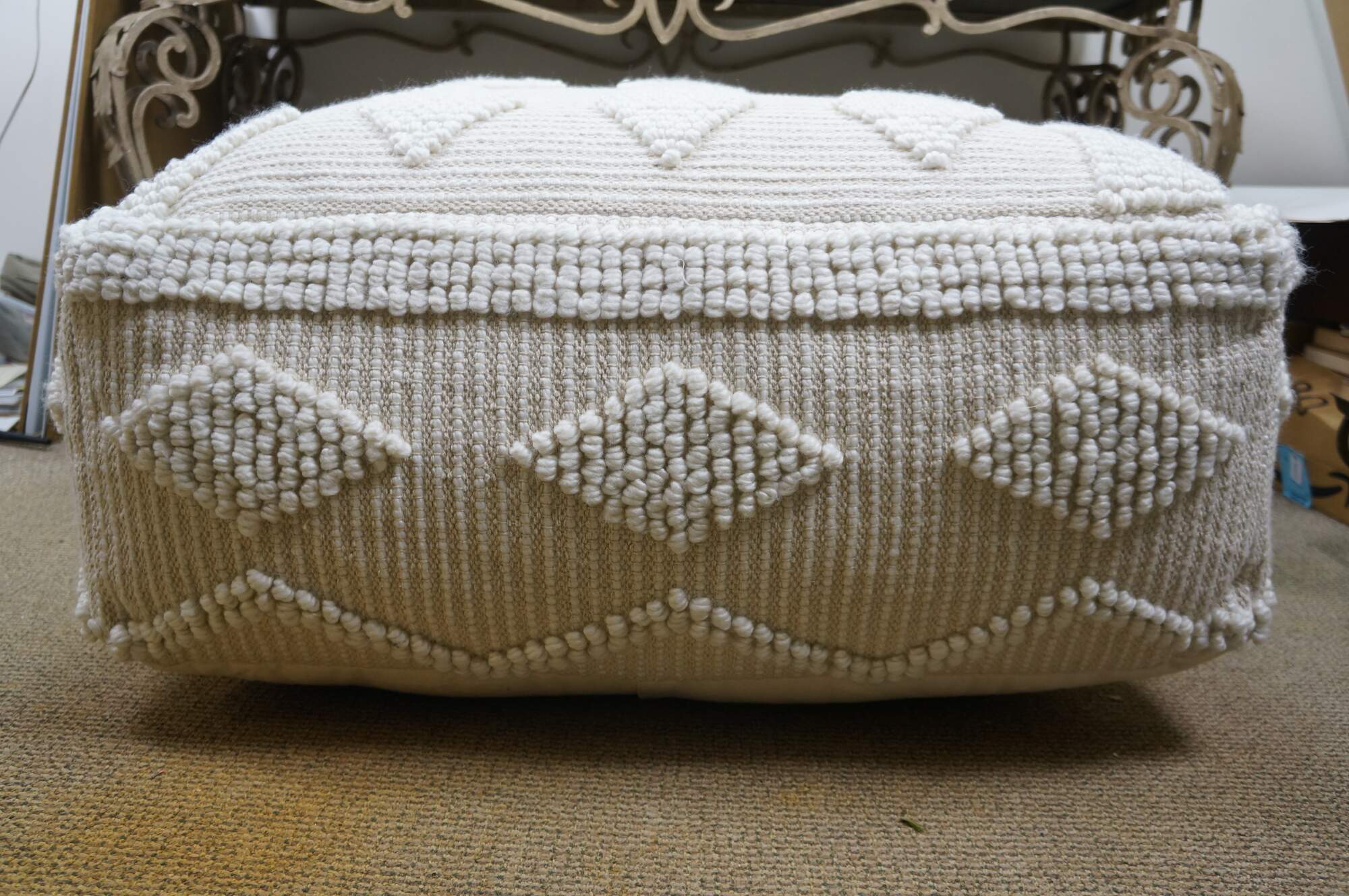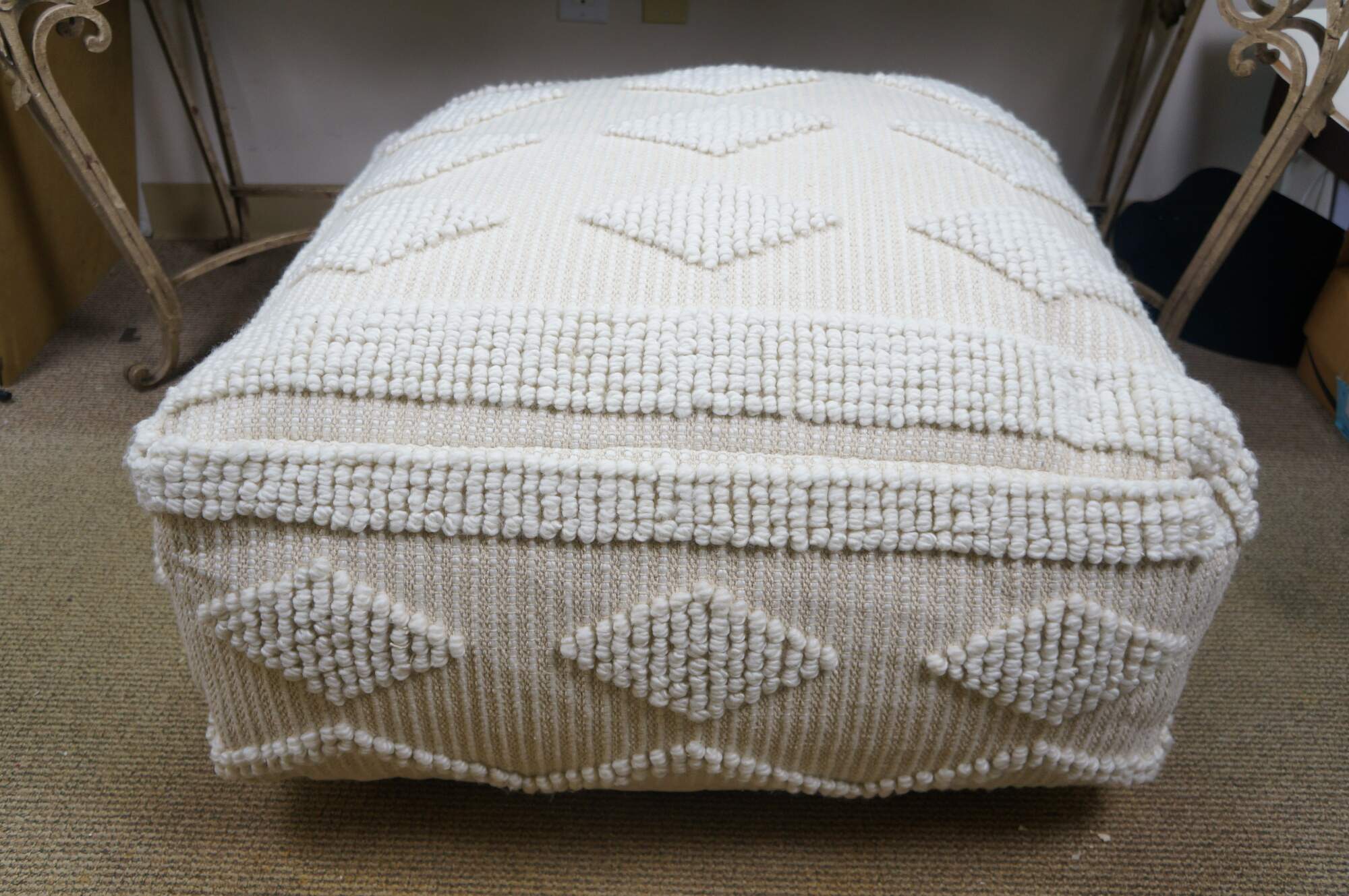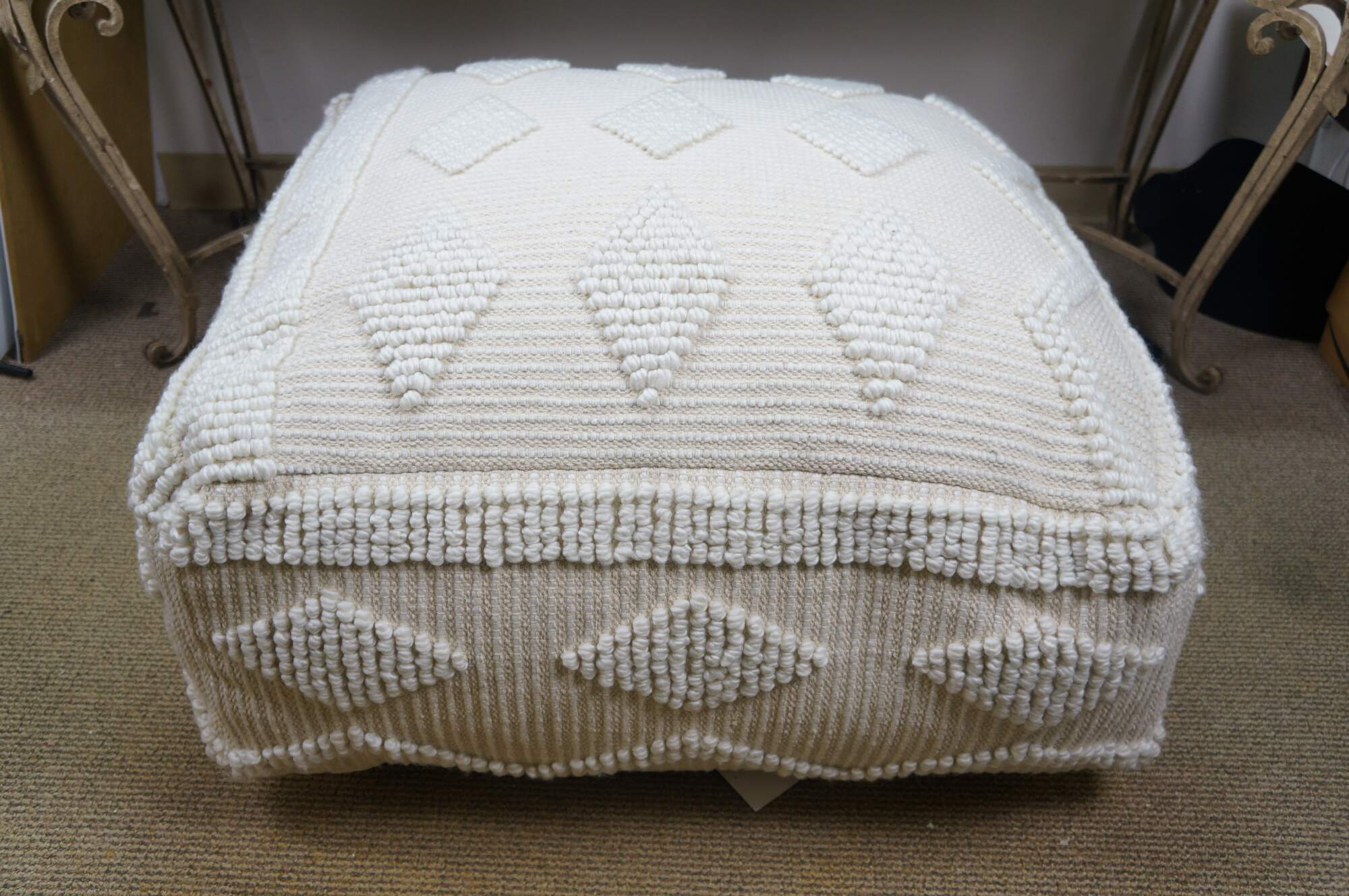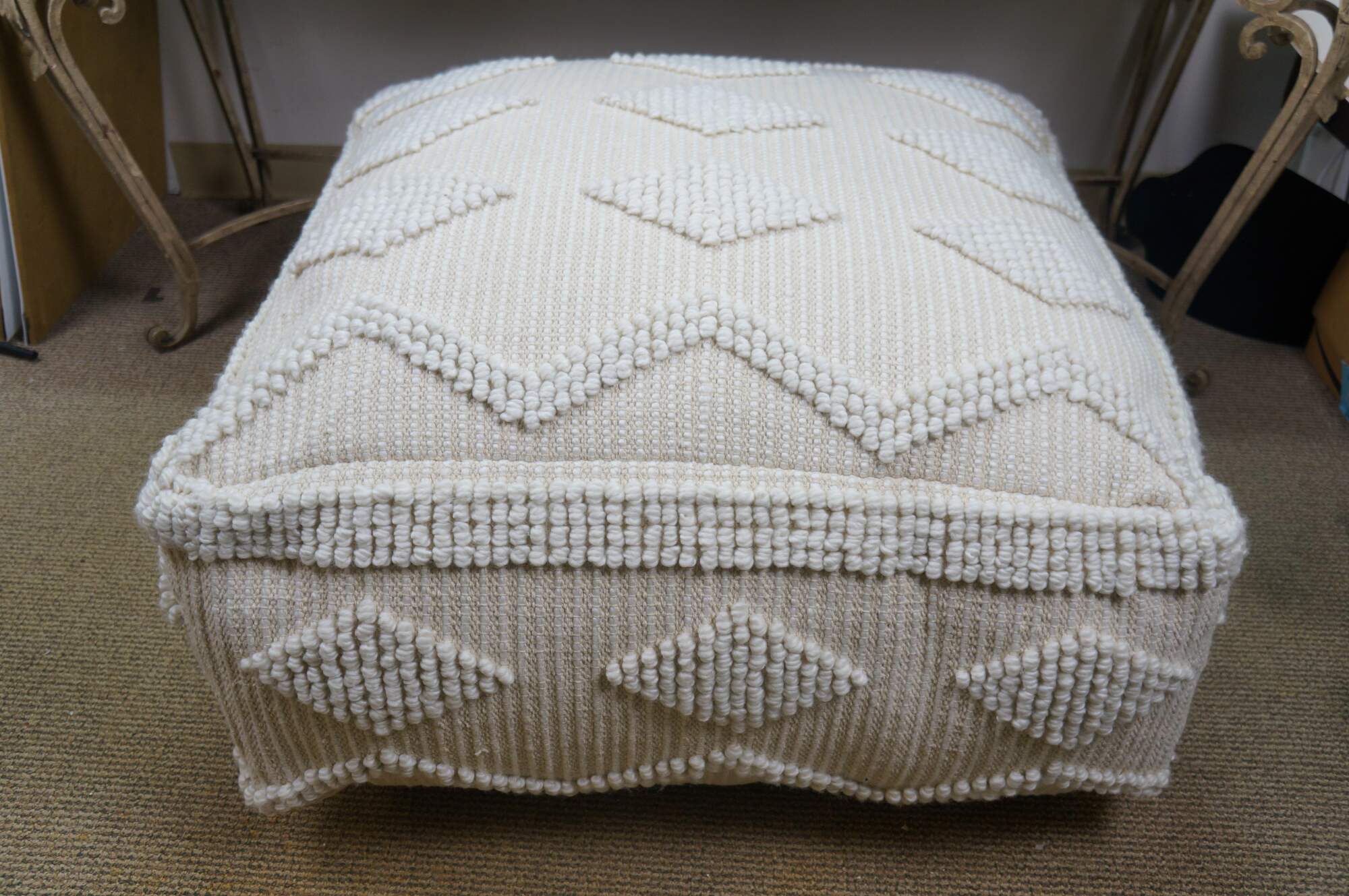 Early 21st century Anji Mountain woven pouf. Cube-shaped bean bag / ottoman featuring off-white fabric woven with dimensional stripes, chevrons, and diamonds in white. Outer cover: 58% cotton / 42% polyester. Filling: 100% polystyrene beads. Made in India.