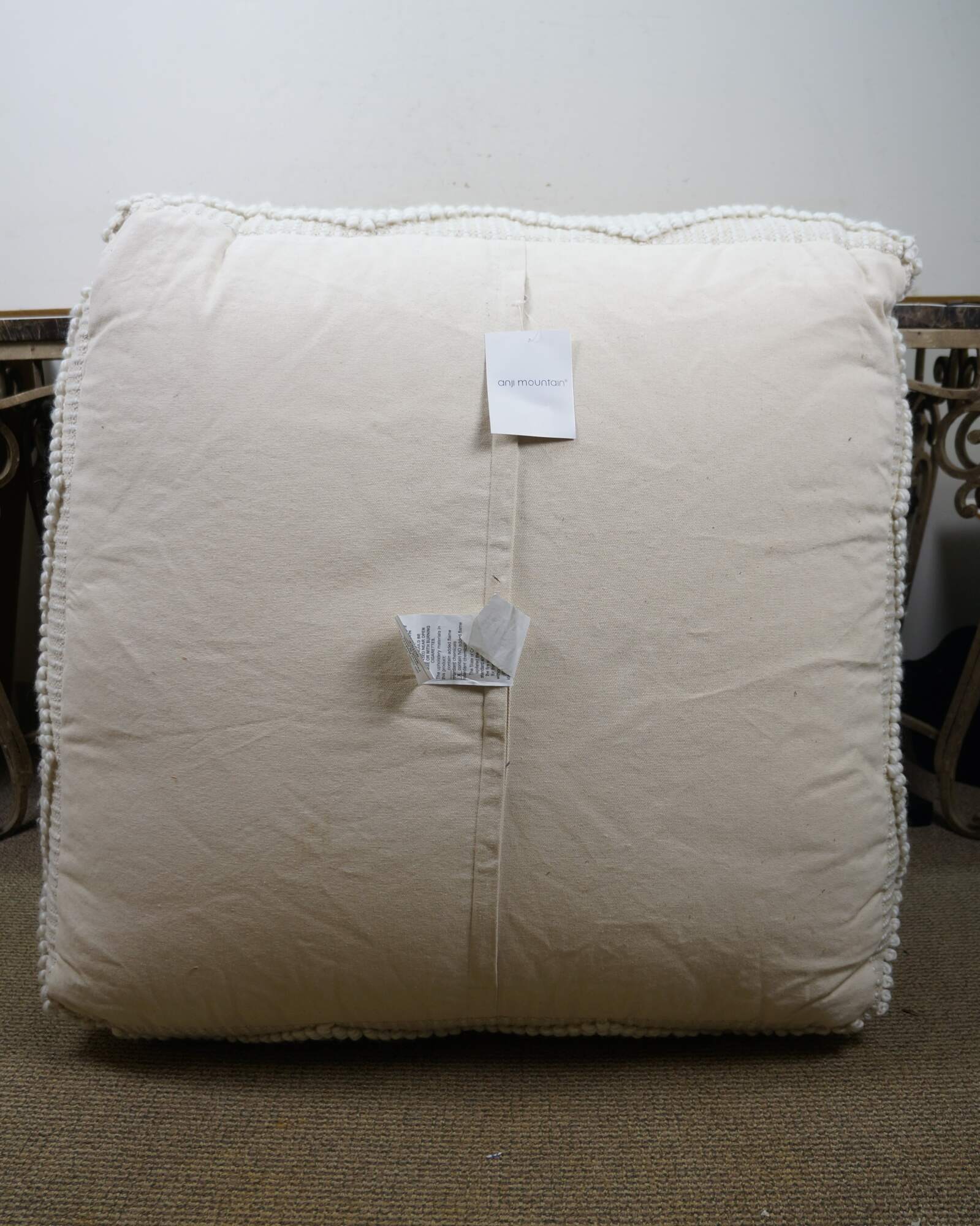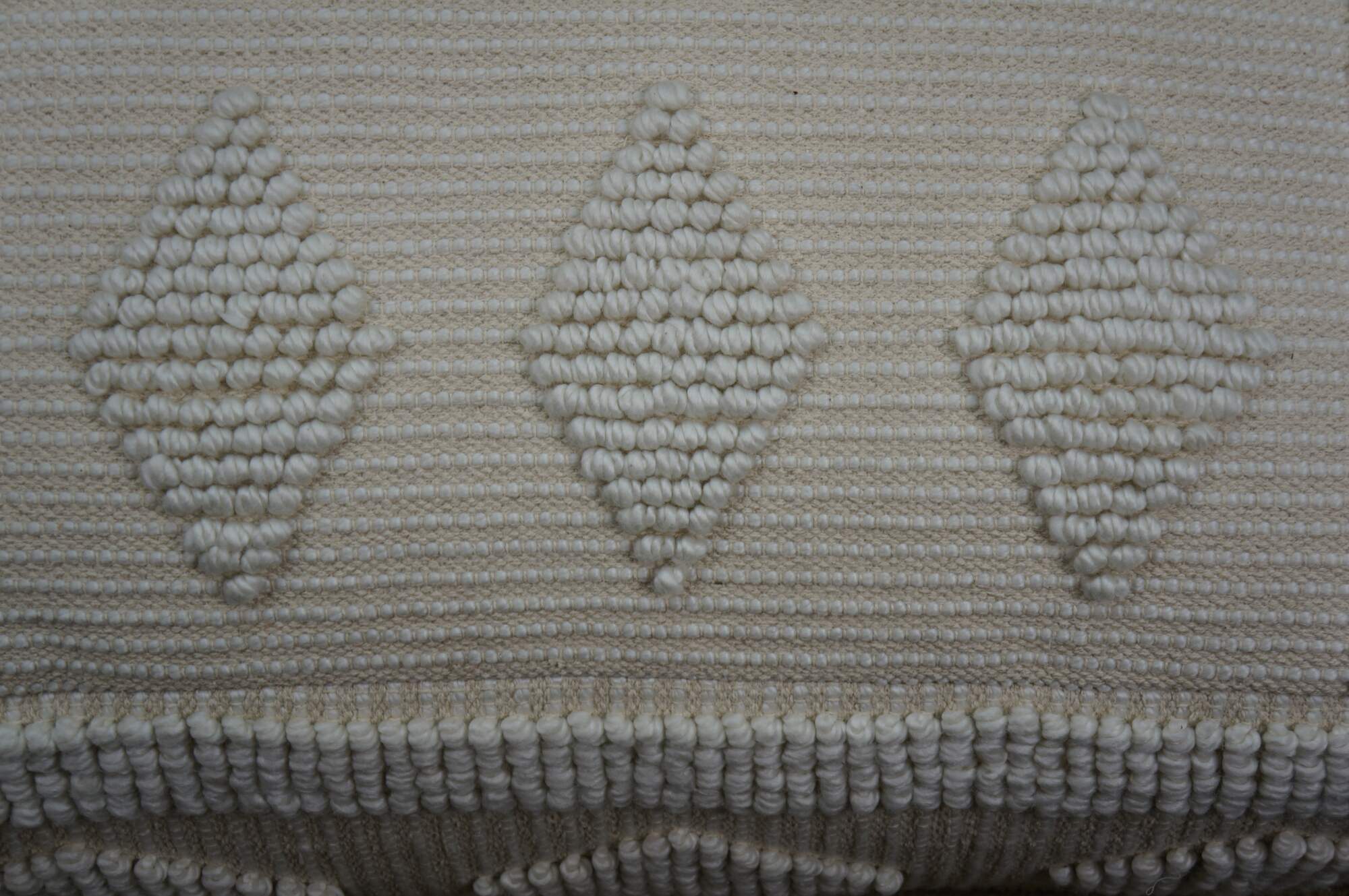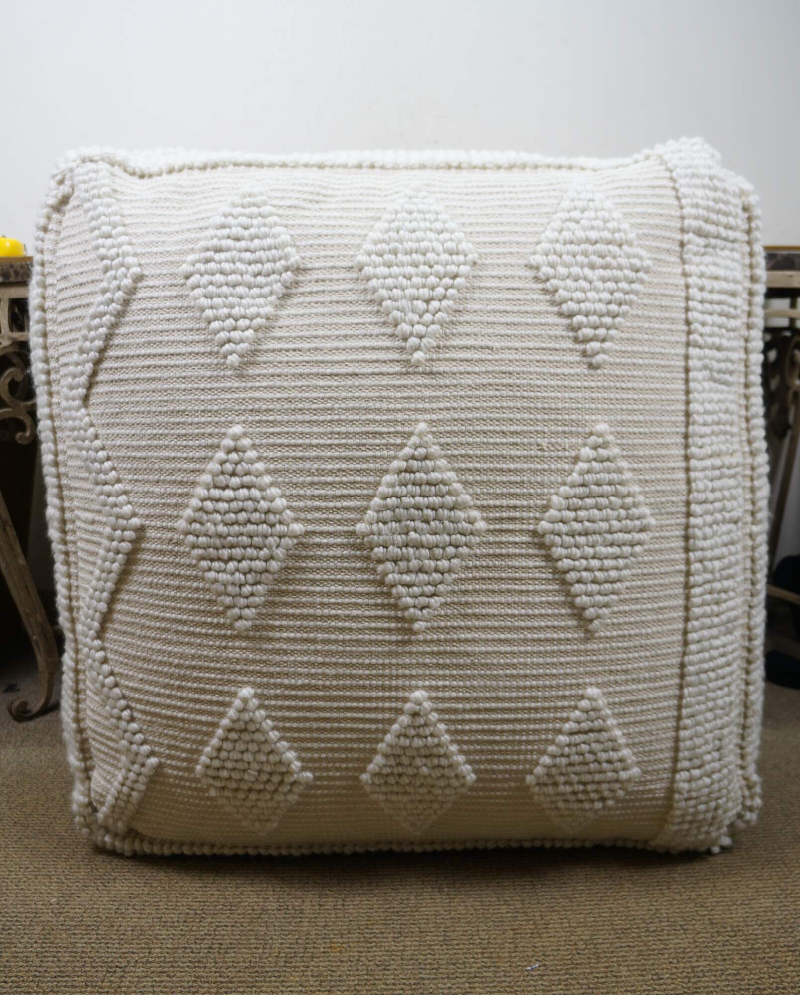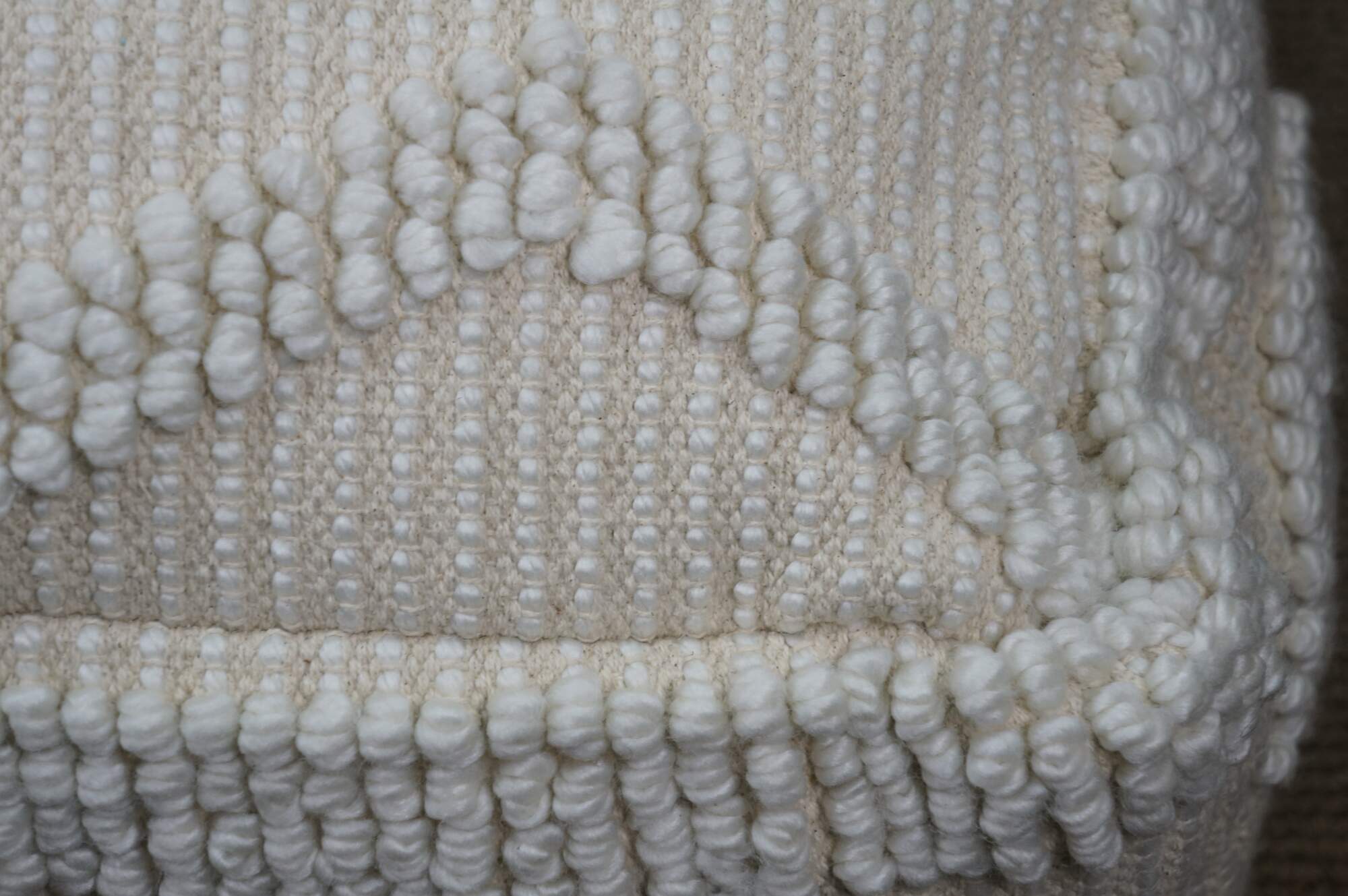 Early 21st century Anji Mountain woven pouf. Cube-shaped bean bag / ottoman featuring off-white fabric woven with dimensional stripes, chevrons, and diamonds in white. Outer cover: 58% cotton / 42% polyester. Filling: 100% polystyrene beads. Made in India.