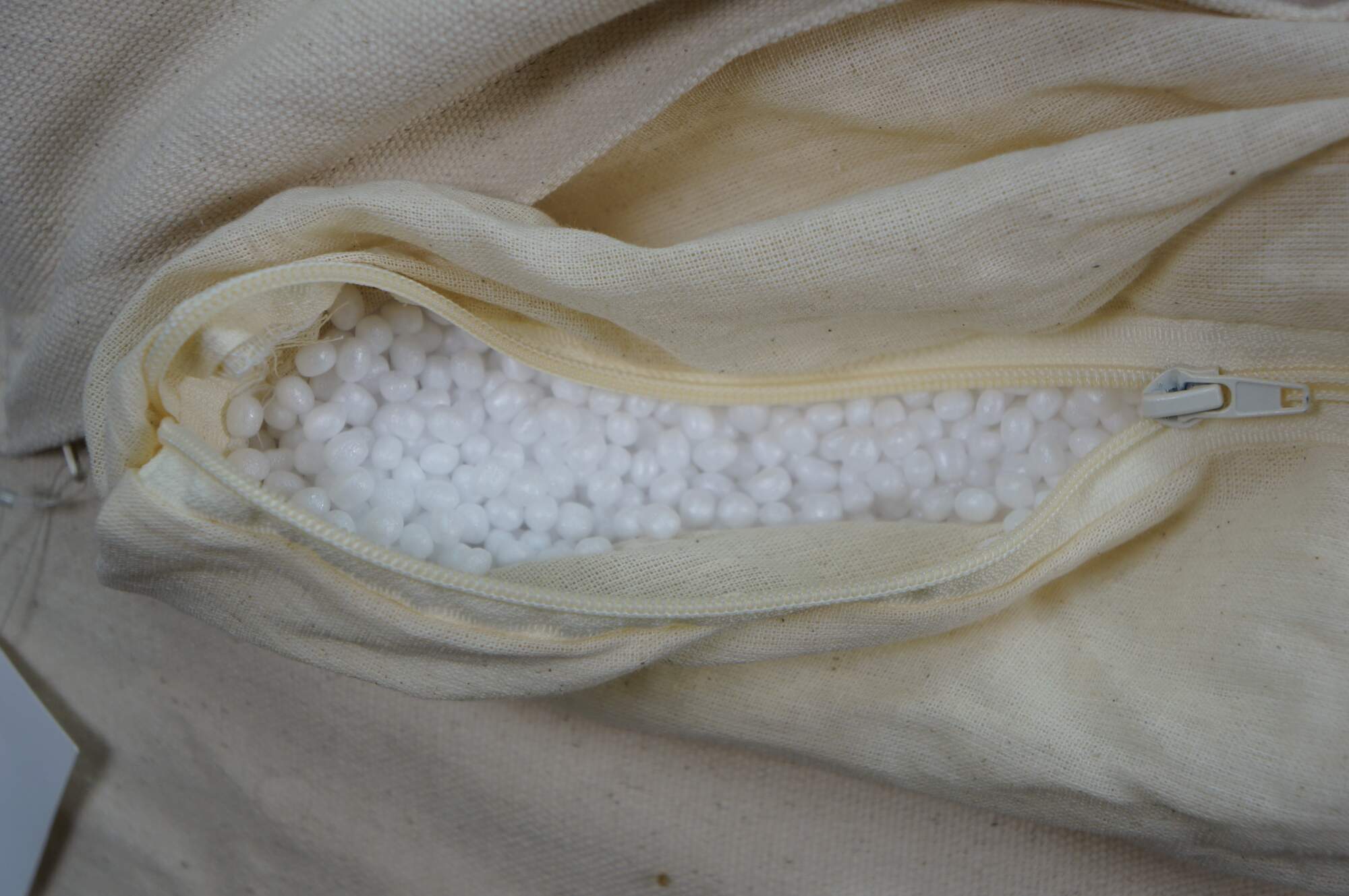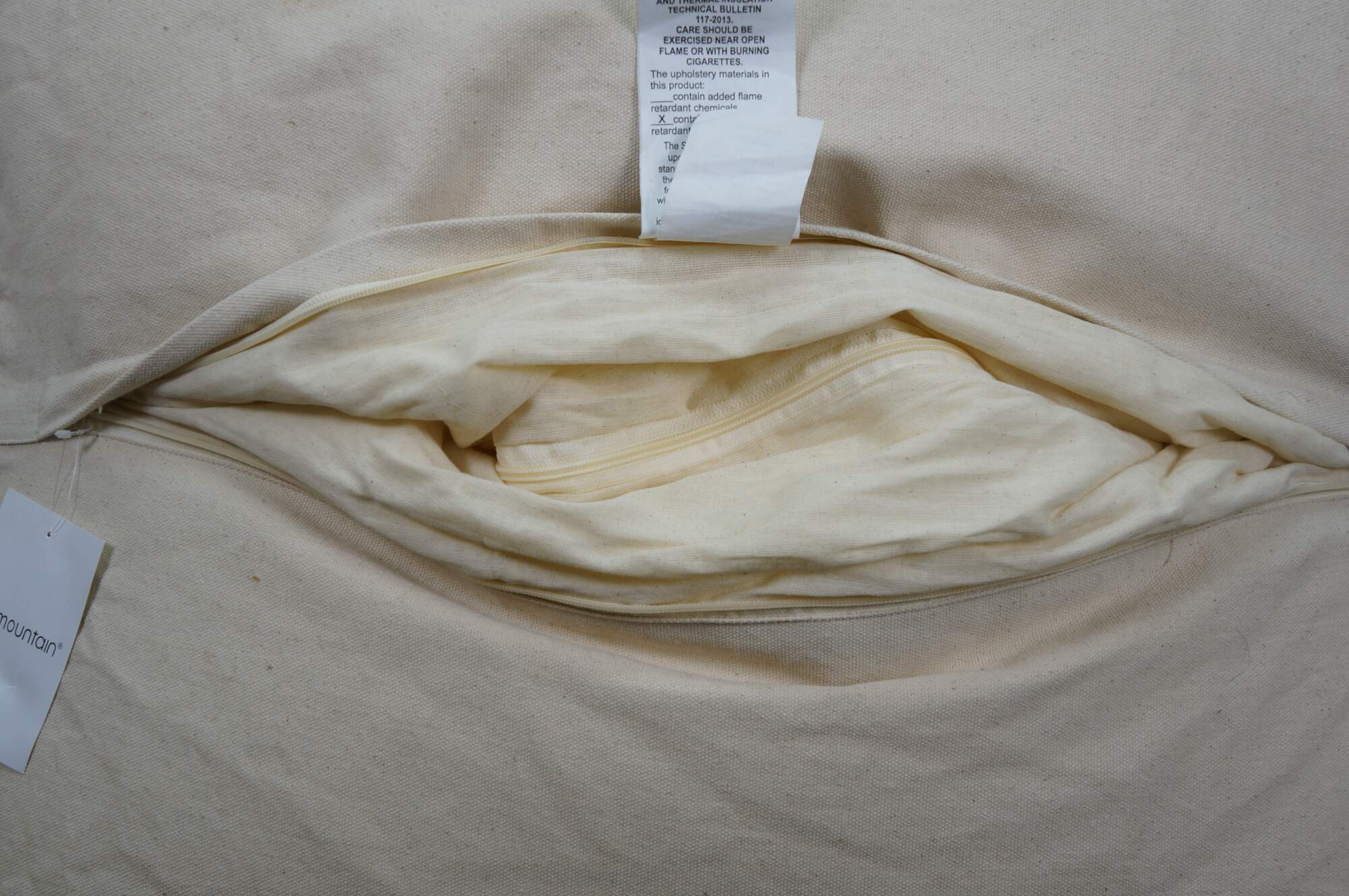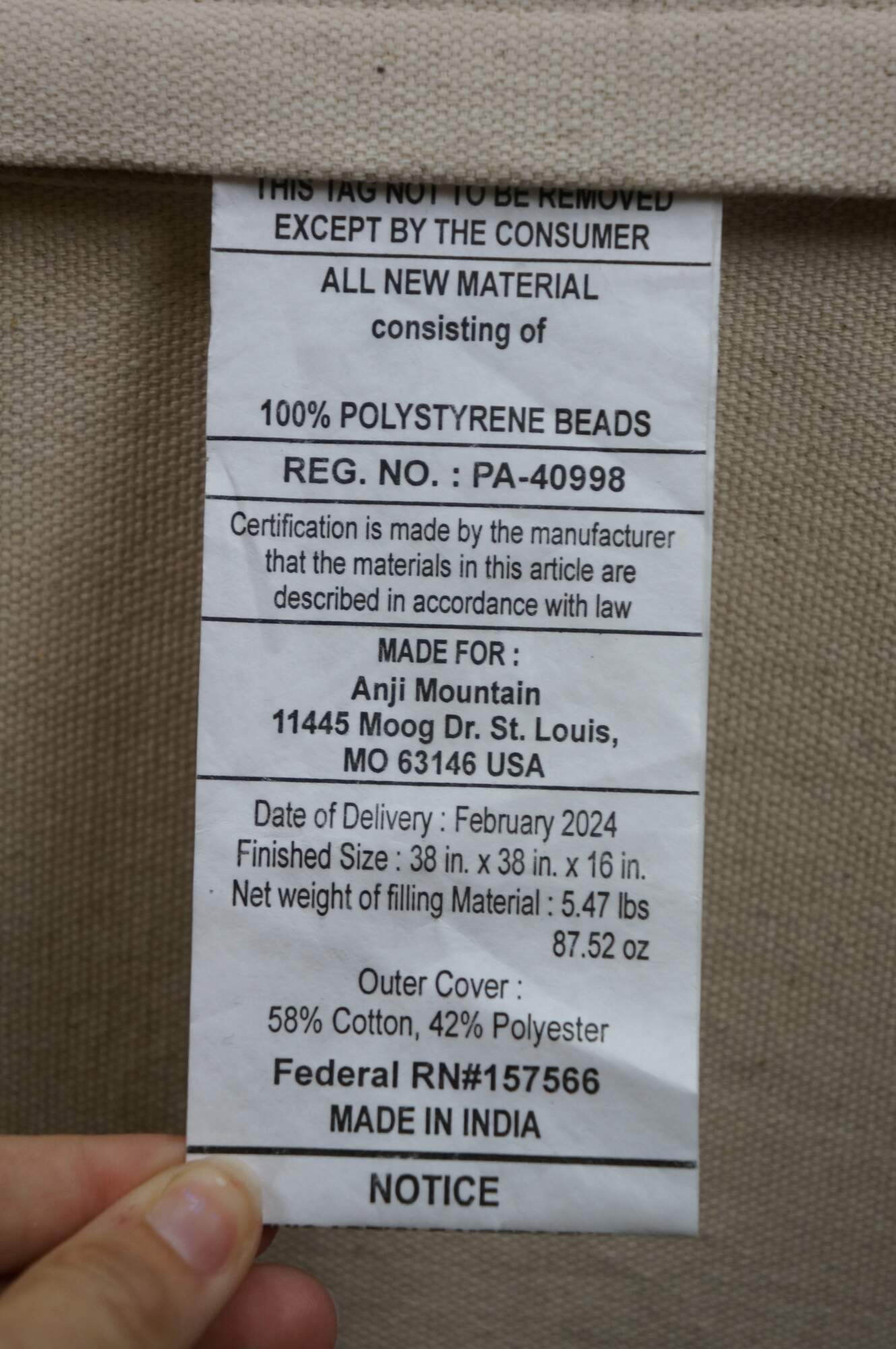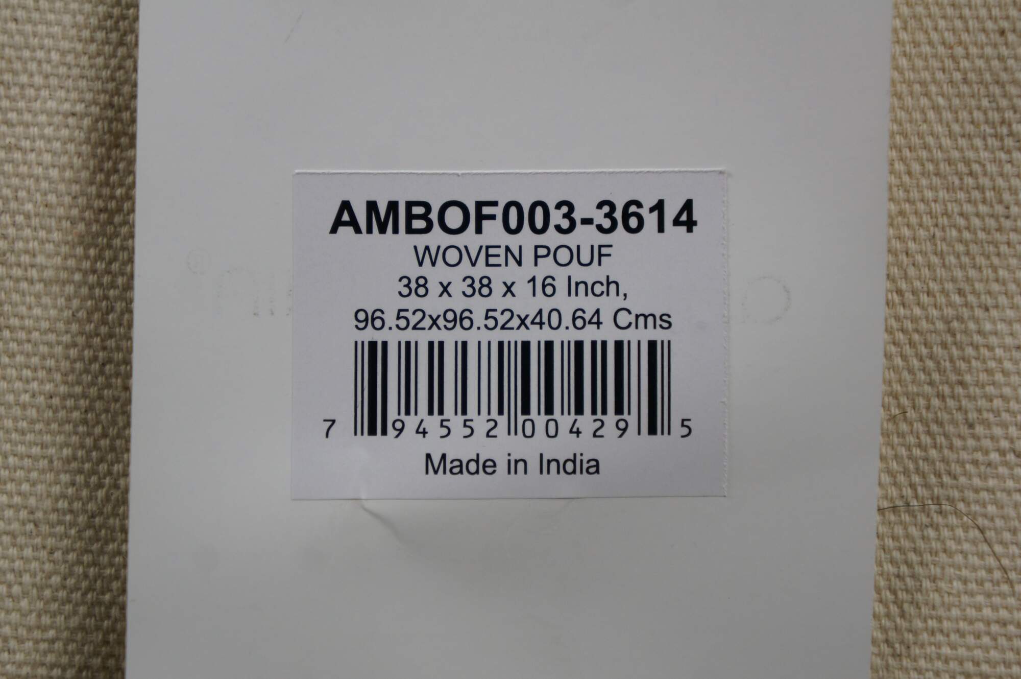 Early 21st century Anji Mountain woven pouf. Cube-shaped bean bag / ottoman featuring off-white fabric woven with dimensional stripes, chevrons, and diamonds in white. Outer cover: 58% cotton / 42% polyester. Filling: 100% polystyrene beads. Made in India.