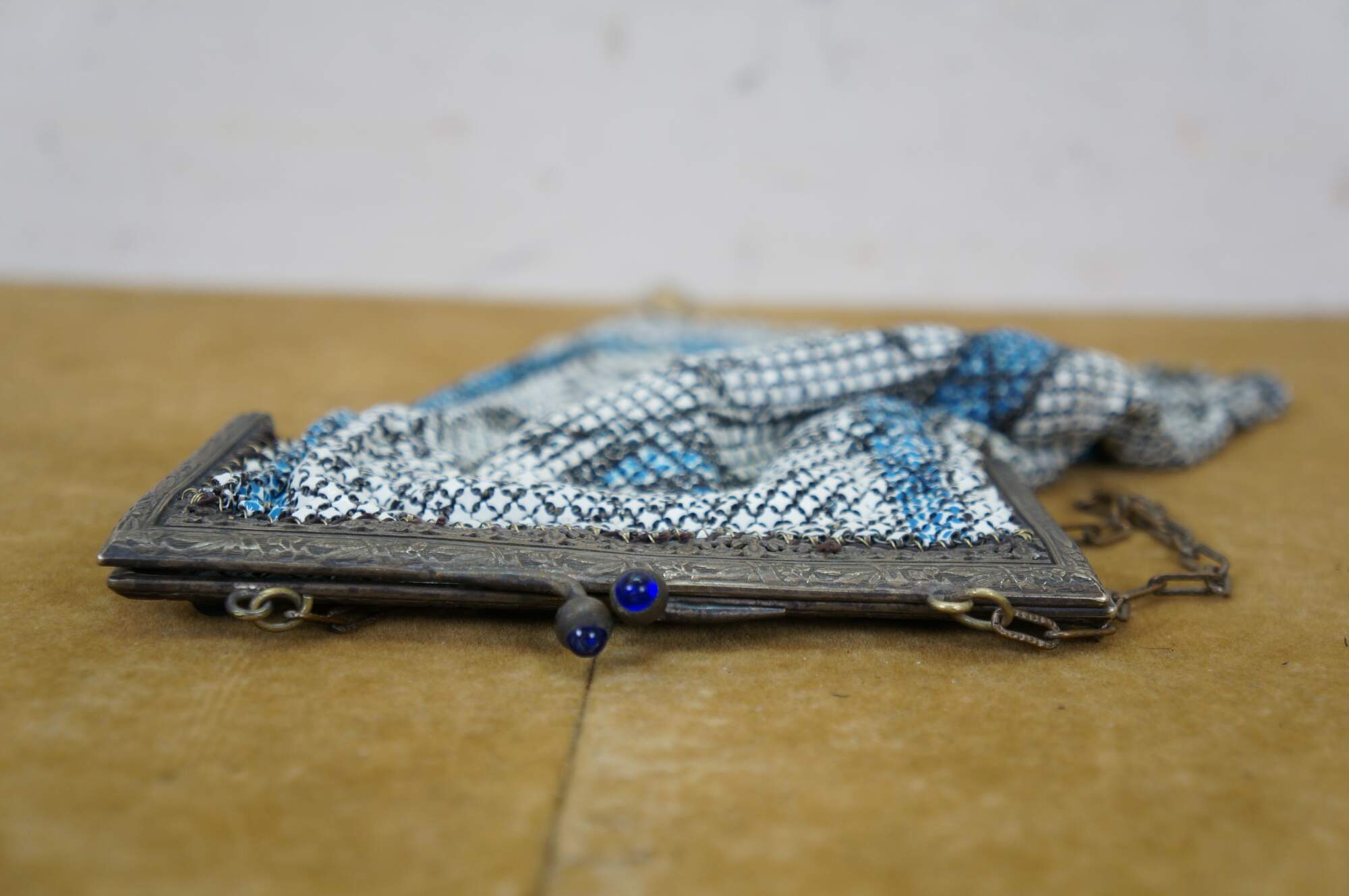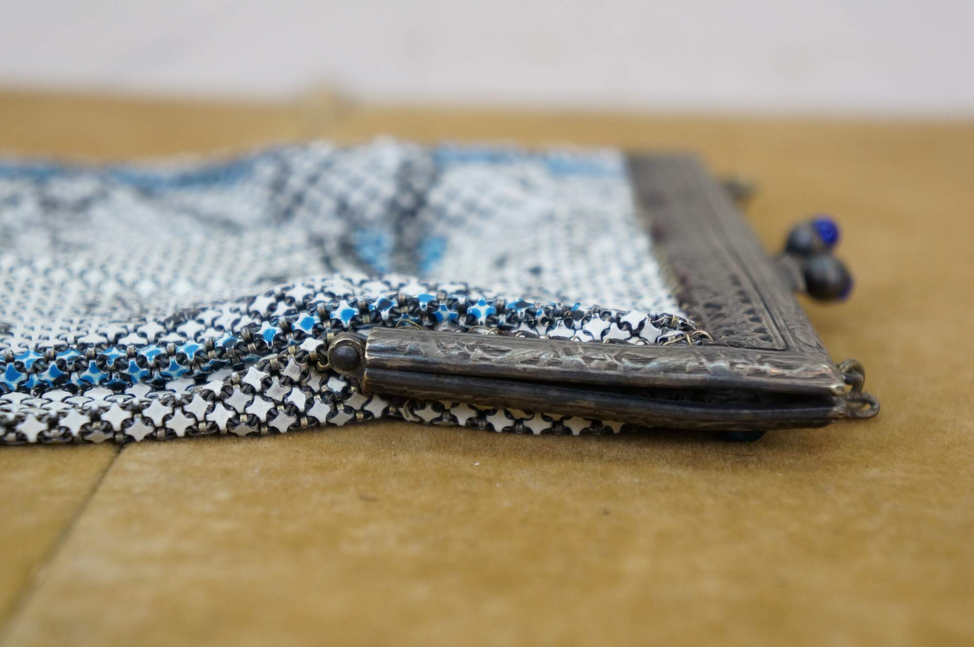 Antique circa 1920's Art Nouveau Whiting and Davis "Elsah" metal mesh evening bag / purse. Rectangular shape with scalloped fringe, painted in white with a design of birds and branches in blue and black. Art nouveau style clamshell clasp decorated with flowers and tassels, studded with lapis lazuli blue stones. Chain features textured links. Gray cloth interior.