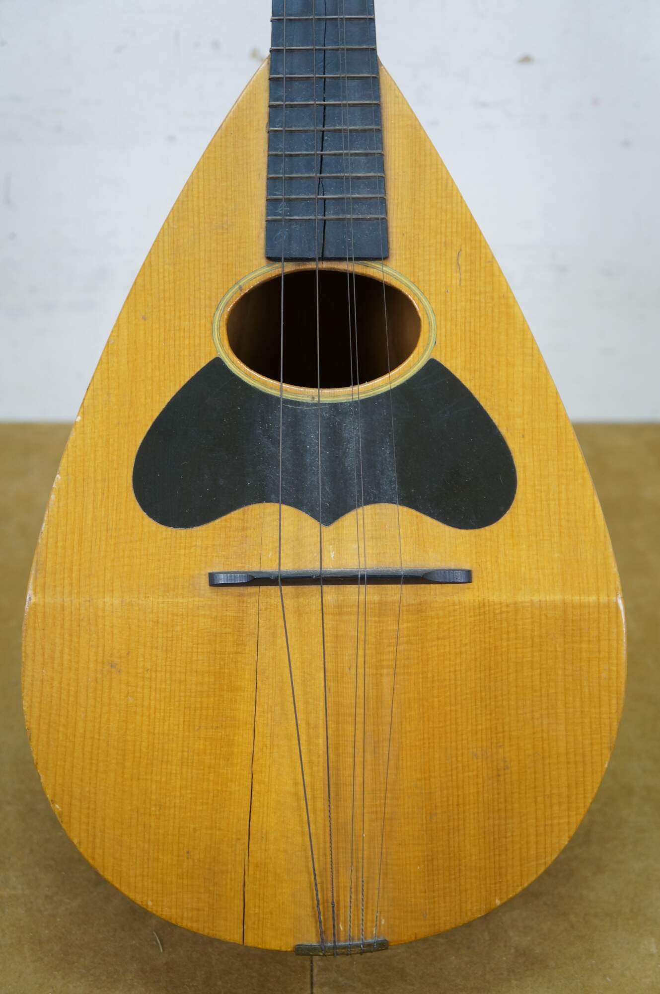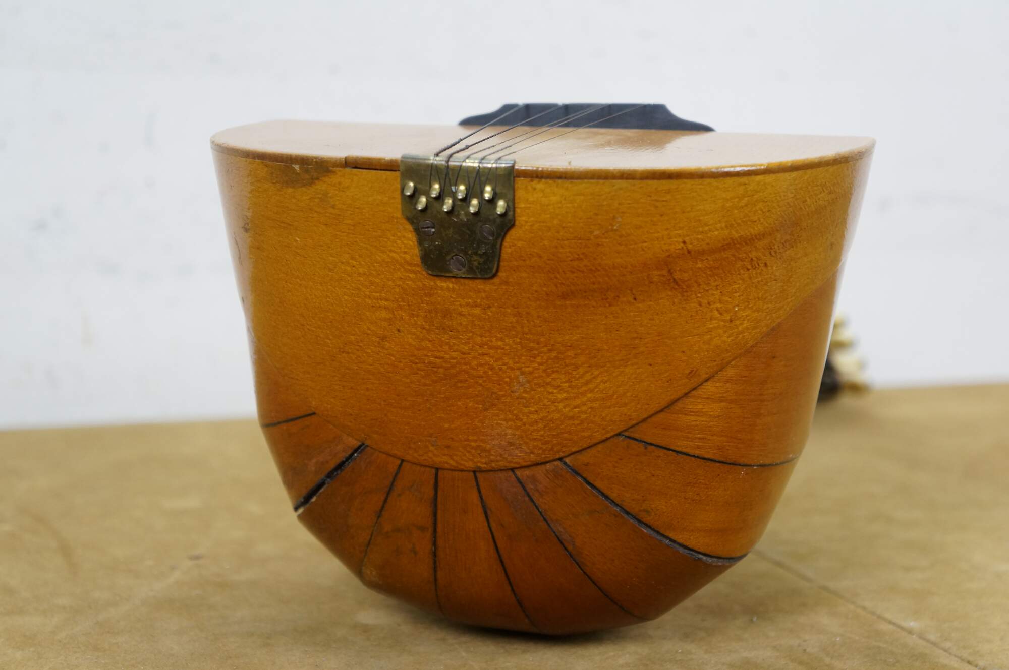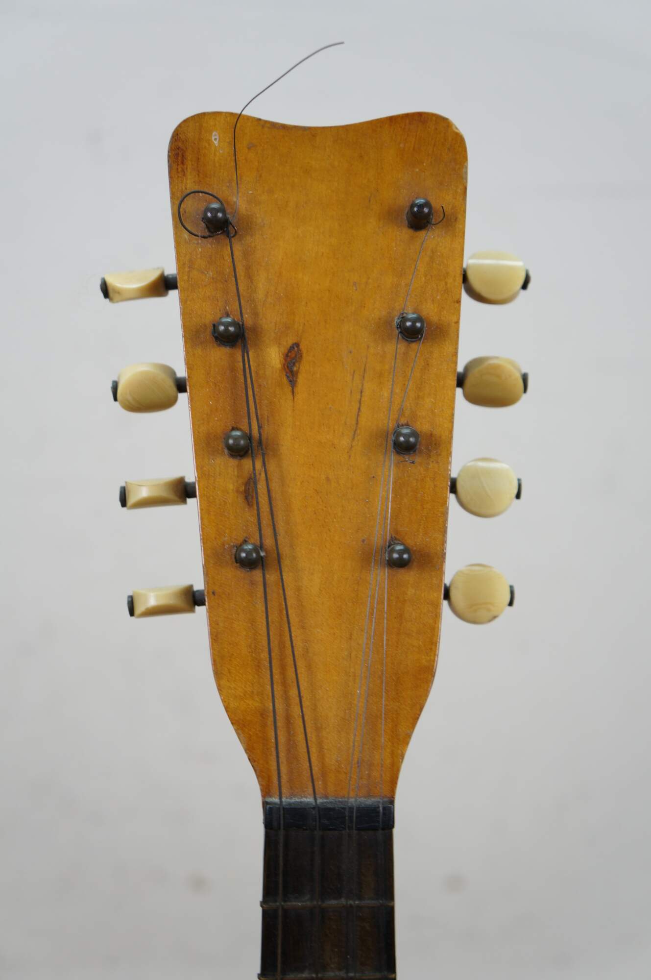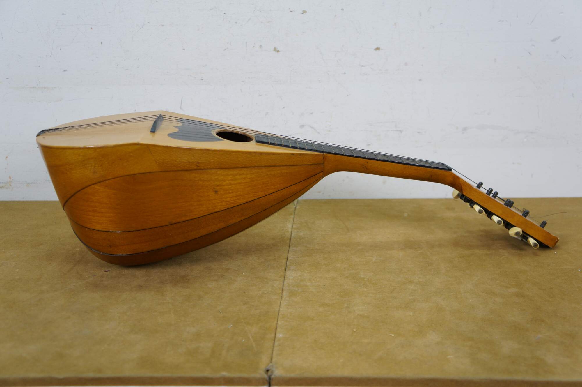 Late 19th to early 20th century Lakeside eight string, bowl back mandolin guitar by Lyon & Healy. Made of maple with angled cant and head, segmented bowl back. Ebonized oxbow shaped scratchplate / pickguard, fret / fingerboard, and bridge. Bone tuning pegs. Numbered 16561. Tail piece marked Pat Mch 10 91.