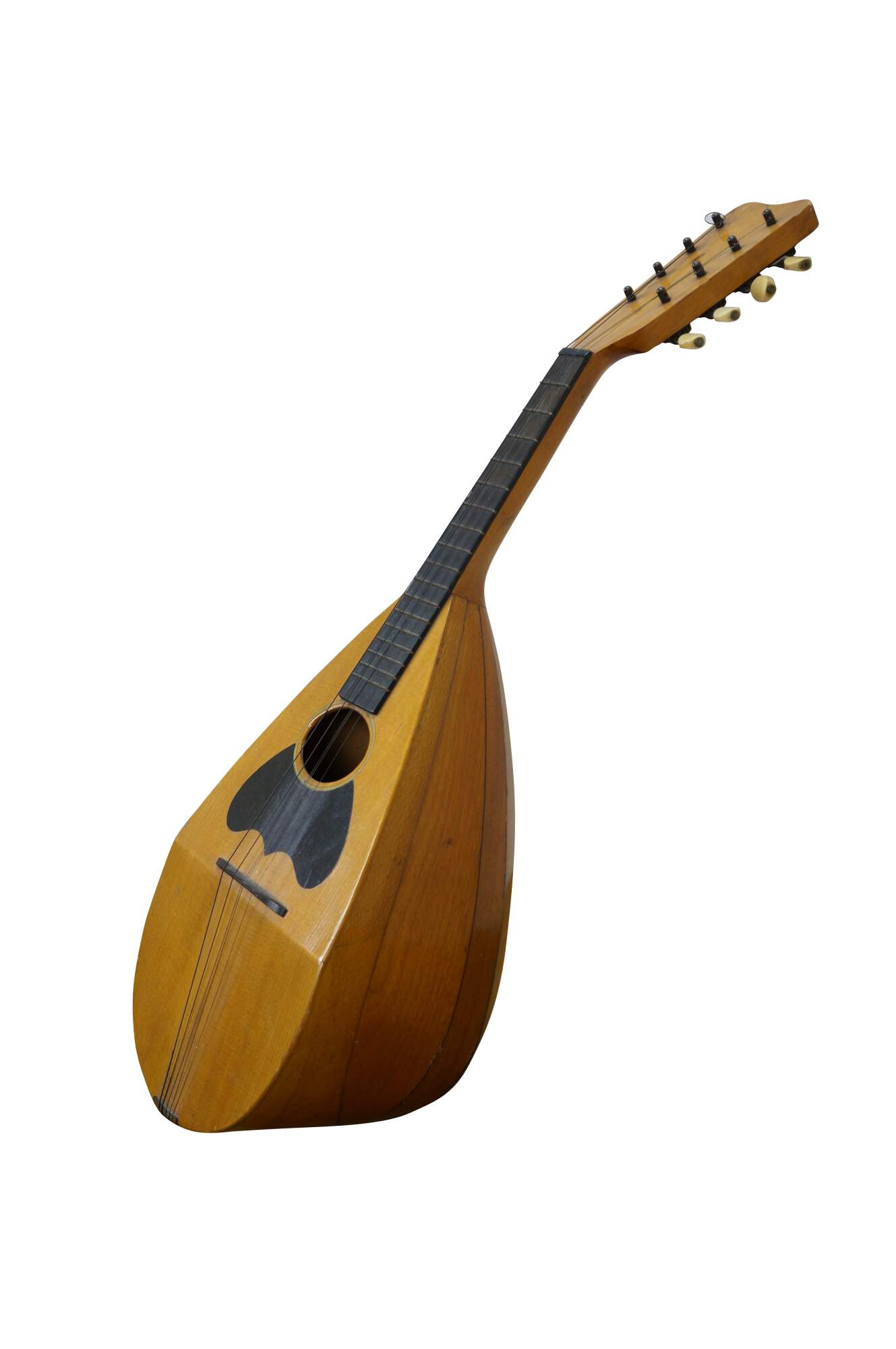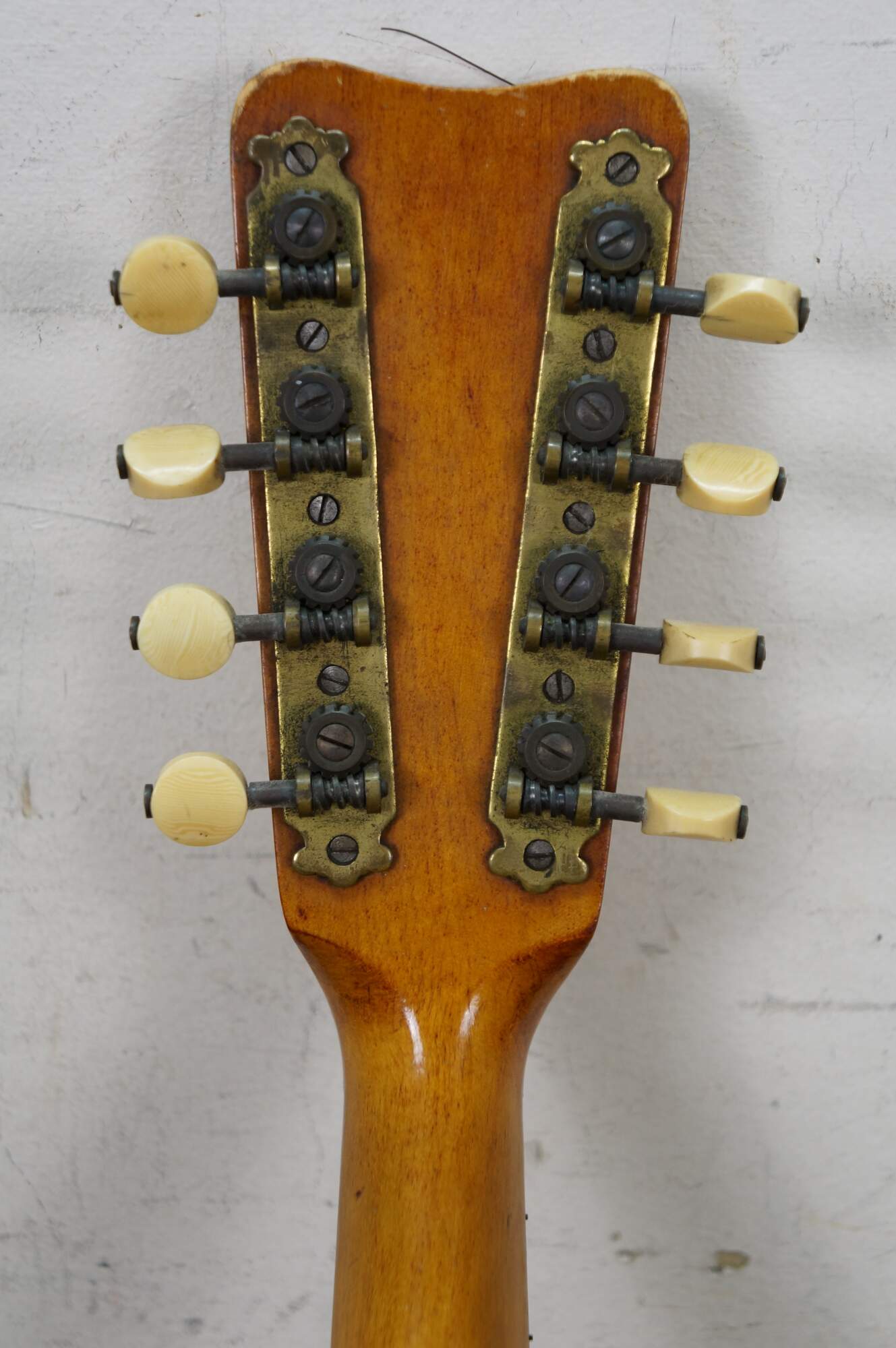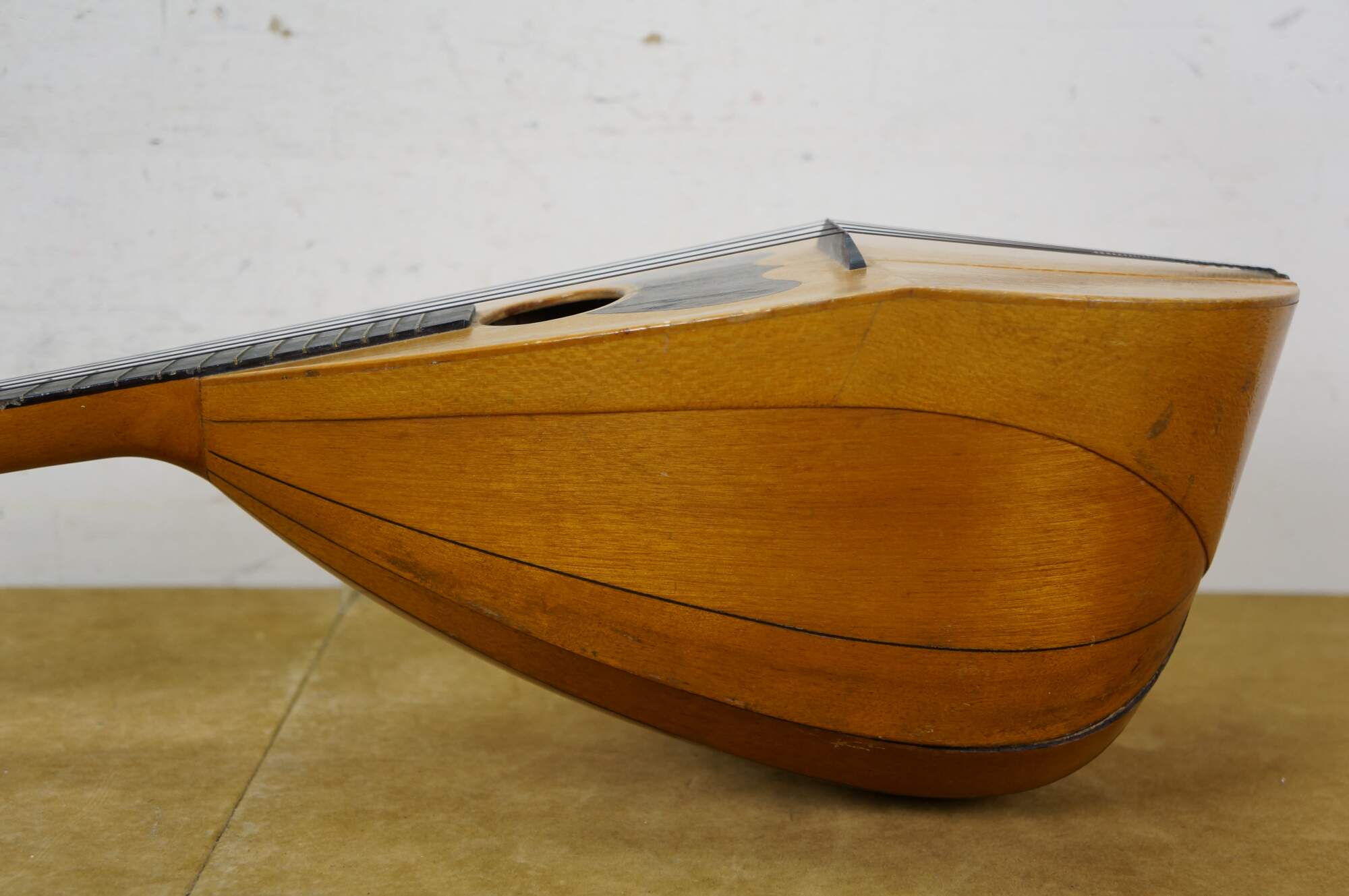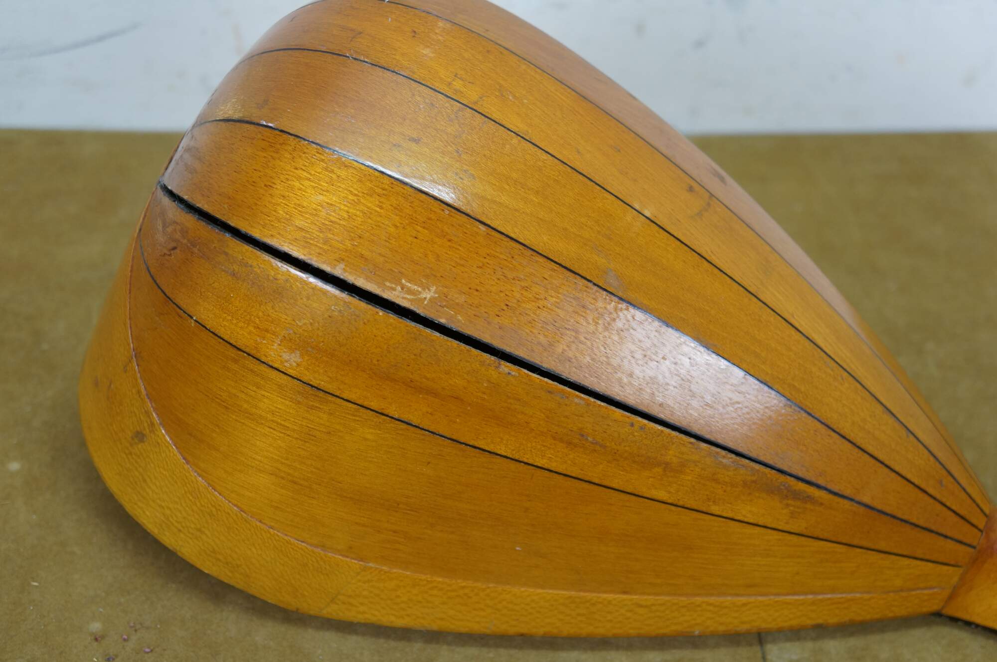 Late 19th to early 20th century Lakeside eight string, bowl back mandolin guitar by Lyon & Healy. Made of maple with angled cant and head, segmented bowl back. Ebonized oxbow shaped scratchplate / pickguard, fret / fingerboard, and bridge. Bone tuning pegs. Numbered 16561. Tail piece marked Pat Mch 10 91.