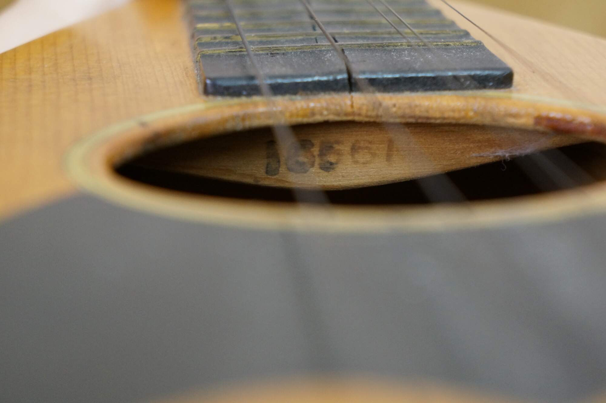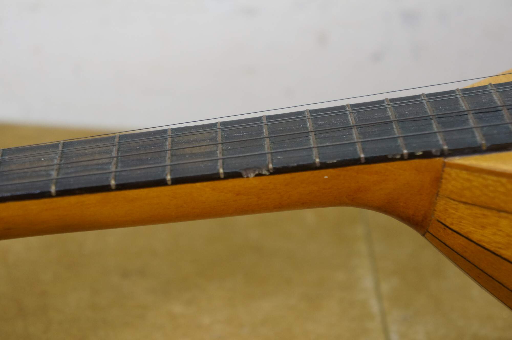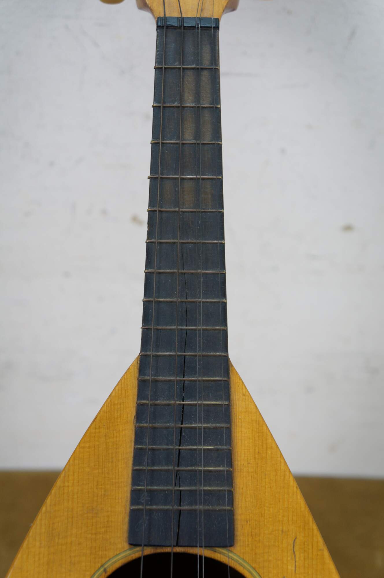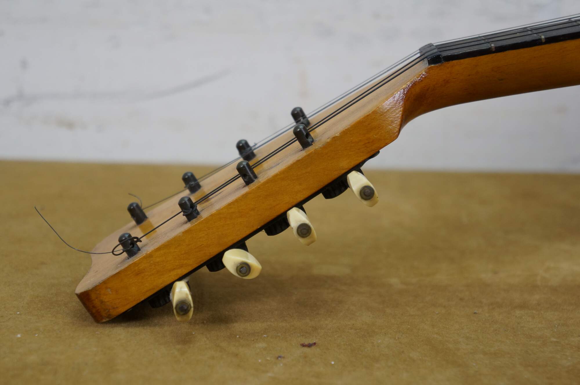 Late 19th to early 20th century Lakeside eight string, bowl back mandolin guitar by Lyon & Healy. Made of maple with angled cant and head, segmented bowl back. Ebonized oxbow shaped scratchplate / pickguard, fret / fingerboard, and bridge. Bone tuning pegs. Numbered 16561. Tail piece marked Pat Mch 10 91.