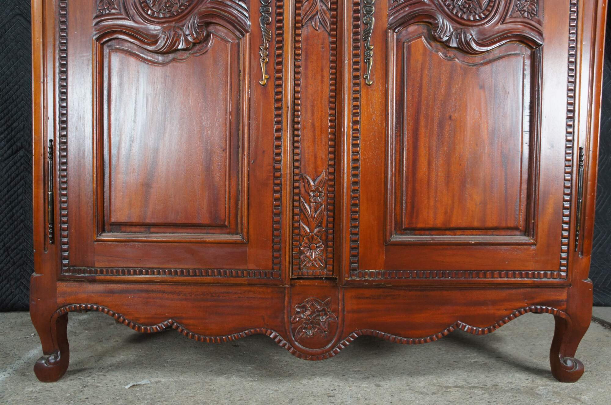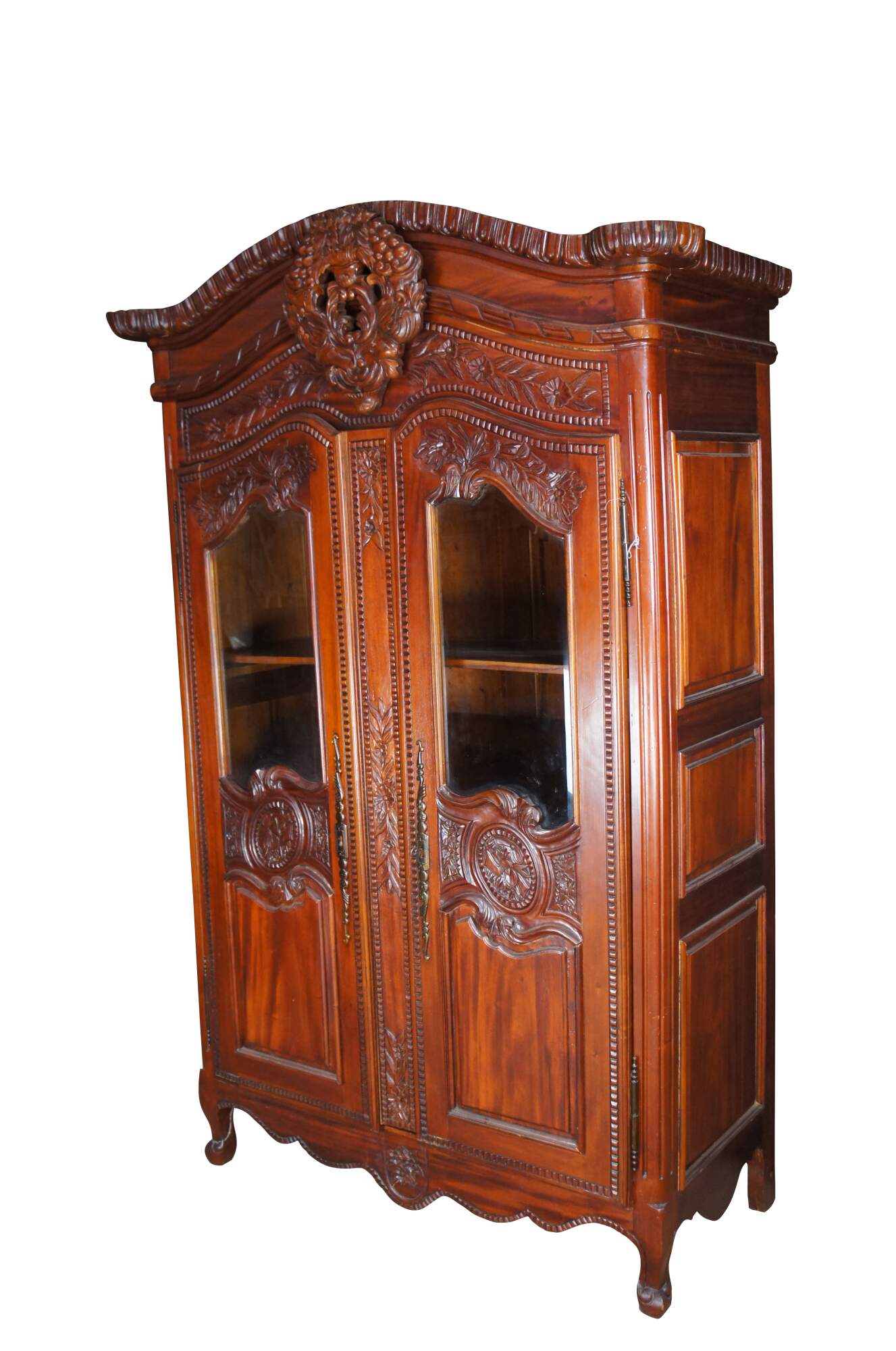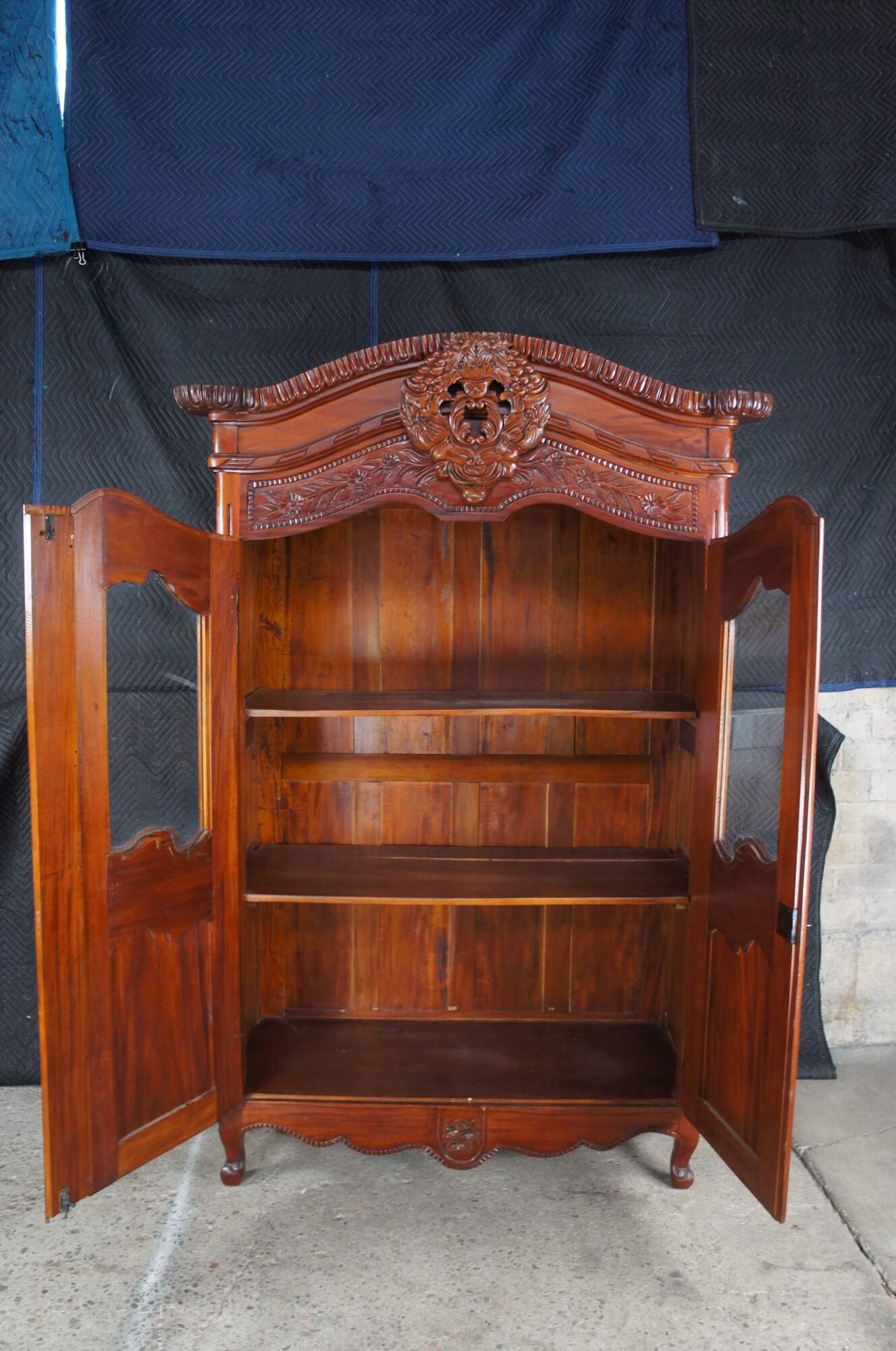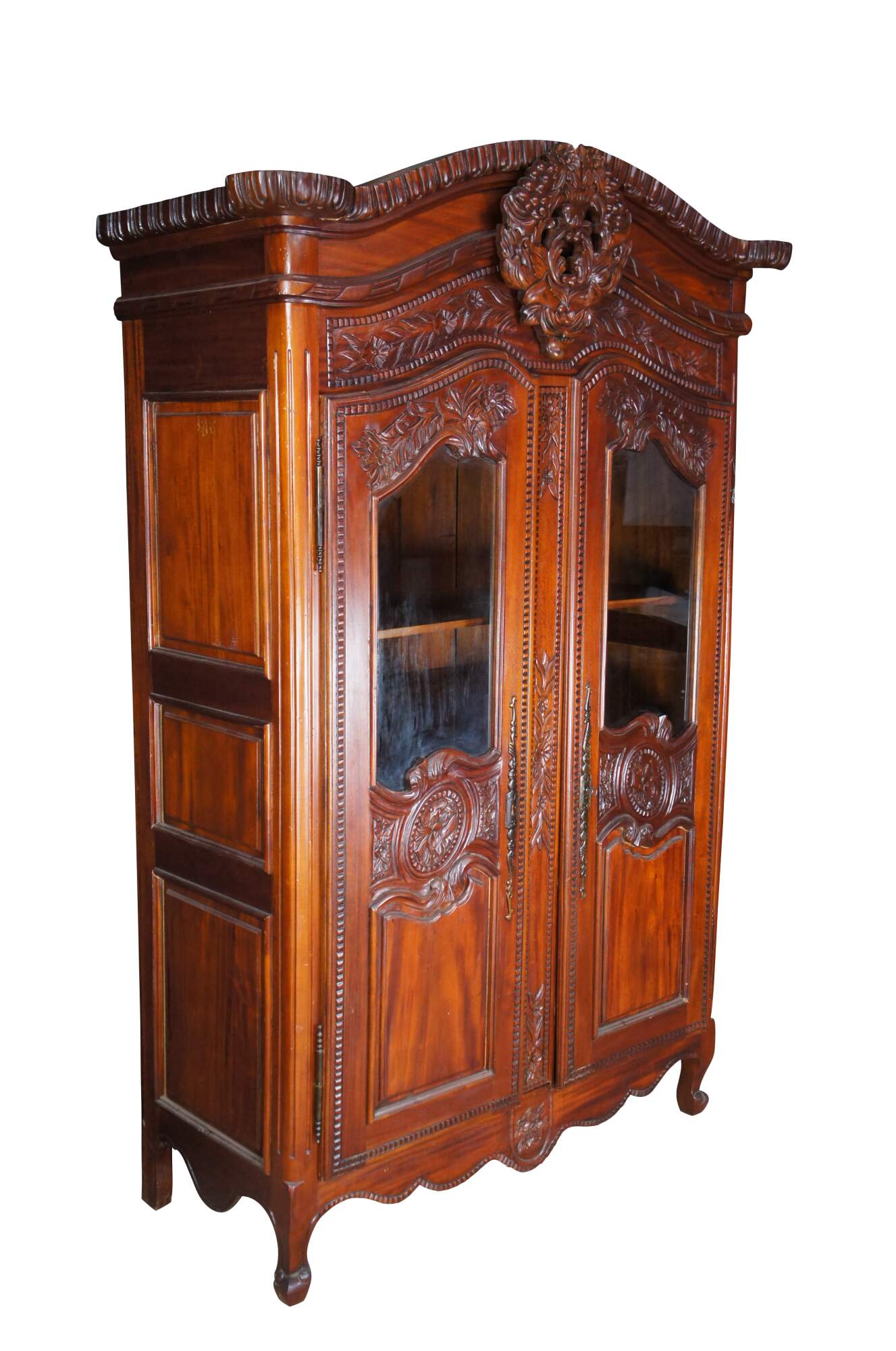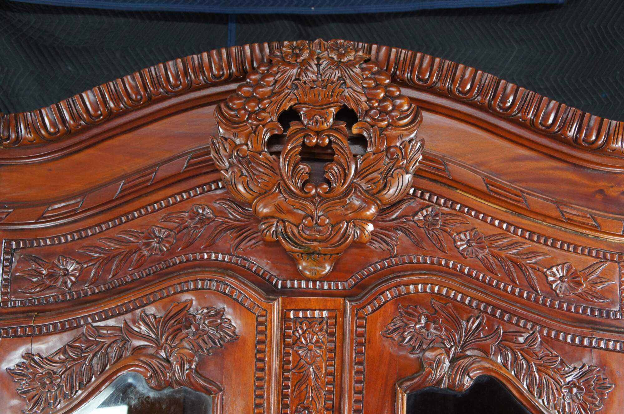 Vintage French Louis XV / Provincial style wedding armoire / wardrobe / linen press or display cabinet, circa last quarter 20th century. Made of mahogany featuring baroque styling with a carved crown over a floral bird theme. The armoire has paneled doors with beveled glass top allowing for use as a display cabinet. The central portion of the doors have oval carved floral catouches. The cabinet opens to two wooden shelves. The shelves could be removed allowing the cabinet to be used as a hanging wardrobe. The cabinet is supported by short cabriole legs at the front and straight legs along the rear.