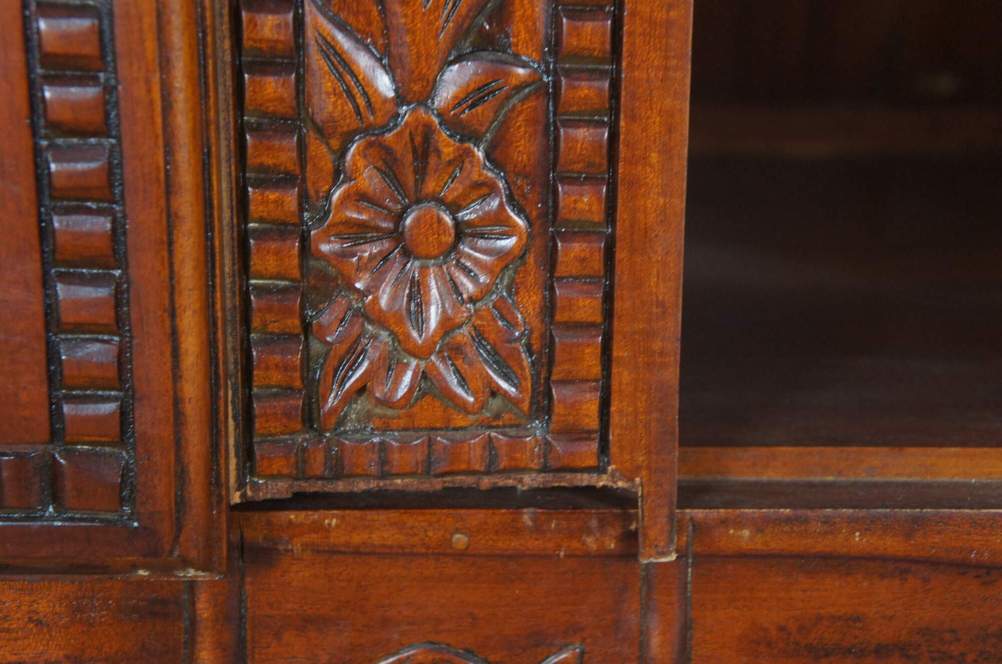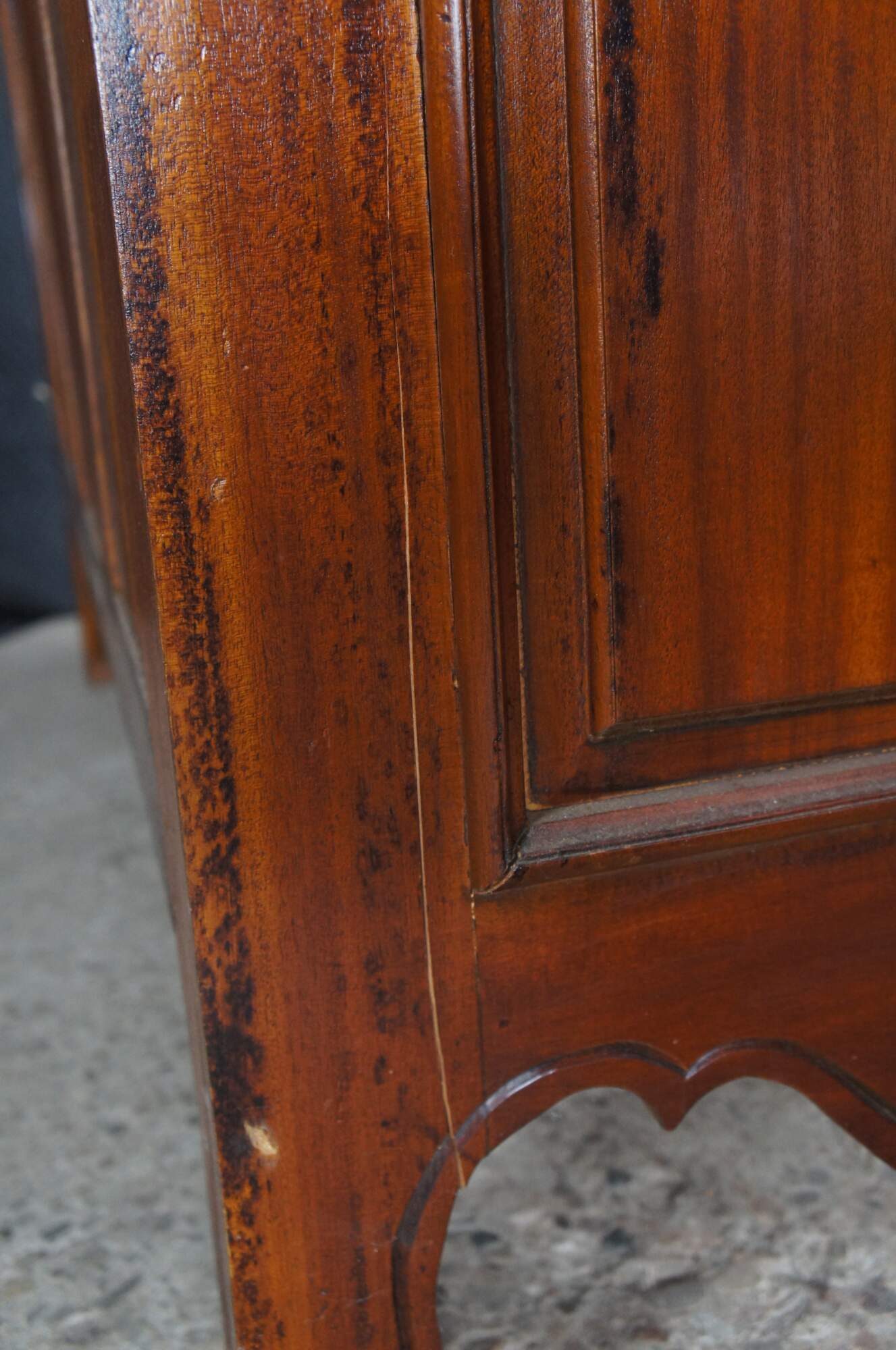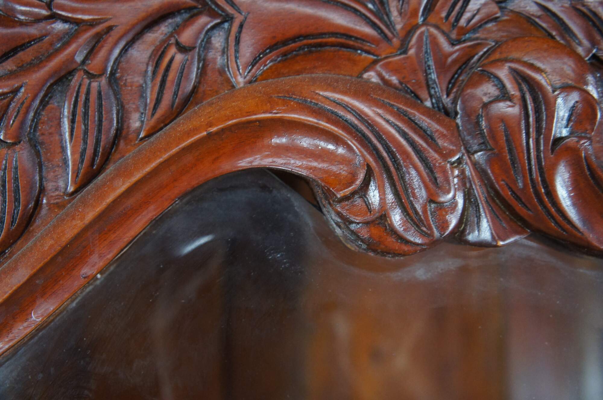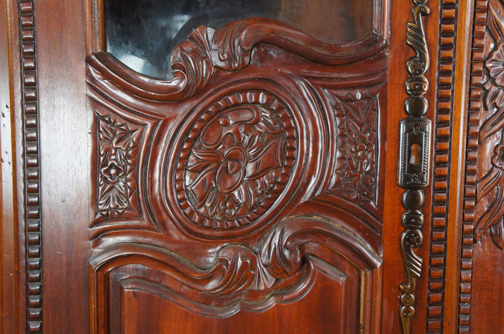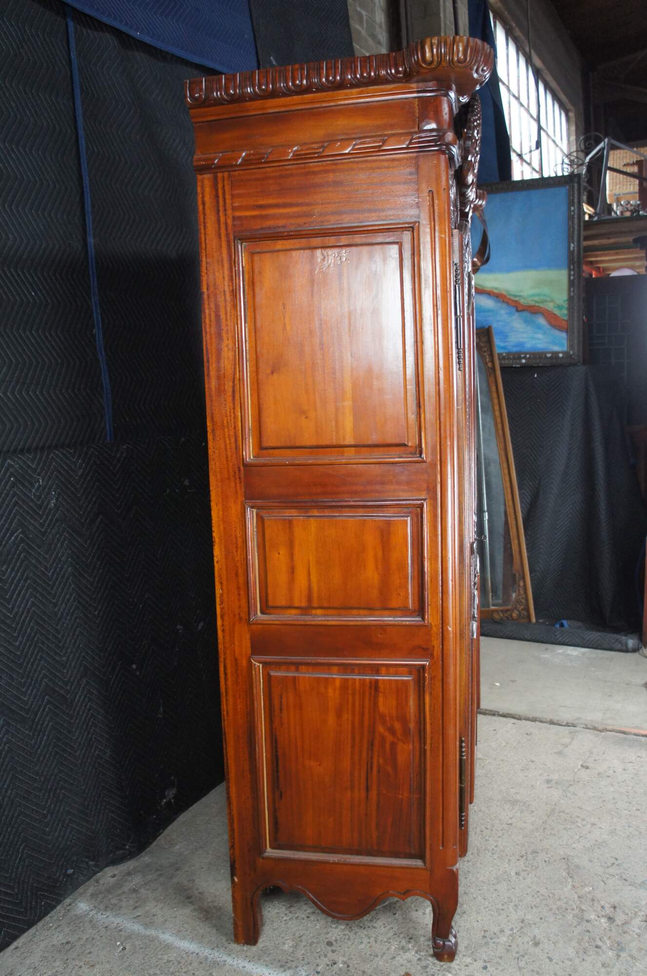 Vintage French Louis XV / Provincial style wedding armoire / wardrobe / linen press or display cabinet, circa last quarter 20th century. Made of mahogany featuring baroque styling with a carved crown over a floral bird theme. The armoire has paneled doors with beveled glass top allowing for use as a display cabinet. The central portion of the doors have oval carved floral catouches. The cabinet opens to two wooden shelves. The shelves could be removed allowing the cabinet to be used as a hanging wardrobe. The cabinet is supported by short cabriole legs at the front and straight legs along the rear.