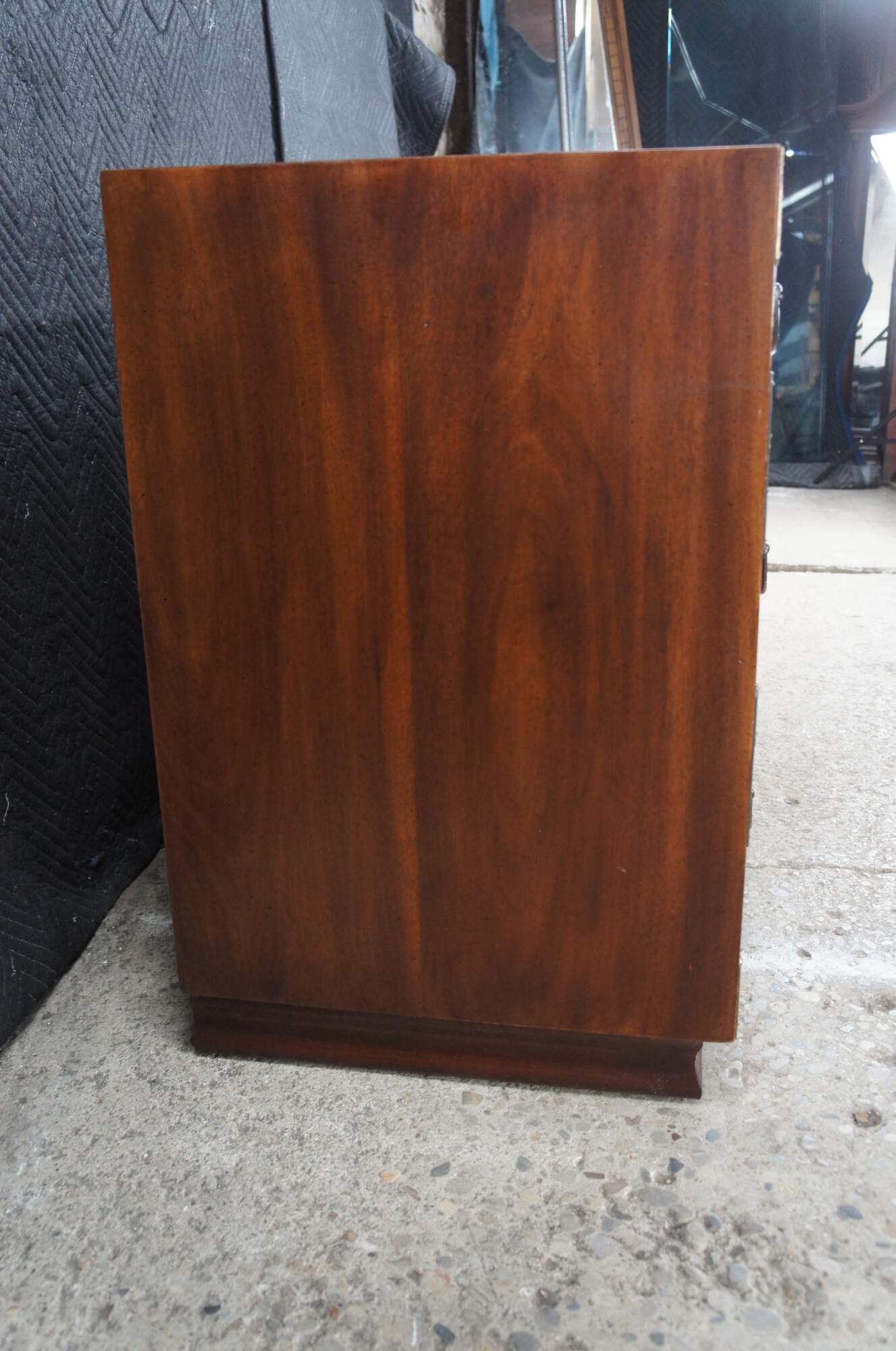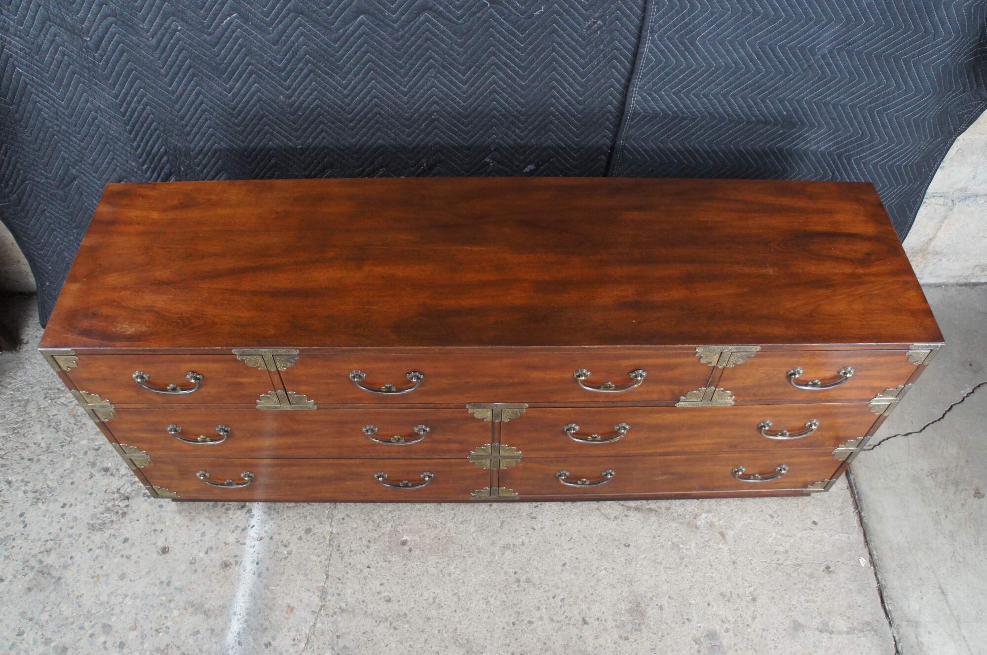 A vintage Henredon lowboy dresser in the Japanese Tansu Campaign style circa 1979. Part of their far east collection. Features a rectangular frame made from Mahogany with seven dovetailed drawers, brass pulls and embossed brass chinoiserie accents. Three of the drawers have removable dividers and the centermost drawer has a jeweley tray. The chest is set over a plinth base. A unique piece that will also work well as a buffet, server or console. Made in Morganton, North Carolina, USA, circa 1979.