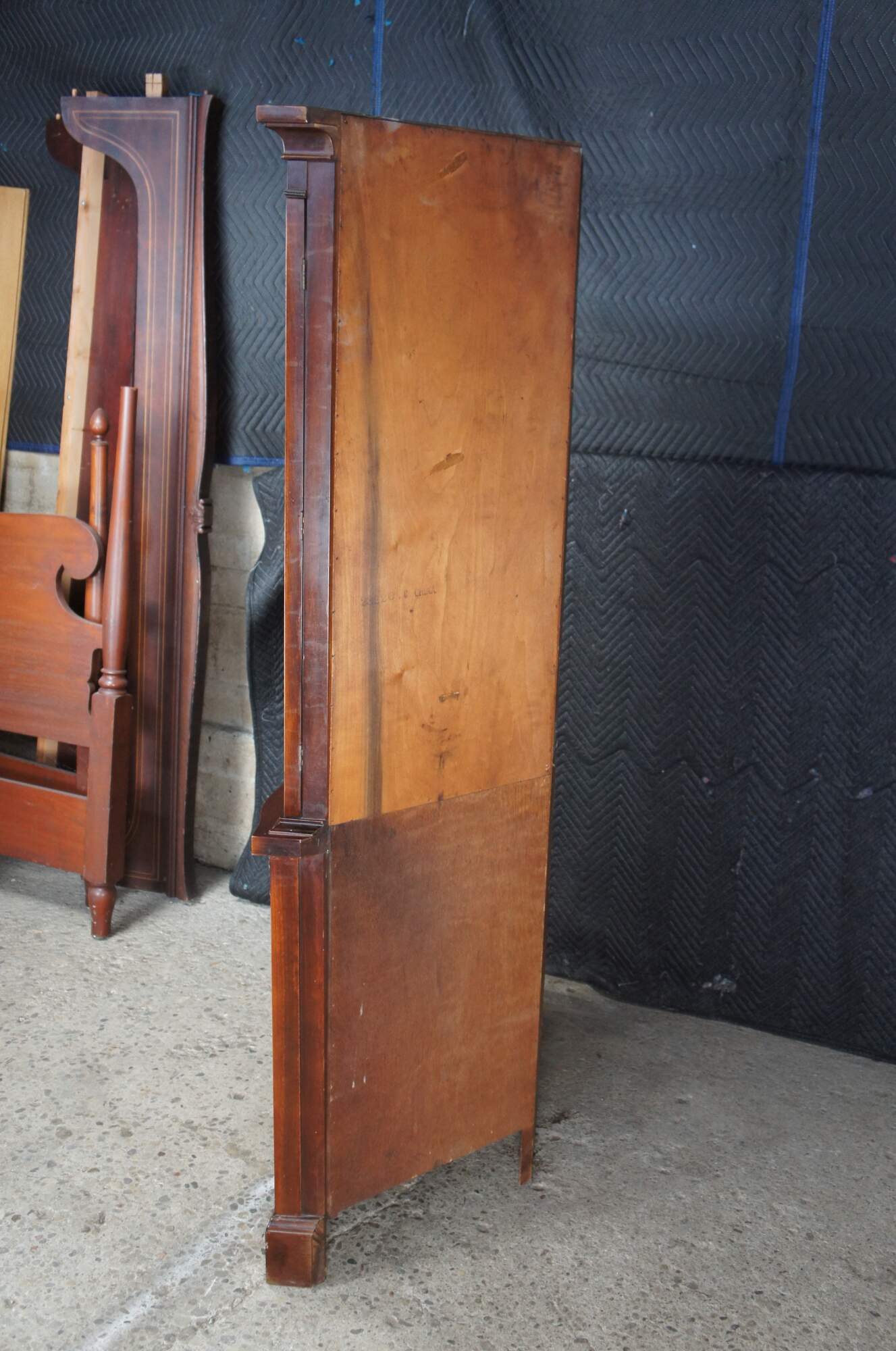 Traditional glass front corner cabinet, c. 1940s. Features a mahogany case with two glass covered doors along the front. The cabinet opens to two shelves with plate grooves along the top over a lower cabinet with shelf for accessory storage. Marked 23226 C. China along the back.
