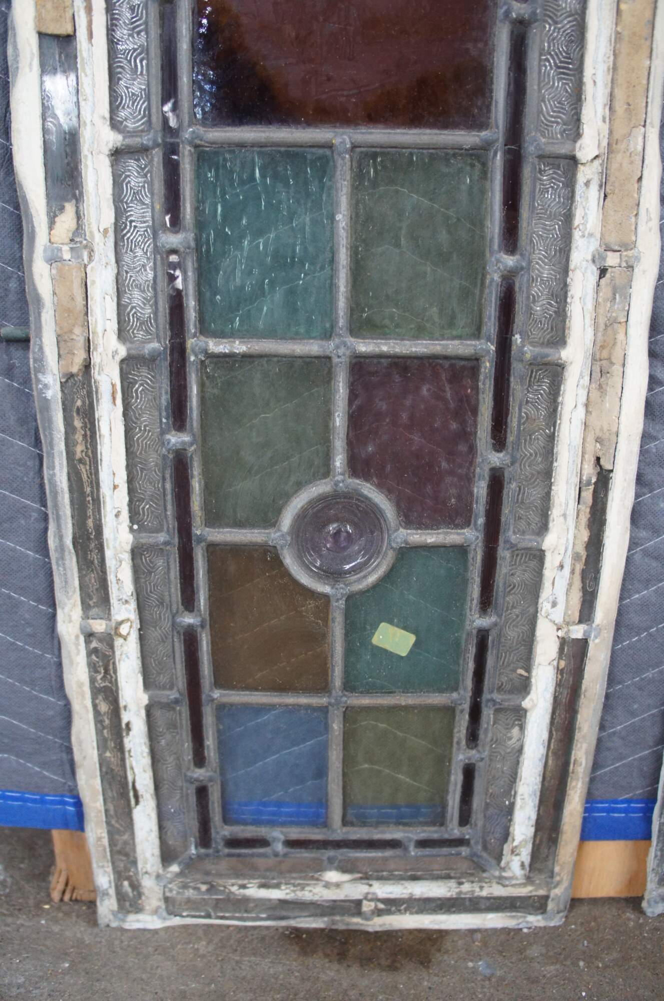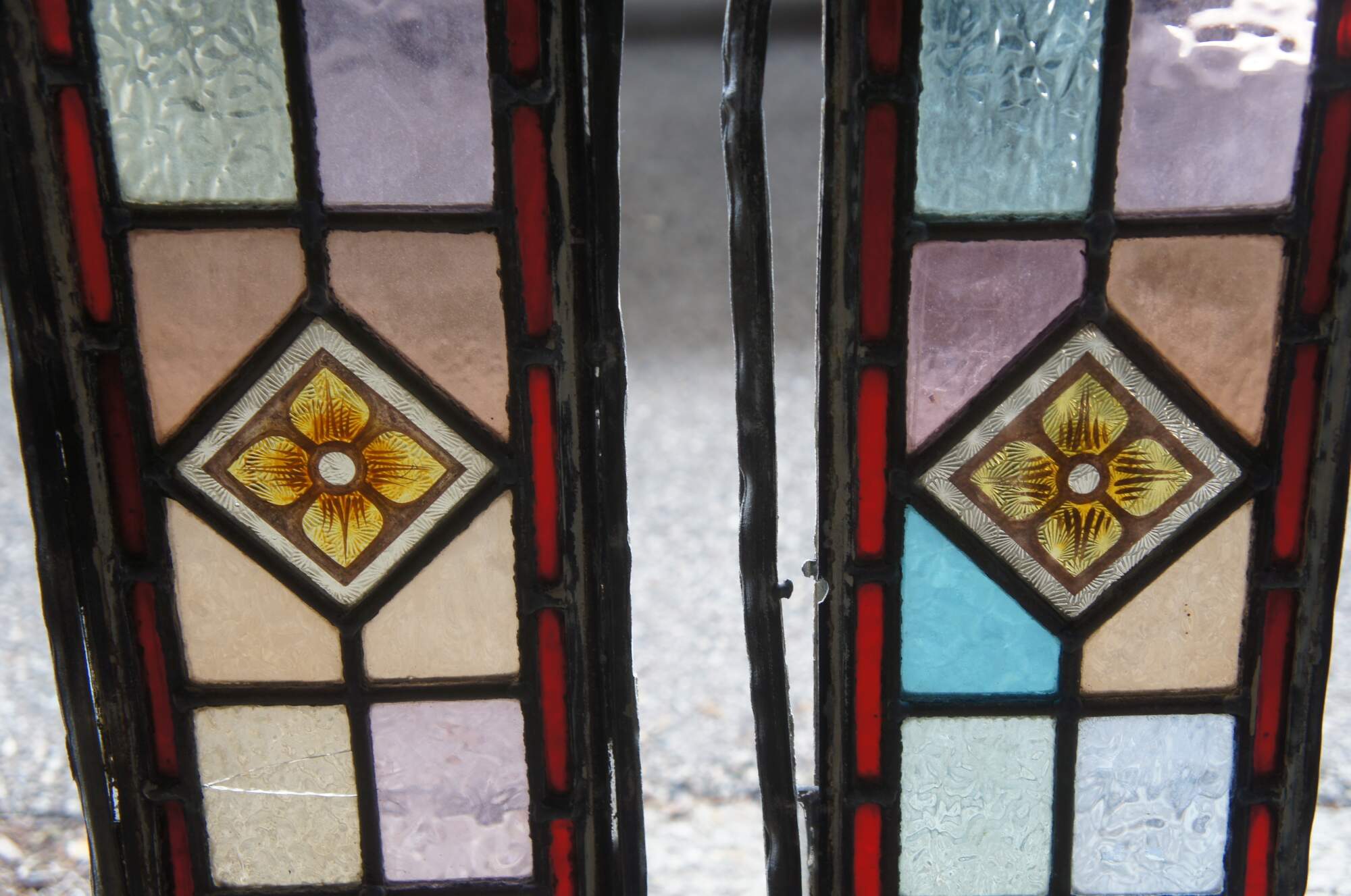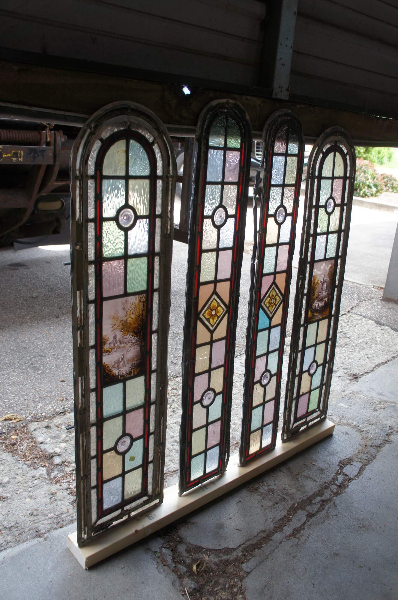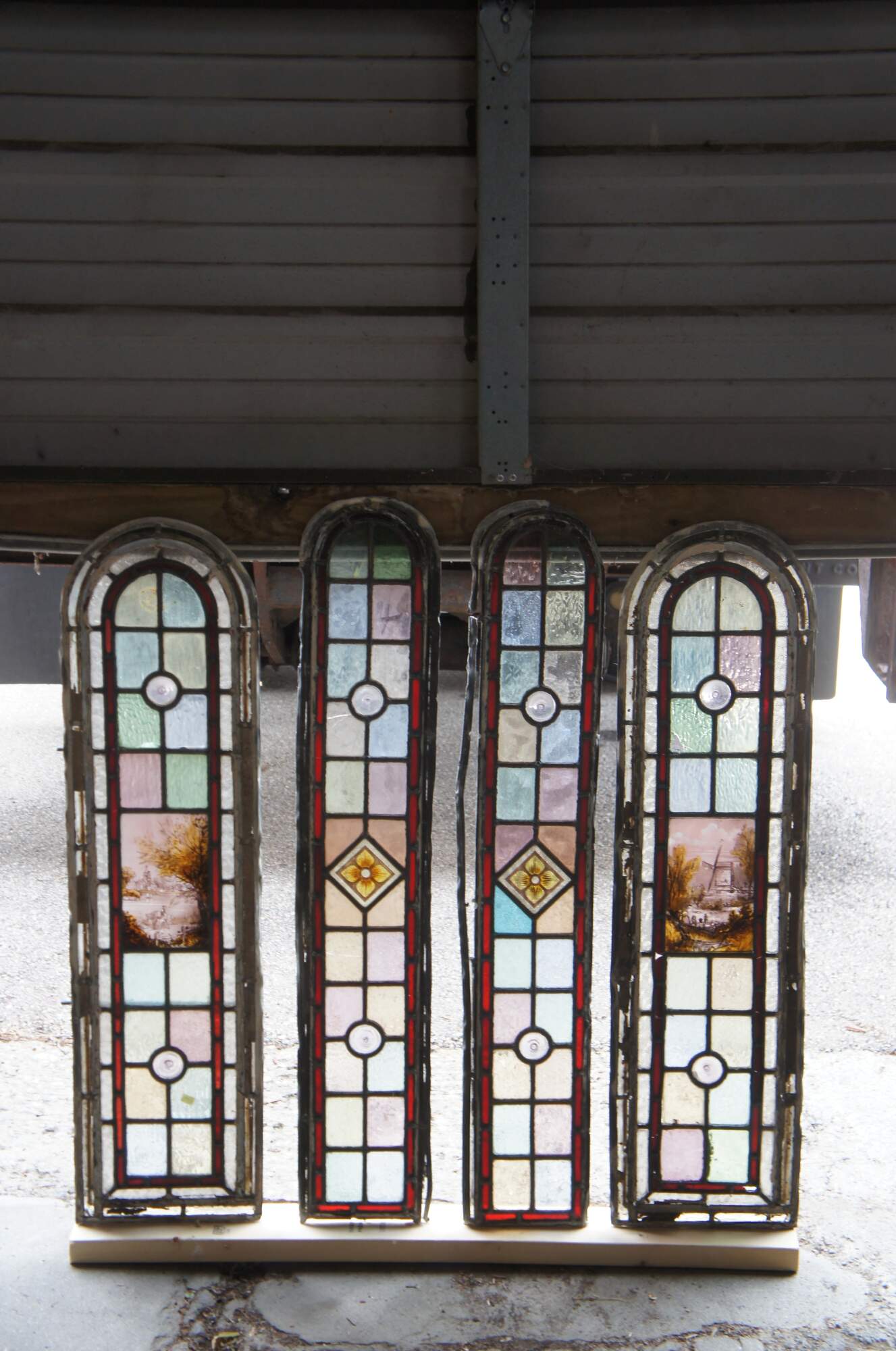 A charming set of four Early 1900s Edwardian reclaimed, leaded hand painted stained glass windows. Features a multicolored geometric glass pattern set around hand painted and fired scenes and floral detail. the two larger windows showcase landscape scenes. One has a windmill with figures and the other is a riverscape with horses across the water from a town and boat. The two skinnier windows have a diamond pattern center wit ha flattened four petal flower. A beautiful set for any space.