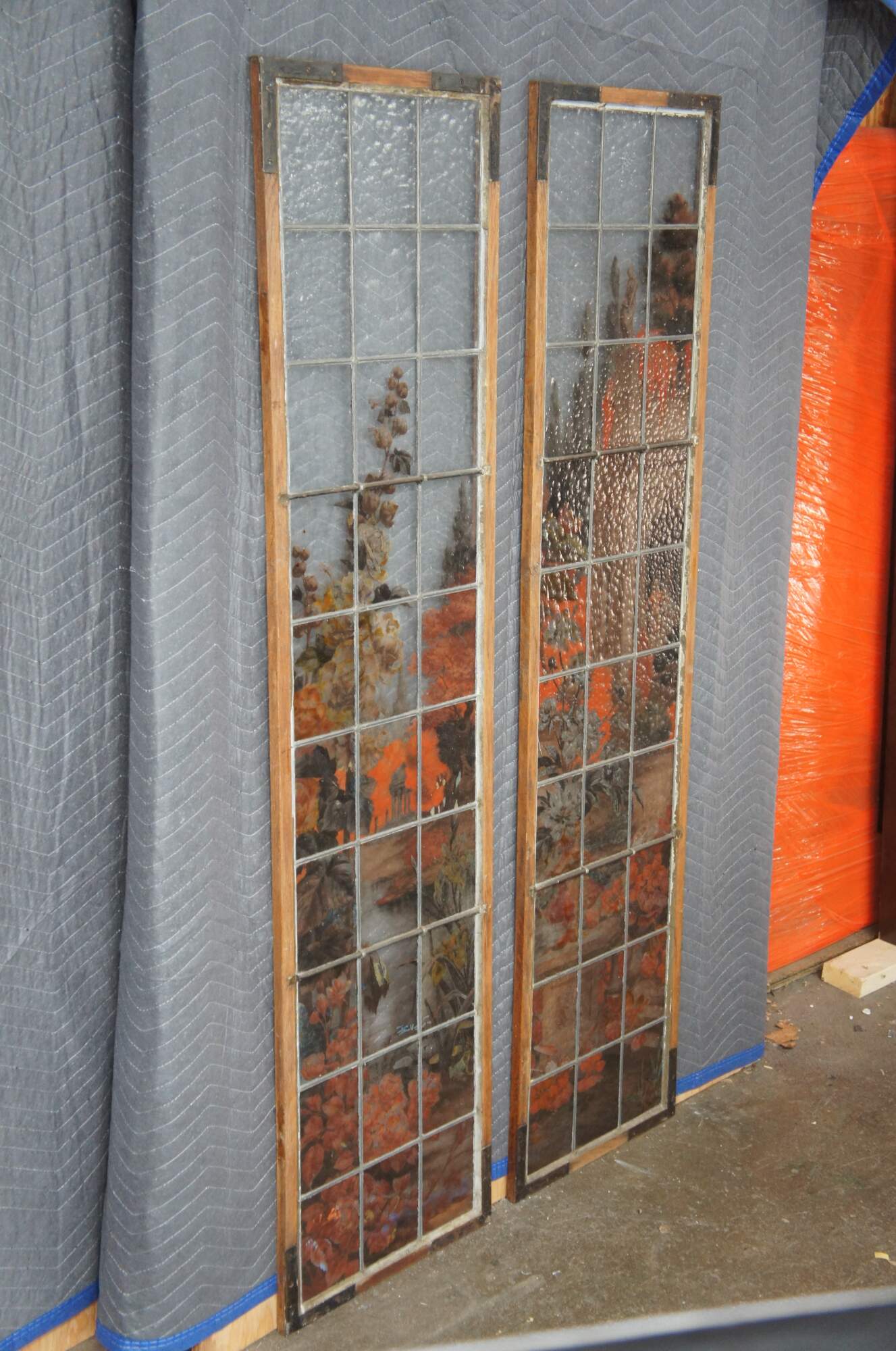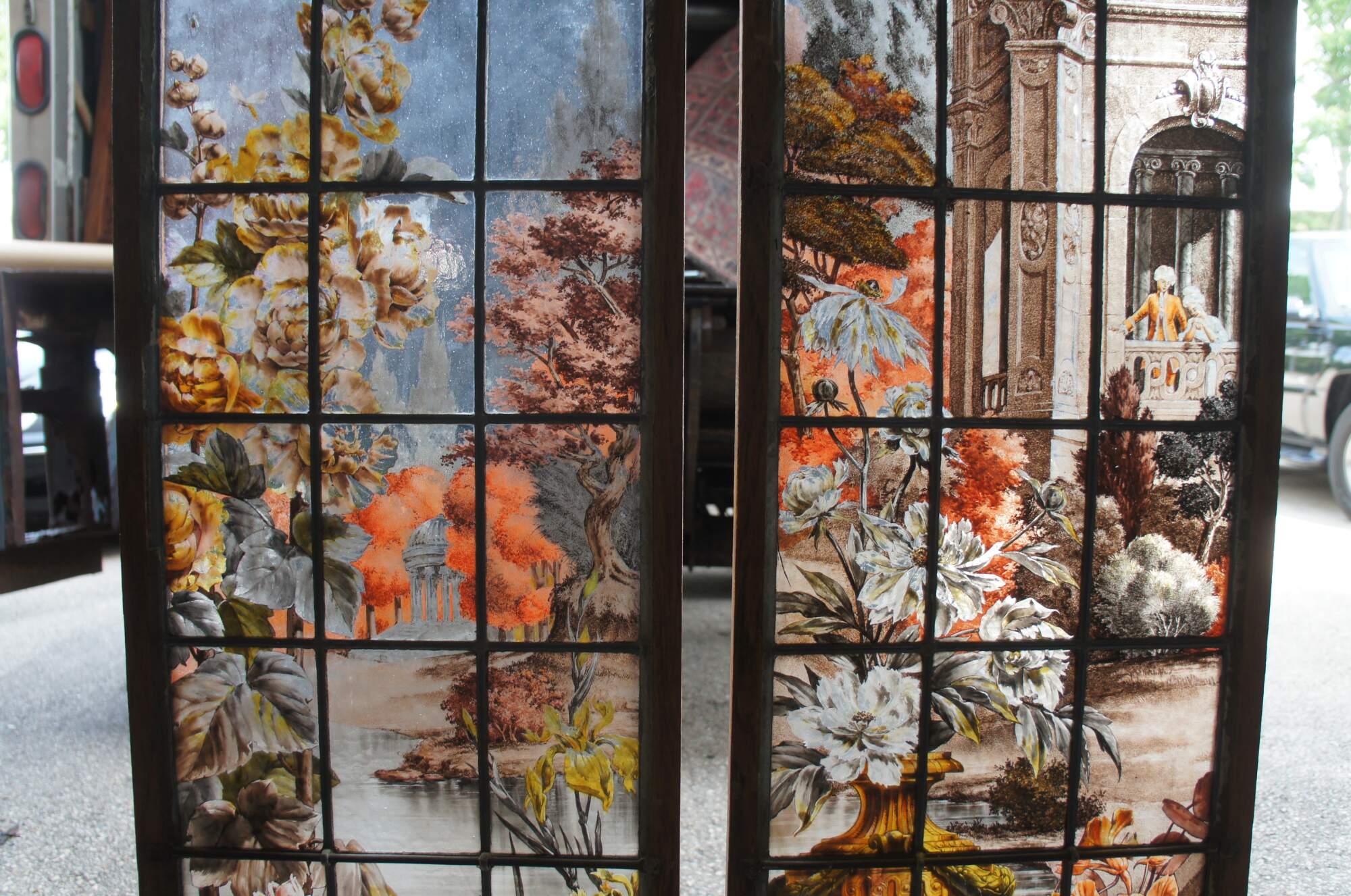 2 Vintage reclaimed French painted and fired leadedstained glass windows. Features a Neoclassical botanical garden scene with vinbrant flowers and architecture. Signed E Couet along lower side of one.