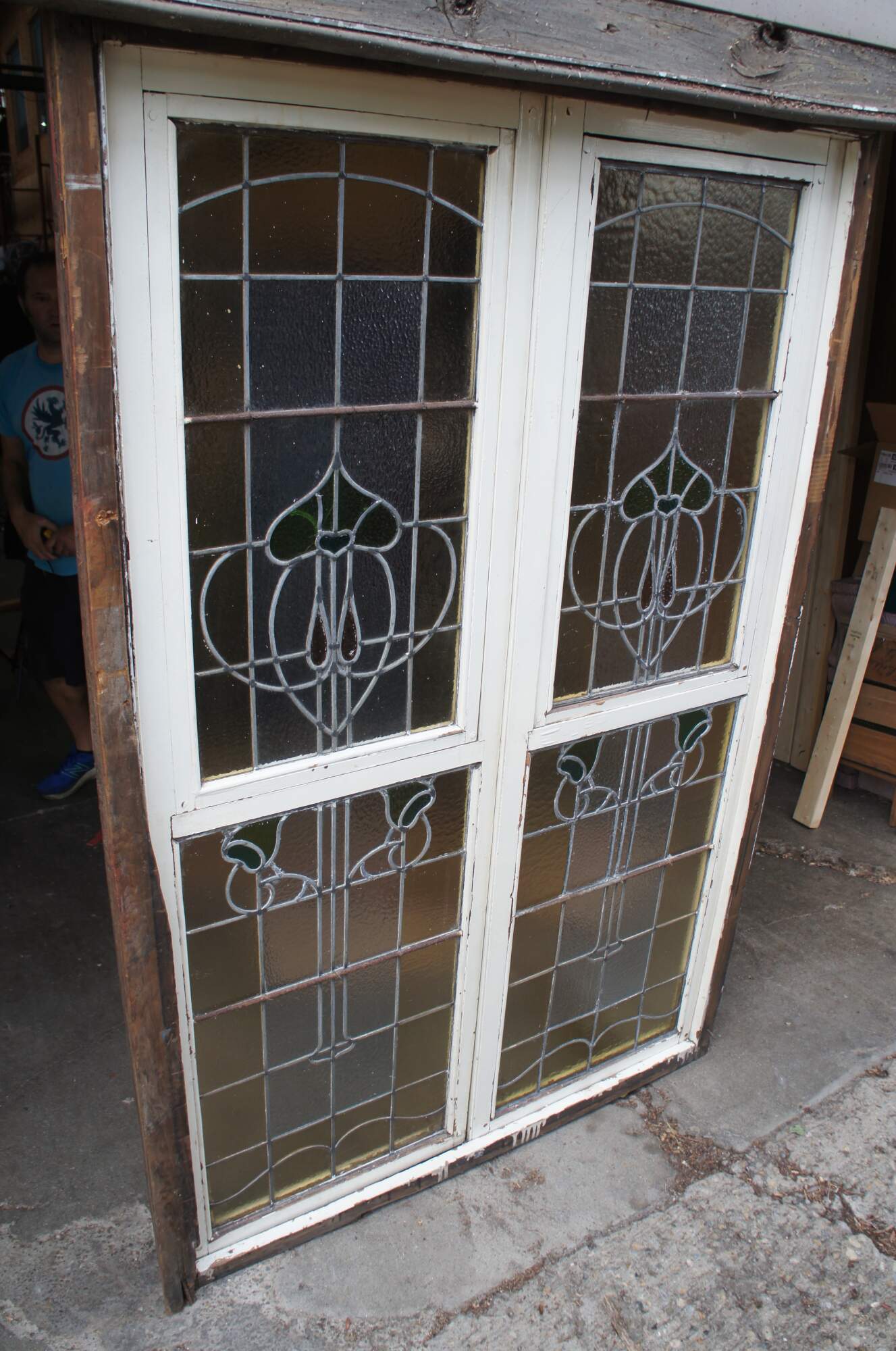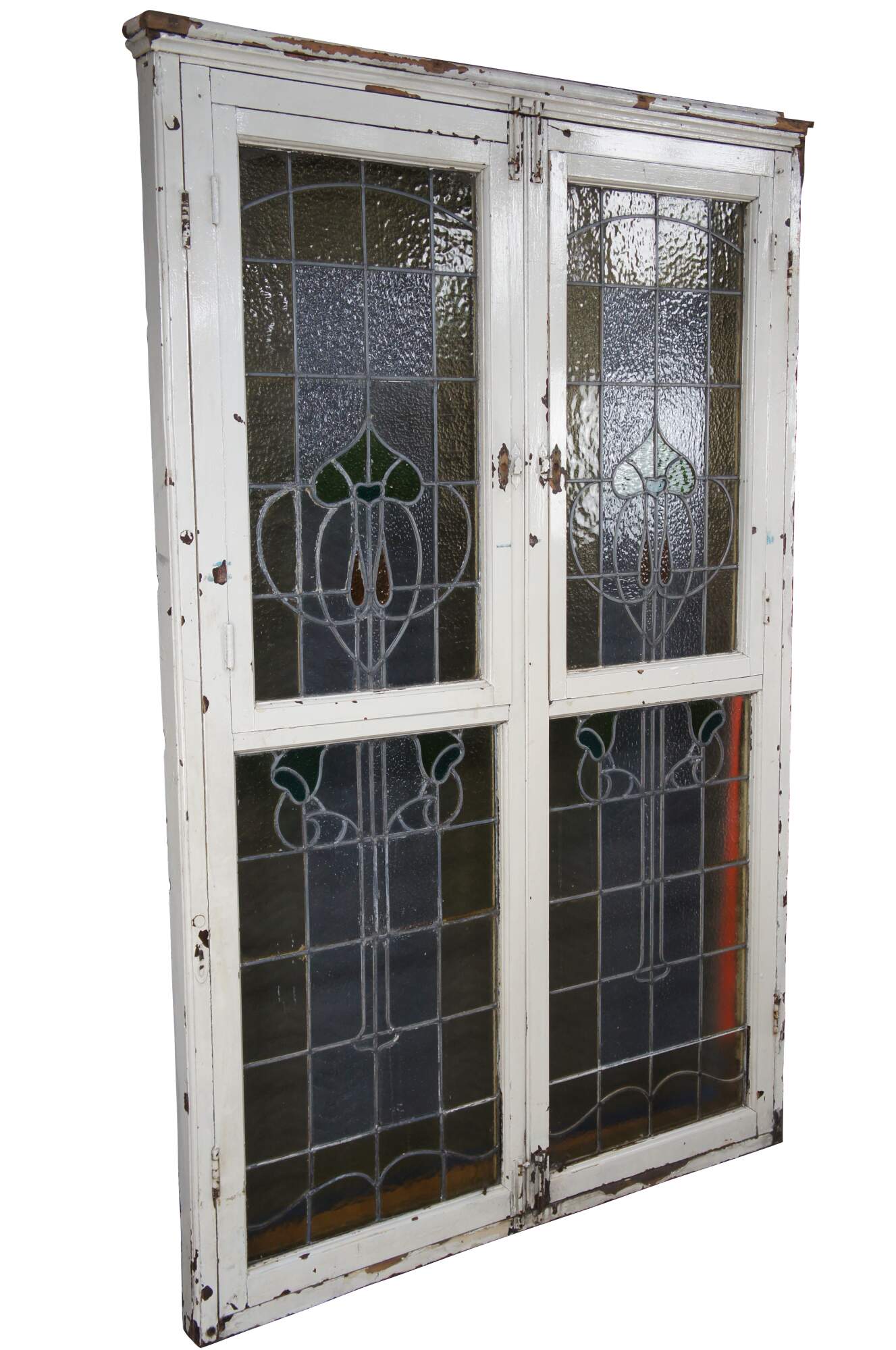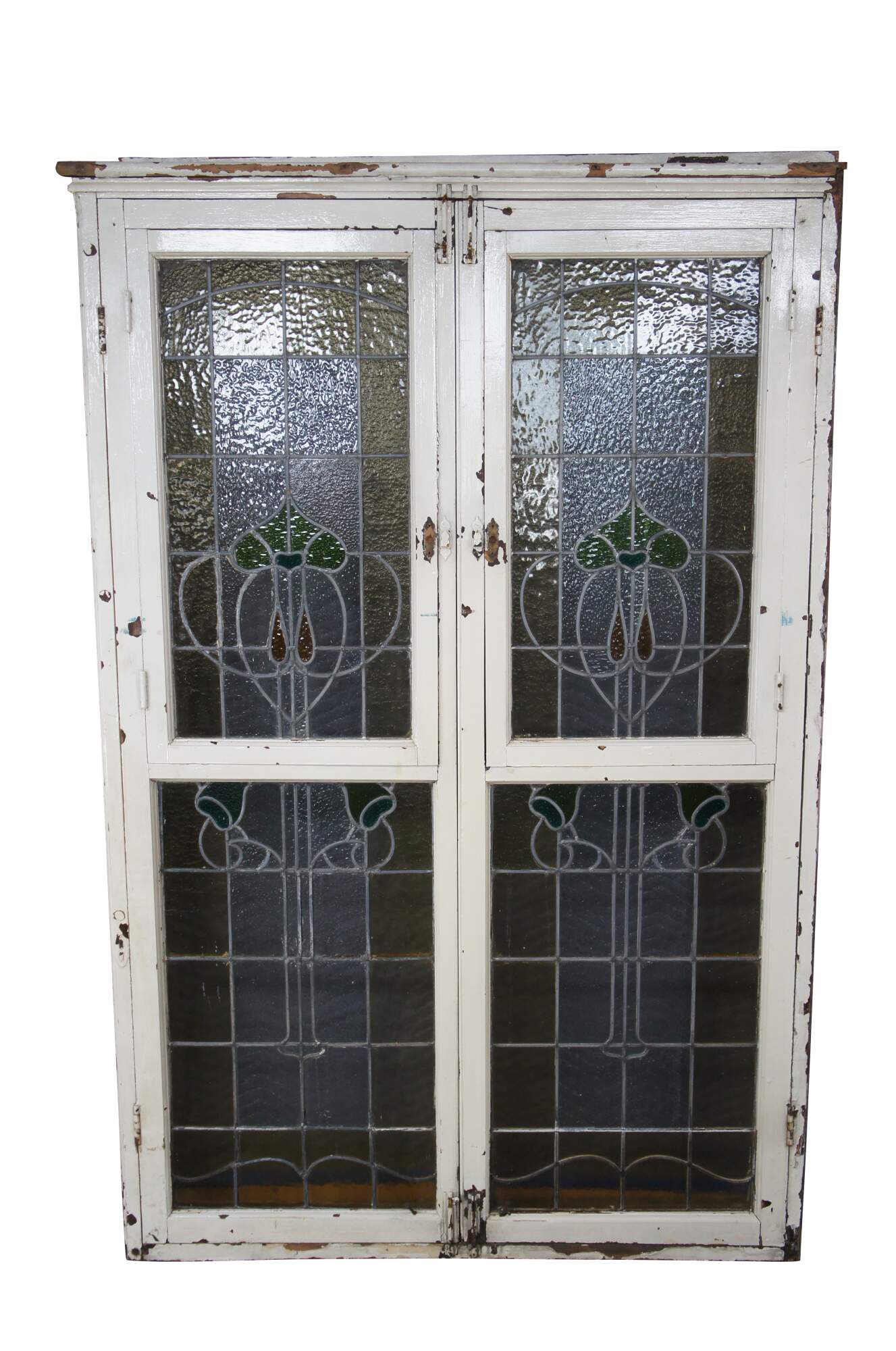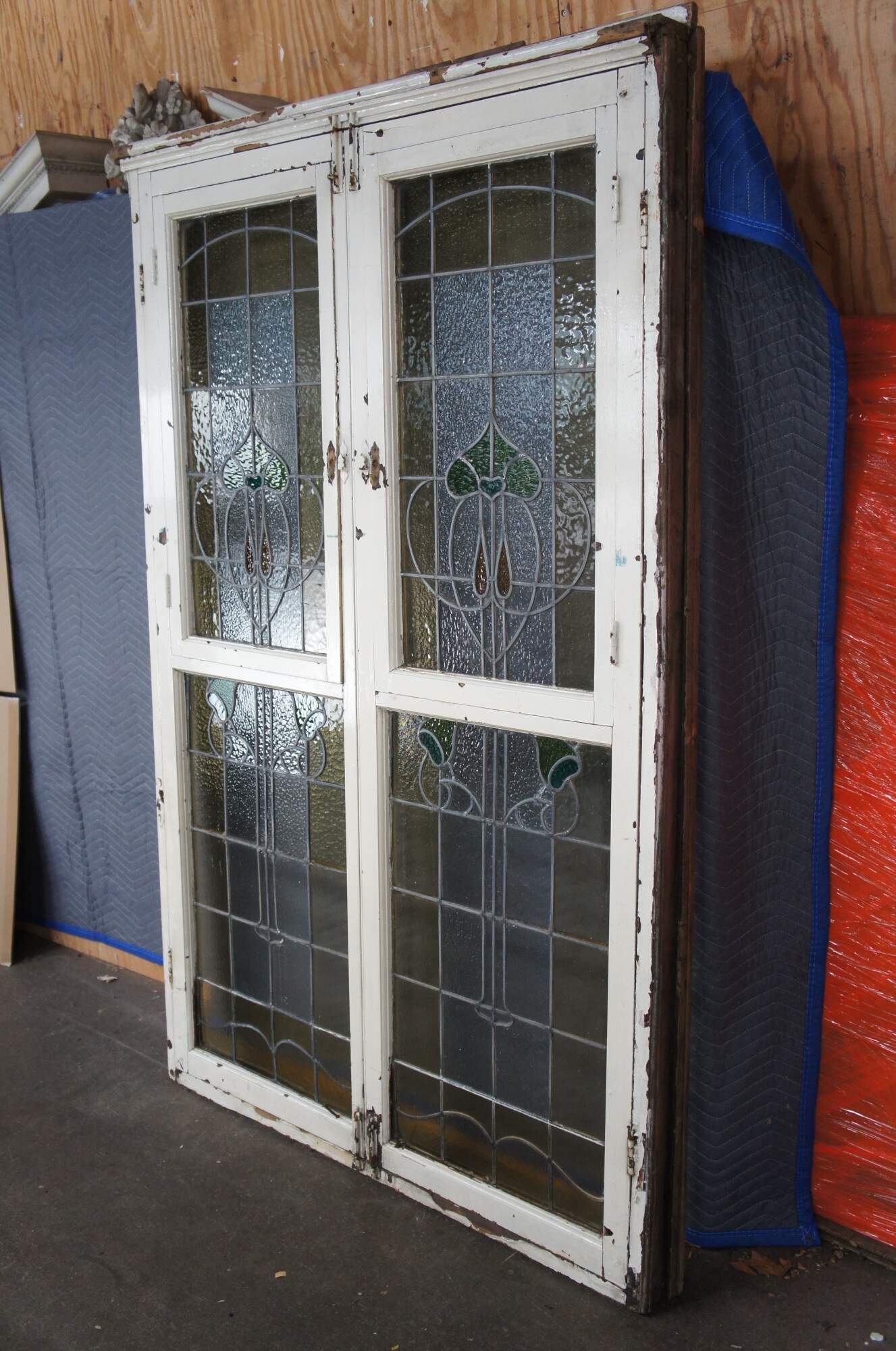 A rare and exceptional reclaimed large two part leaded stained glass French Door / Window. Features a large rectangular frame with two 2-part hinged doors with separte operating windows. Each window is designed with clear, pebbled and textured glass set around ornate floral designs showcasing colors of blue, green, and amber. The glass is set within large original salvaged wooden frames. Tthe perfect addition to any space.