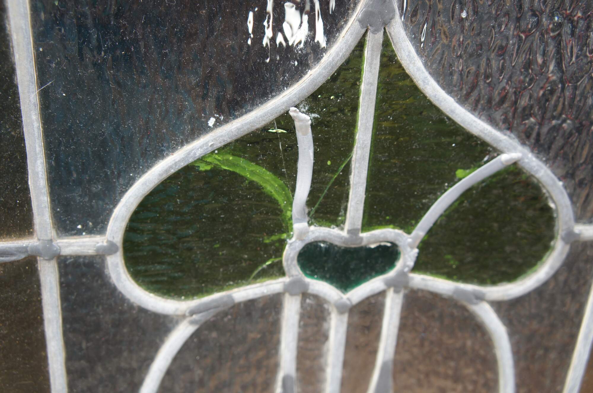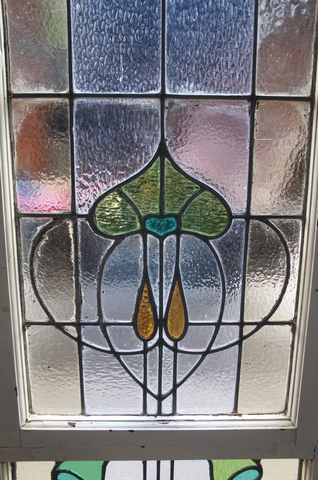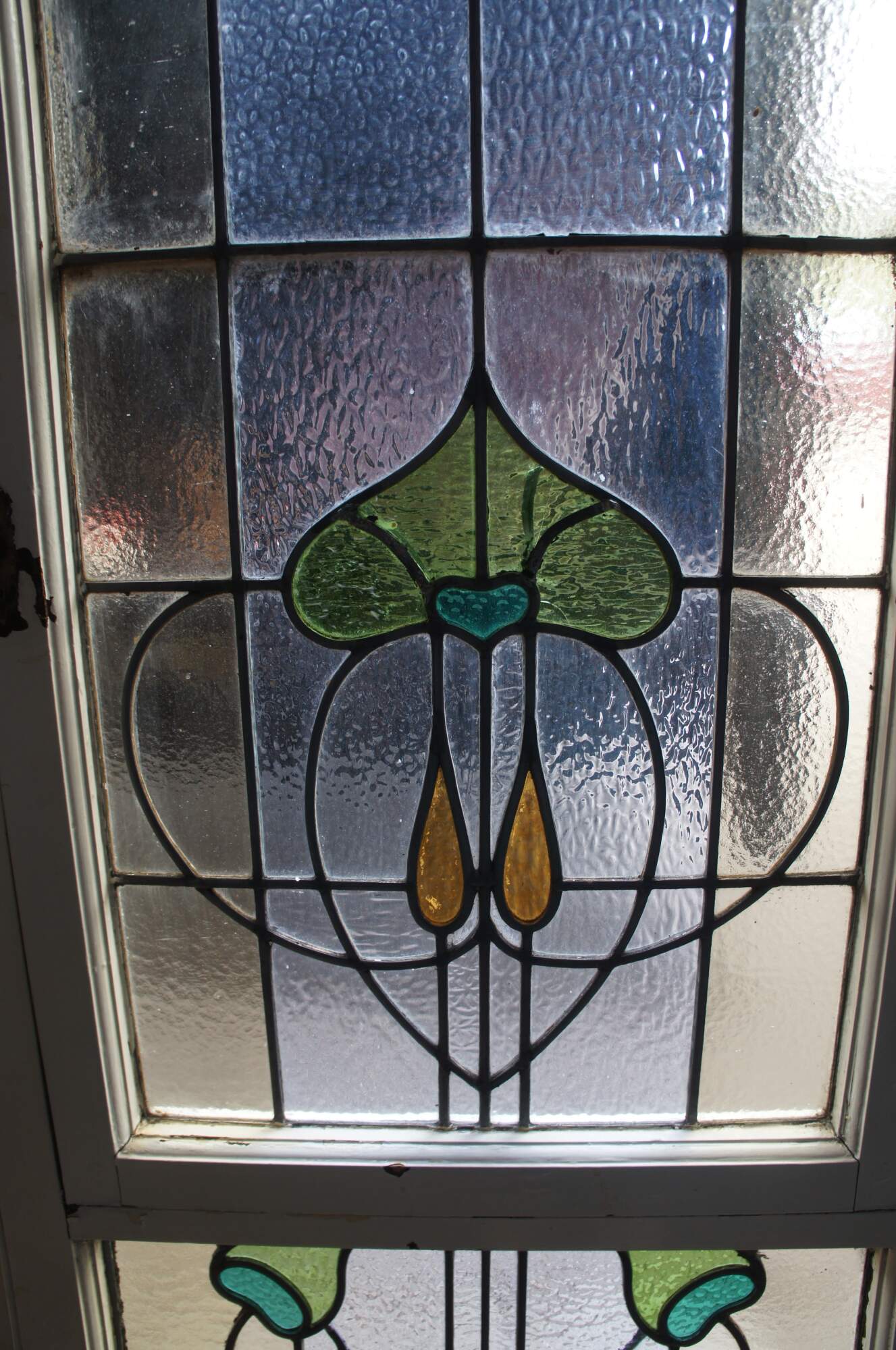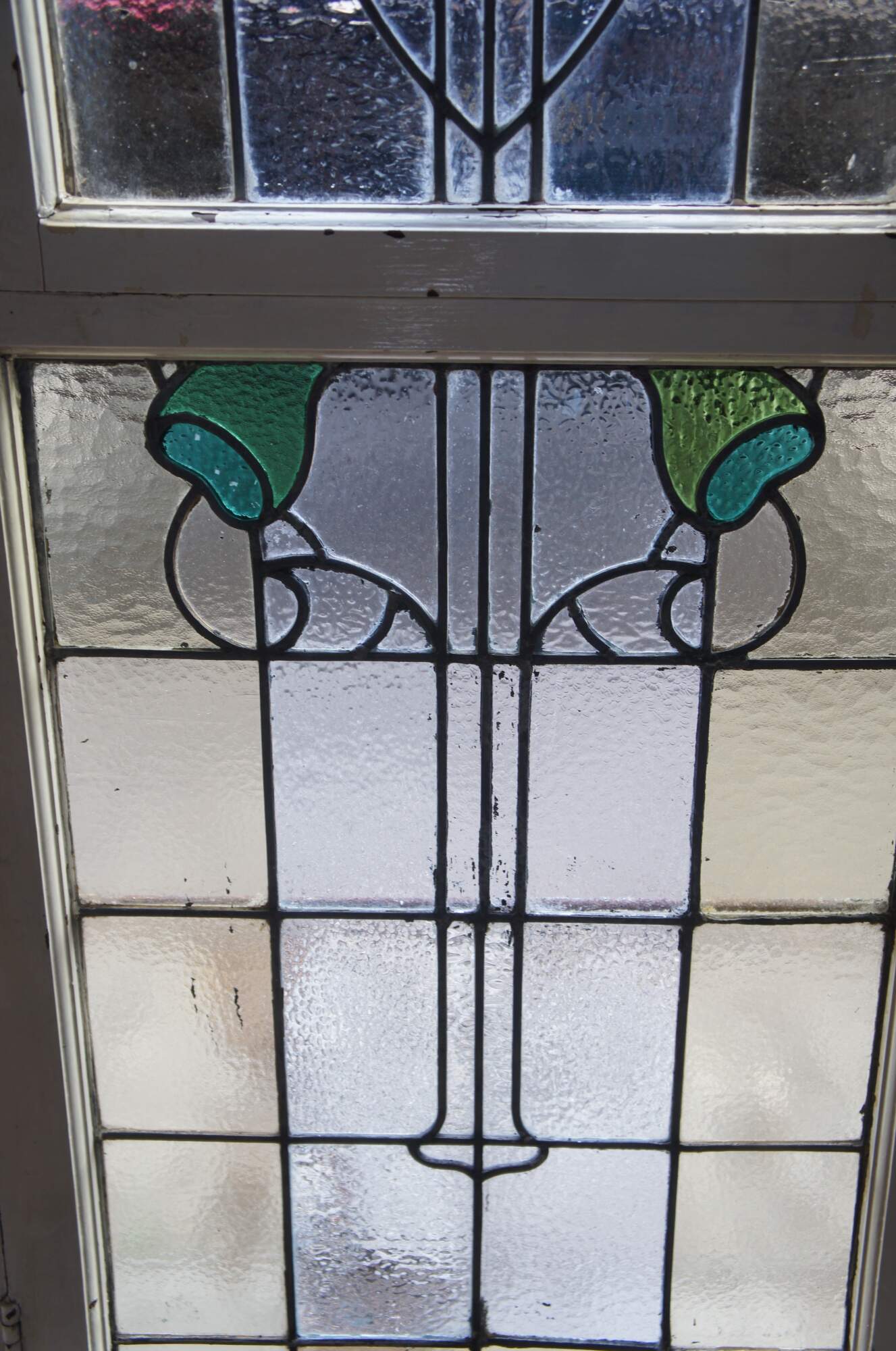 A rare and exceptional reclaimed large two part leaded stained glass French Door / Window. Features a large rectangular frame with two 2-part hinged doors with separte operating windows. Each window is designed with clear, pebbled and textured glass set around ornate floral designs showcasing colors of blue, green, and amber. The glass is set within large original salvaged wooden frames. Tthe perfect addition to any space.