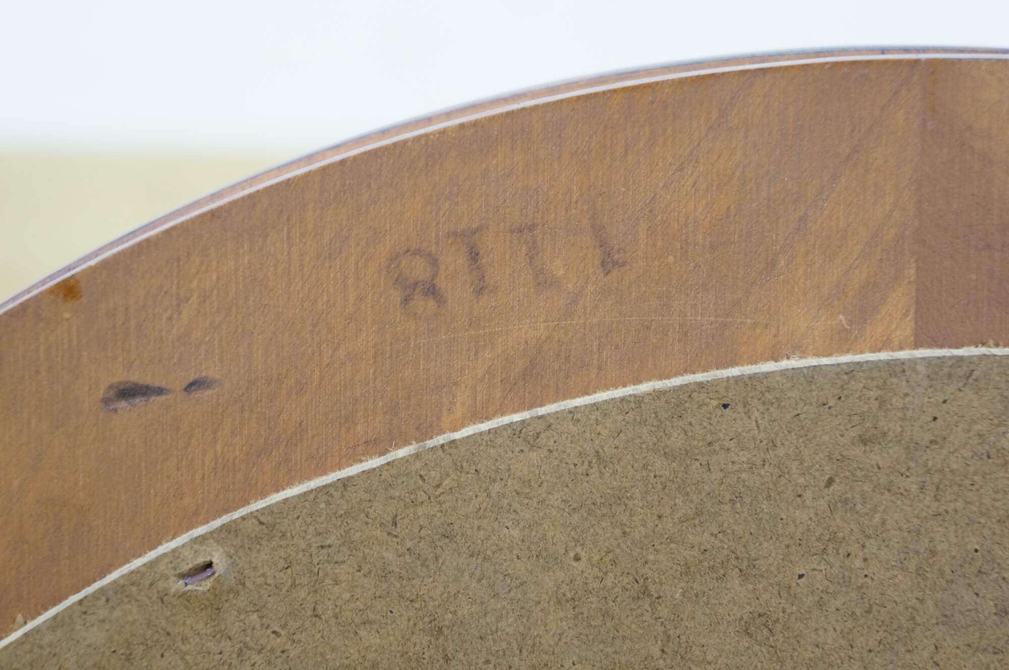 Long, oval, vintage wall mirror with beveled hardwood frame and beveled glass. Numbered 1118 on reverse.