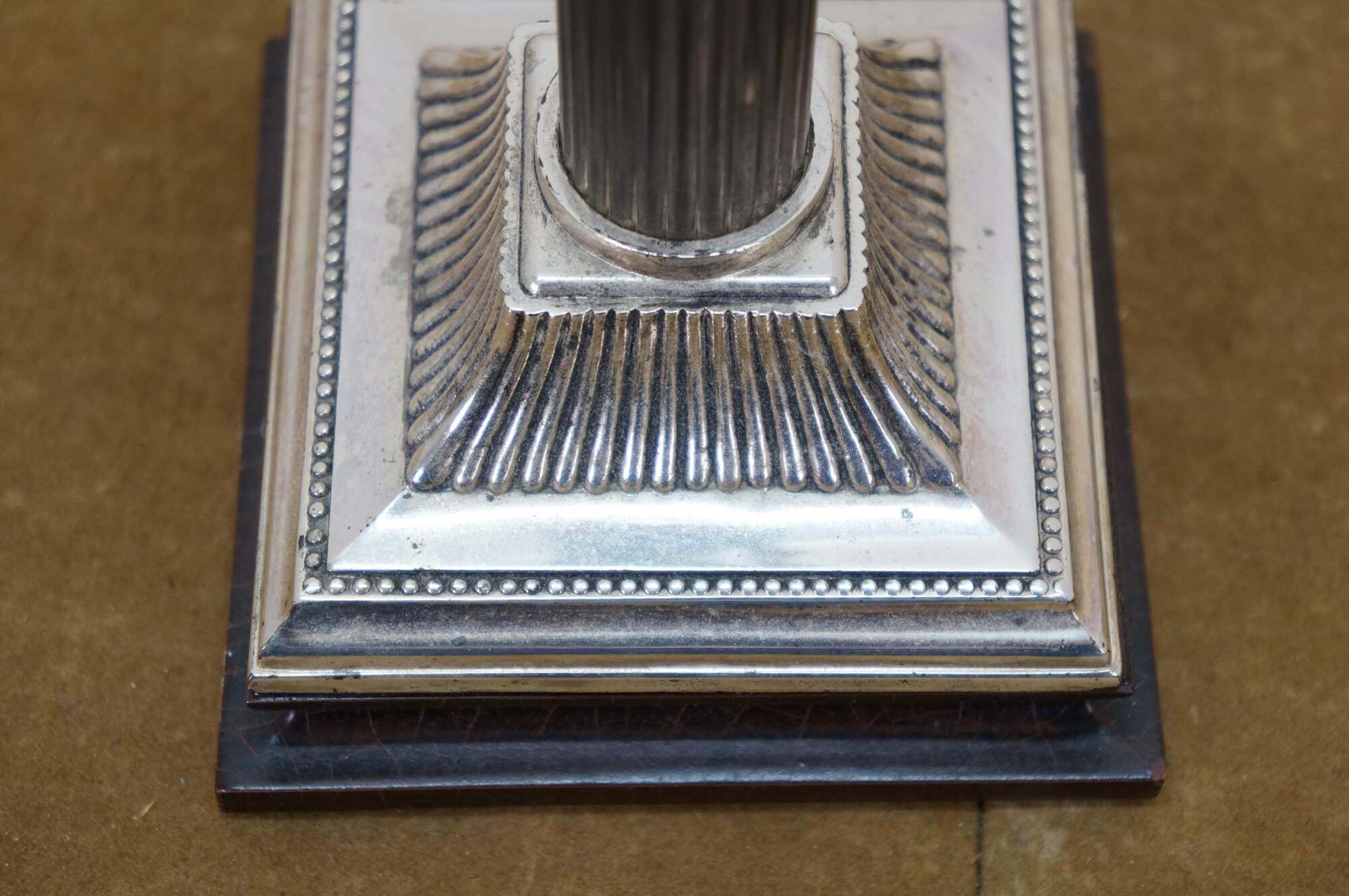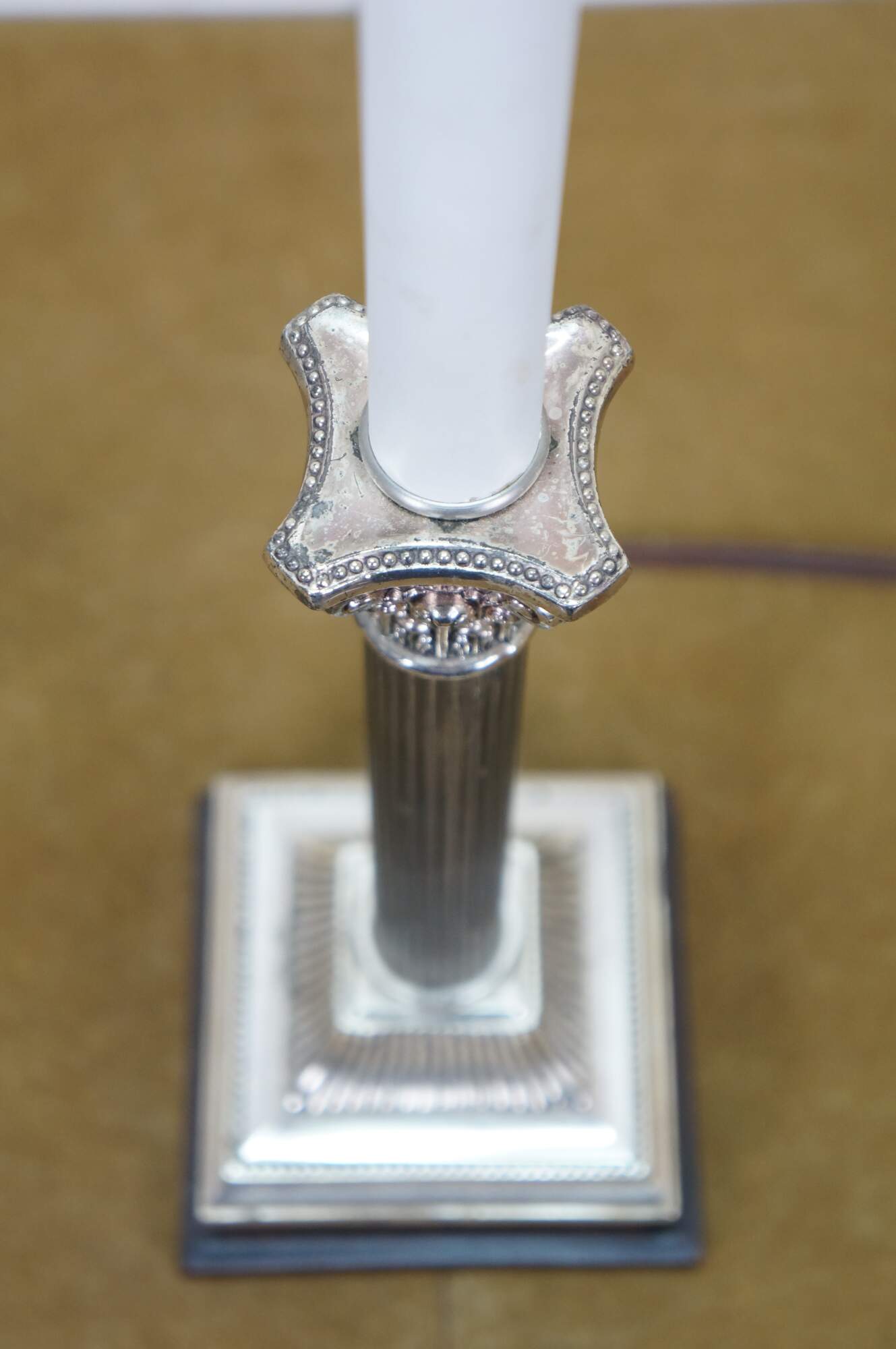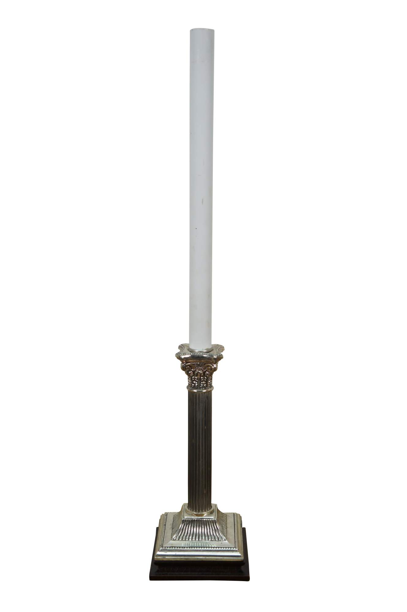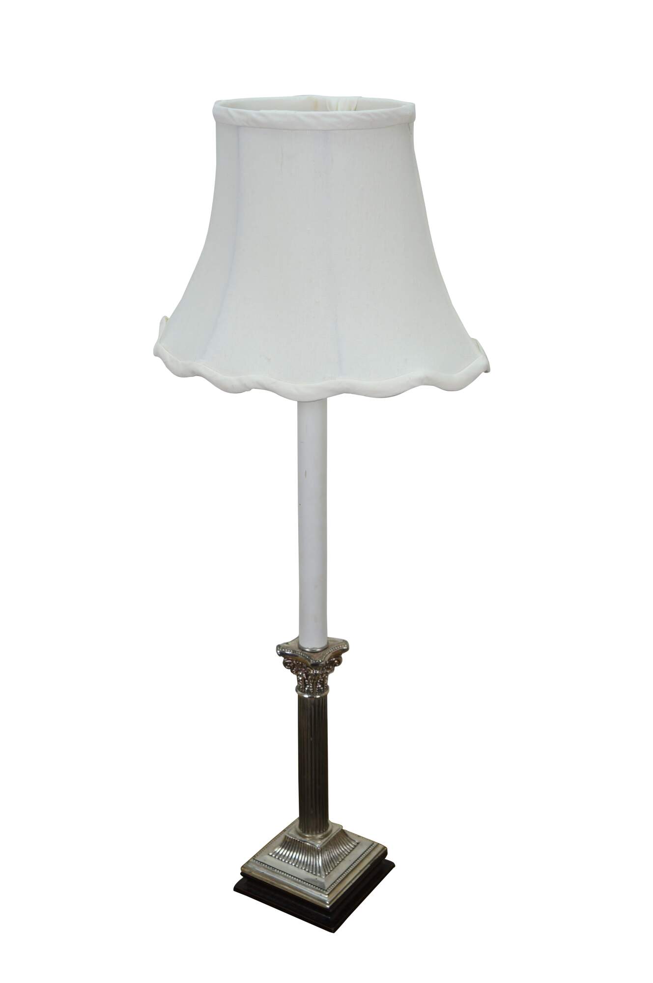 Late 20th century Kaiser 7 Kuhn buffet / table lamp - neoclassical silver plated Corinthian column on a dark, crackled base, topped with a slender faux candlestick. Kaiser & Kuhn Lighting Ltd, Maiden, North Carolina. Includes white fabric shade.