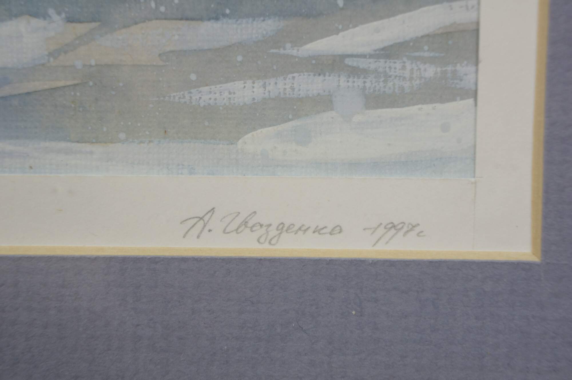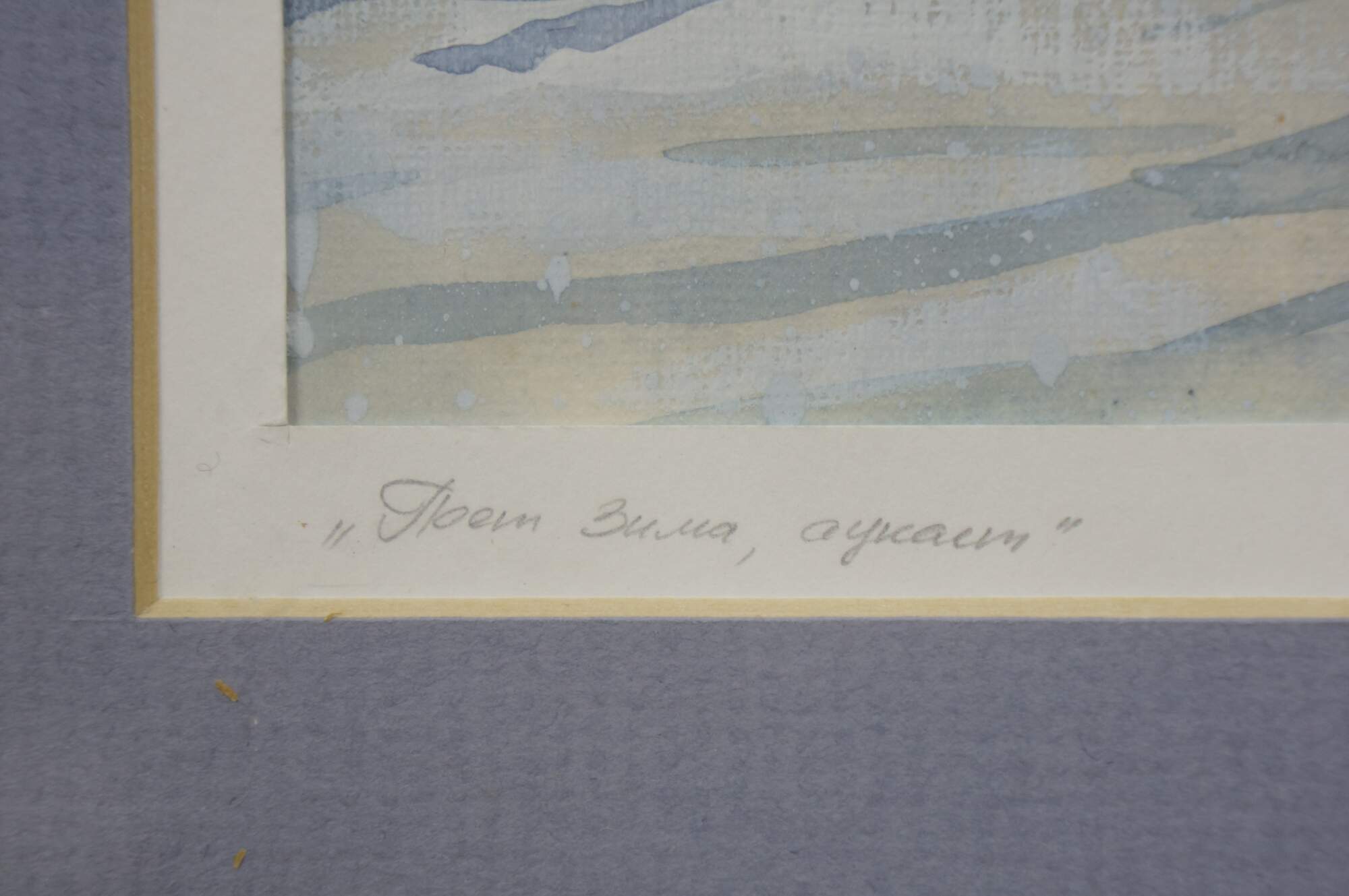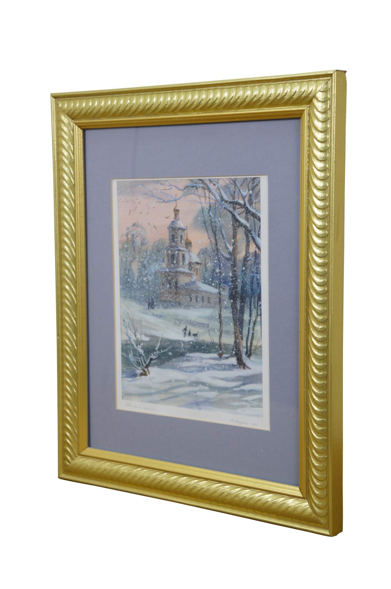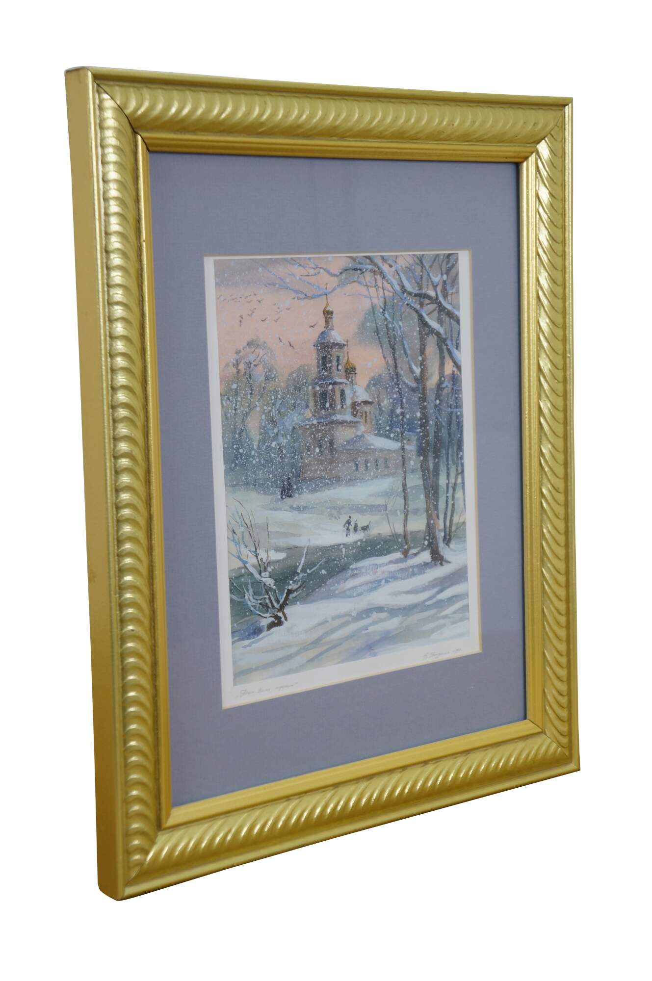 Vintage 1997 watercolor on paper landscape painting by A Gvozdenko titled Winter Sings, Echoing. It depicts a Russian Orthodox country church by a snow covered river with figures. Pencil titled, signed, and dated, lower edge of mat. Gilt frame; lavender and white layered mat.