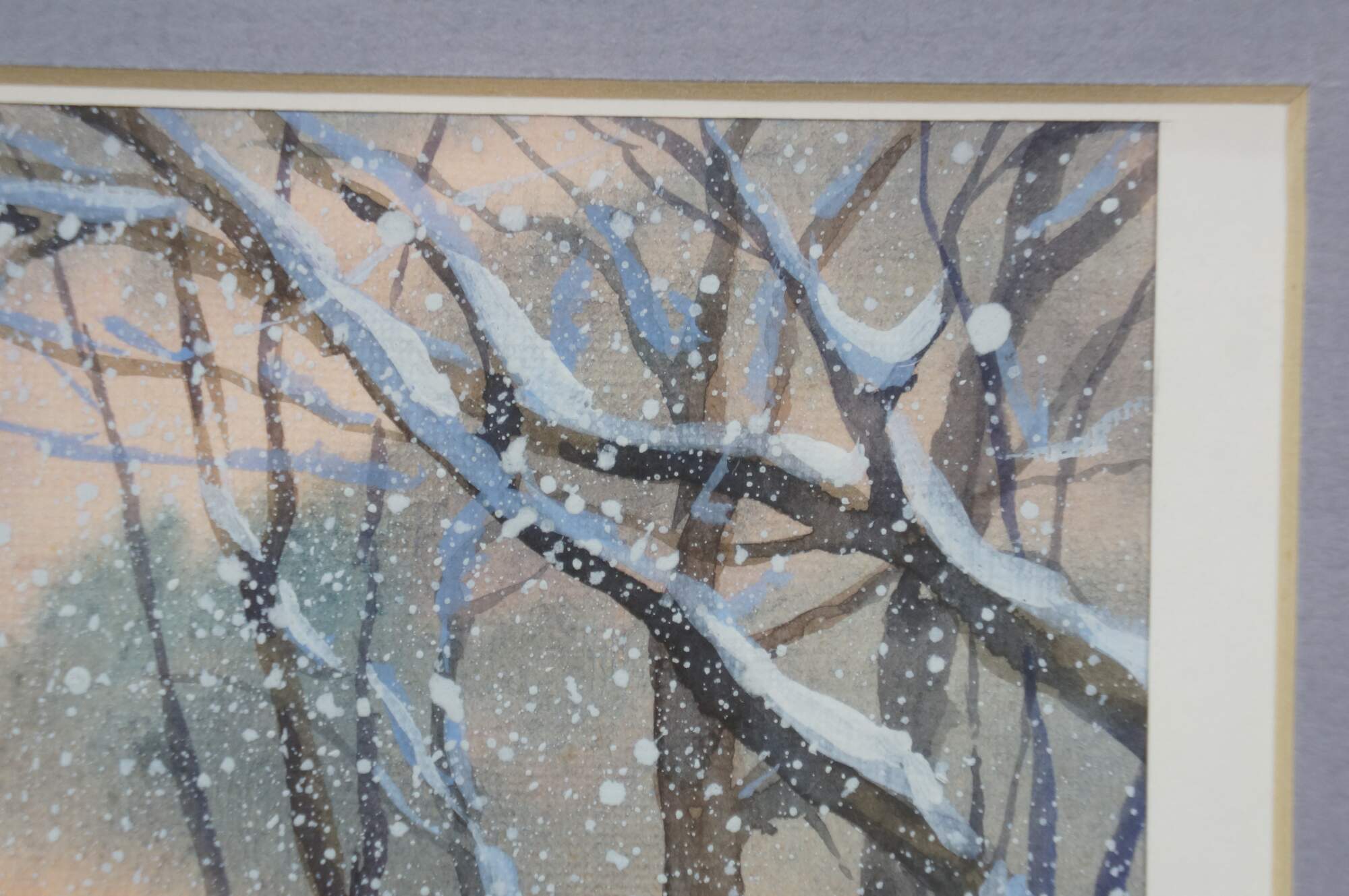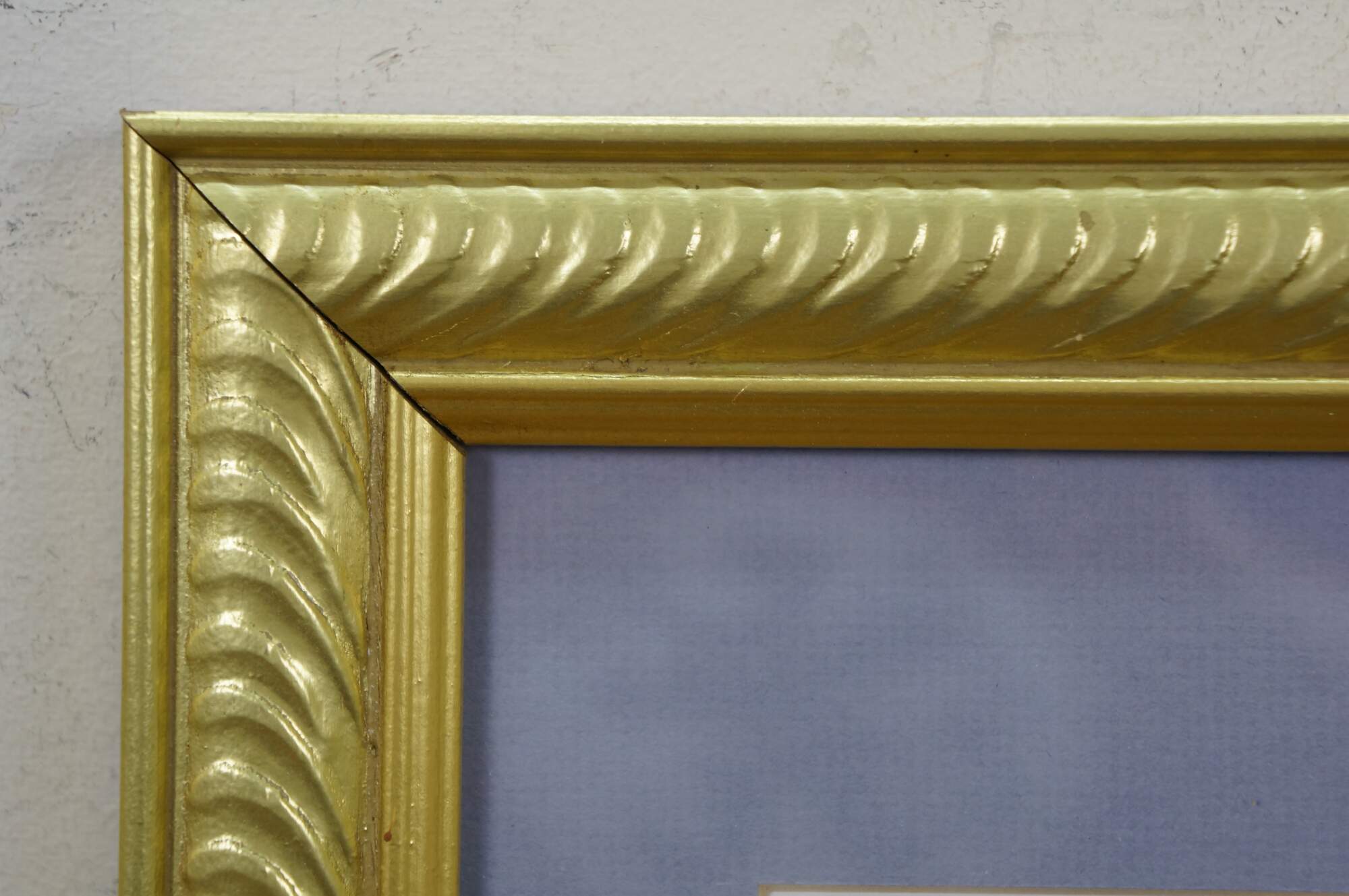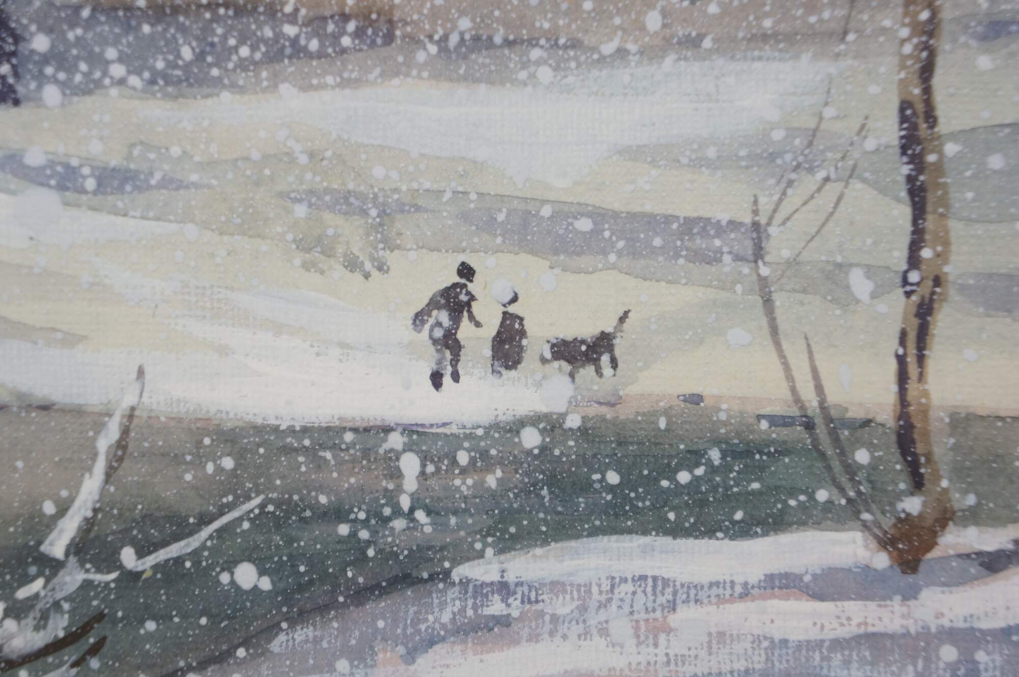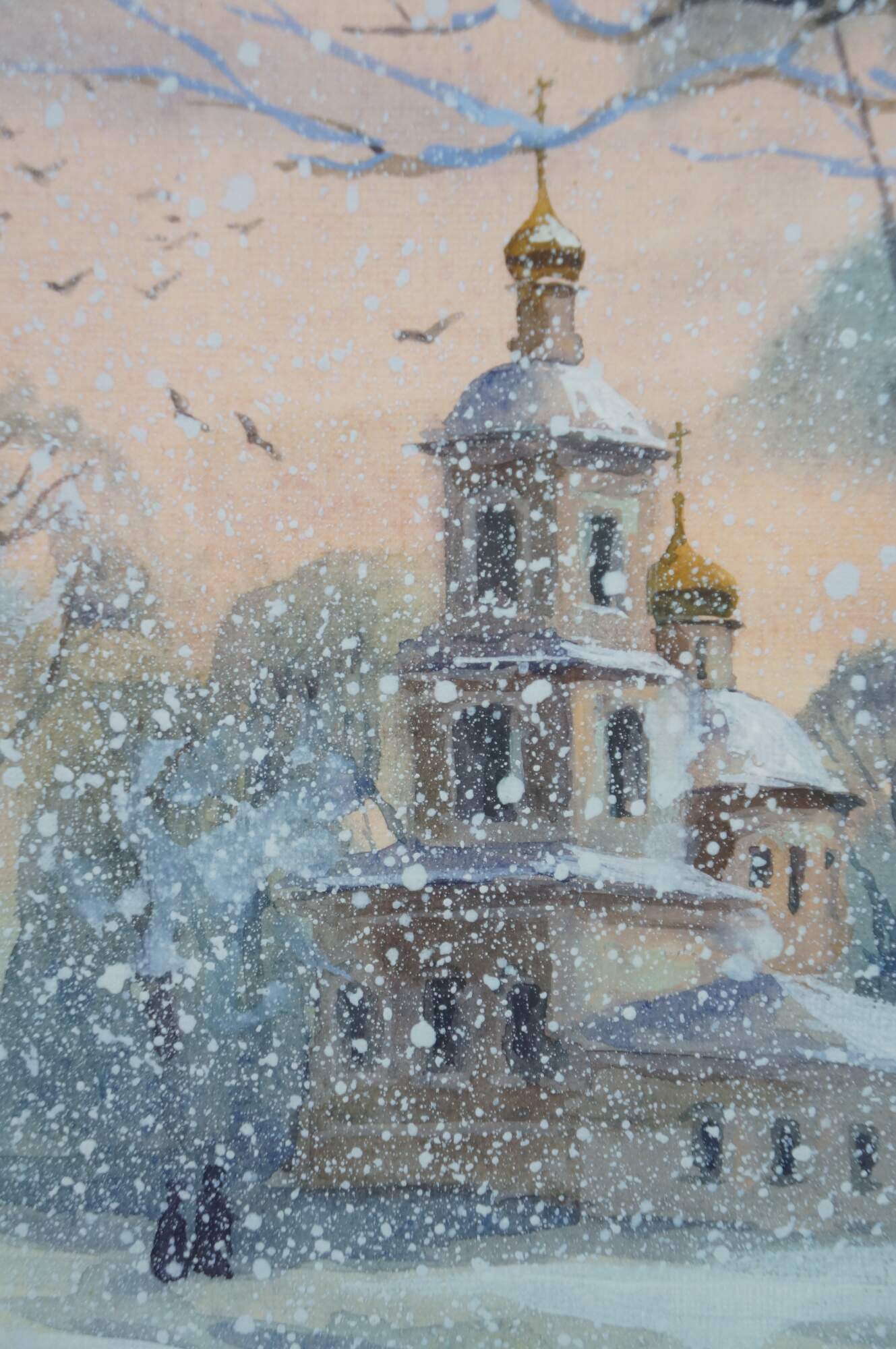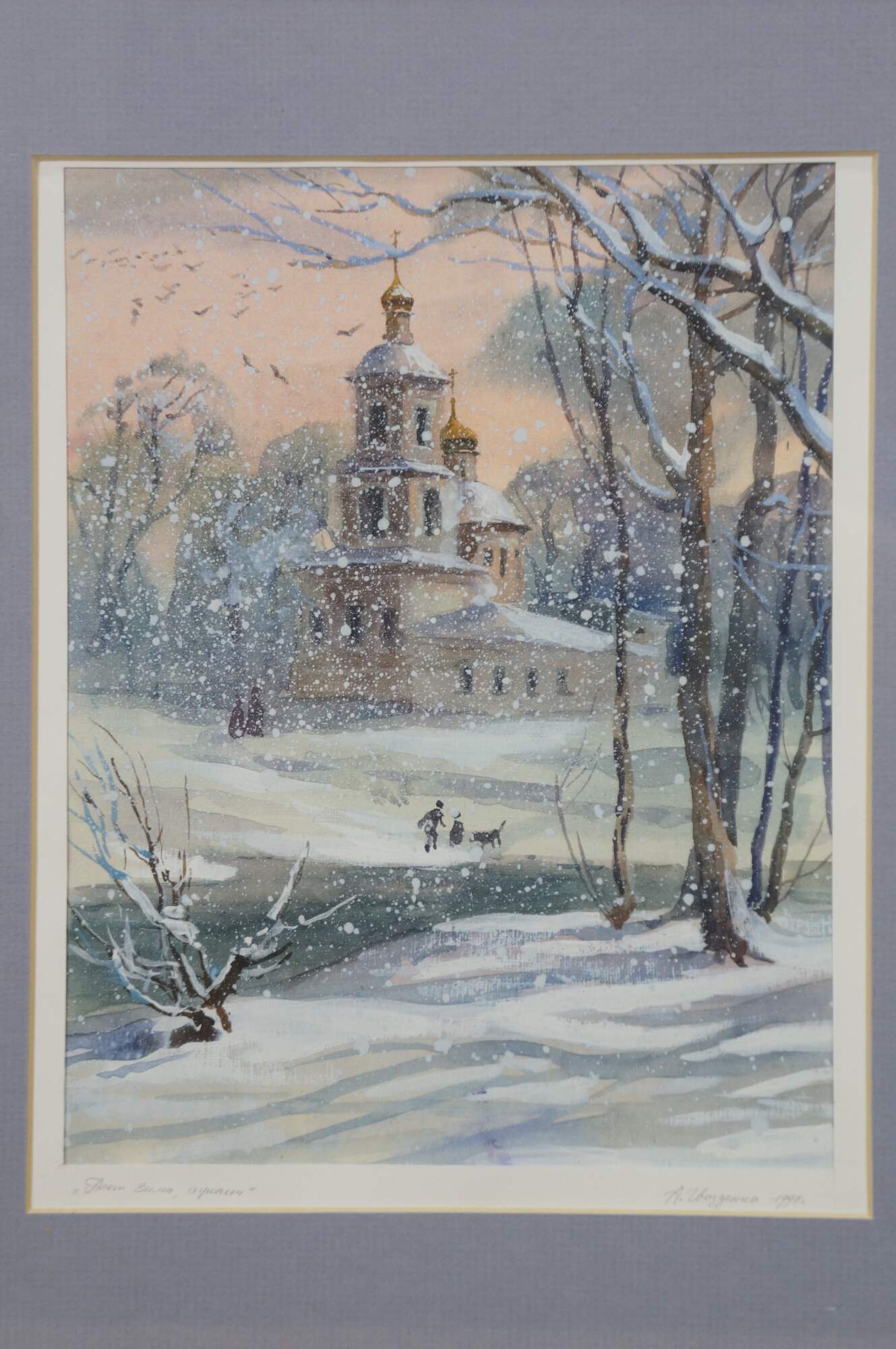 Vintage 1997 watercolor on paper landscape painting by A Gvozdenko titled Winter Sings, Echoing. It depicts a Russian Orthodox country church by a snow covered river with figures. Pencil titled, signed, and dated, lower edge of mat. Gilt frame; lavender and white layered mat.