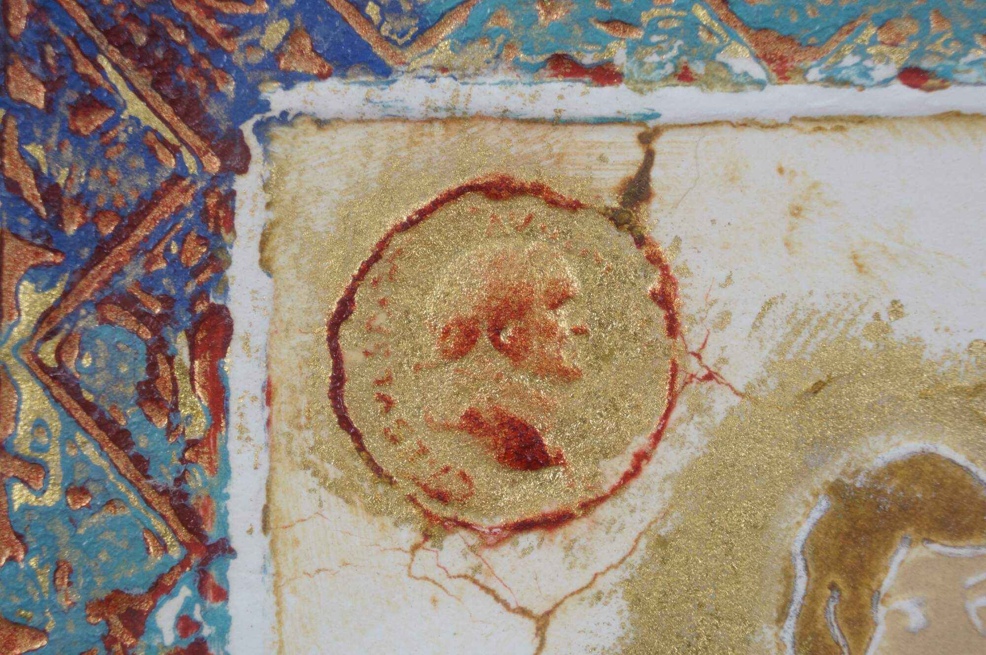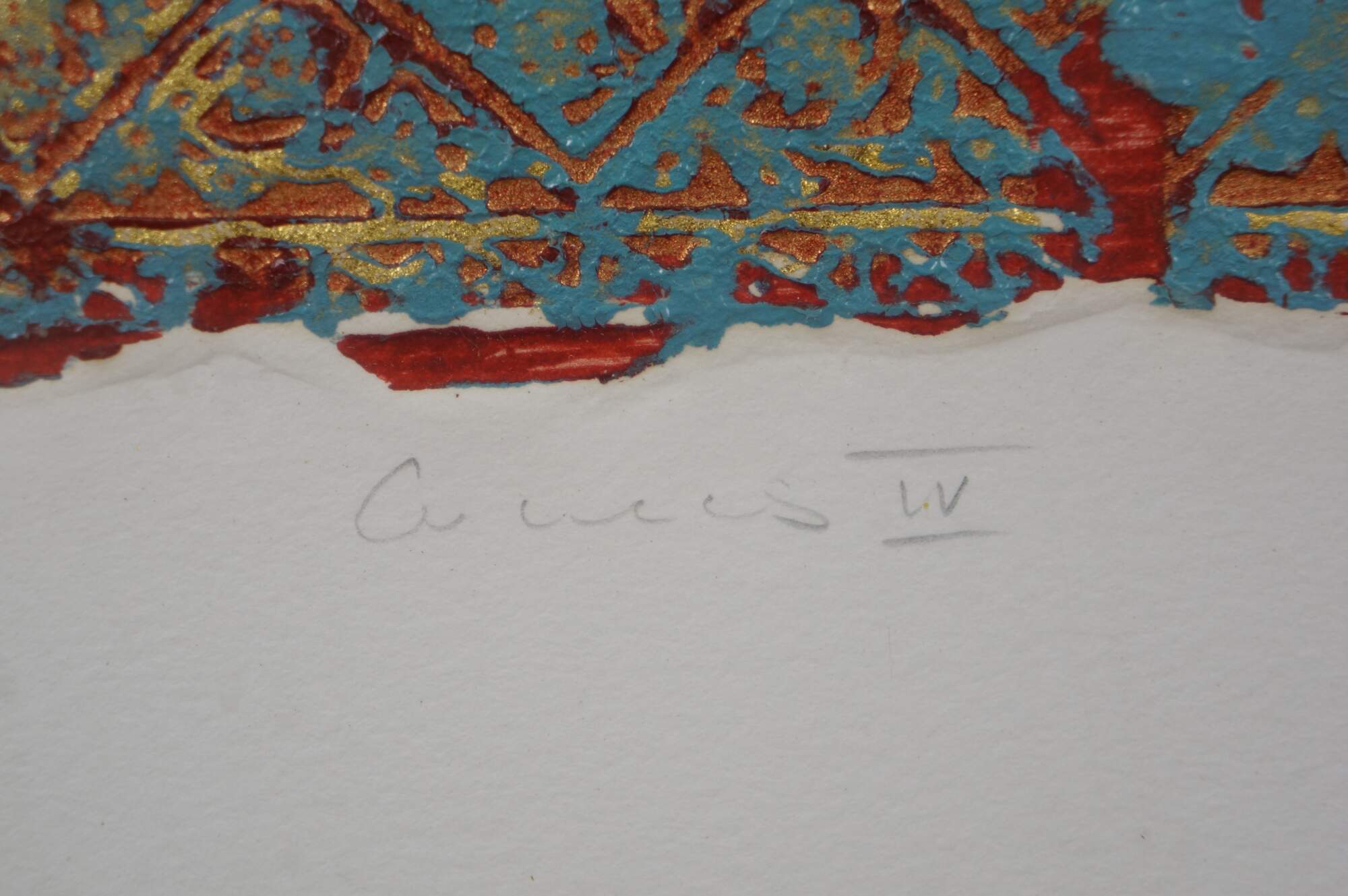 Limited edition carborundum etching titled "Graces IV" by Roy Tonkin. Brightly colored, textured scene showing a trio of three partially nude muses in togas, dancing to the sounds of a mandolin. Pencil signed, titled, and numbered 120/275, lower edge. Beveled gilt frame; white and gold layered mat.