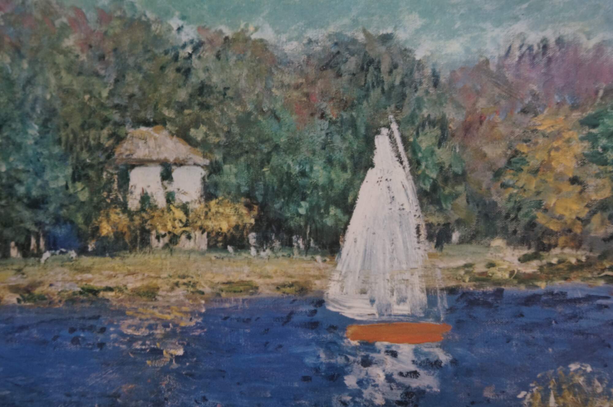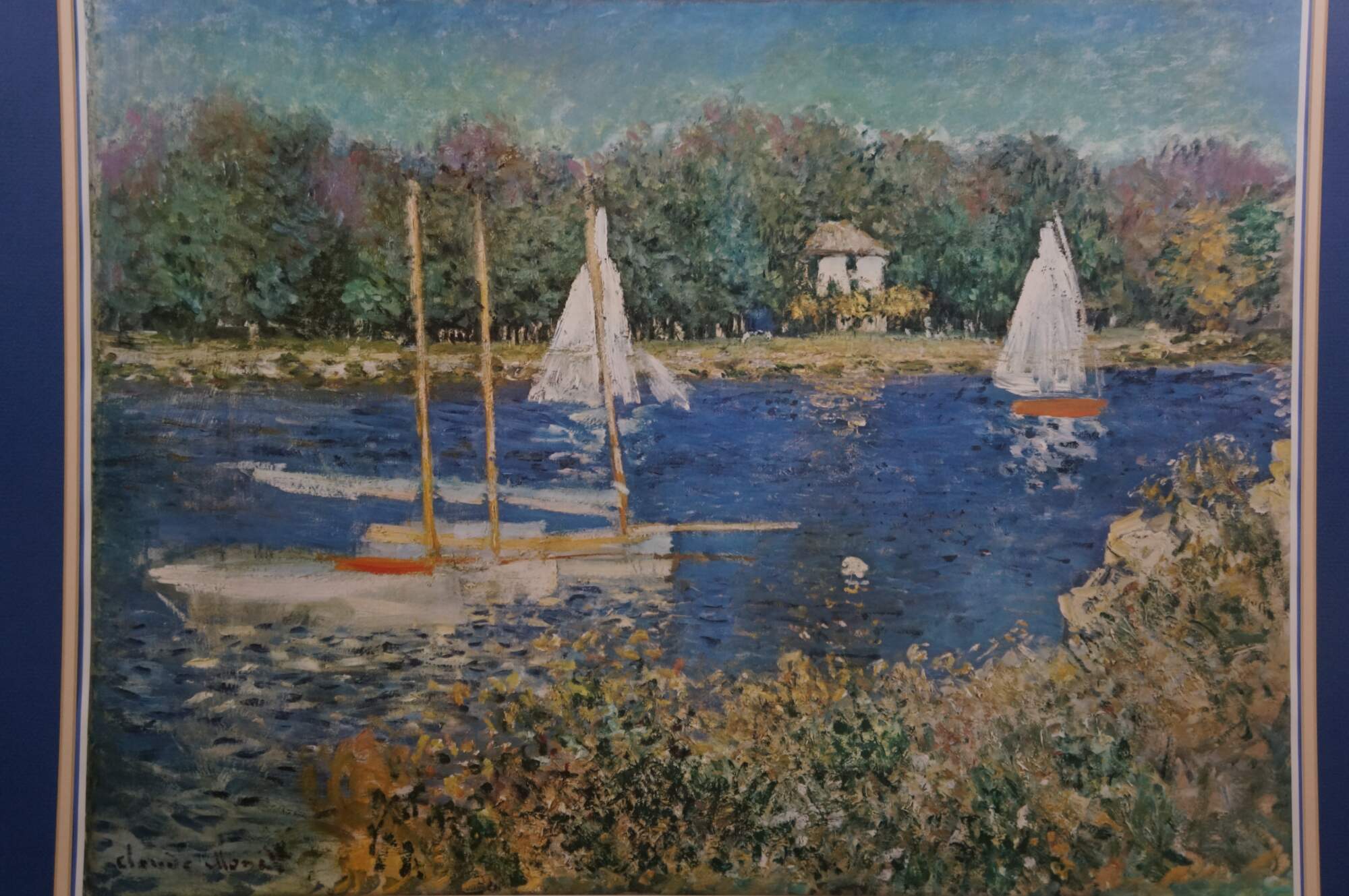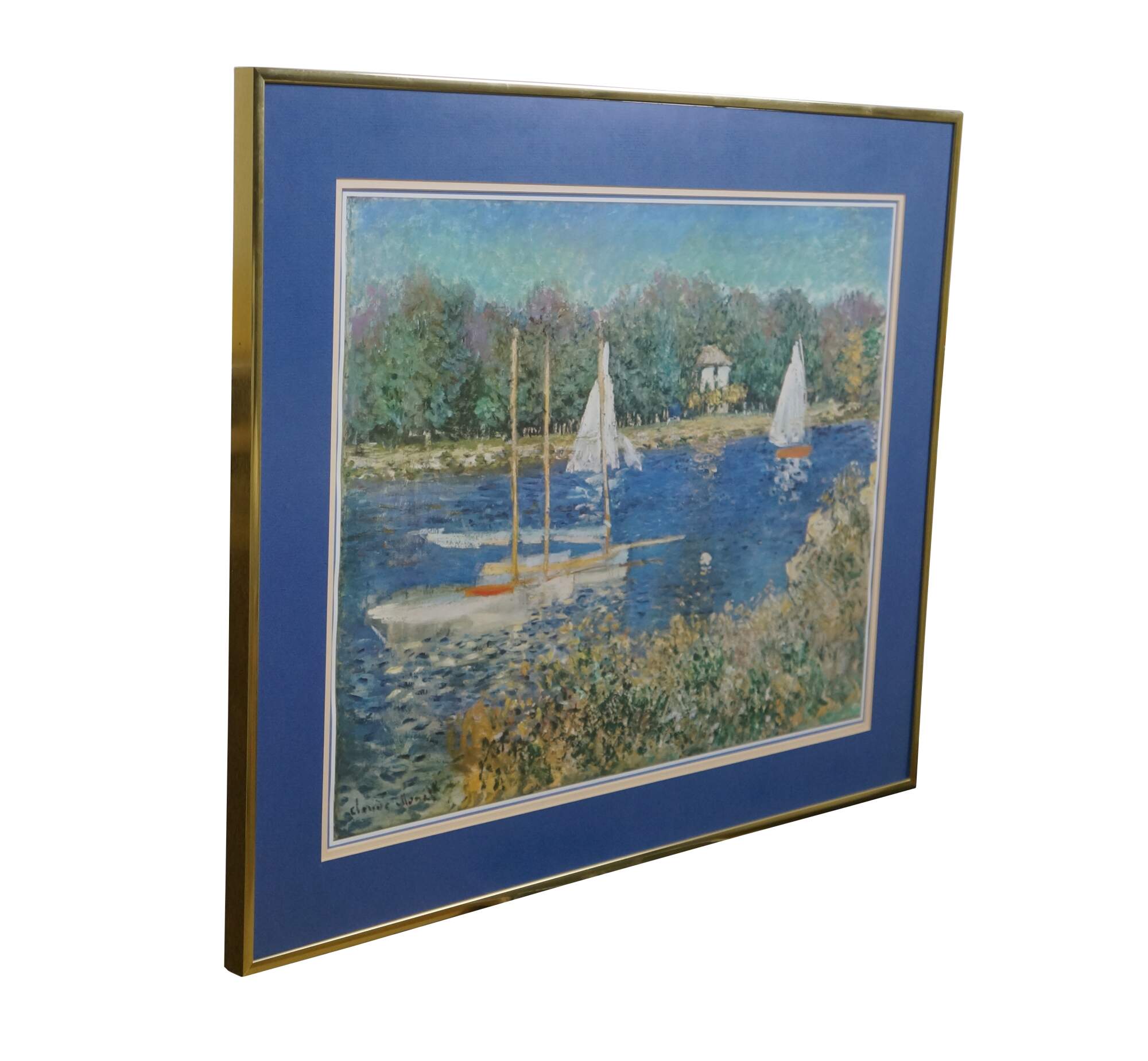 Mid century, circa 1962 lithograph print of Claude Monet's "The Seine at Argenteuil," originally painted circa 1874. A picturesque impressionist view of sailboats on water and a the treelined shore. Signed in plate, lower left. Gold metal frame; blue and beige layered mat.