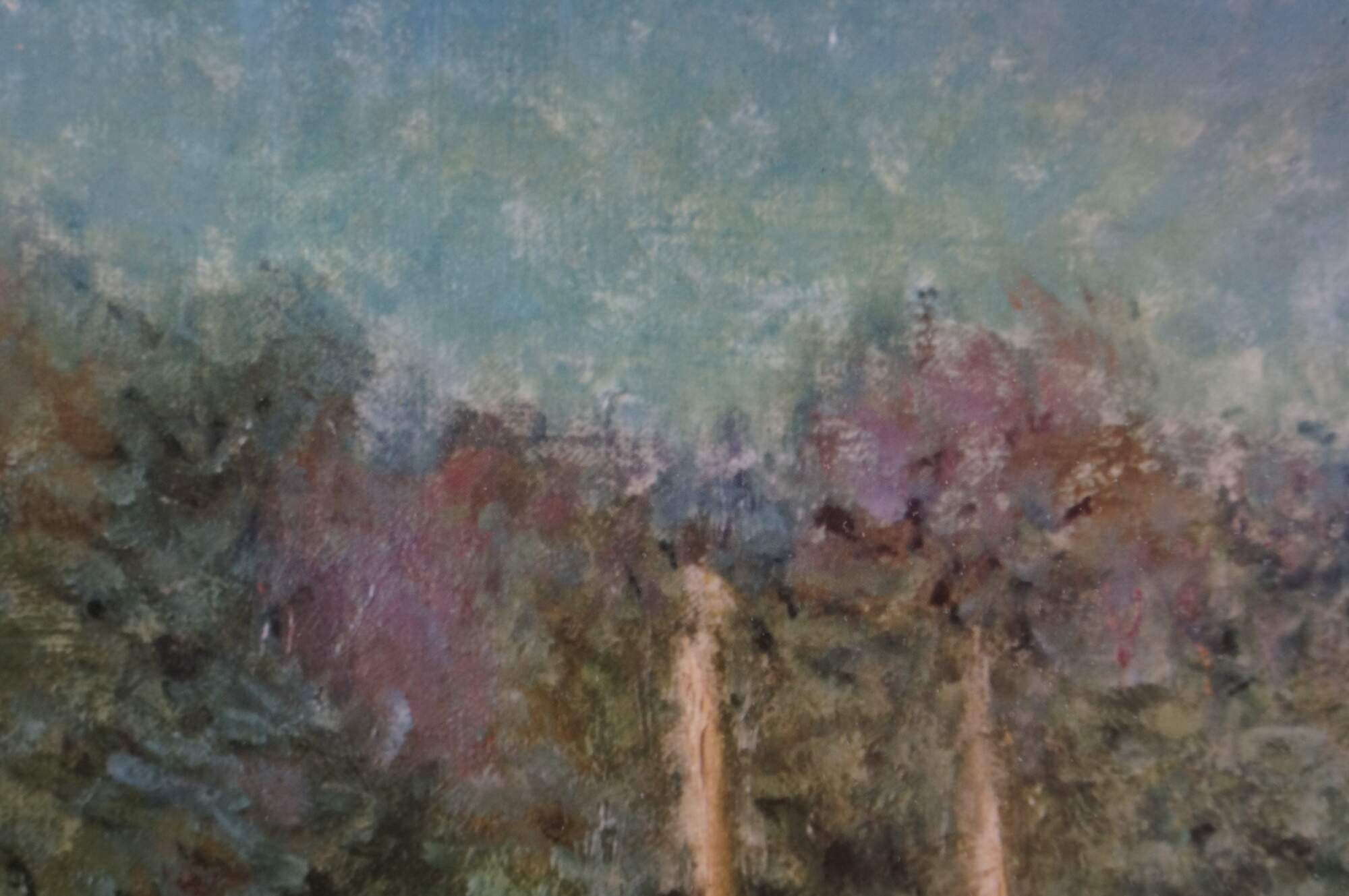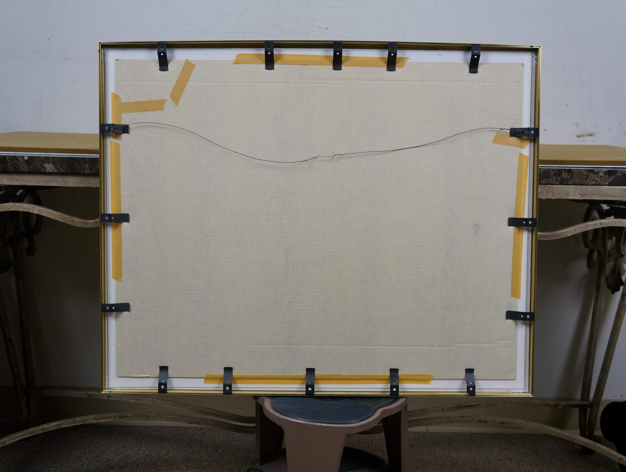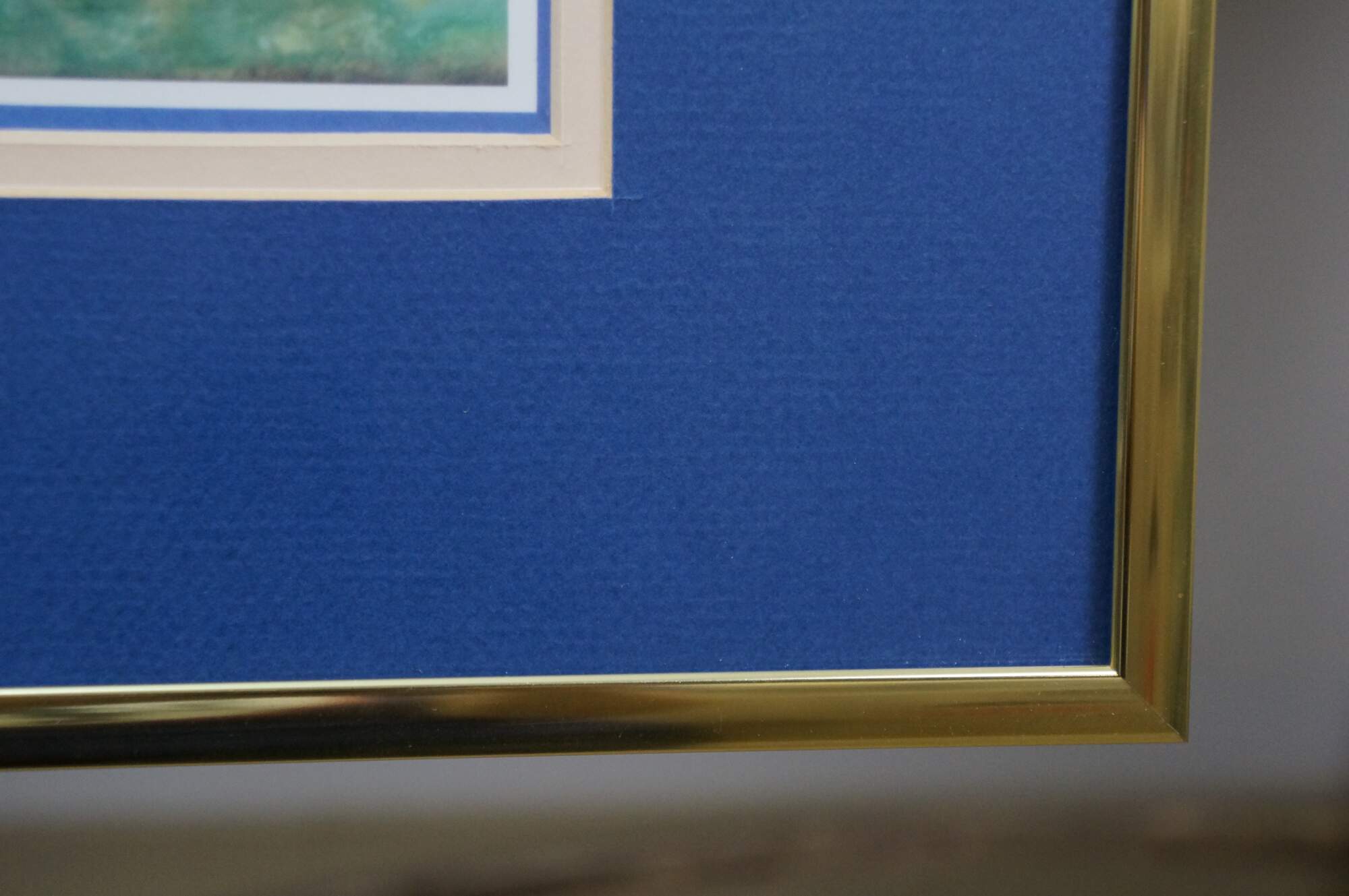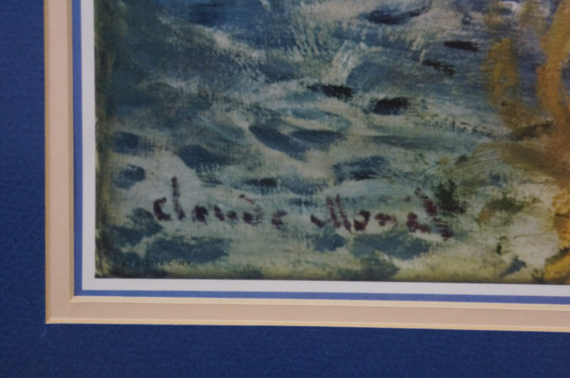Mid century, circa 1962 lithograph print of Claude Monet's "The Seine at Argenteuil," originally painted circa 1874. A picturesque impressionist view of sailboats on water and a the treelined shore. Signed in plate, lower left. Gold metal frame; blue and beige layered mat.