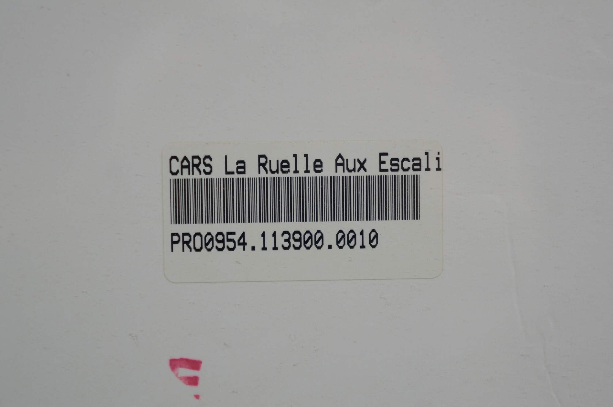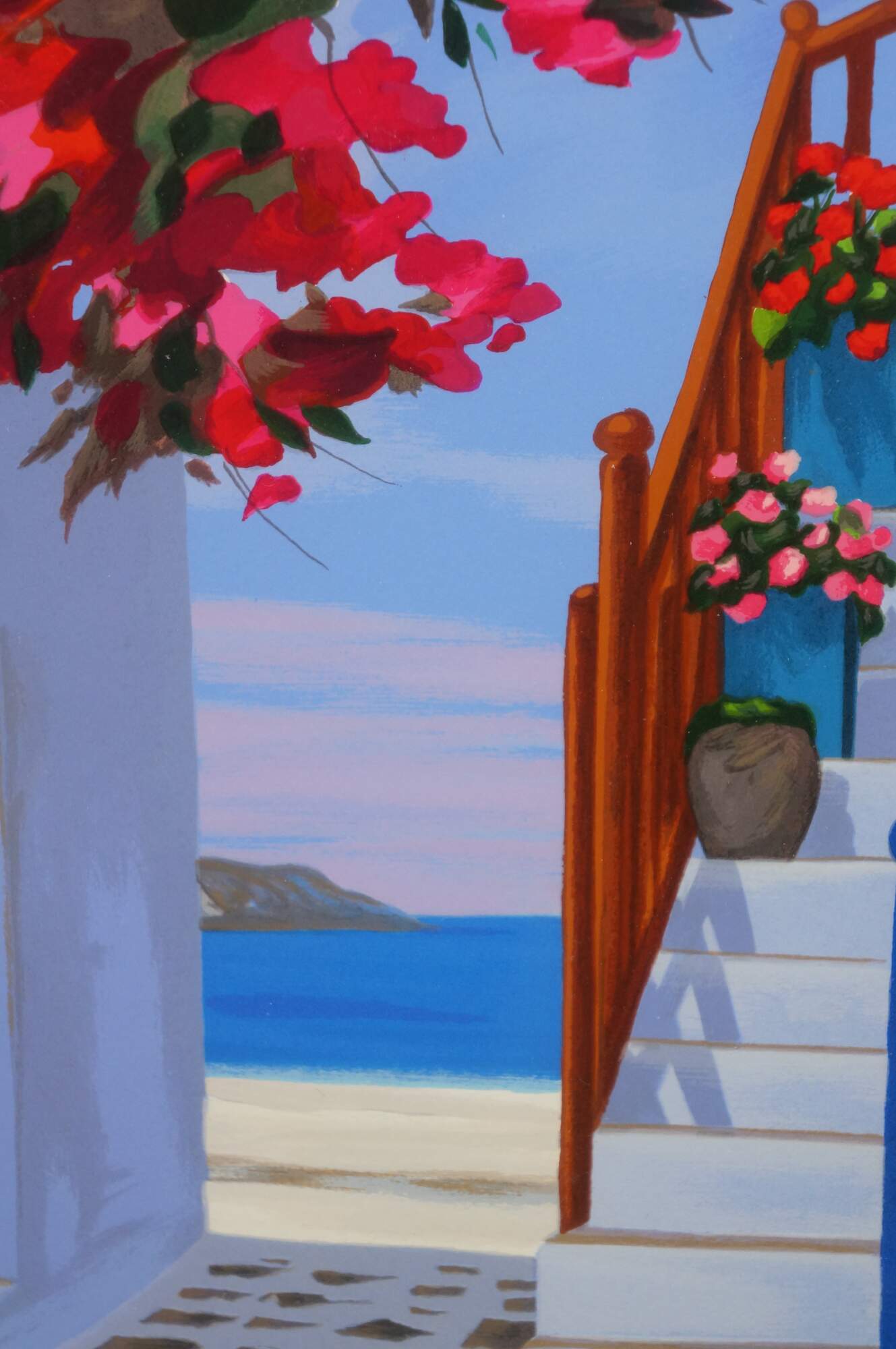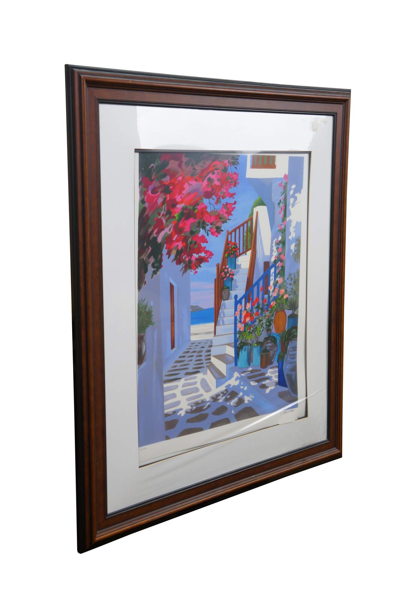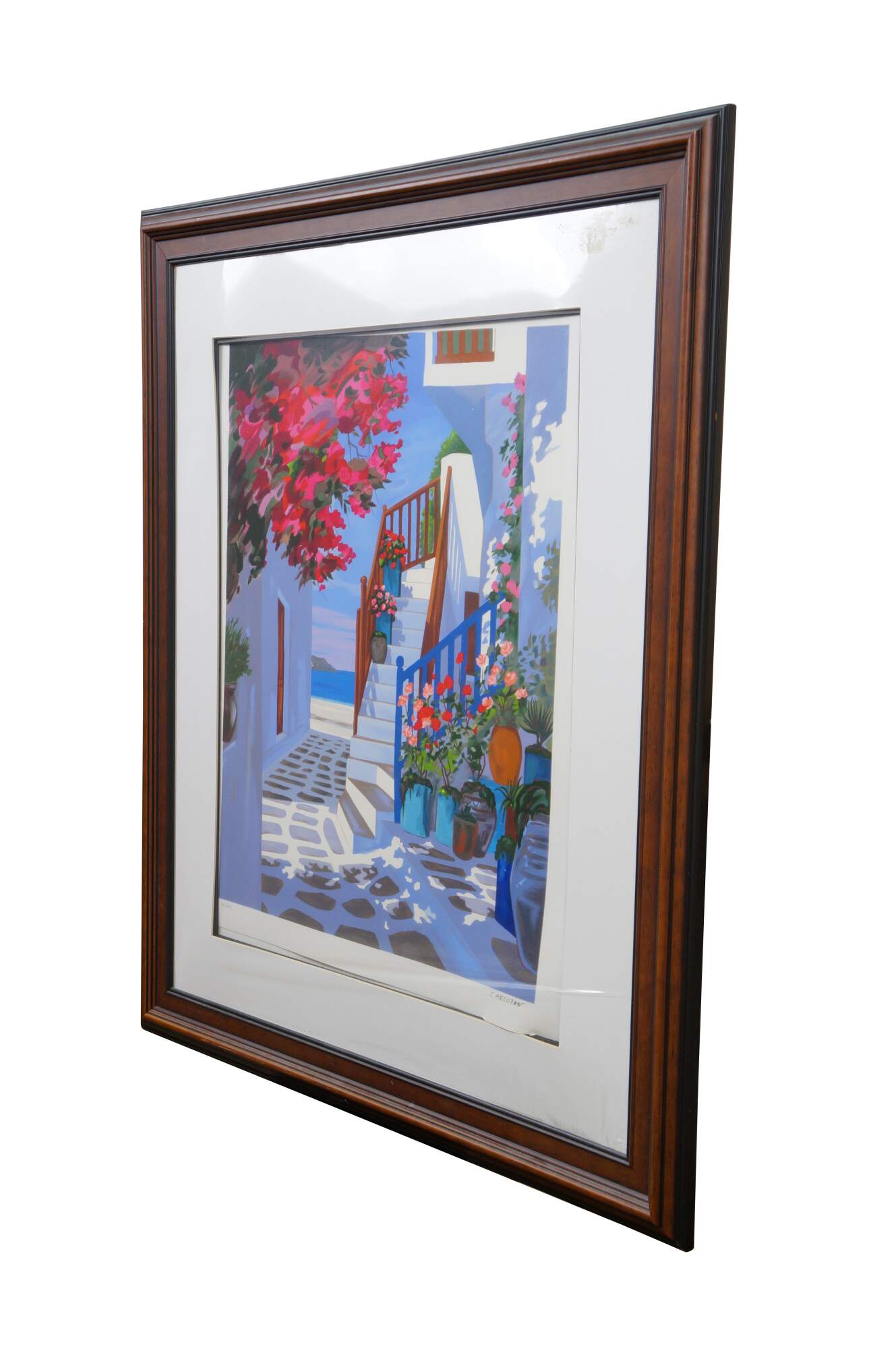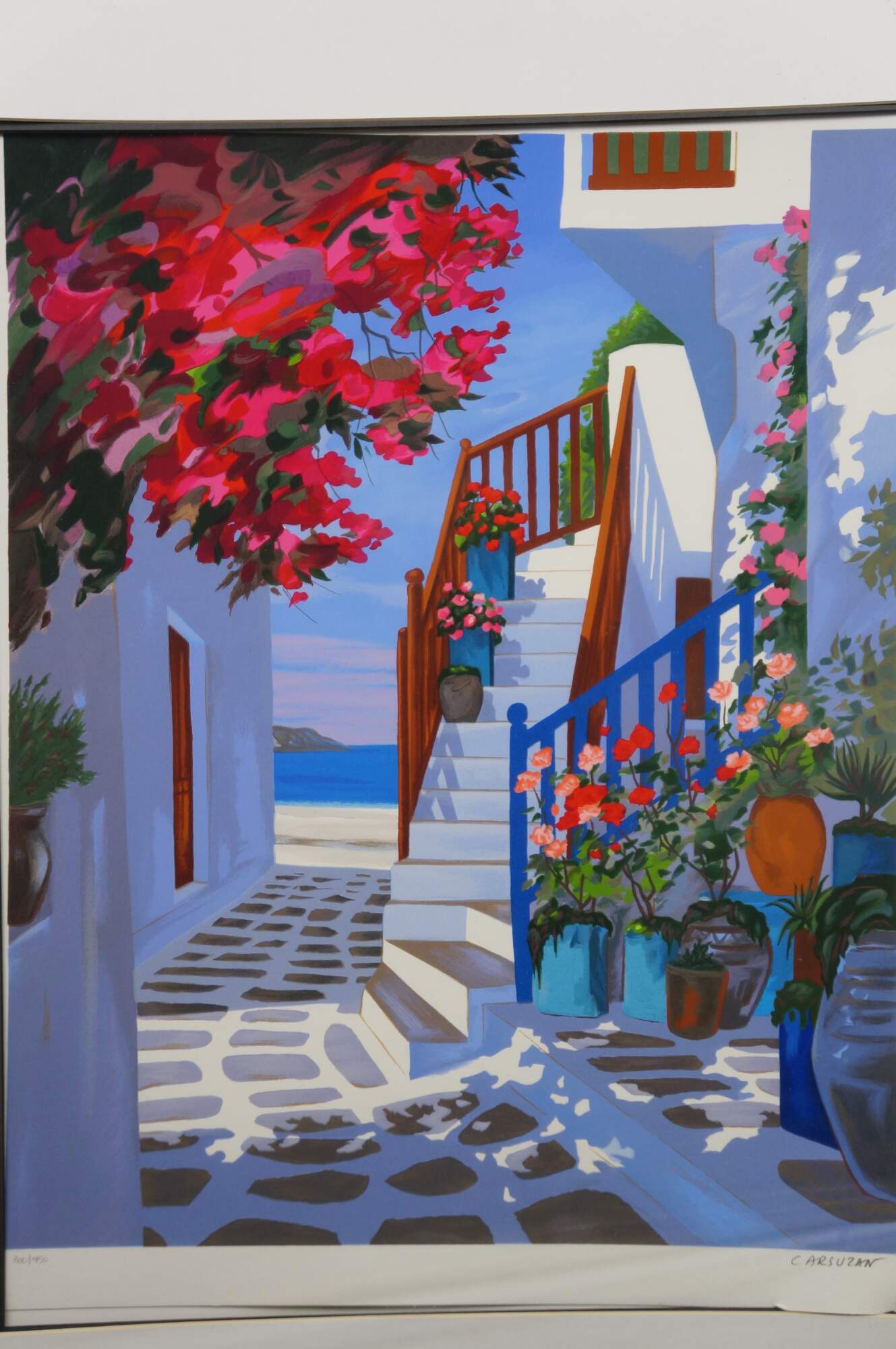 Serigraph print on paper of La Ruelle Aux Escalier (The Alley with Stairs) by Jean-Claude Carsuzan. Shows a sun-dappled alleyway with stairs and haning pink flowers. Pencil signed and numbered 380/450 along lower edge. Beveled wood frame; white and gray layered mat. No glass.