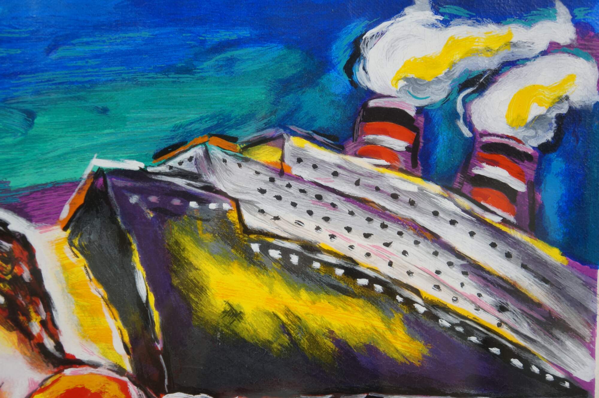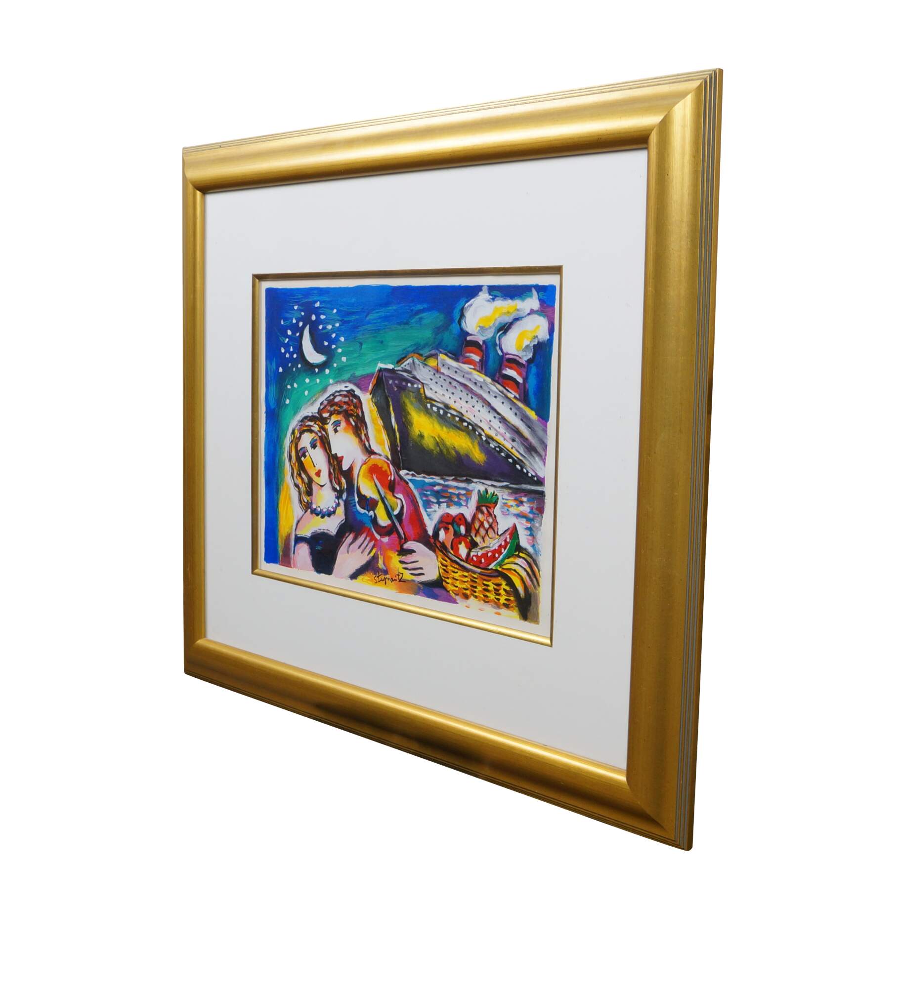 Late 20th century serigraph on paper of "Lover's Paradise" by Zamy Steynovitz. A brightly colored, post impressionist scene of two lovers with a violin and fruit basket in the foregoround before a cruise ship sailing on a moonlit ocean. Giltwood frame with raised bevel; white mat.