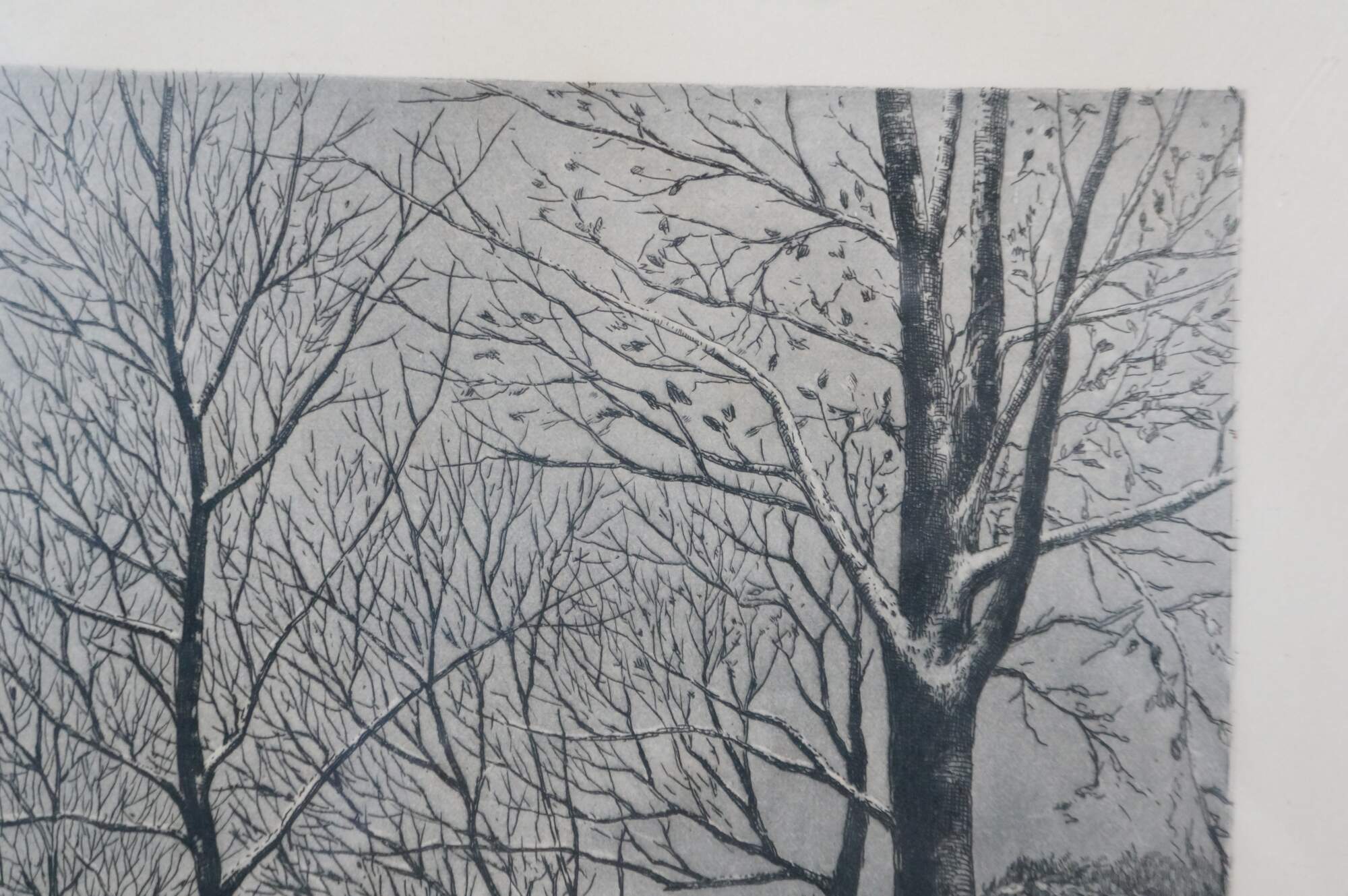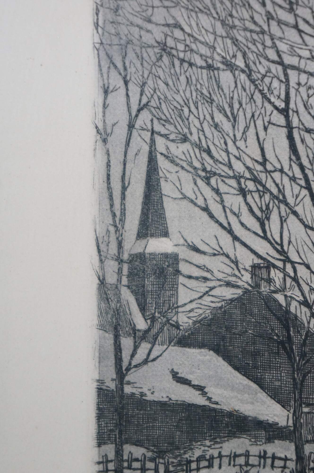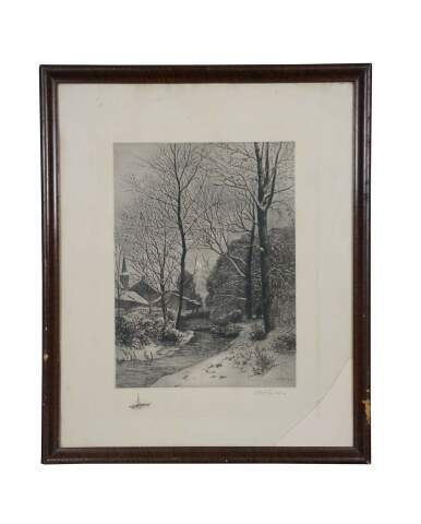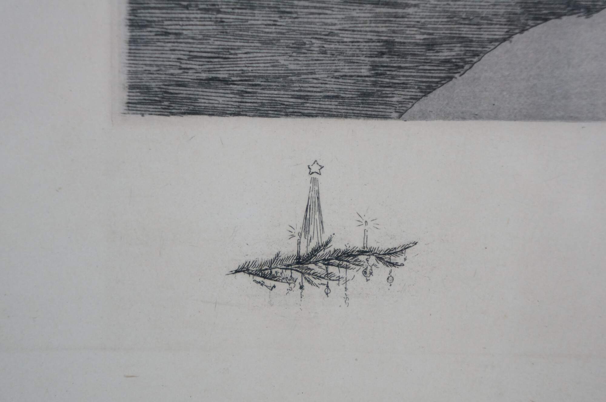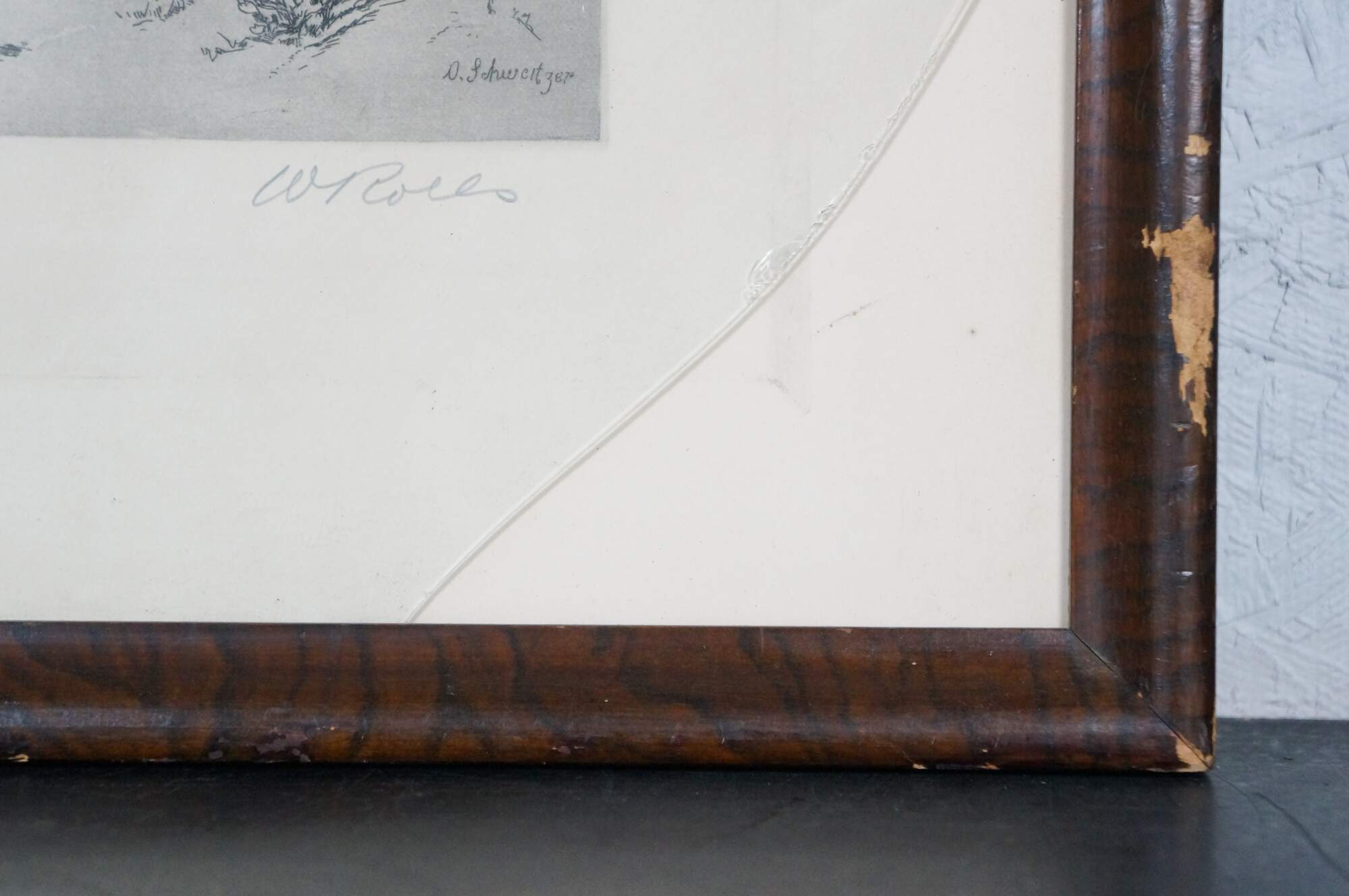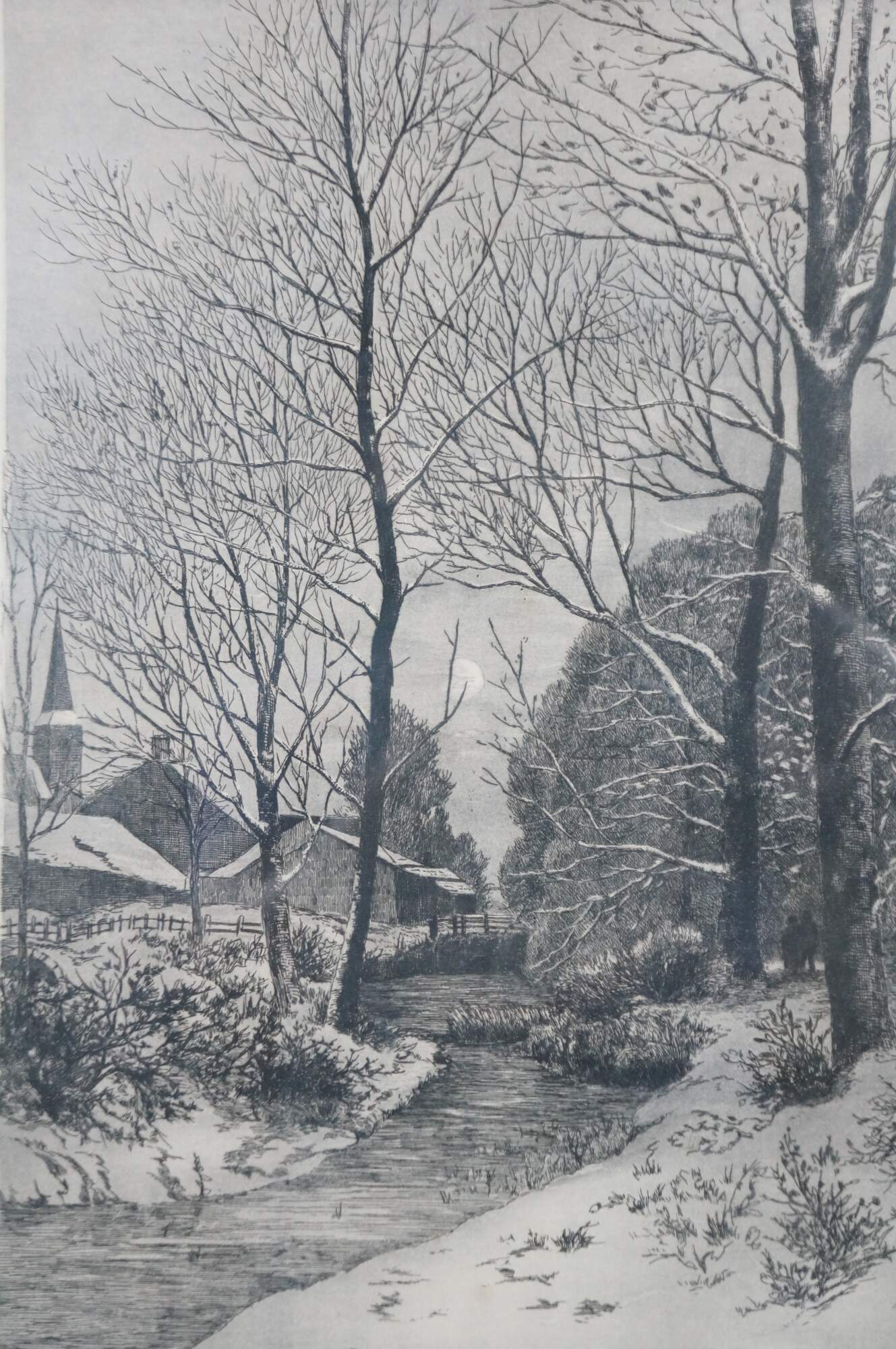 Late 19th century black and white landscape engraving showing a pair of figures taking a moonlit stroll along a river, a village visible through the snowy winter trees. Signed in plate D. (or A.) Schweitzer, lower right. Pencil signed W. Rolls lower right edge. Remarke of a branch of a Christmas tree with a star, lower left. Beveled wood frame; no mat.