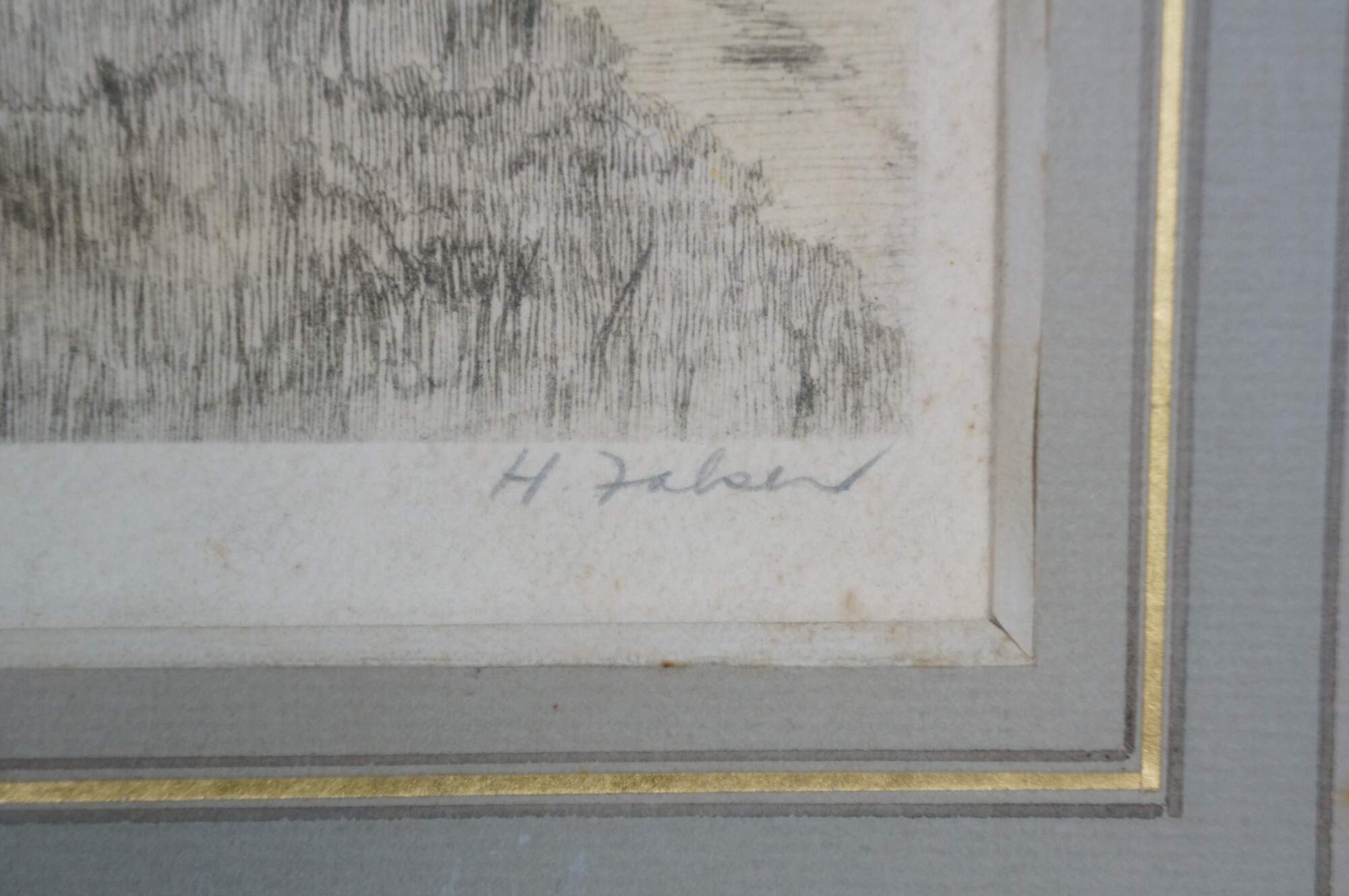 Antique hand tinted etching showing a country landscape with a red roofed cottage and a boat on water. Pencil titled "Fisherman's Haven, lower left. Pencil signed H. Falser lower right. Beveled wood frame; gray may with gold detail.