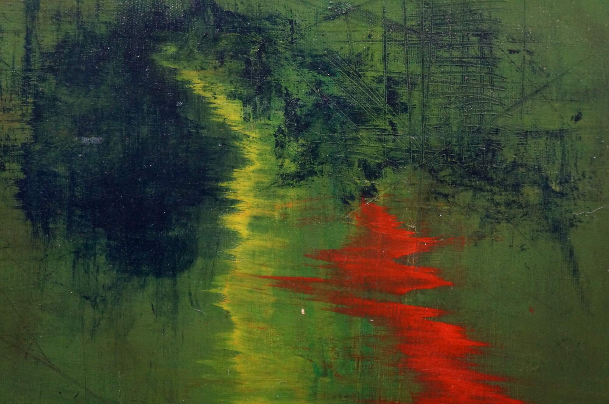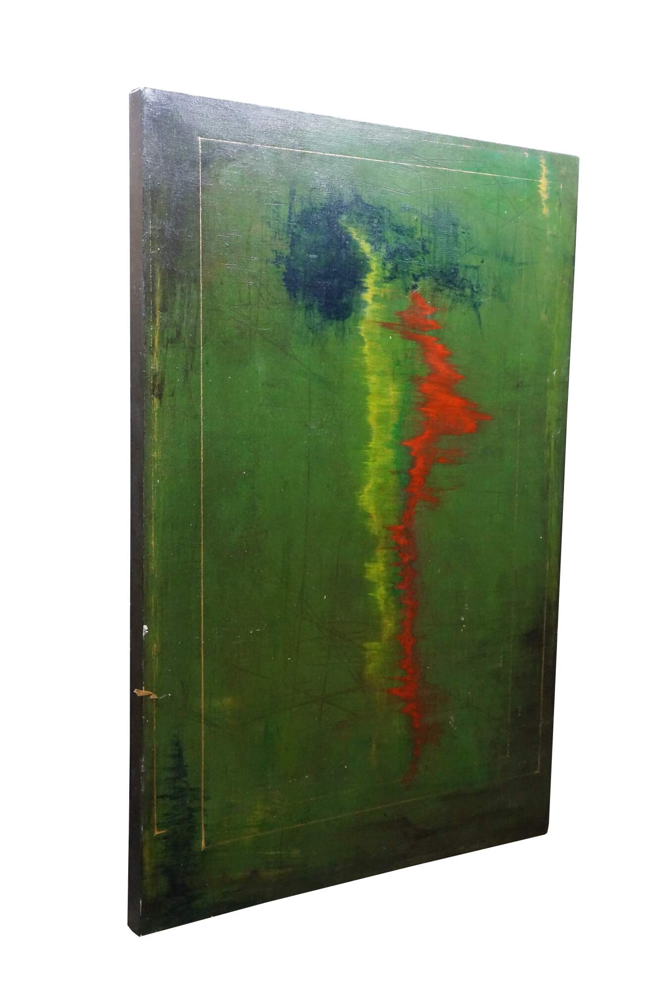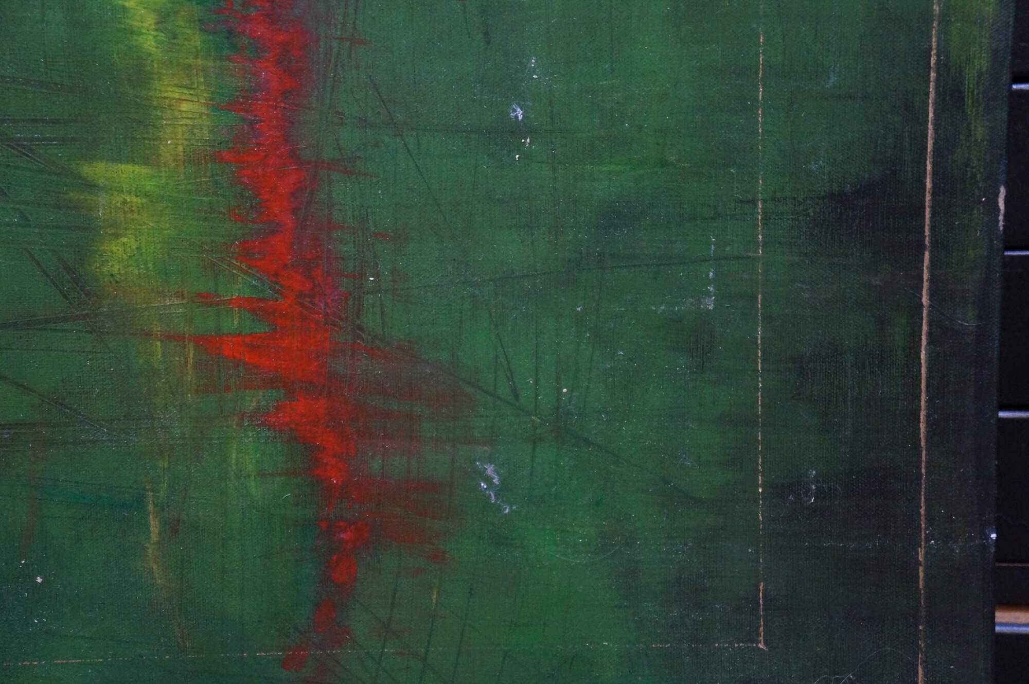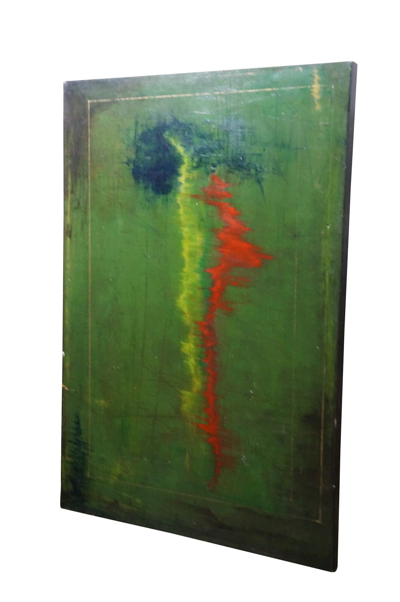 Late 20th century abstract oil painting on canvas - accents of navy blue, yellow, and red on a field of green, resembling a sound byte. Un-framed stretched canvas.