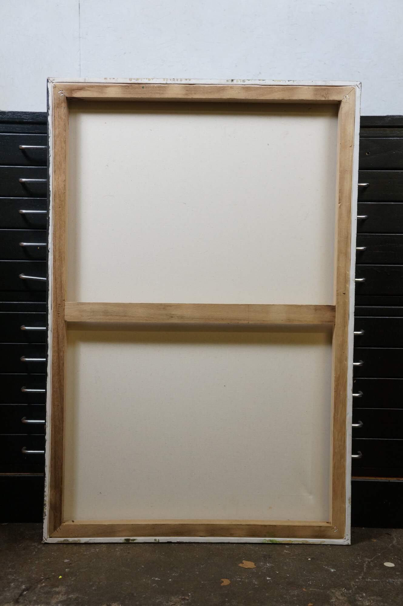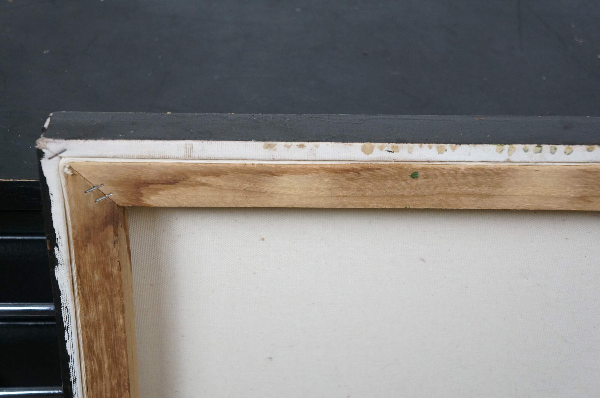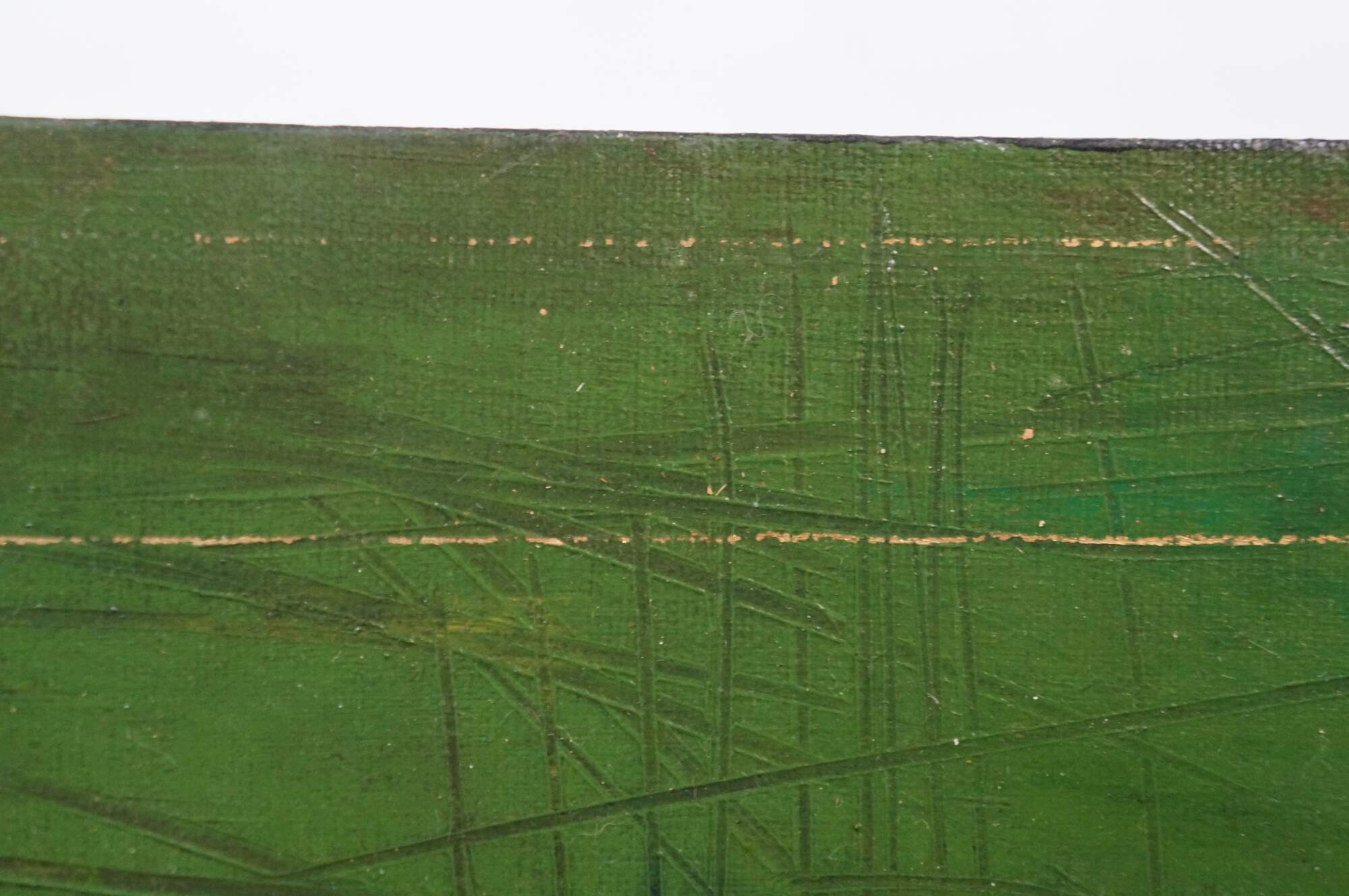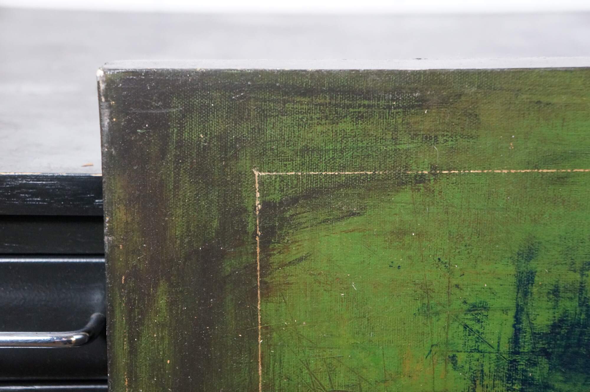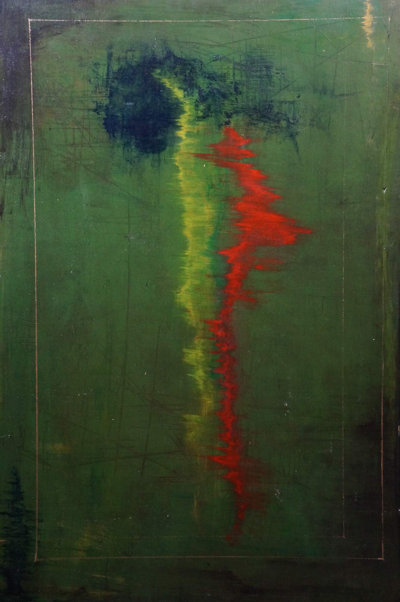 Late 20th century abstract oil painting on canvas - accents of navy blue, yellow, and red on a field of green, resembling a sound byte. Un-framed stretched canvas.