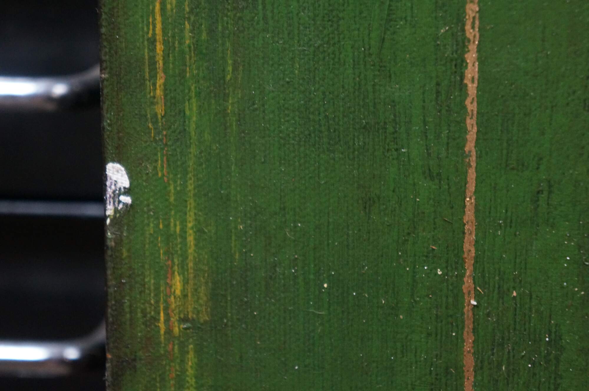 Wear and distressing, paint loss, scuffing / marking, intentional artist markings to paint, puncture near edge